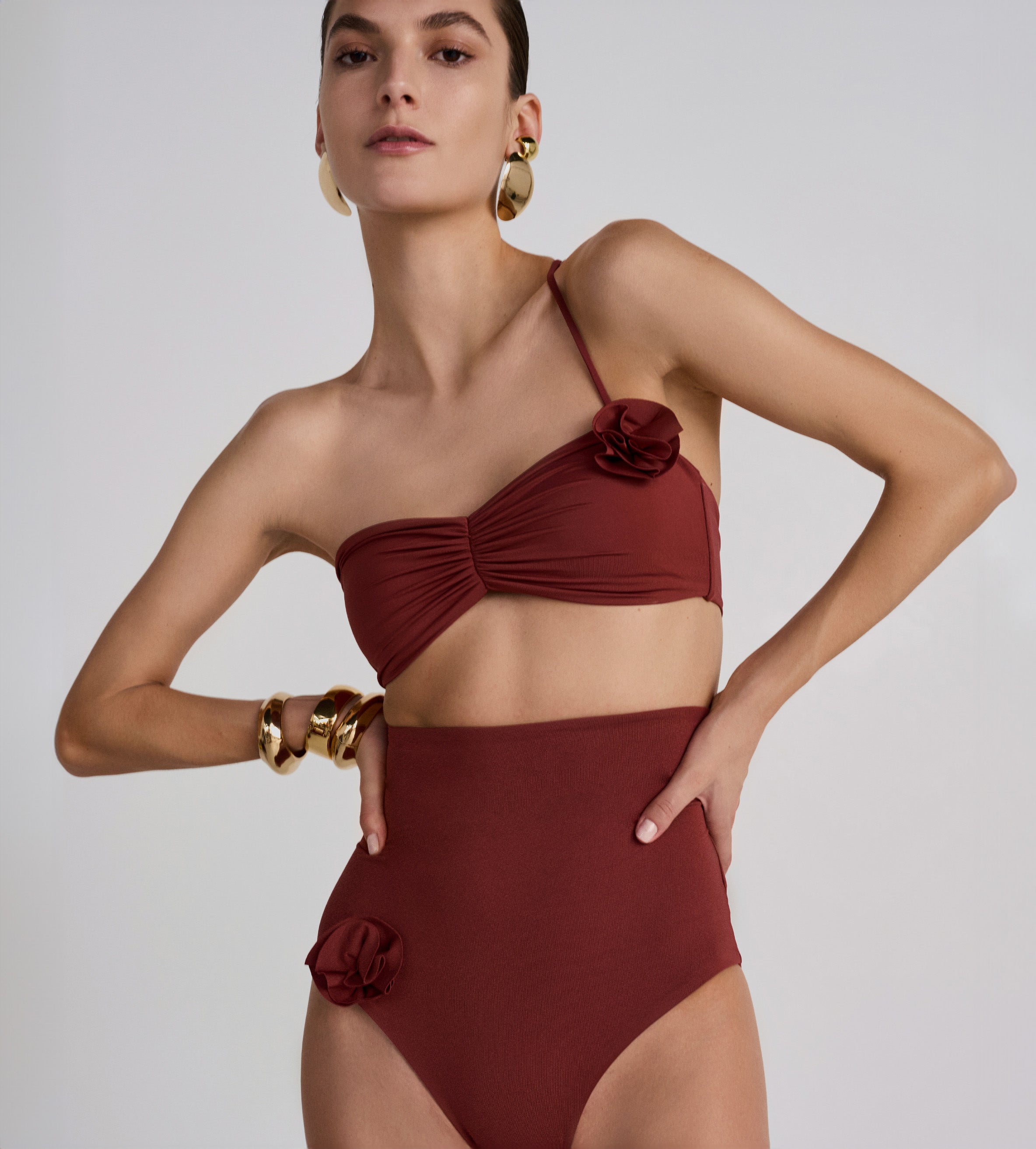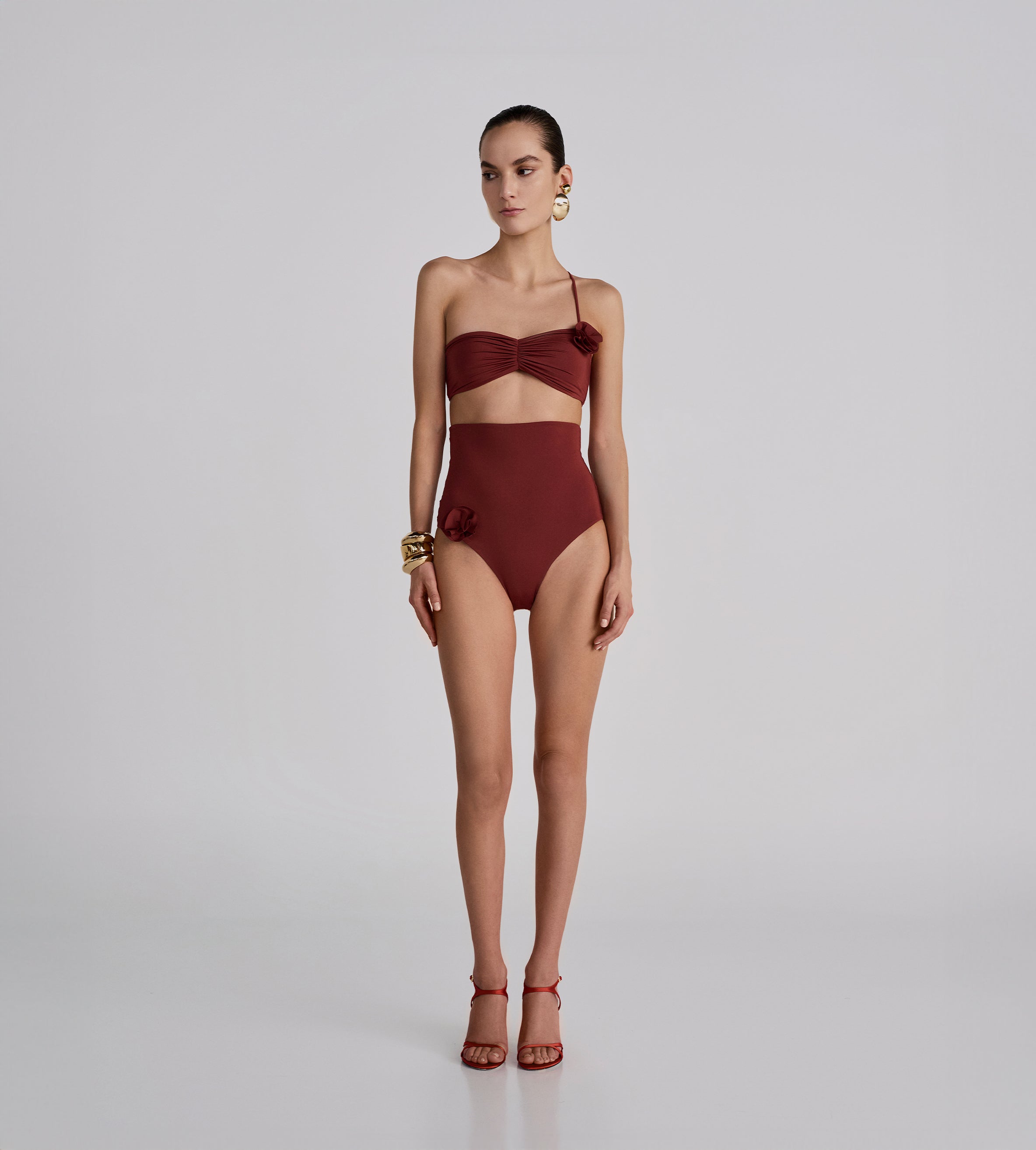 Nuestro traje de baño de dos piezas Castaño está elaborado en nuestra tela insignia y combina un top con escote corazón, fruncido en delantero y una delicada tira multifuncional con un detalle de floral hecho a mano. Junto con nuestra nueva parte inferior de cintura super alta adornada con un coqueto detalle de flor 3D en la cadera.