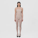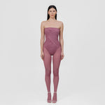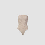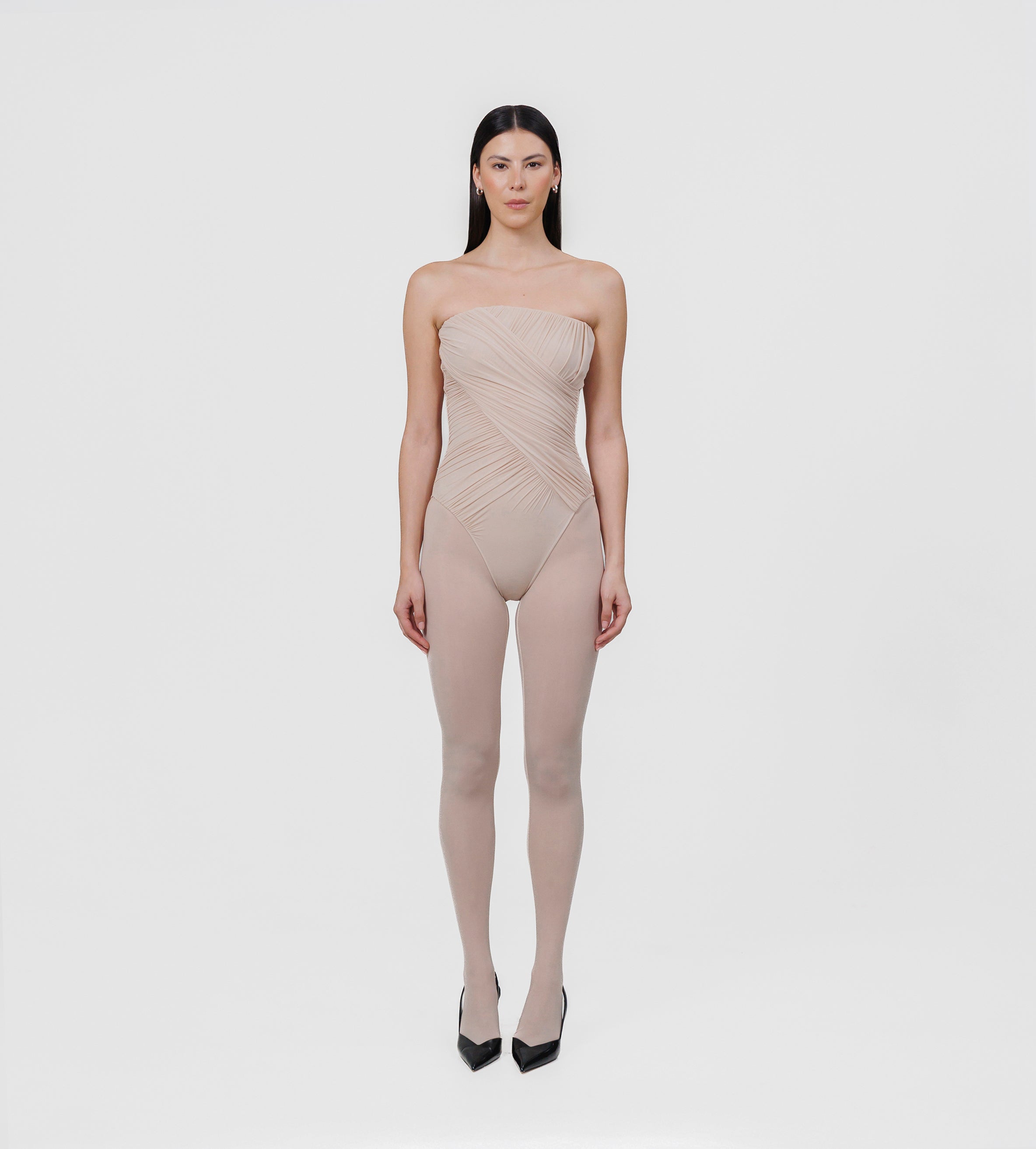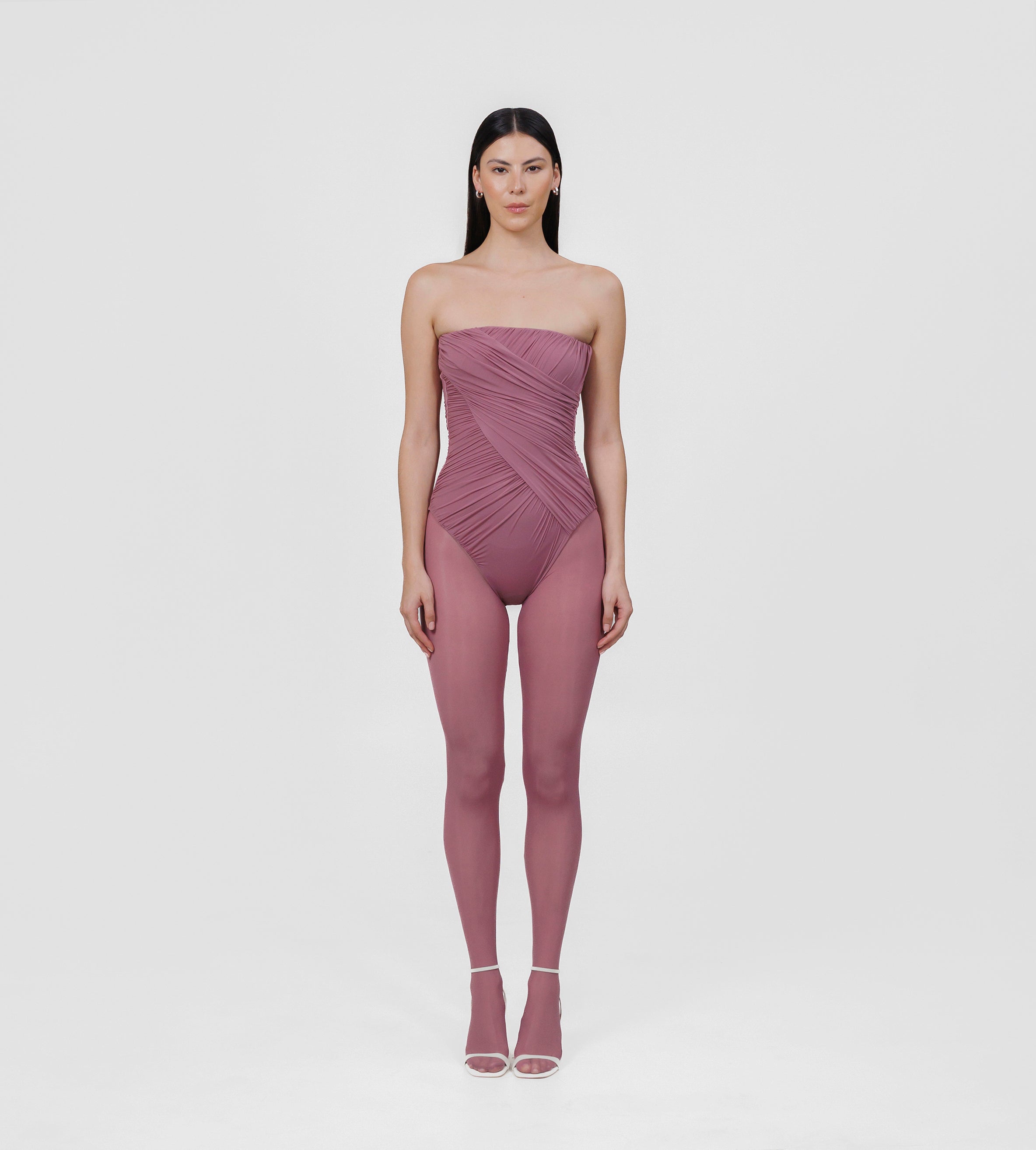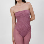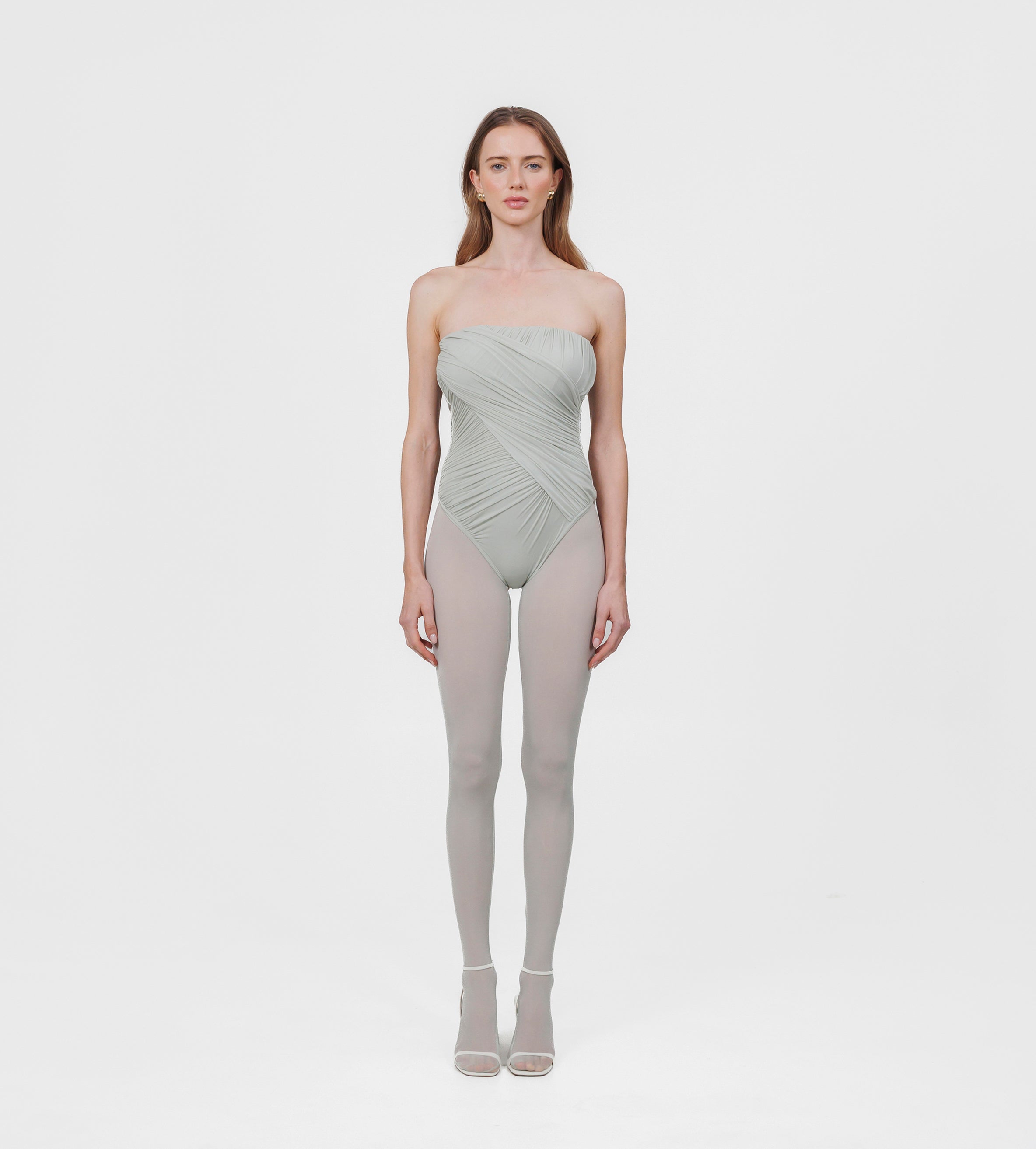 El enterizo Alondra presenta un escote strapless que da paso a un suave drapeado que envuelve el cuerpo en varias direcciones y continua hacia una espalda completamente fruncida. Su silueta recogida realza la cintura, creando un diseño escultural y elegante.