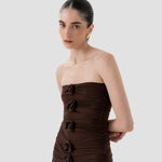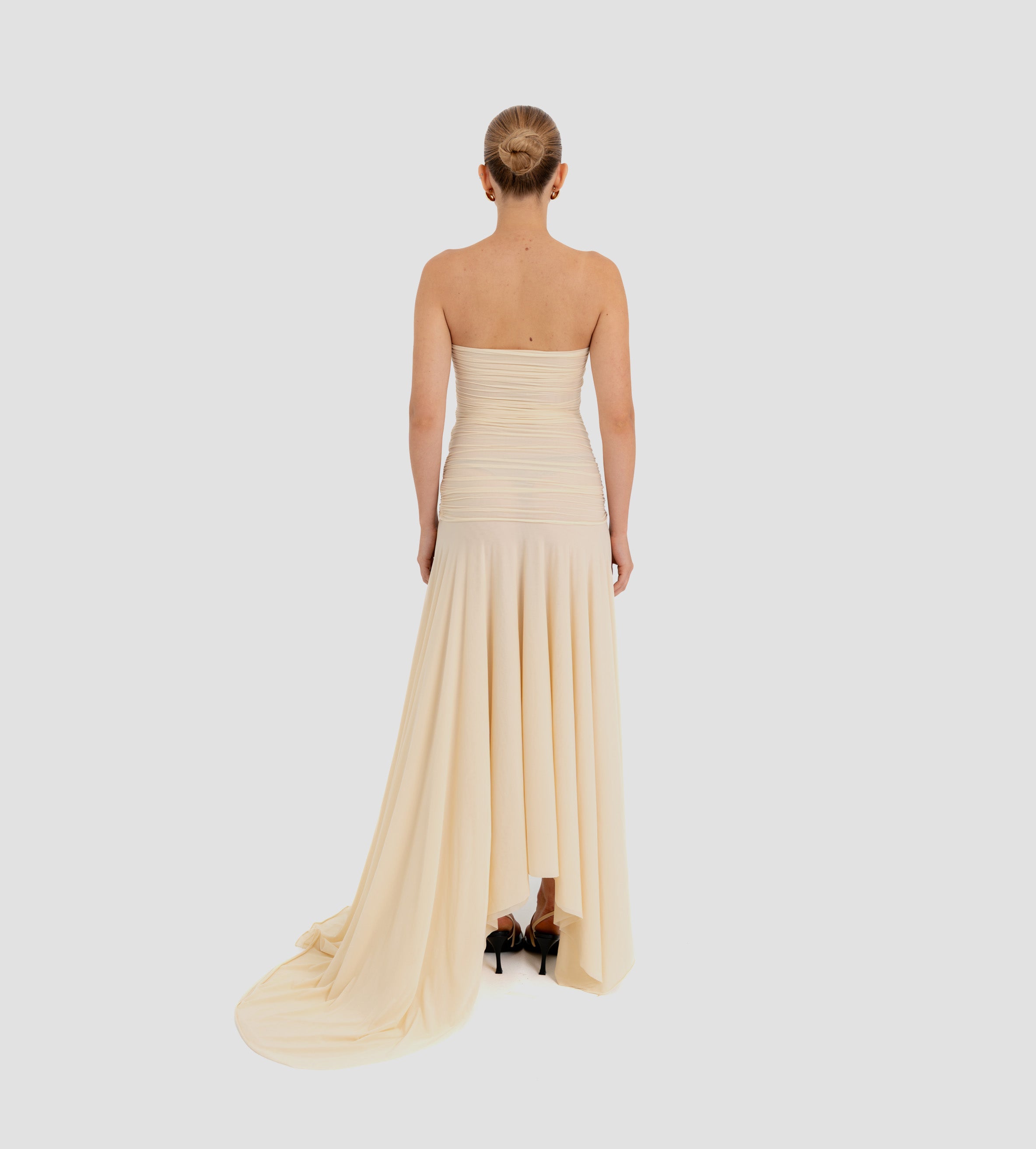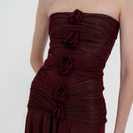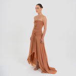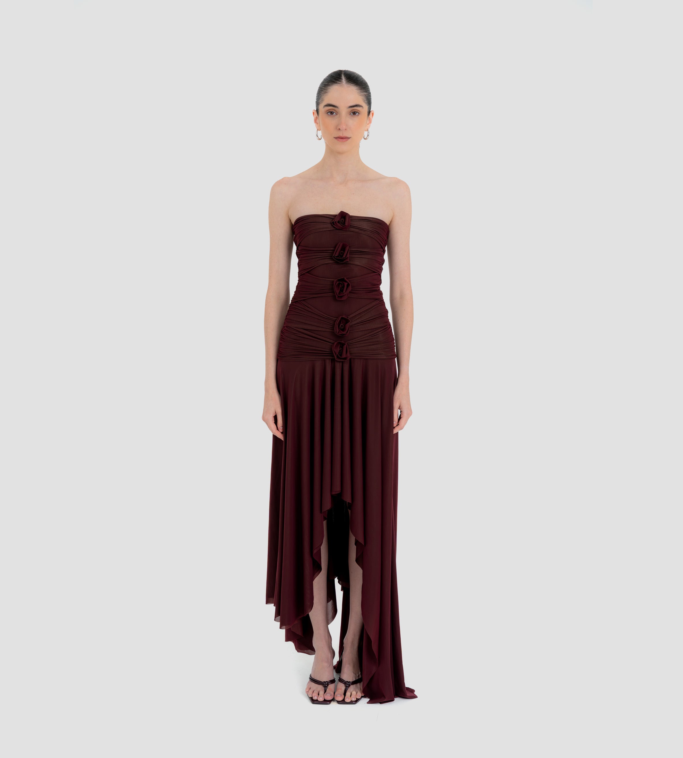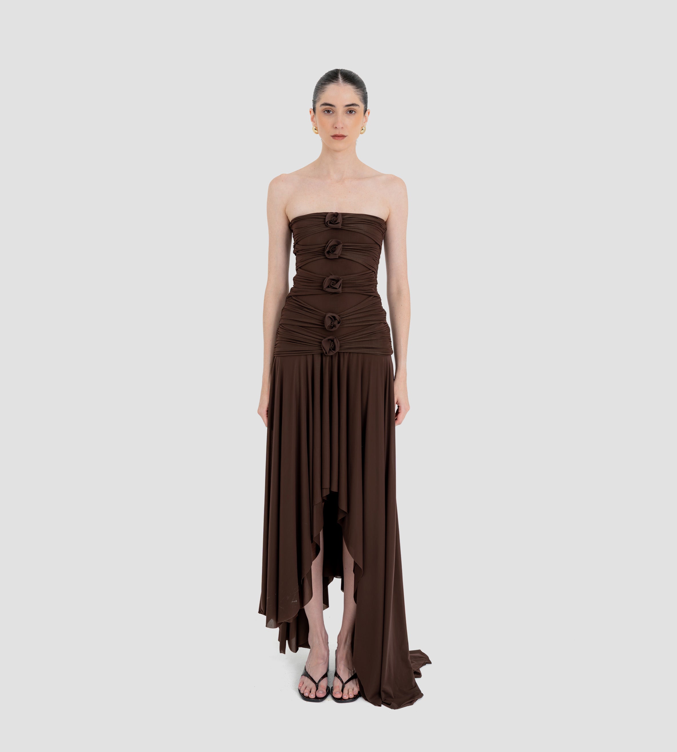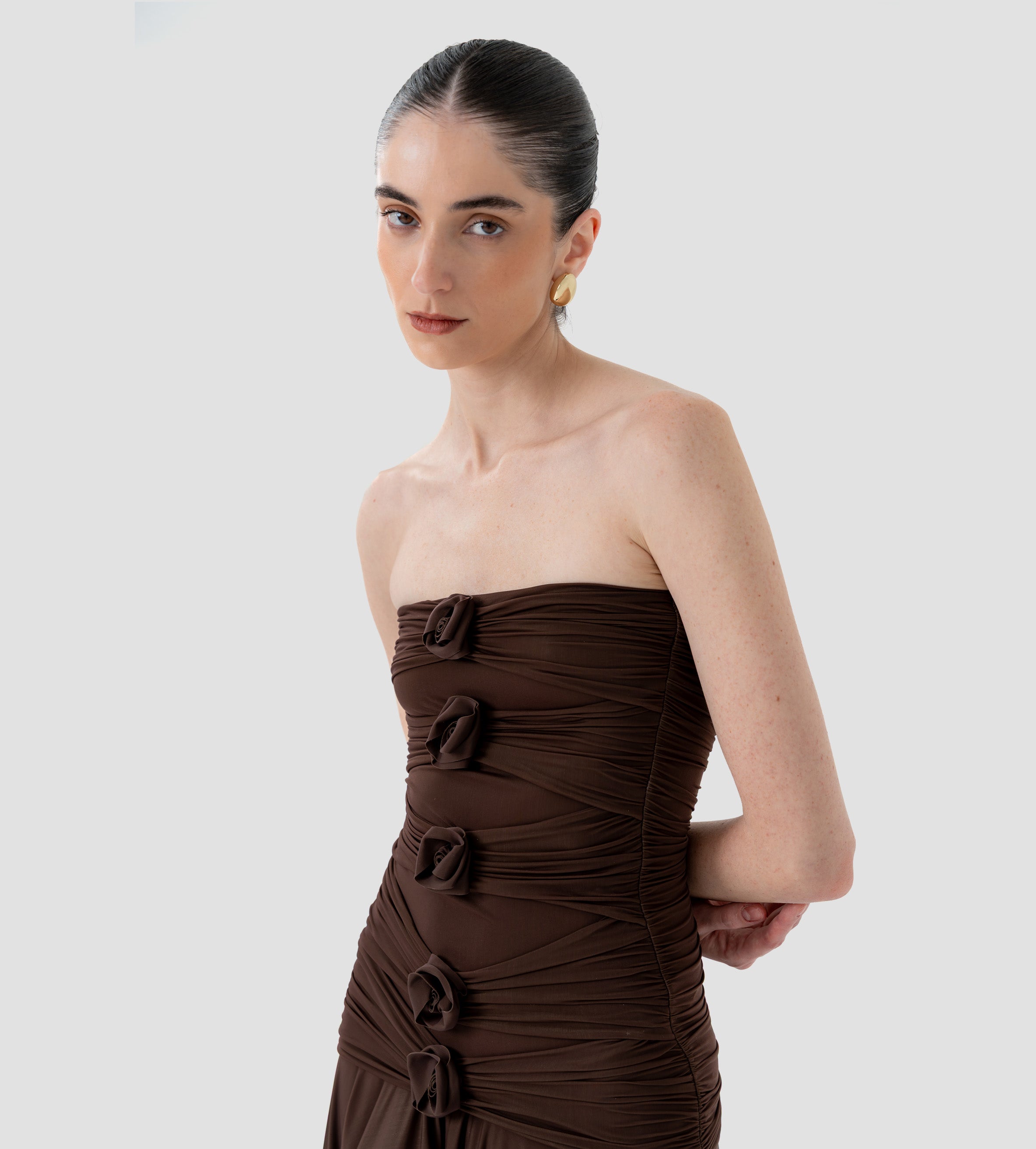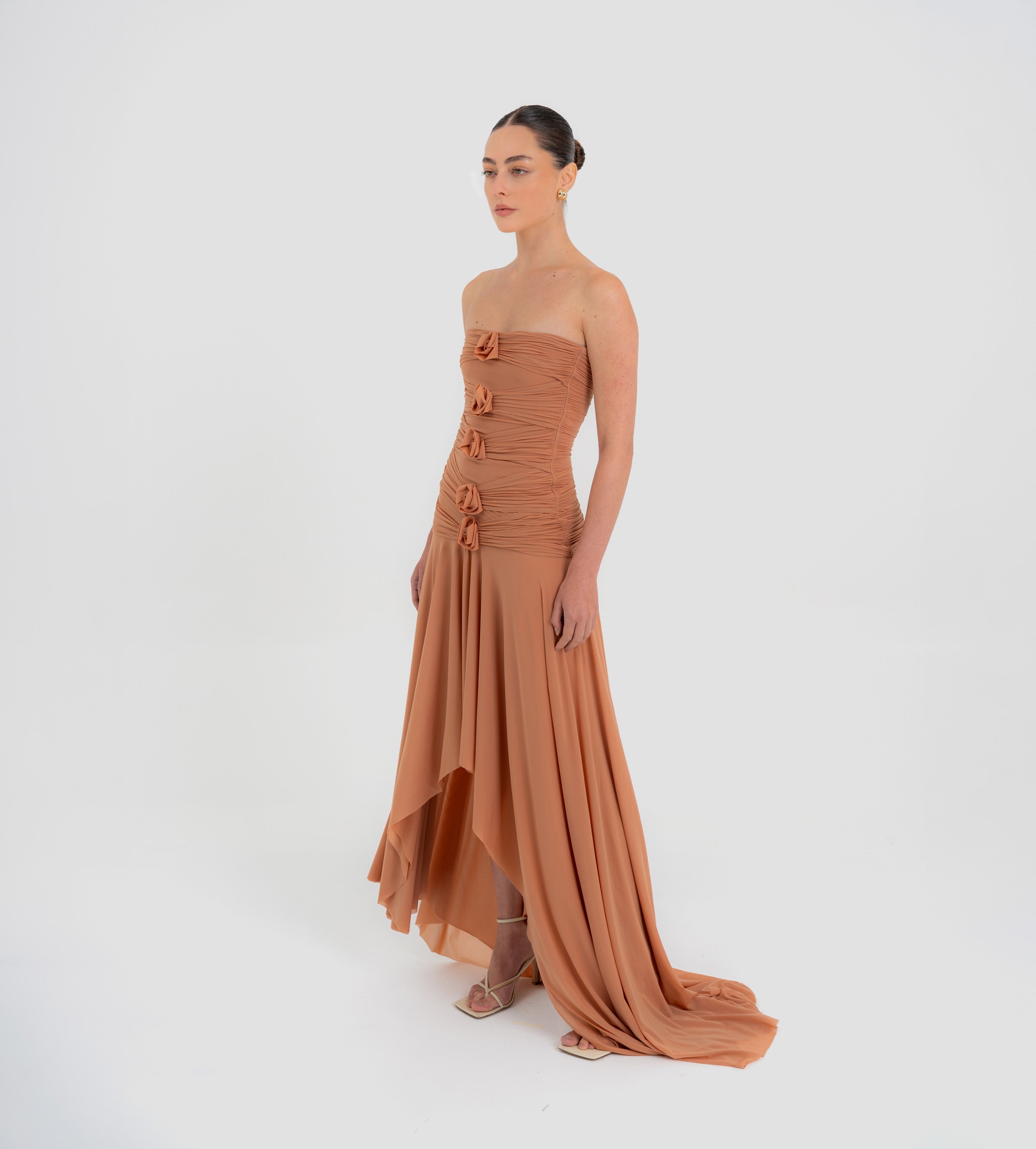 Nuestro vestido Andi destaca un escote strapless, construido a partir de una sofisticada composición de dos capas. Una base interna de ajuste perfecto se superpone con piezas fruncidas estratégicamente ubicadas, creando una segunda capa con carácter escultórico y acentuada por detalles florales centrales en 3D, dando paso a una falda larga irregular de dos capas. En la parte posterior del top un suave drapeado balancea este diseño cautivador.