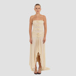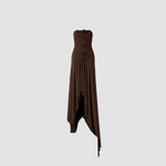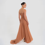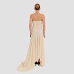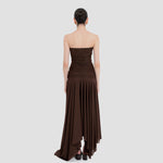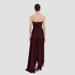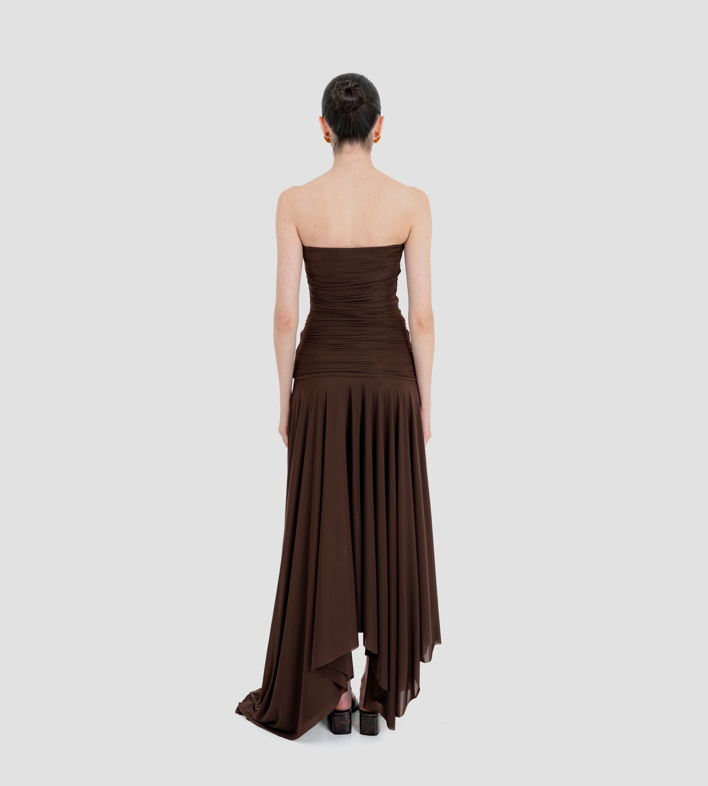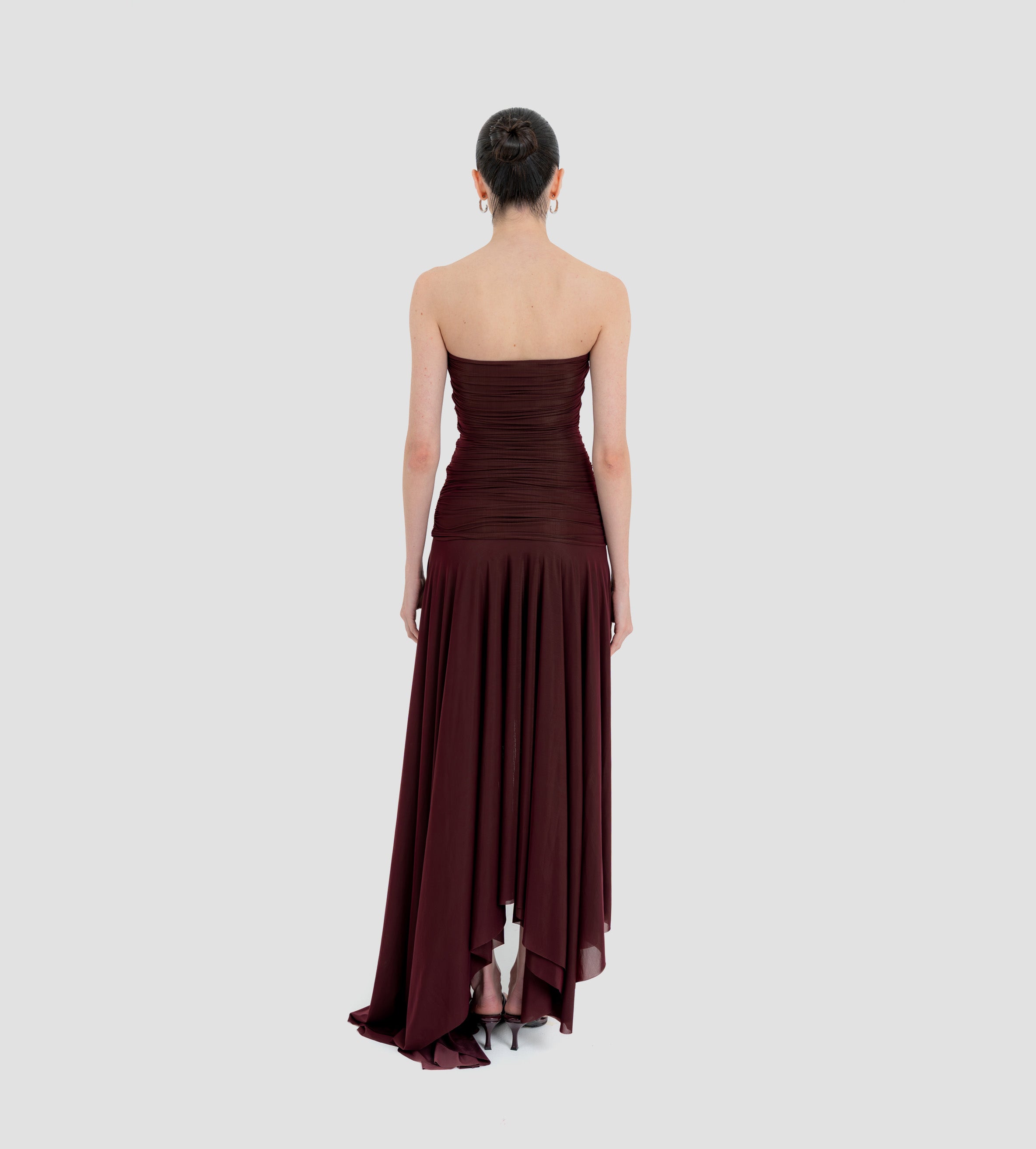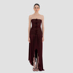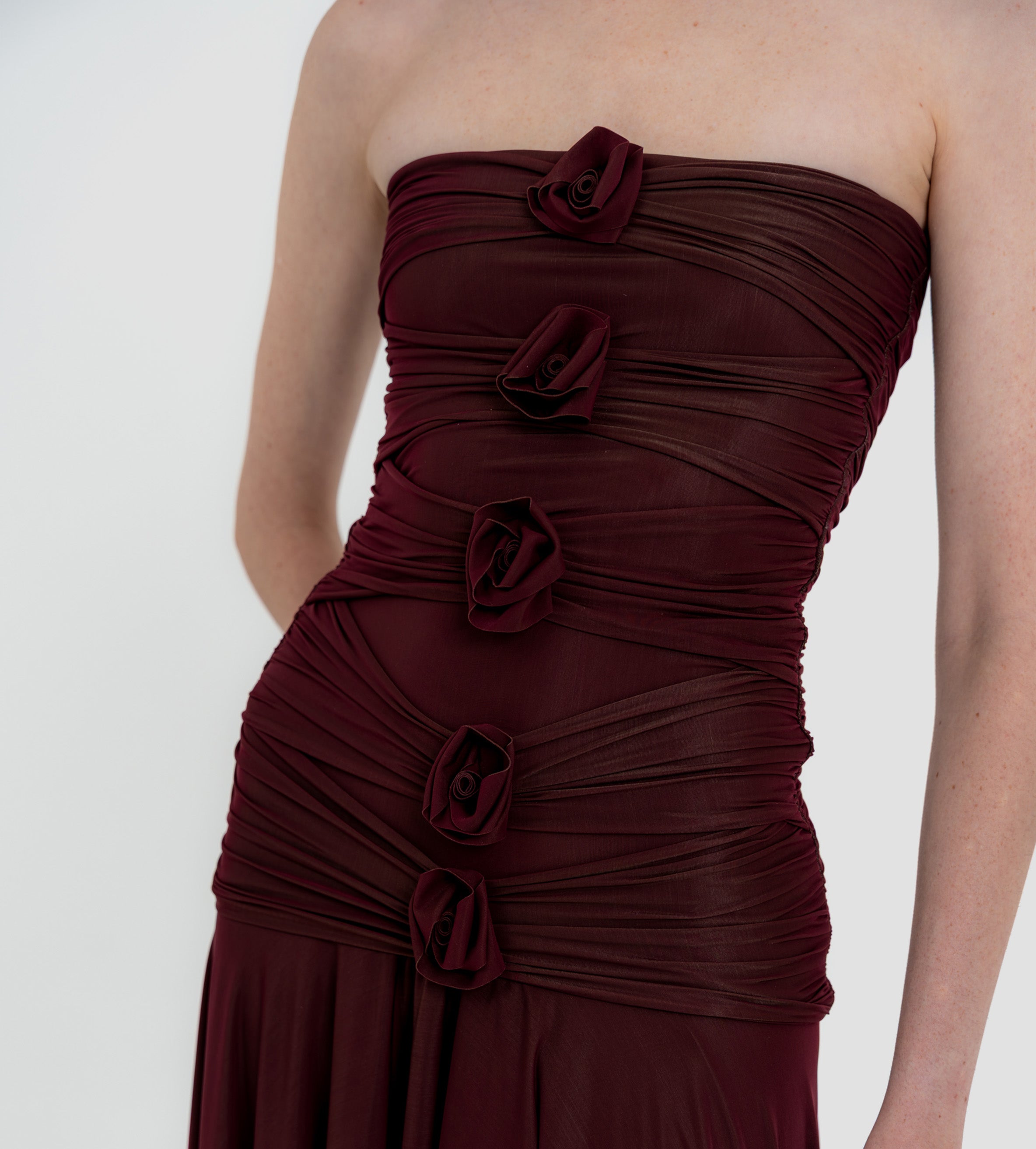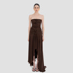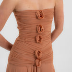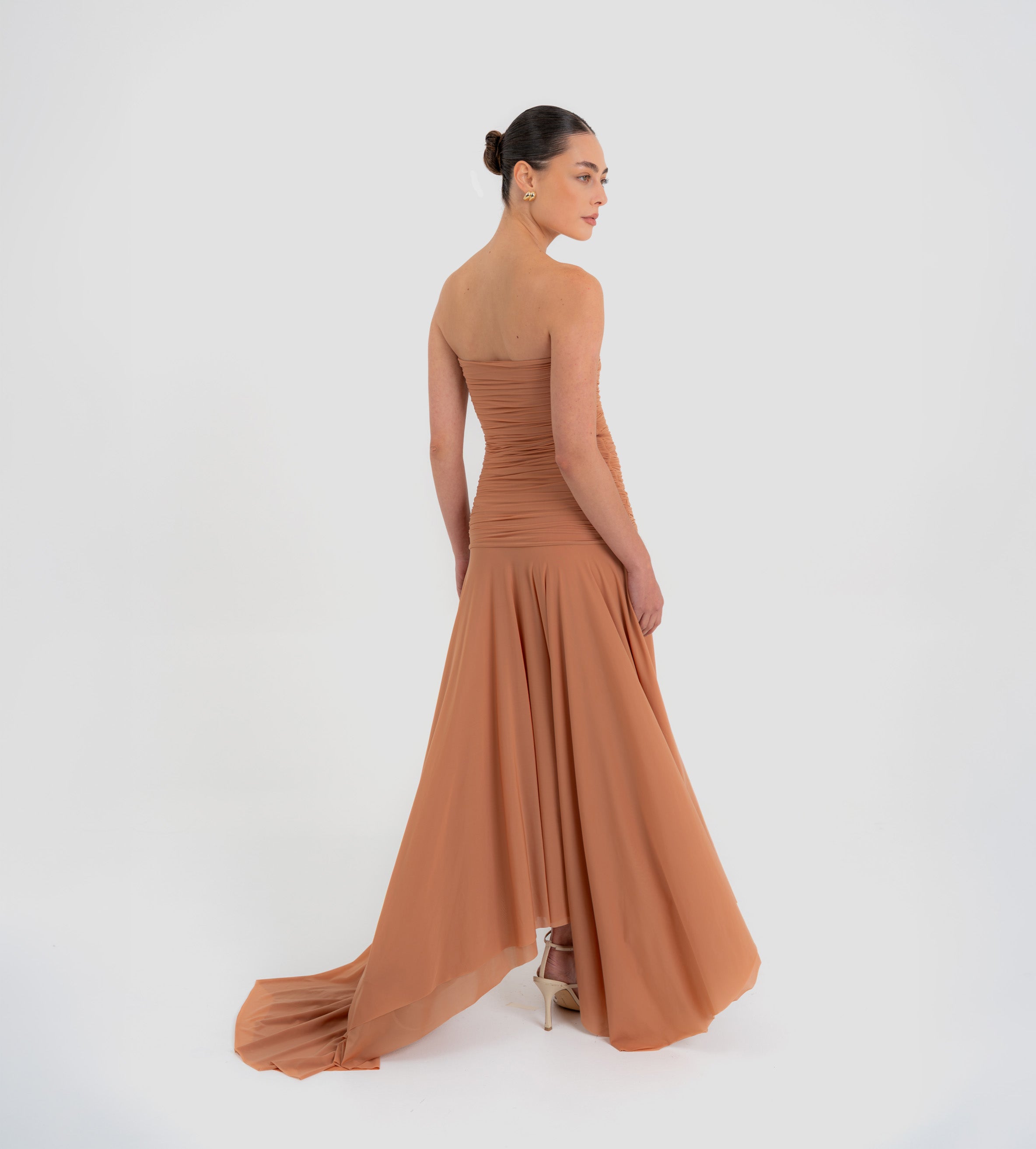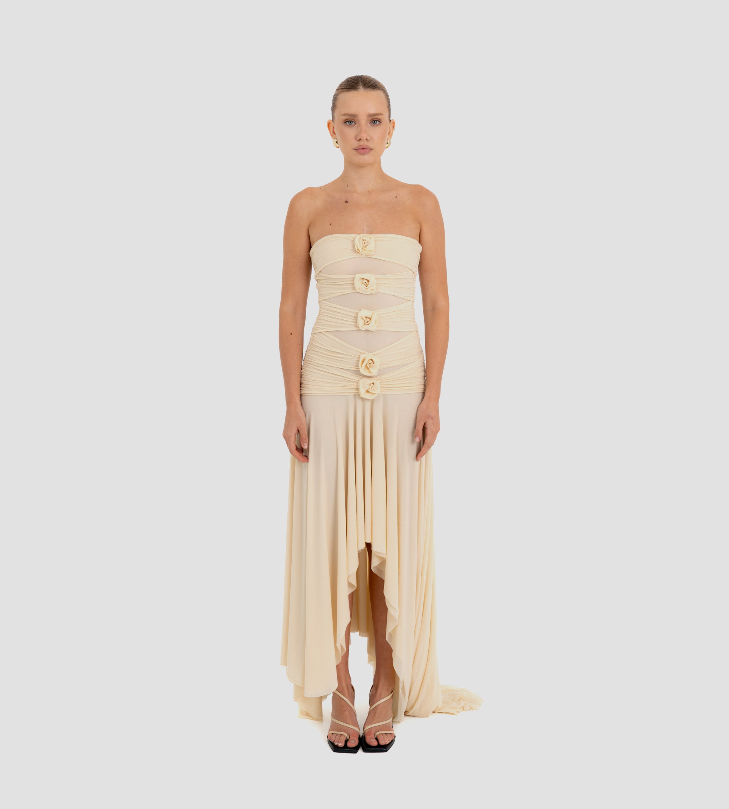 Nuestro vestido Andi destaca un escote strapless, construido a partir de una sofisticada composición de dos capas. Una base interna de ajuste perfecto se superpone con piezas fruncidas estratégicamente ubicadas, creando una segunda capa con carácter escultórico y acentuada por detalles florales centrales en 3D, dando paso a una falda larga irregular de dos capas. En la parte posterior del top un suave drapeado balancea este diseño cautivador.