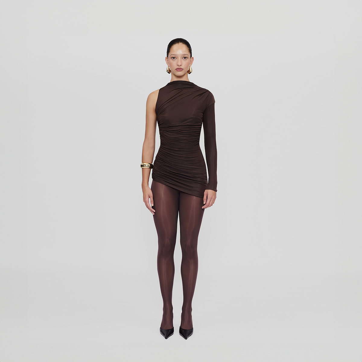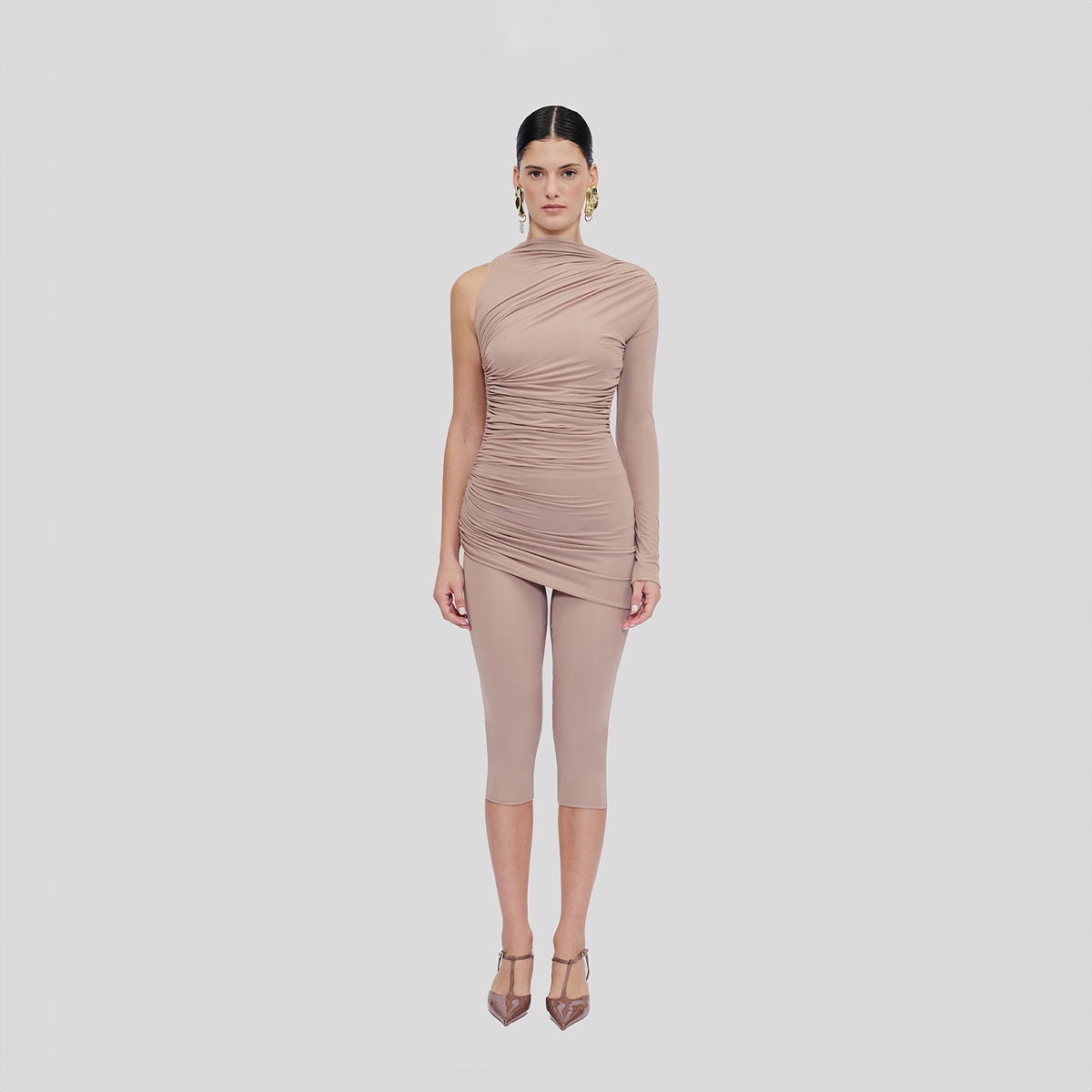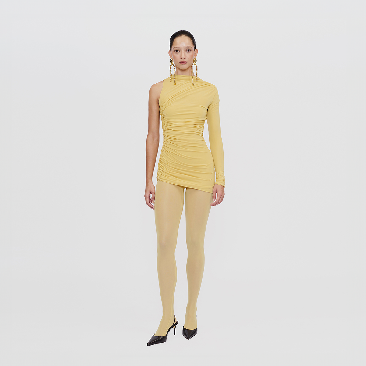 El enterizo Aragma en nuestra nueva lycra semitransparente combina elegancia y originalidad. Su diseño de cuello alto y silueta asimétrica drapeada sobre el cuerpo se complementa con una sola manga larga y una abertura en forma de lágrima en la parte posterior. Este conjunto dinámico evoca la esencia de un vestido mini, e incluye un body interior para una versatilidad máxima.