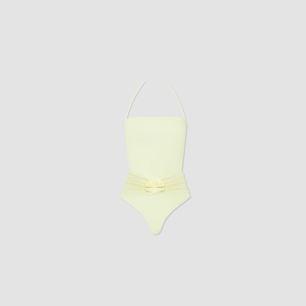 Traje de baño de una pieza con escote recto, delicado detalle fruncido en cintura en delantero y espalda, adornado con nuestra distintiva flor 3D hecha a mano y una tira elegante al cuello; un diseño minimalista que representa la esencia femenina de la marca.