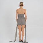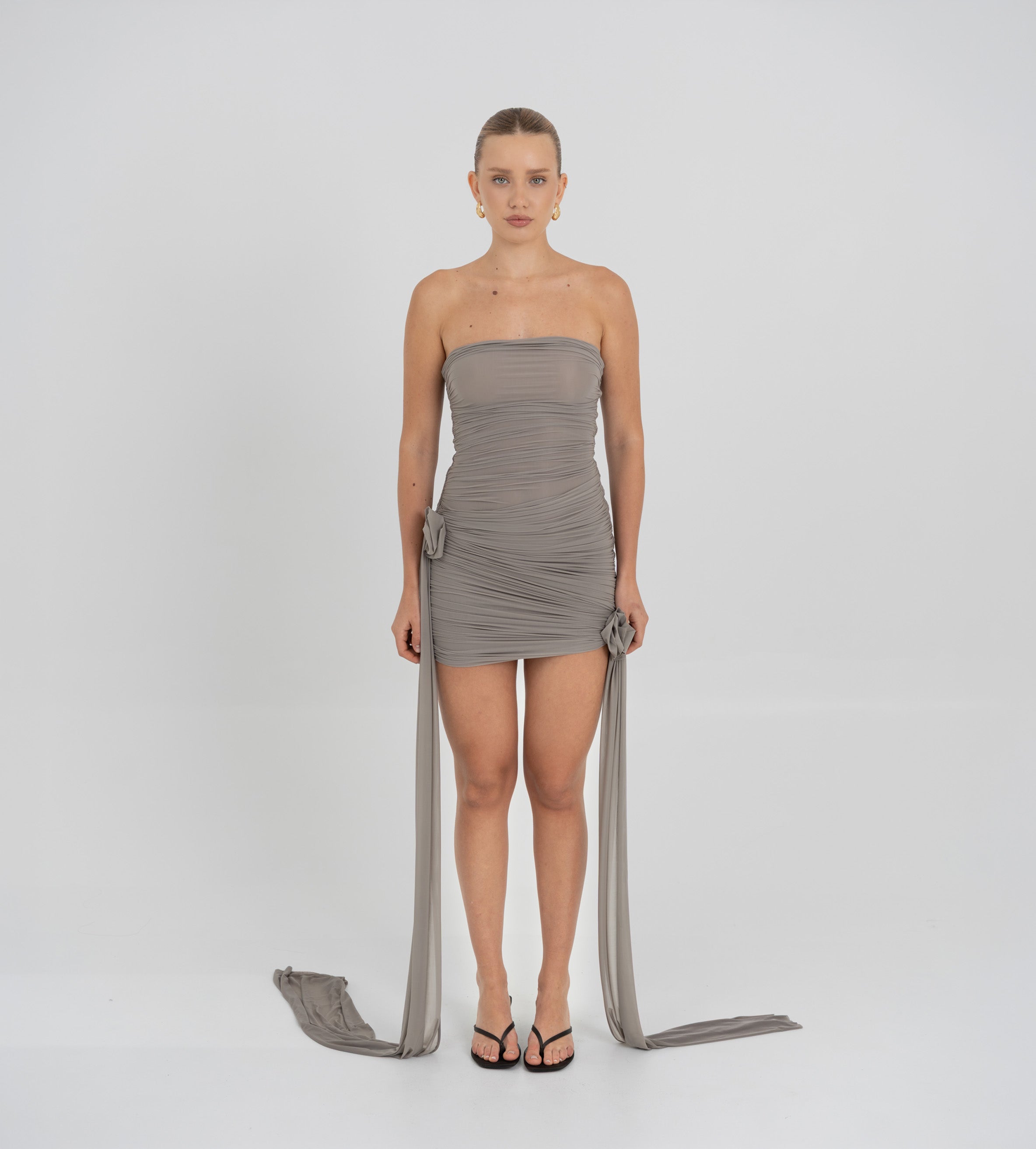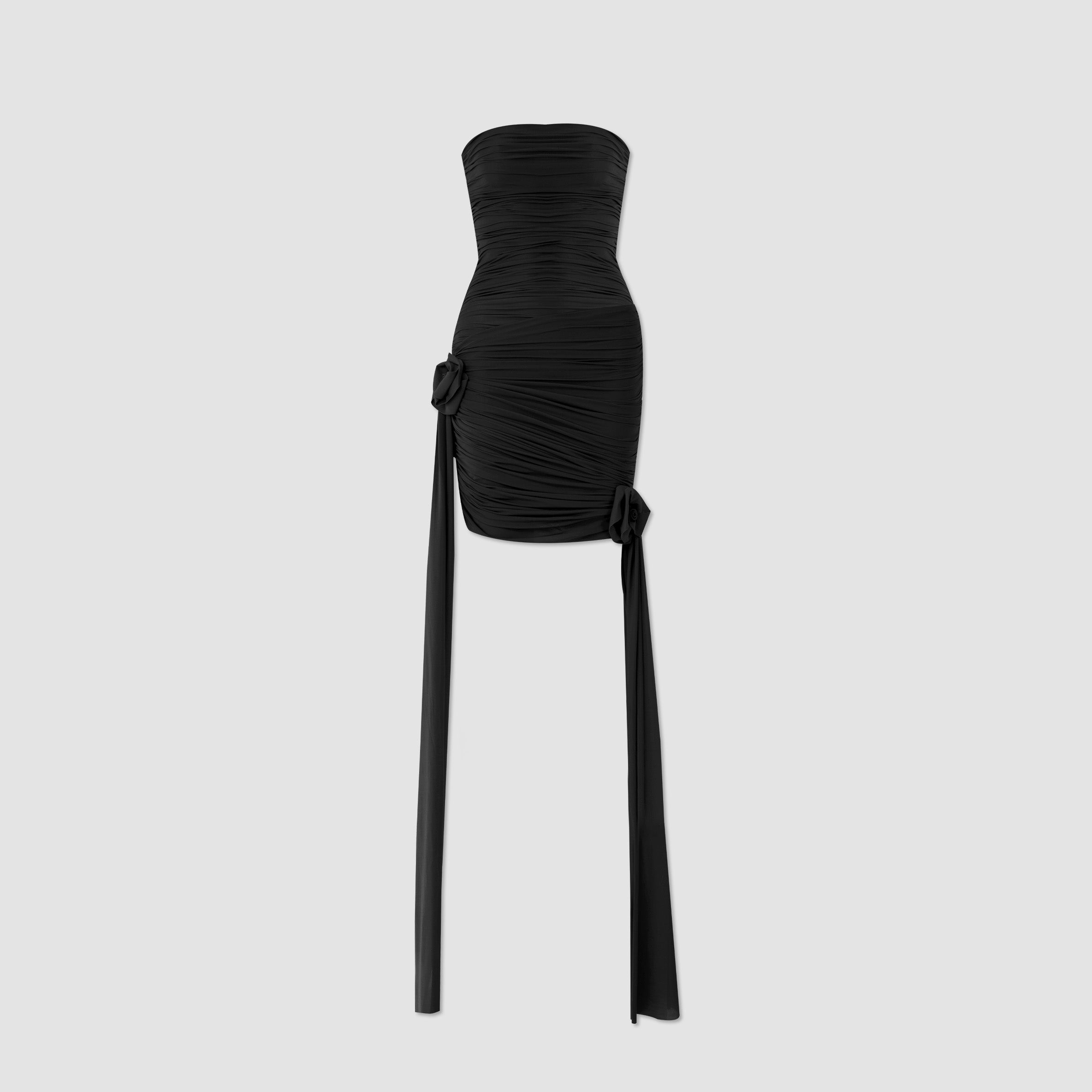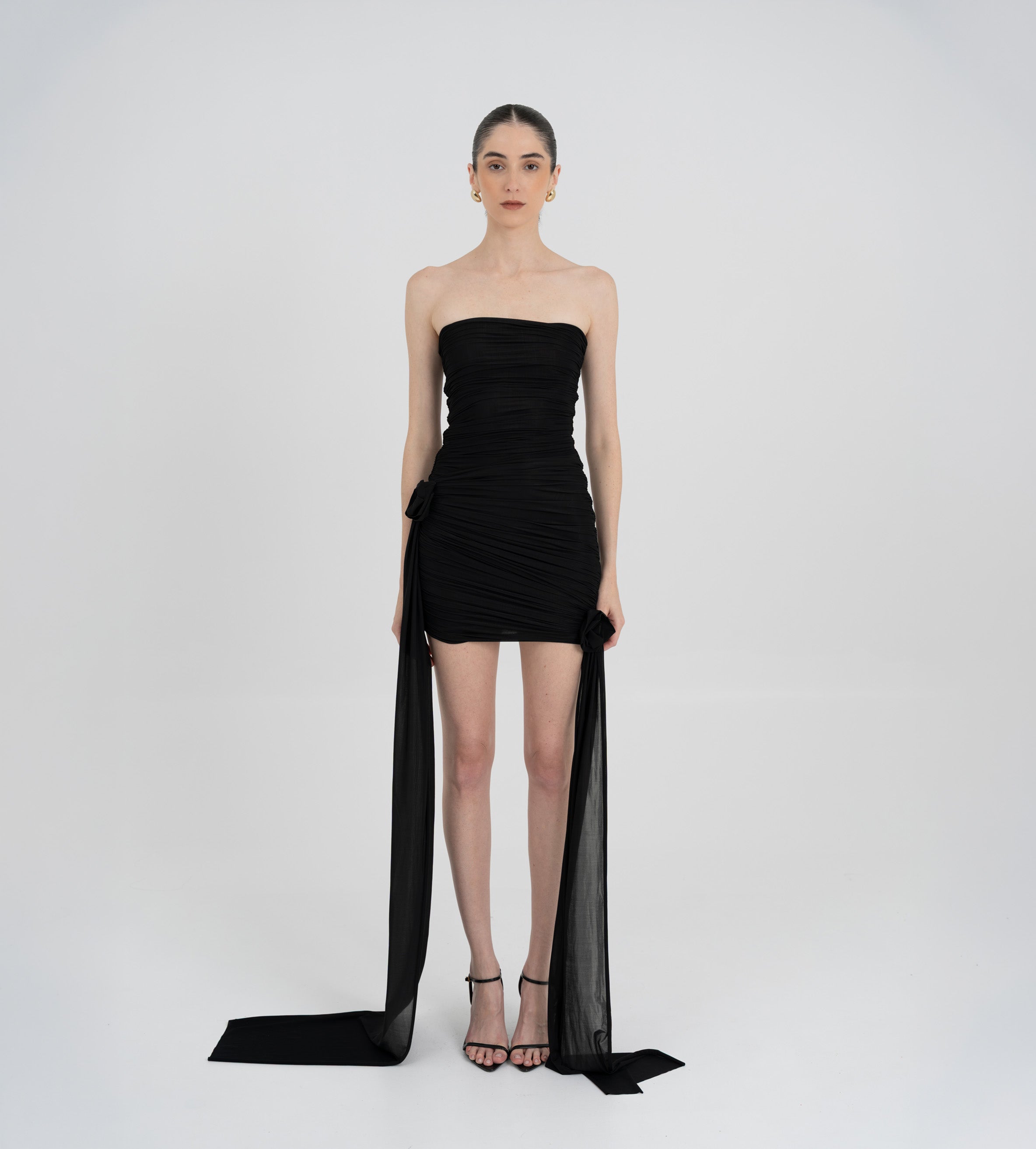 Nuestro vestido mini Arena presenta un escote strapless y un estilo totalmente fruncido en el delantero, equilibrado por una espalda fruncida en dos paneles. Dos paños laterales definen la silueta: uno atraviesa el vestido sobre la cintura y cae sobre el lateral, mientras que el otro se extiende desde el costado, aportando movimiento y dimensión. Ambos paños enmarcan un detalle de flor 3D realzando el atractivo dramático y femenino del diseño