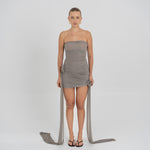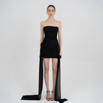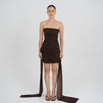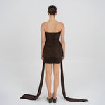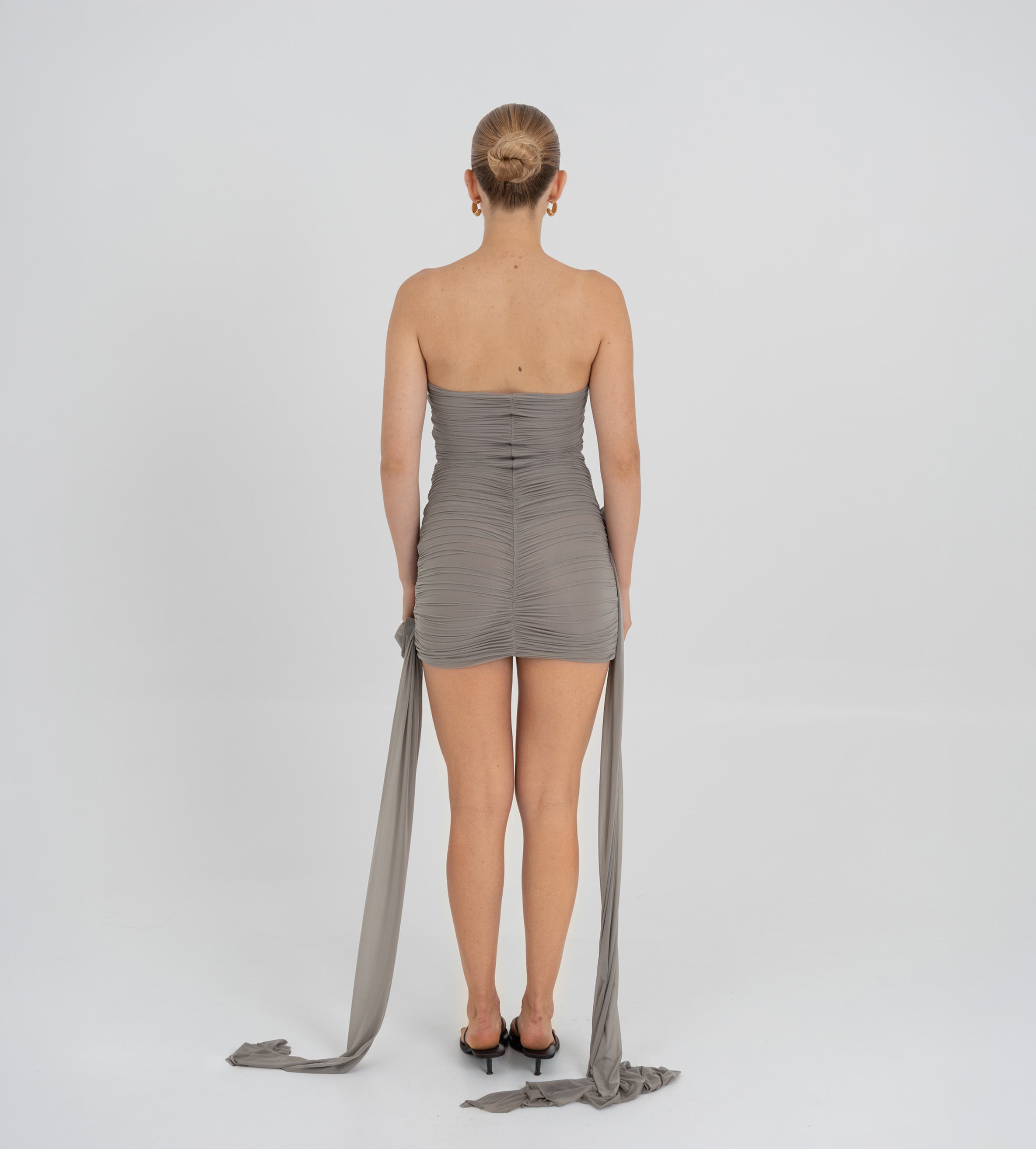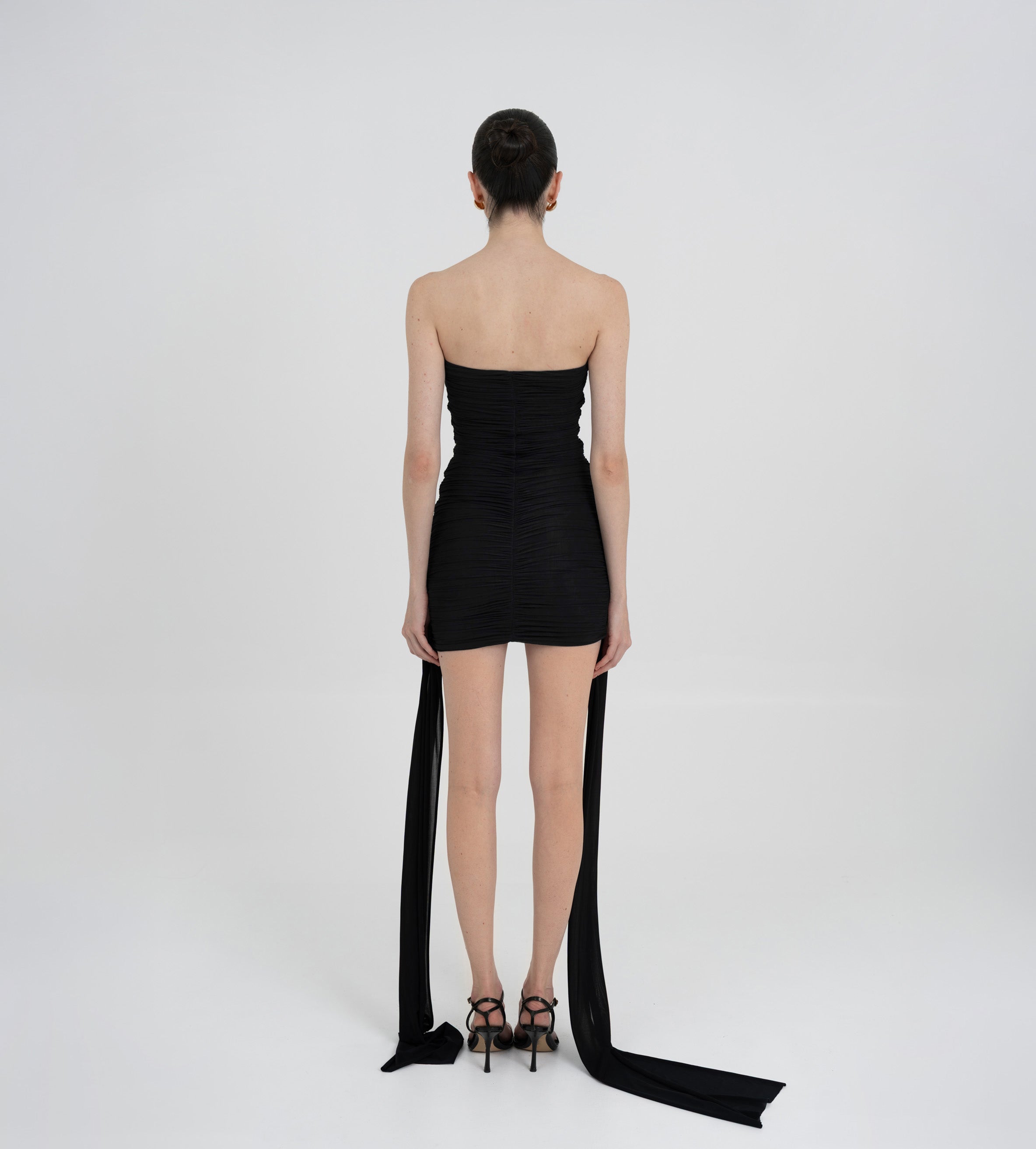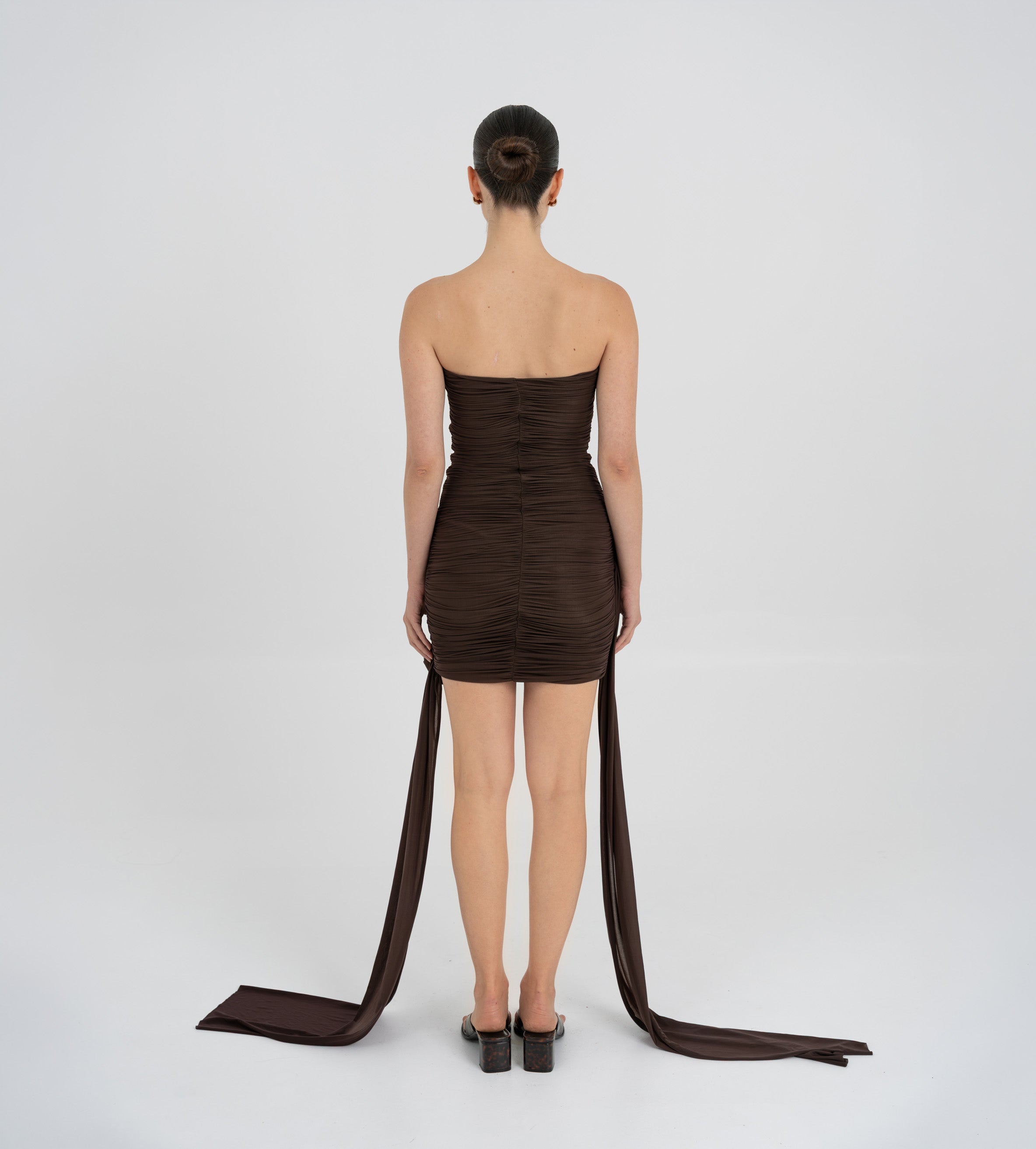Nuestro vestido mini Arena presenta un escote strapless y un estilo totalmente fruncido en el delantero, equilibrado por una espalda fruncida en dos paneles. Dos paños laterales definen la silueta: uno atraviesa el vestido sobre la cintura y cae sobre el lateral, mientras que el otro se extiende desde el costado, aportando movimiento y dimensión. Ambos paños enmarcan un detalle de flor 3D realzando el atractivo dramático y femenino del diseño