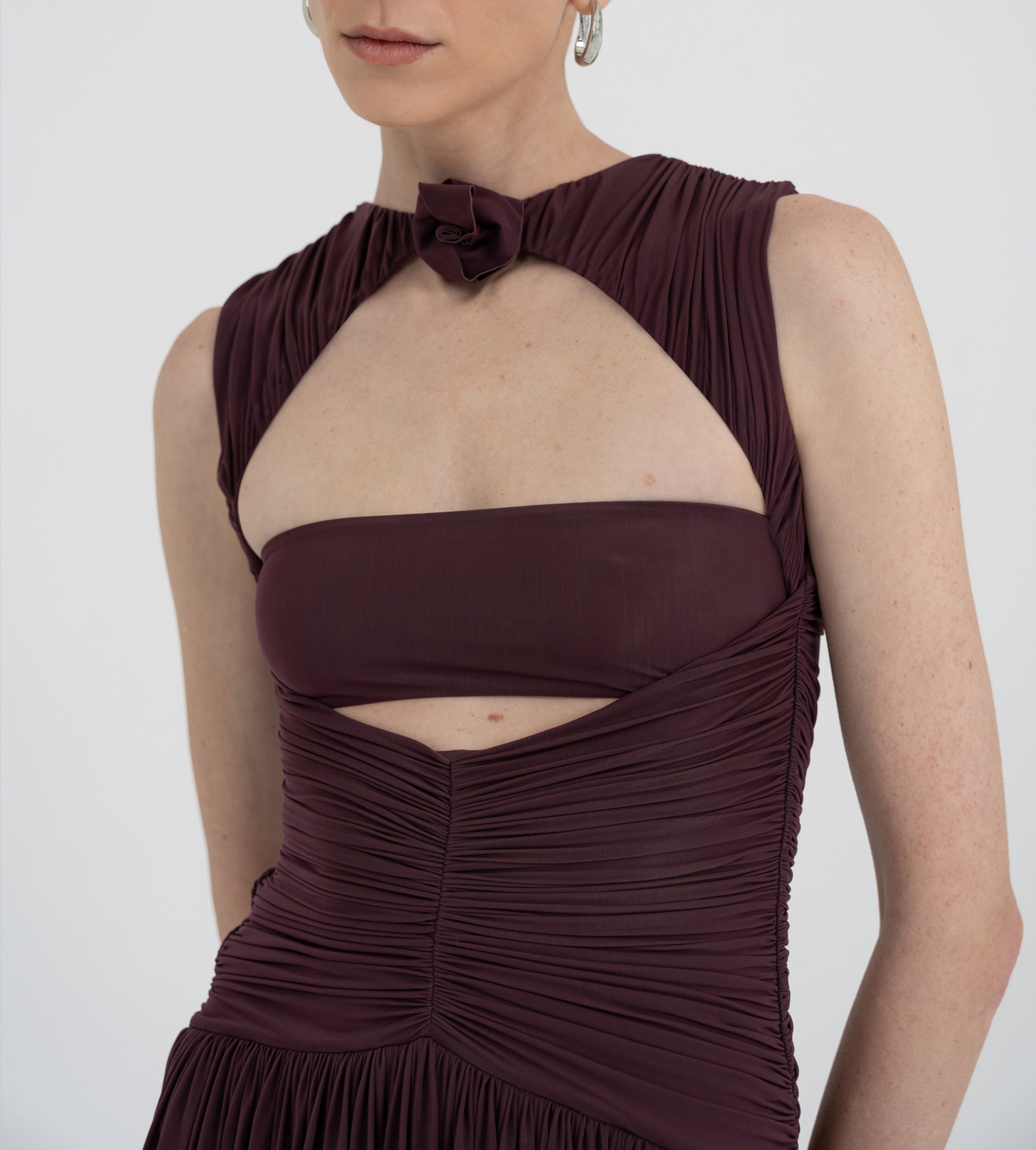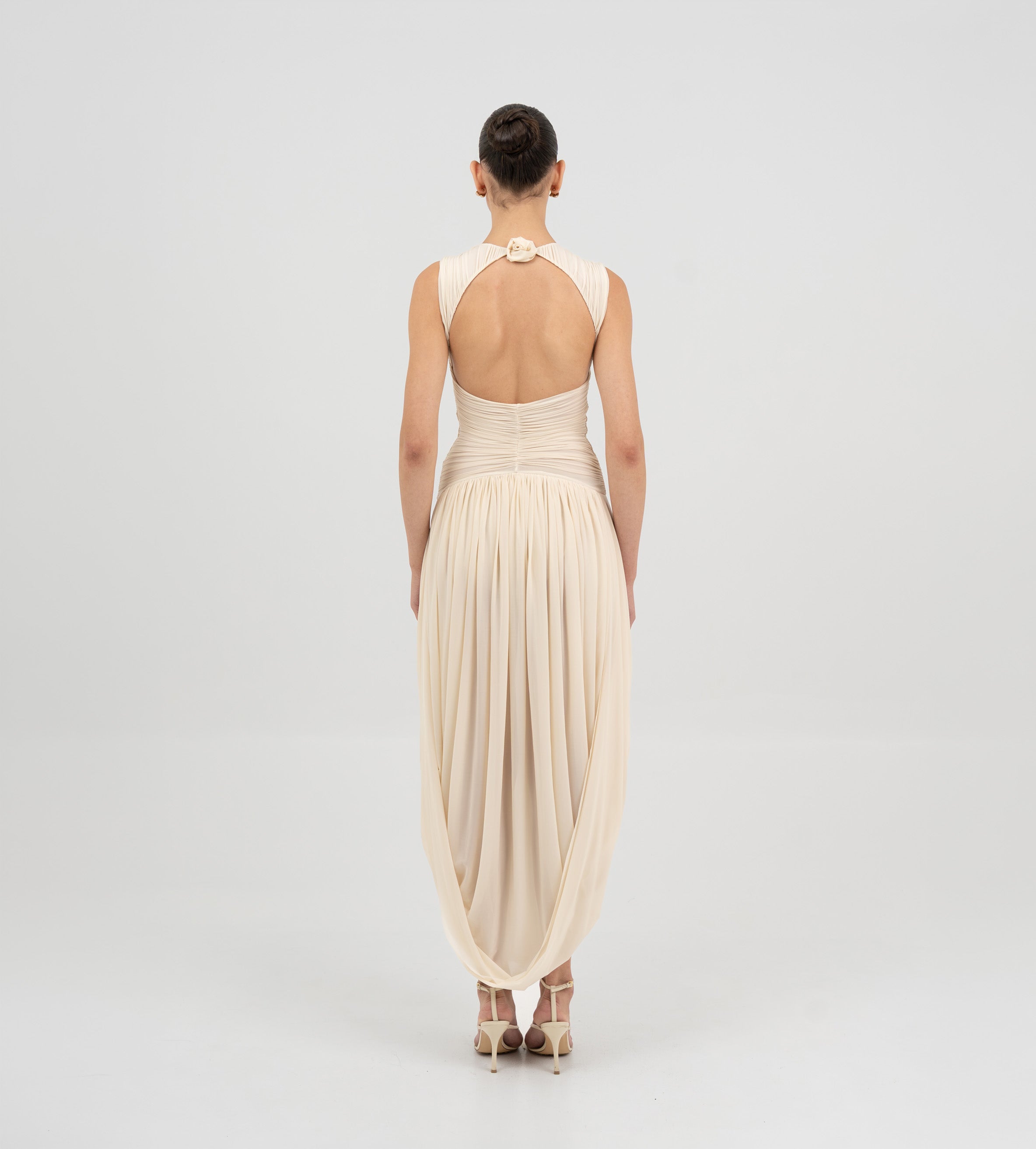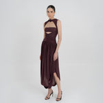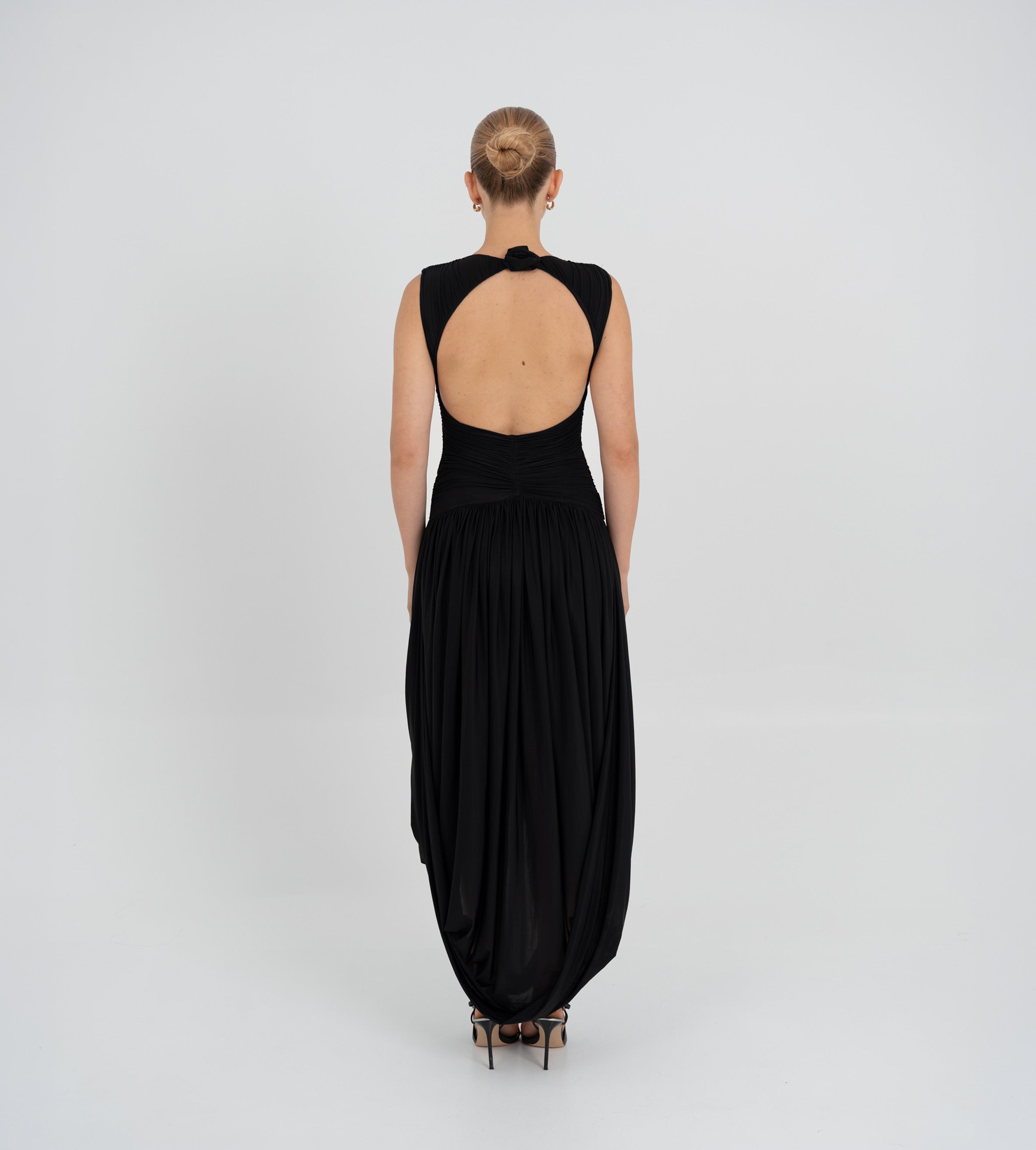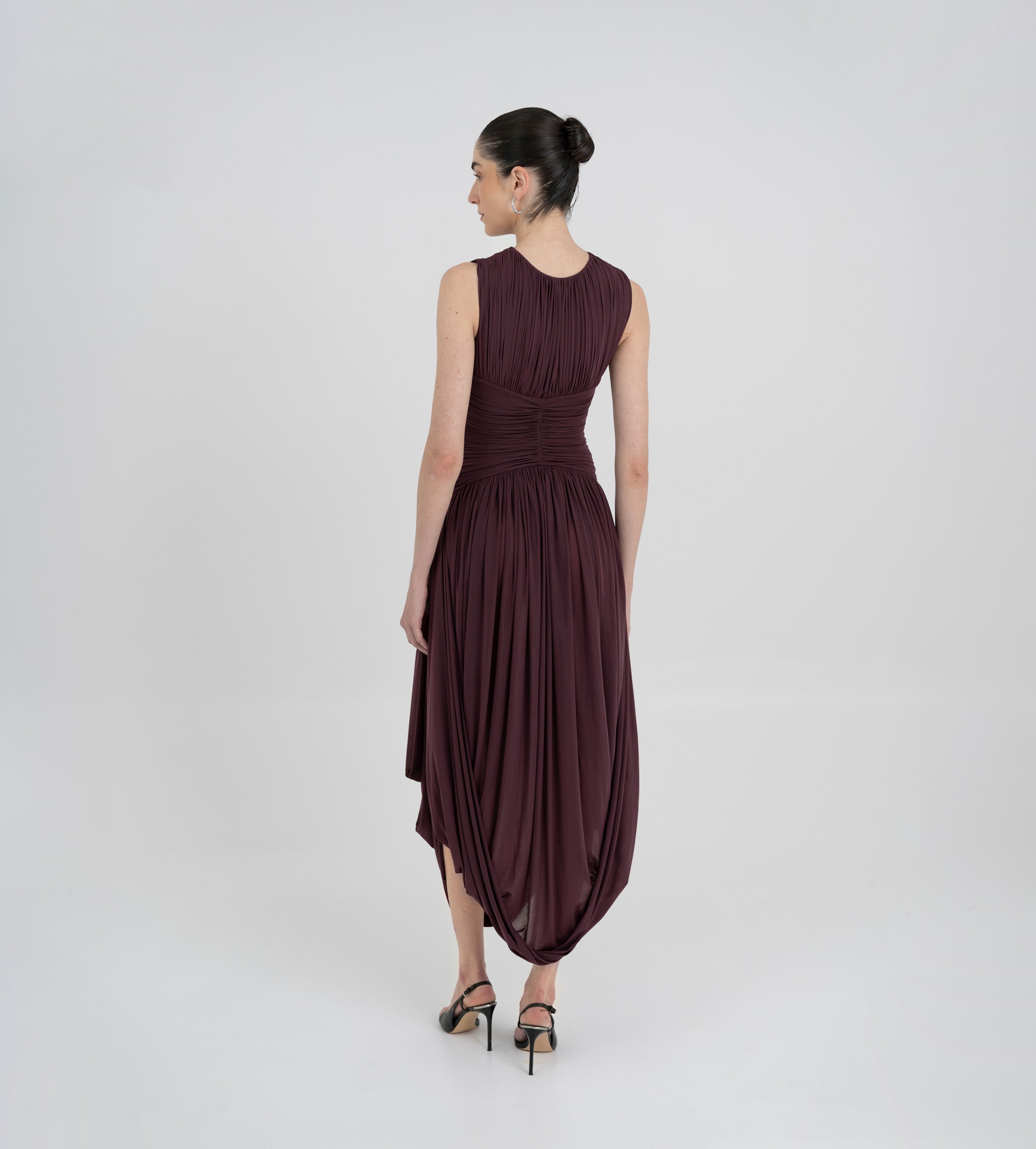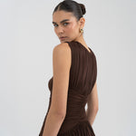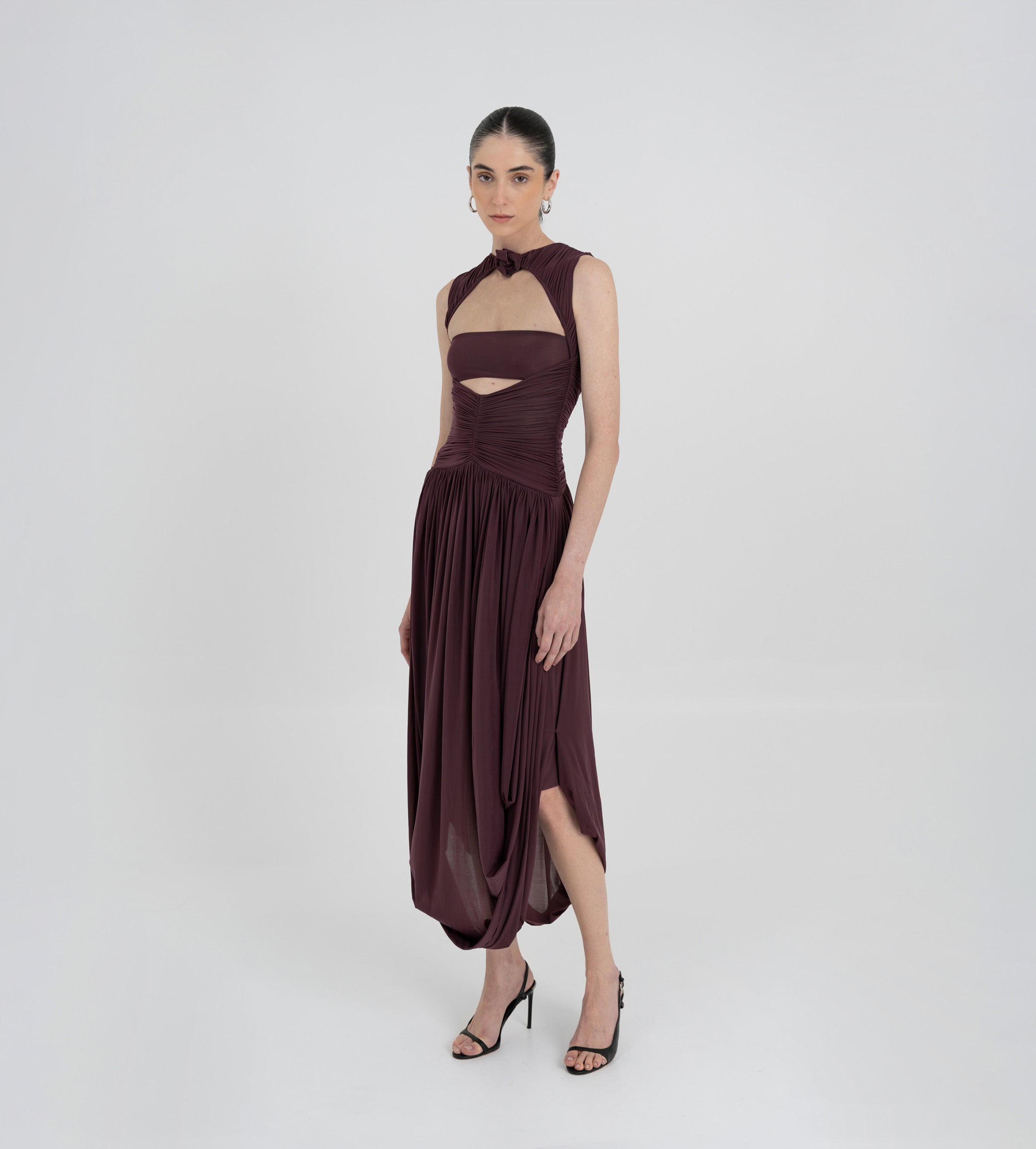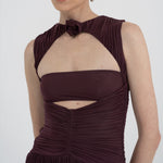 Nuestro vestido Atrio revela una cautivadora composición de detalles fruncidos, comenzando con un delicado escote redondo que fluye hacia un cuerpo fruncido verticalmente. La silueta se ajusta en la cintura mediante un drapeado de doble panel, que cae de forma fluida hacia una falda dramática y asimetría con movimiento. En la parte posterior, una escote redondeado aporta ese toque extra de sensualidad y se acentúa con un detalle floral en 3D.