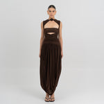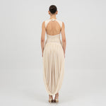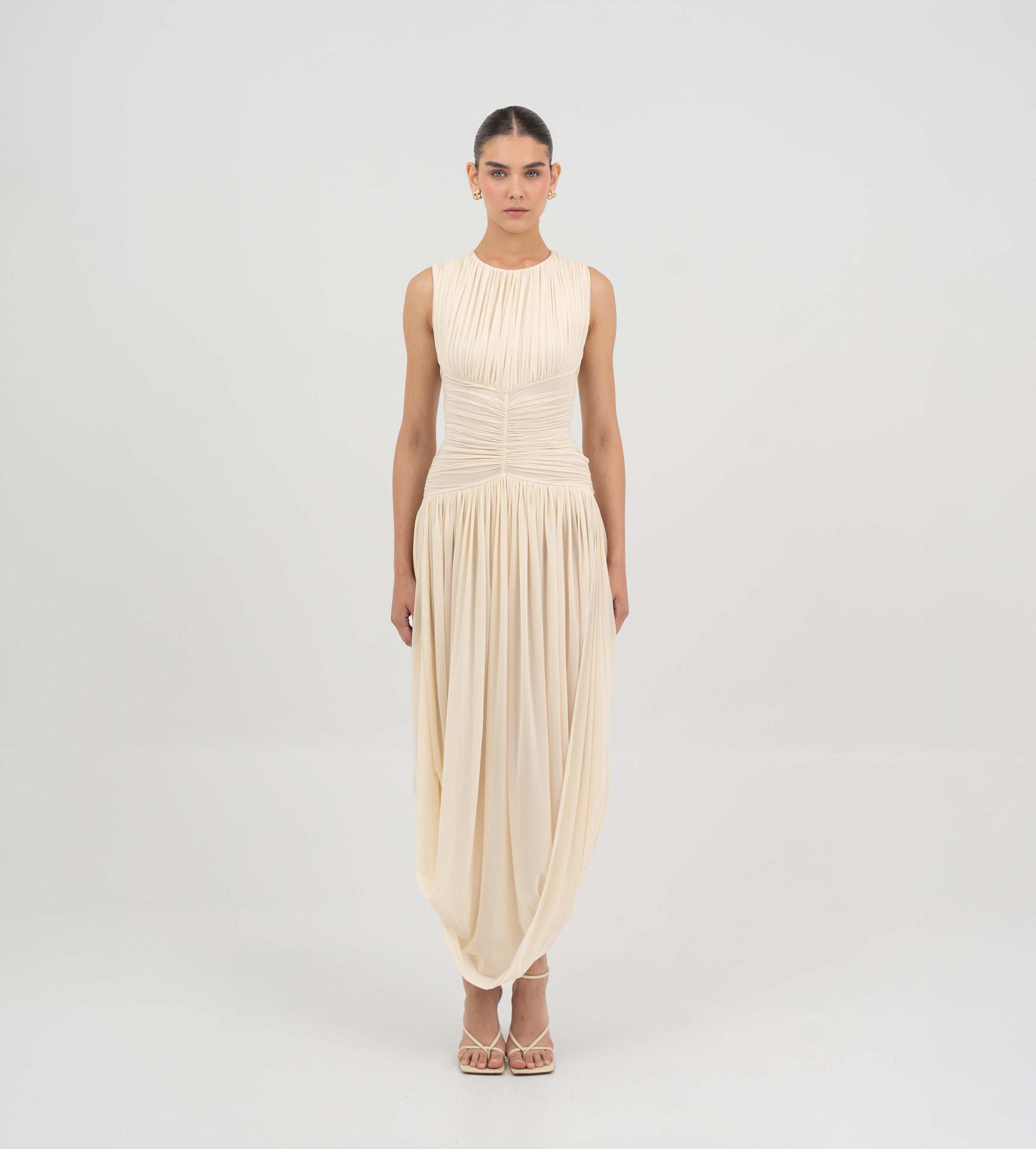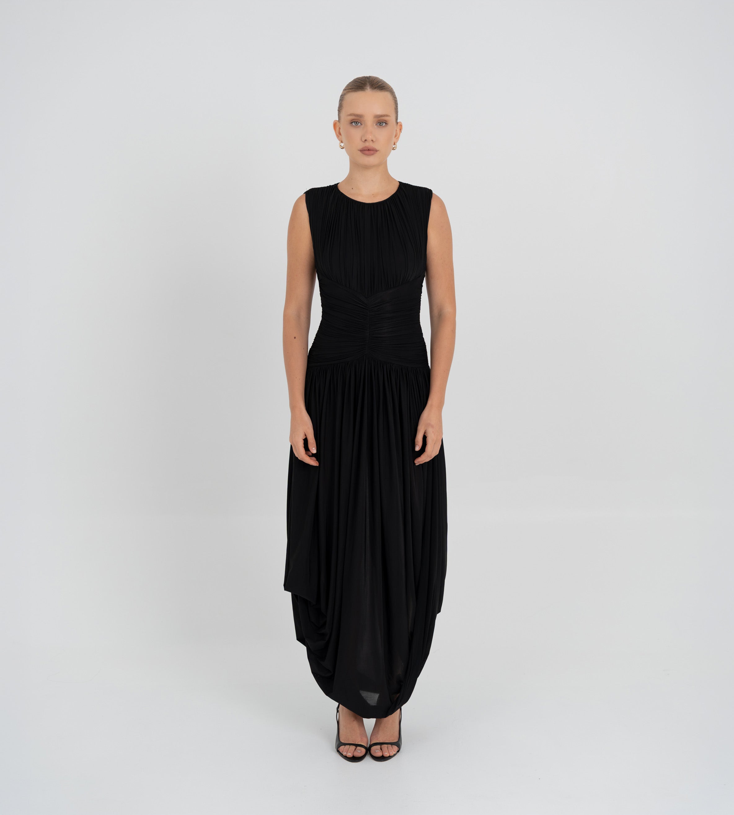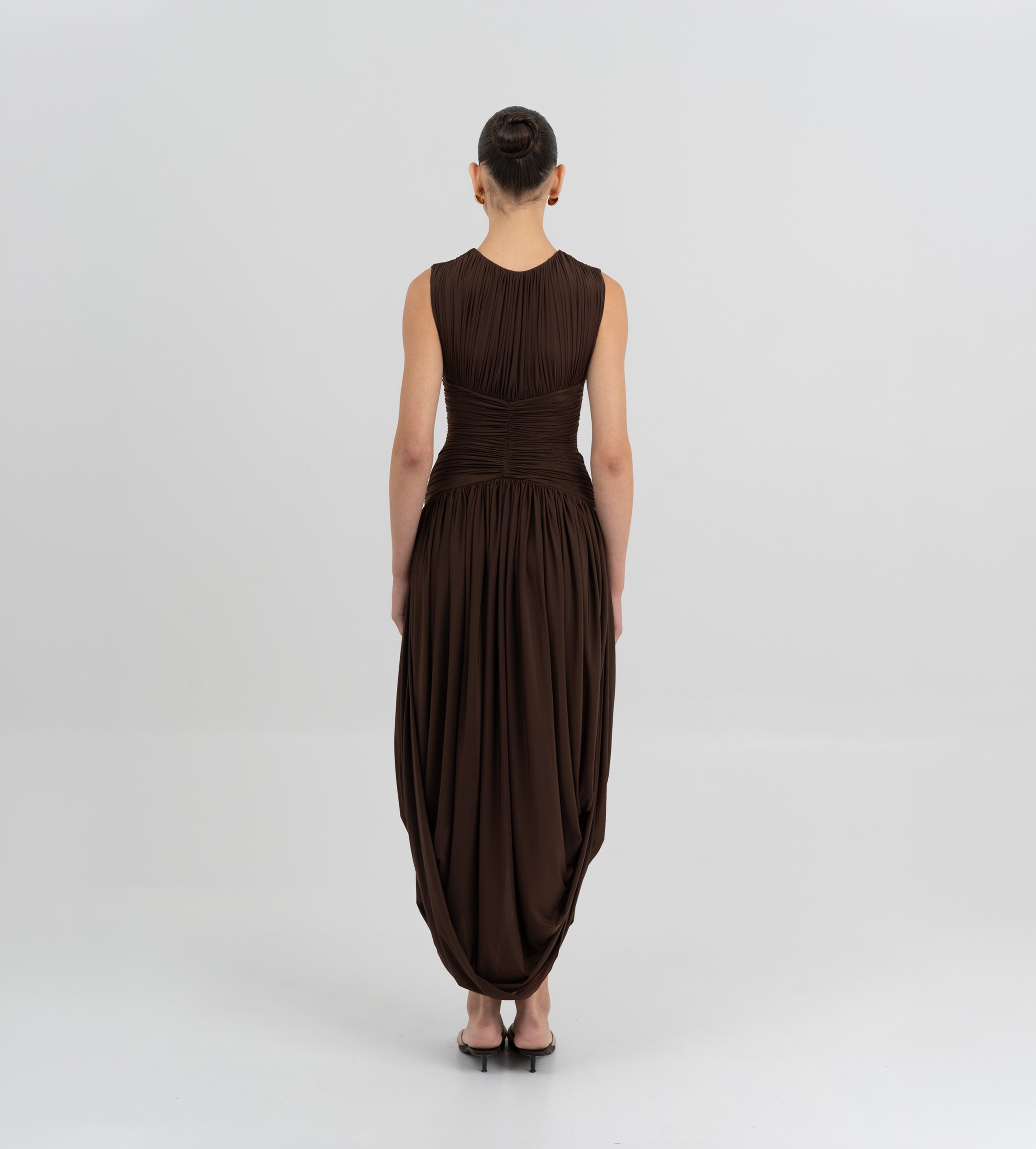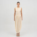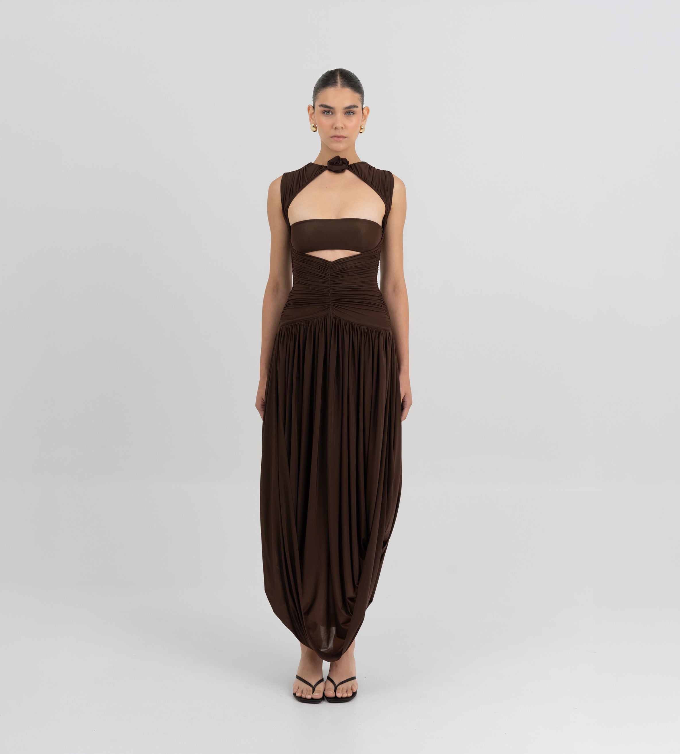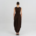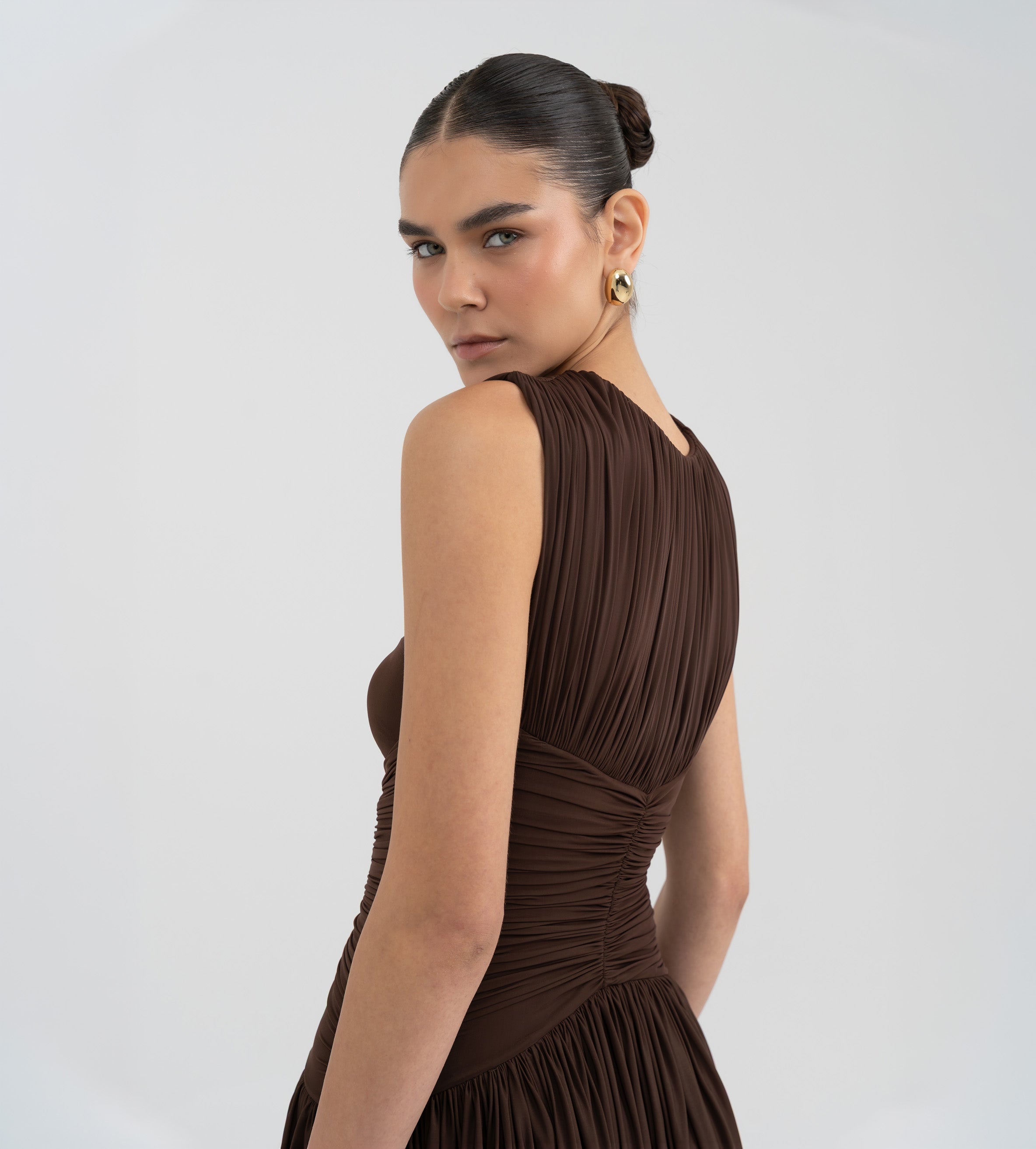 Nuestro vestido Atrio revela una cautivadora composición de detalles fruncidos, comenzando con un delicado escote redondo que fluye hacia un cuerpo fruncido verticalmente. La silueta se ajusta en la cintura mediante un drapeado de doble panel, que cae de forma fluida hacia una falda dramática y asimetría con movimiento. En la parte posterior, una escote redondeado aporta ese toque extra de sensualidad y se acentúa con un detalle floral en 3D.