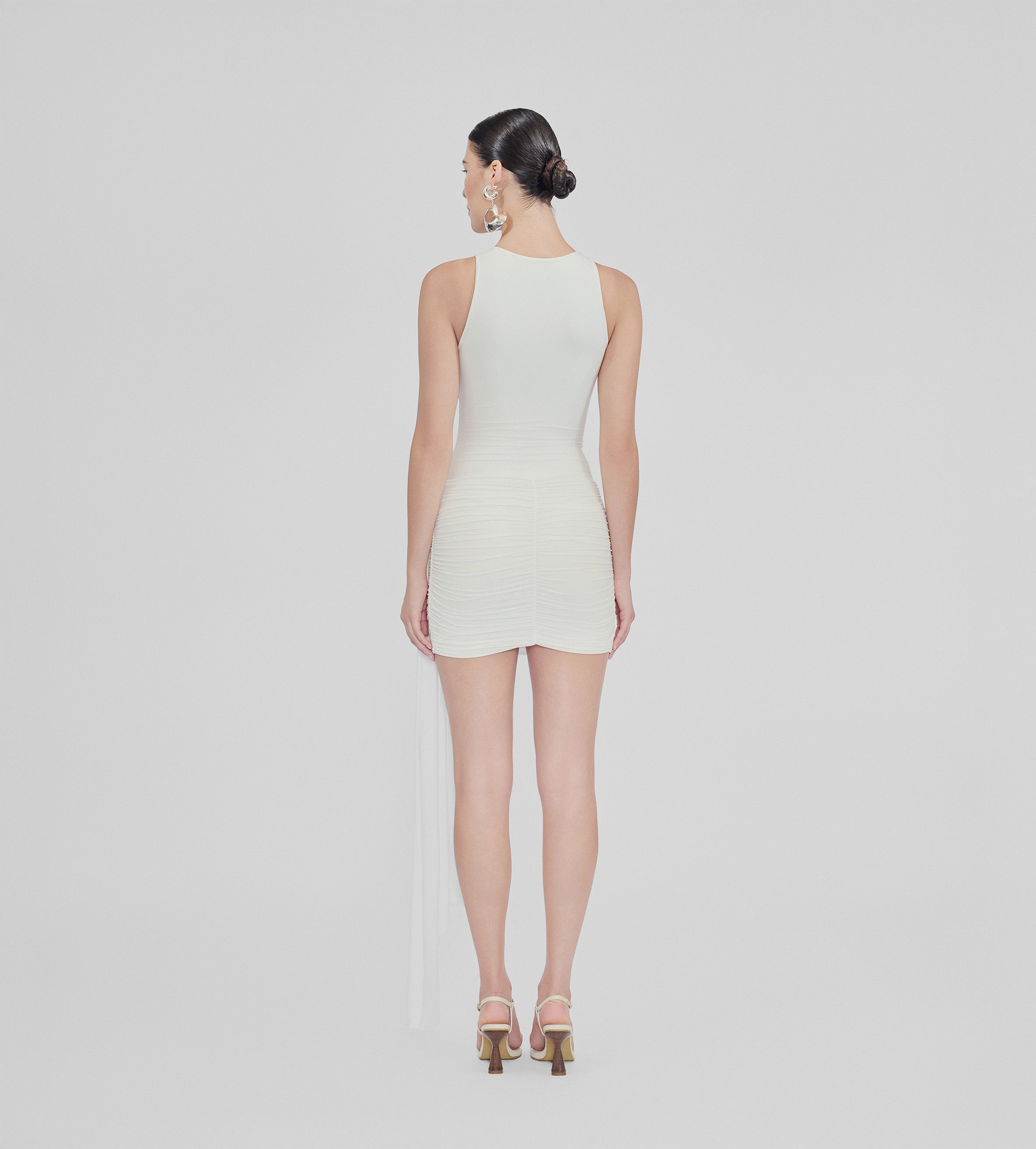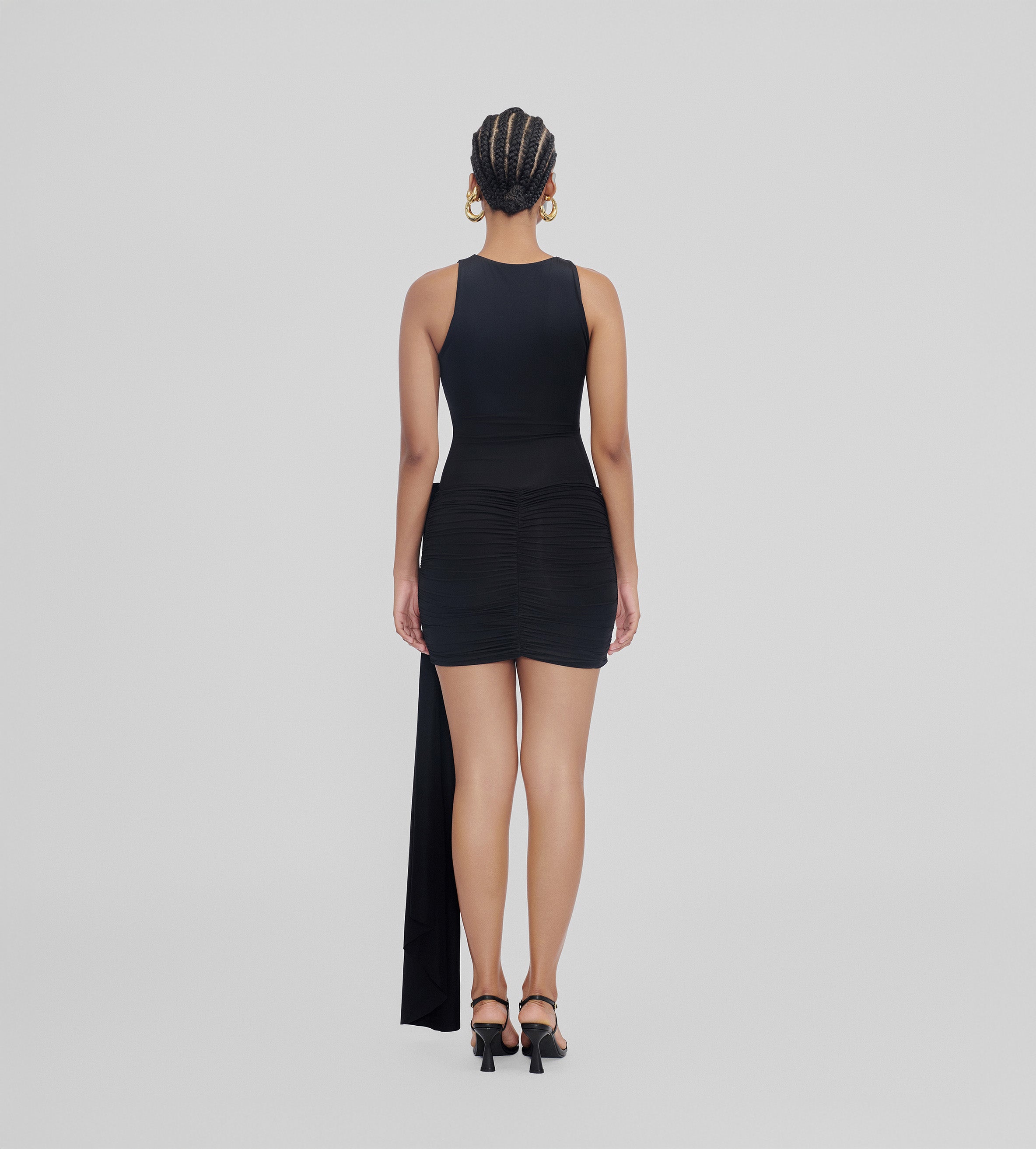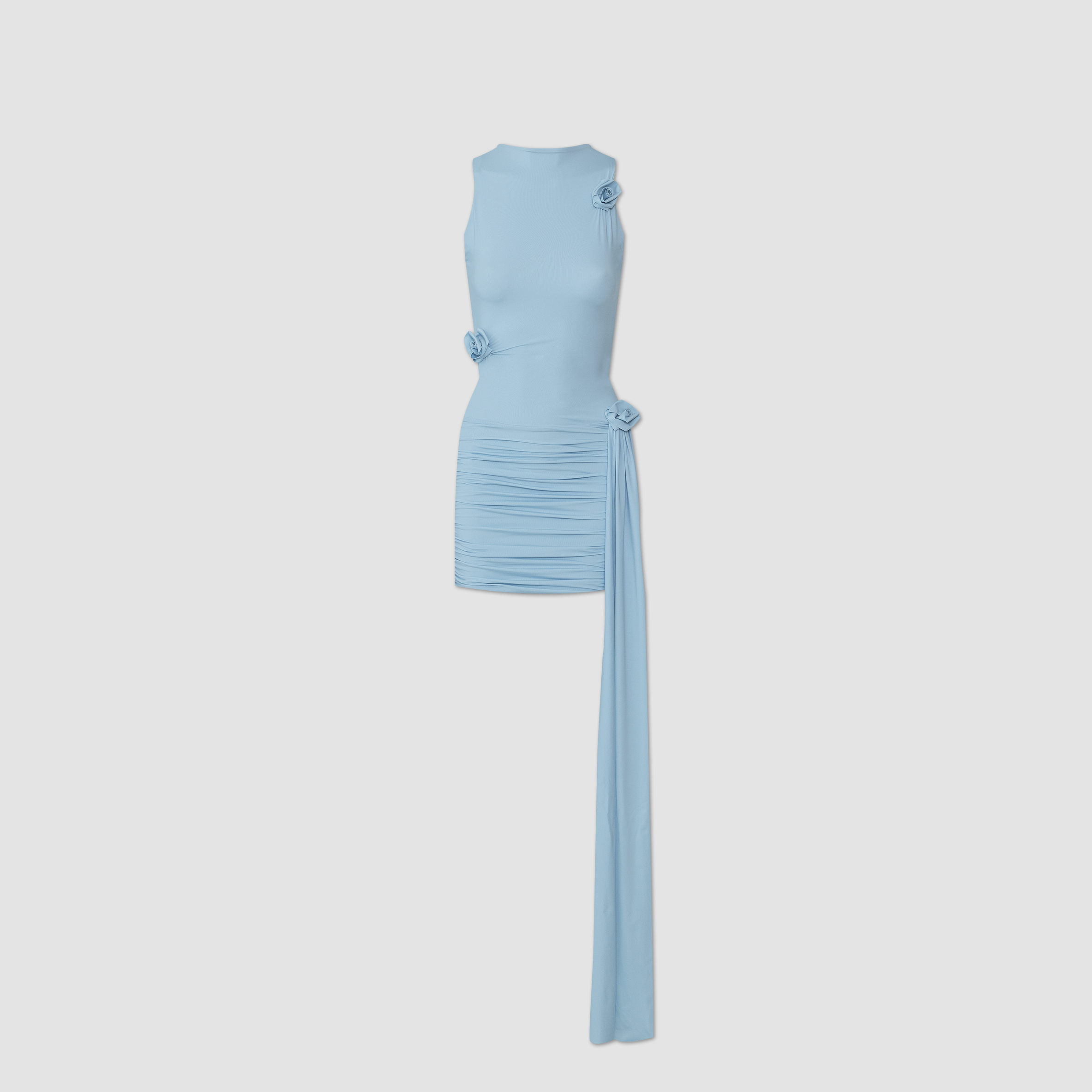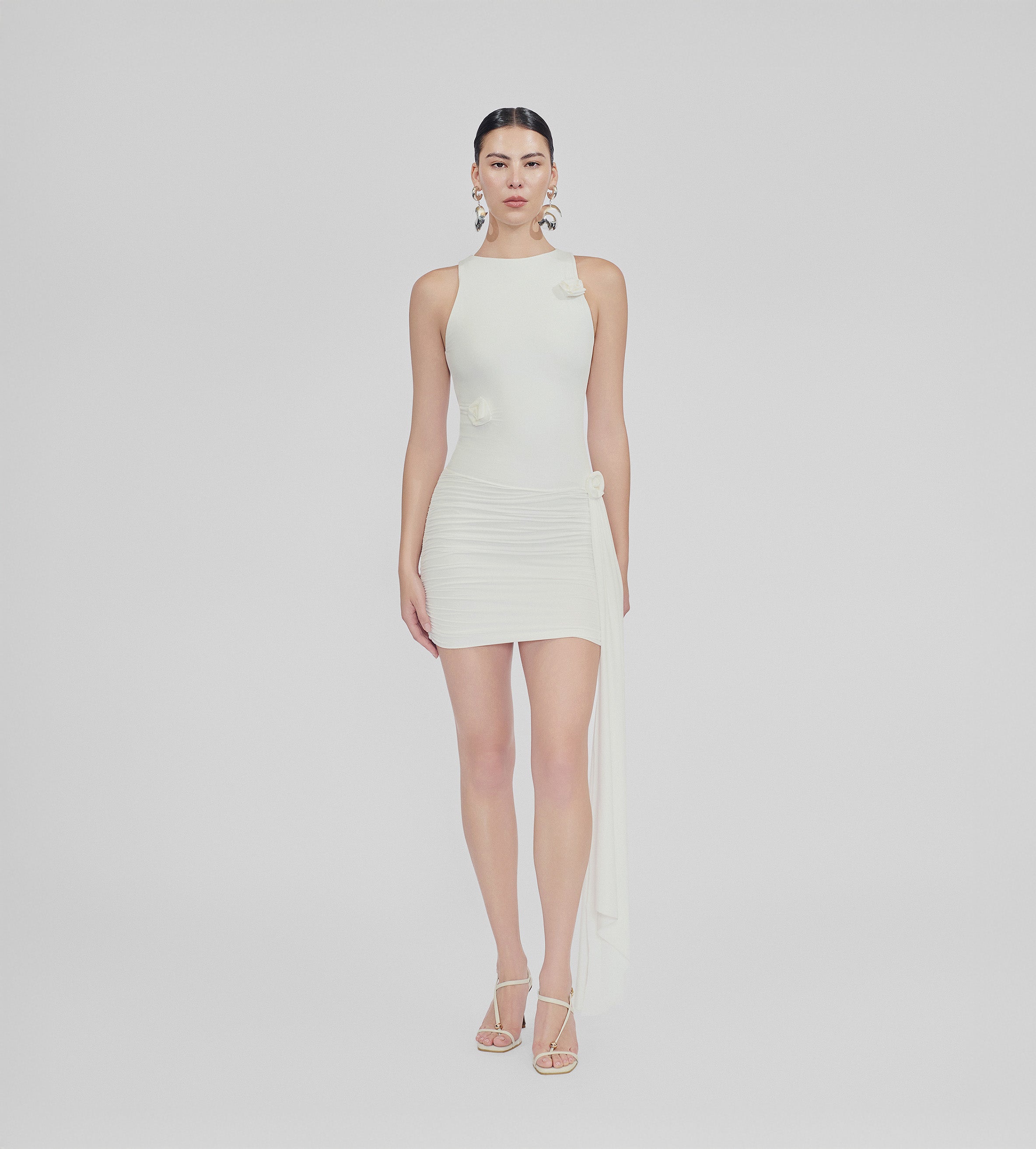 Nuestro mini vestido Azahar, confeccionado con nuestro icónico tejido, presenta un escote redondo alto y una silueta ajustada realzada por la tecnología de la marca. La falda mini drapeada cae con un solo pliegue en el frente y doble pliegue en la parte posterior, acentuando las curvas naturales del cuerpo. El diseño se completa con un lazo y flores en 3D hechas a mano, distribuidas estratégicamente.