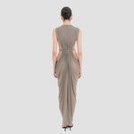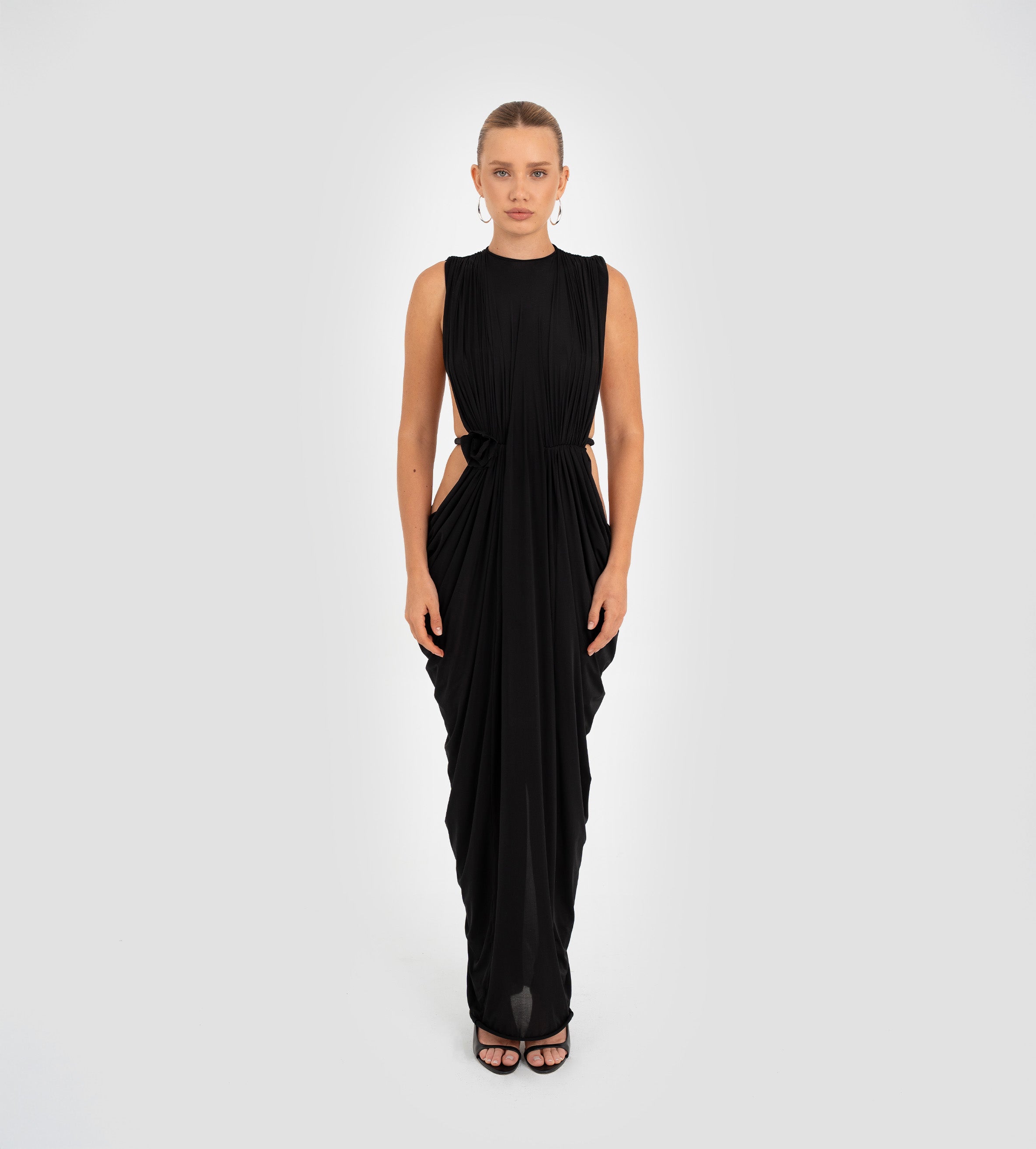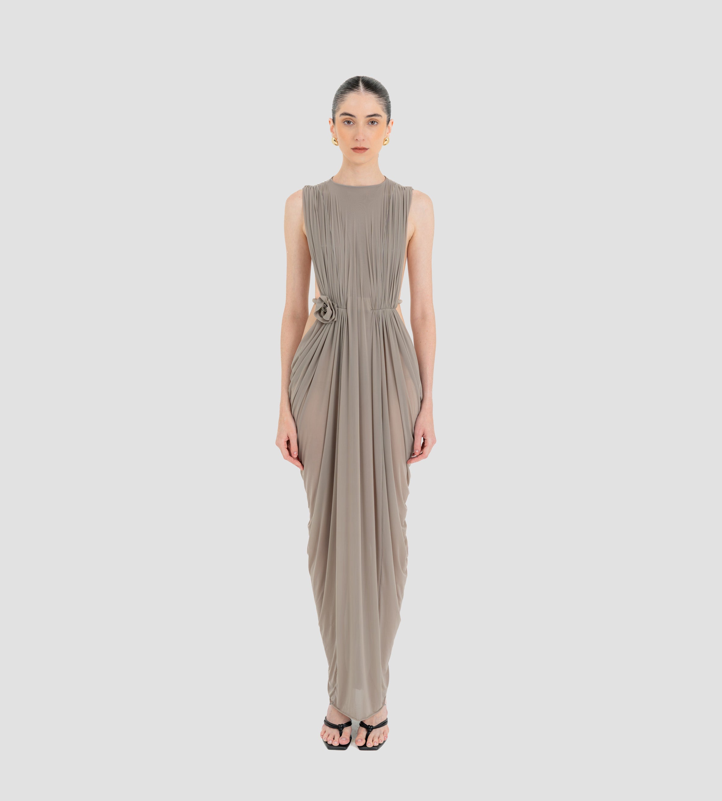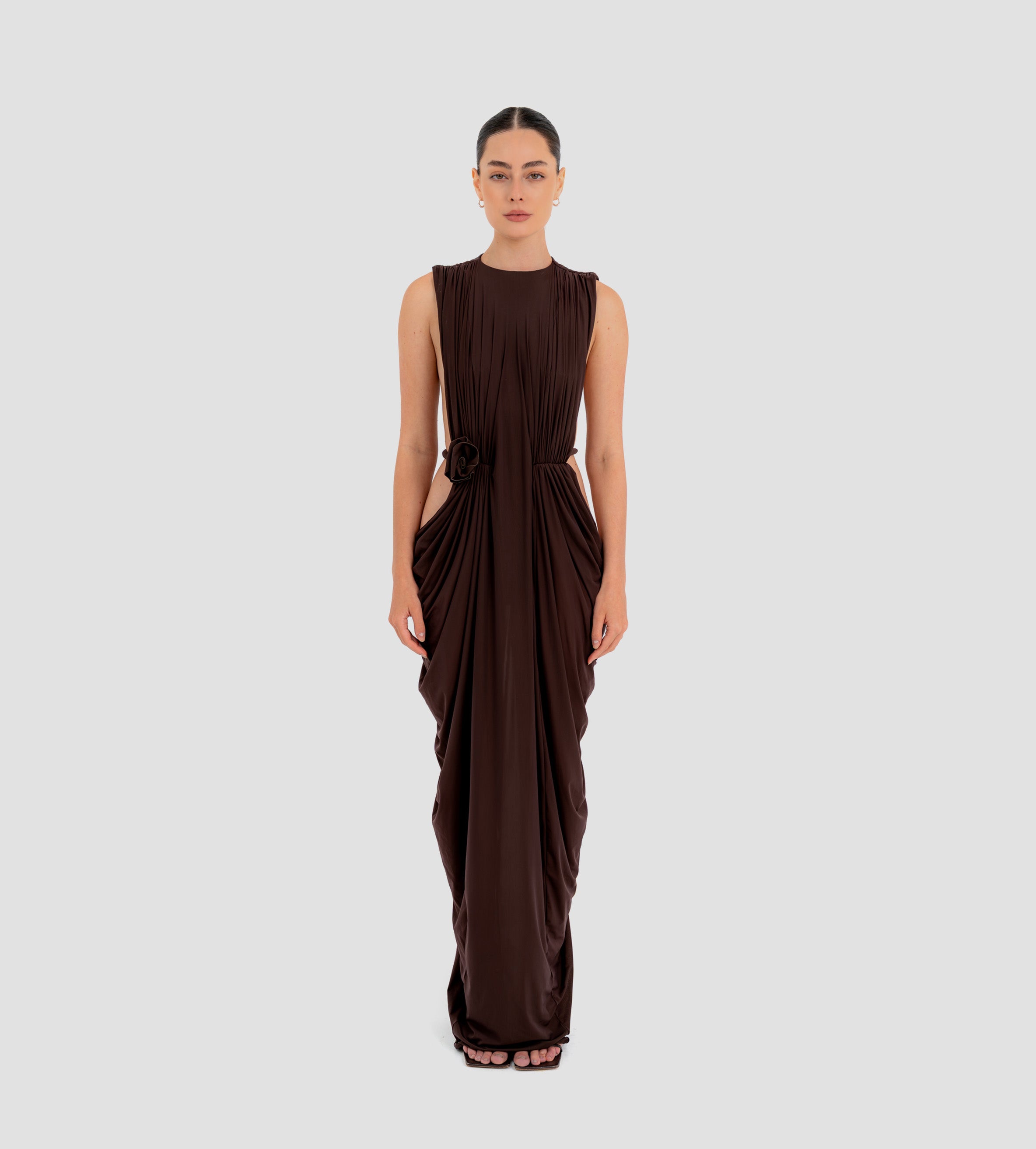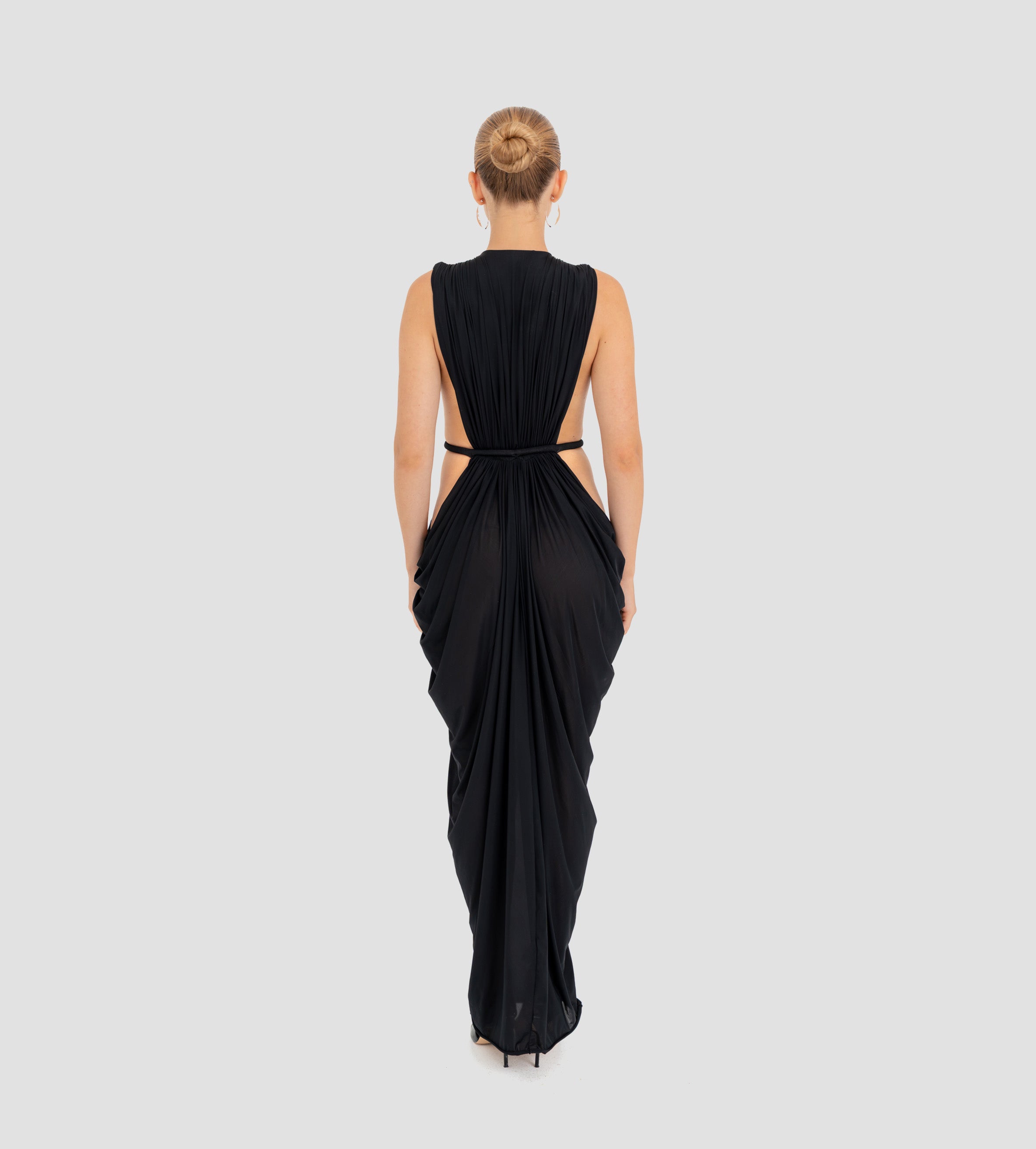 Nuestro vestido largo Baluarte presenta un escote alto redondeado que fluye hacia una silueta de laterales abiertos, con una estructura de bodysuit interno para mayor comfort. Un fruncido envuelve el cuerpo tanto en frente como en espalda, ceñido a la cintura mediante un tirante lateral ajustable adornado por un detalle de flor 3D. Desde la cintura, el diseño cae hacia una falda larga con drapeado dramático en ambos costados. En la parte posterior, la tela se recoge a la altura de la cintura, acentuado y definiendo aún más esta silueta encantadora.