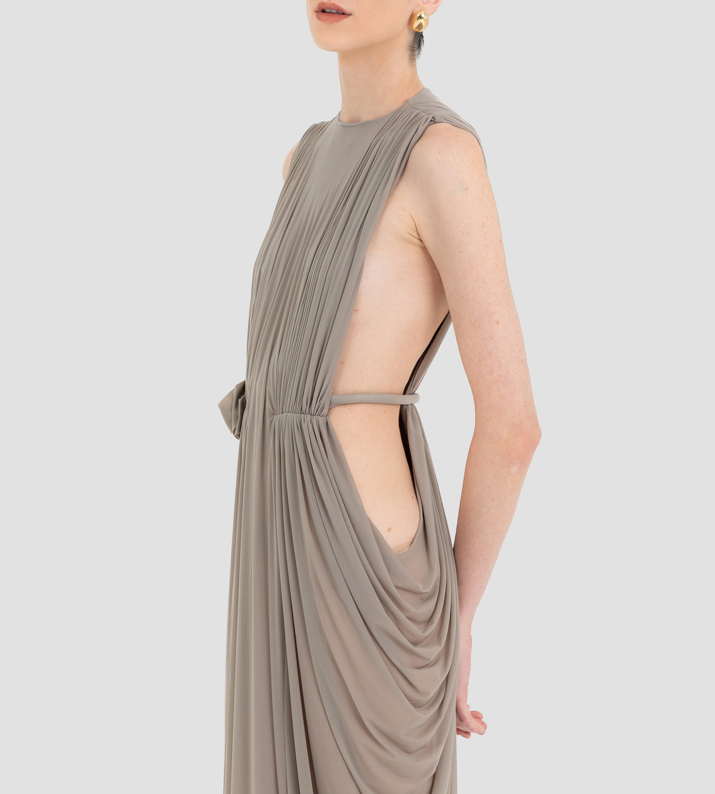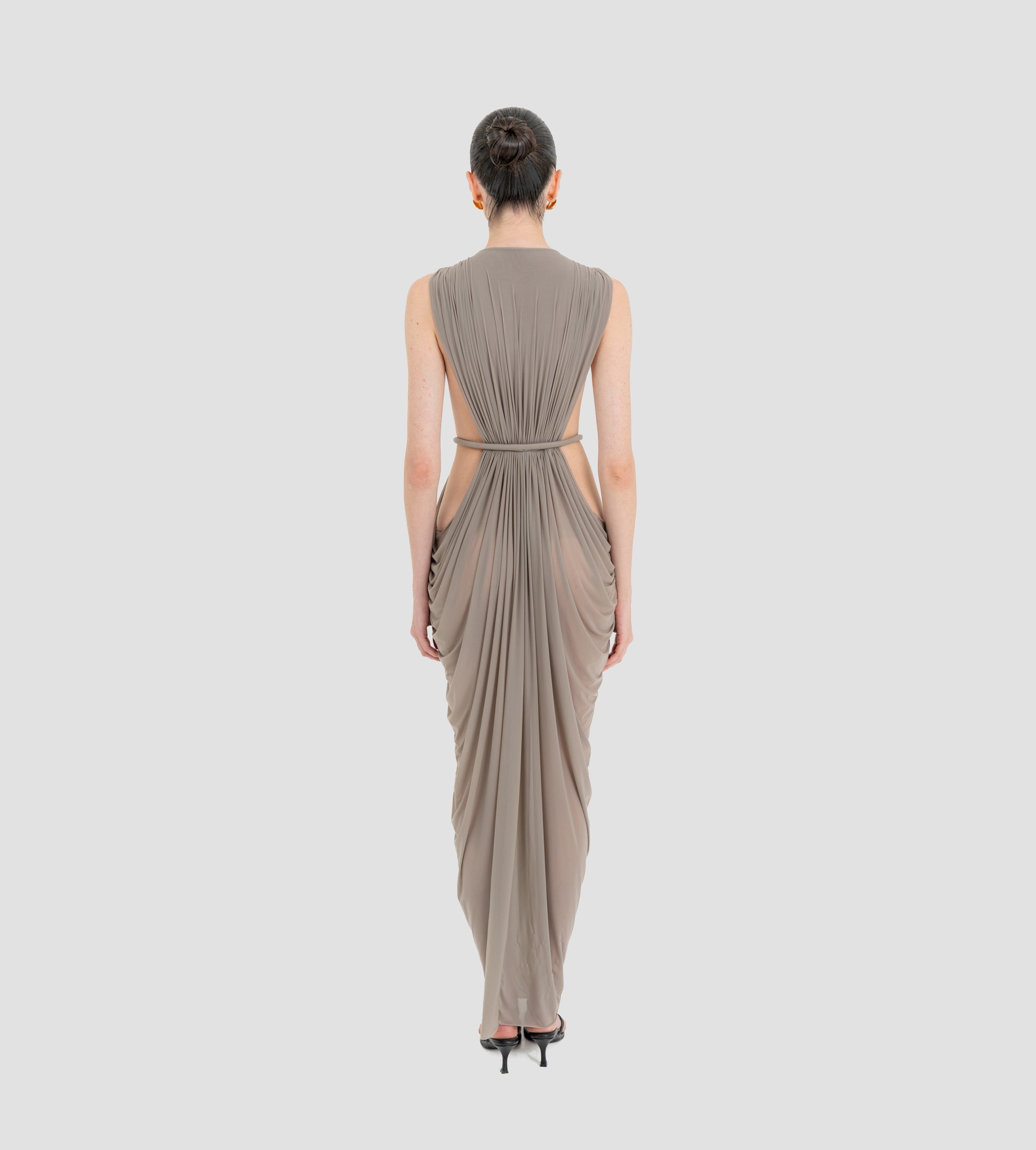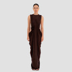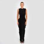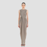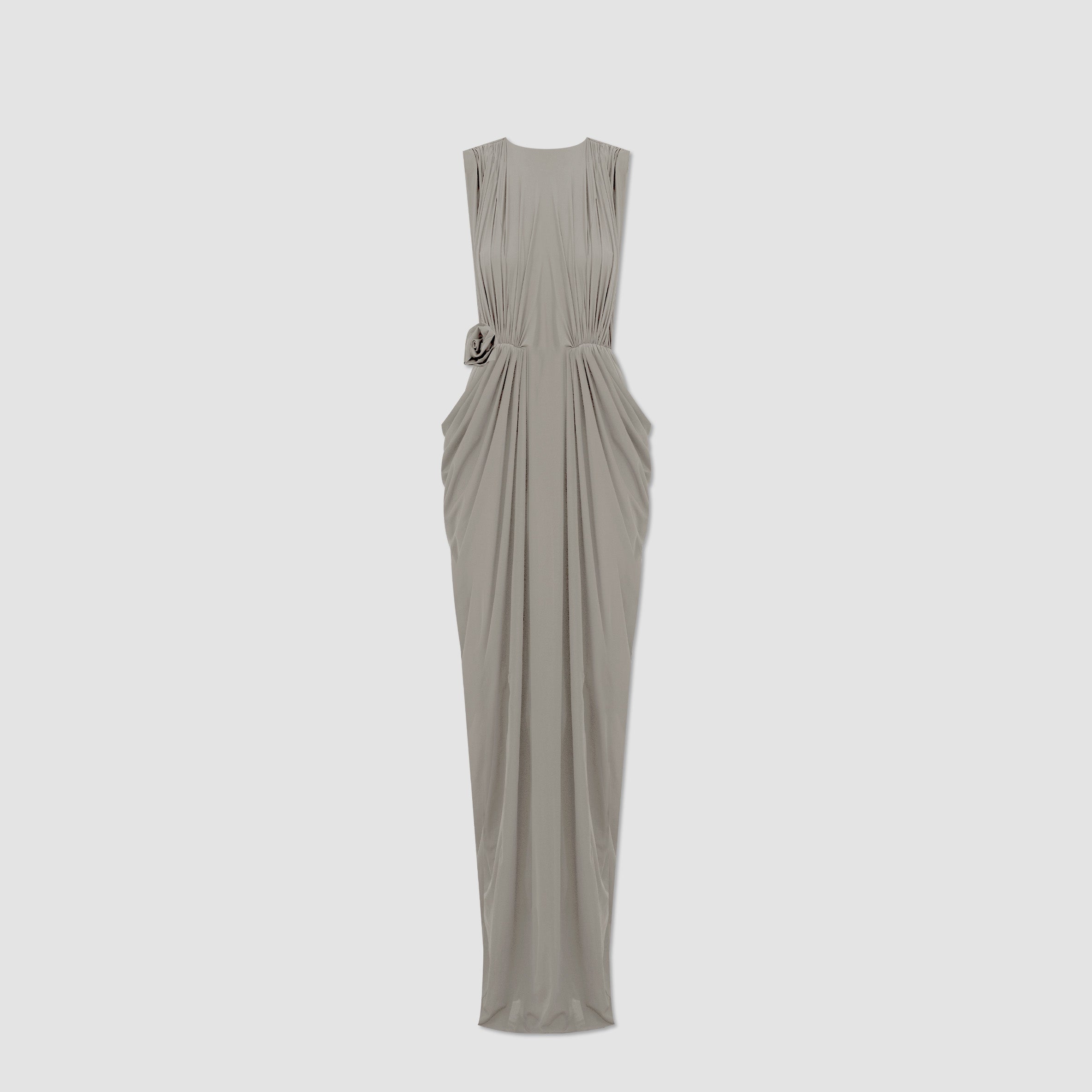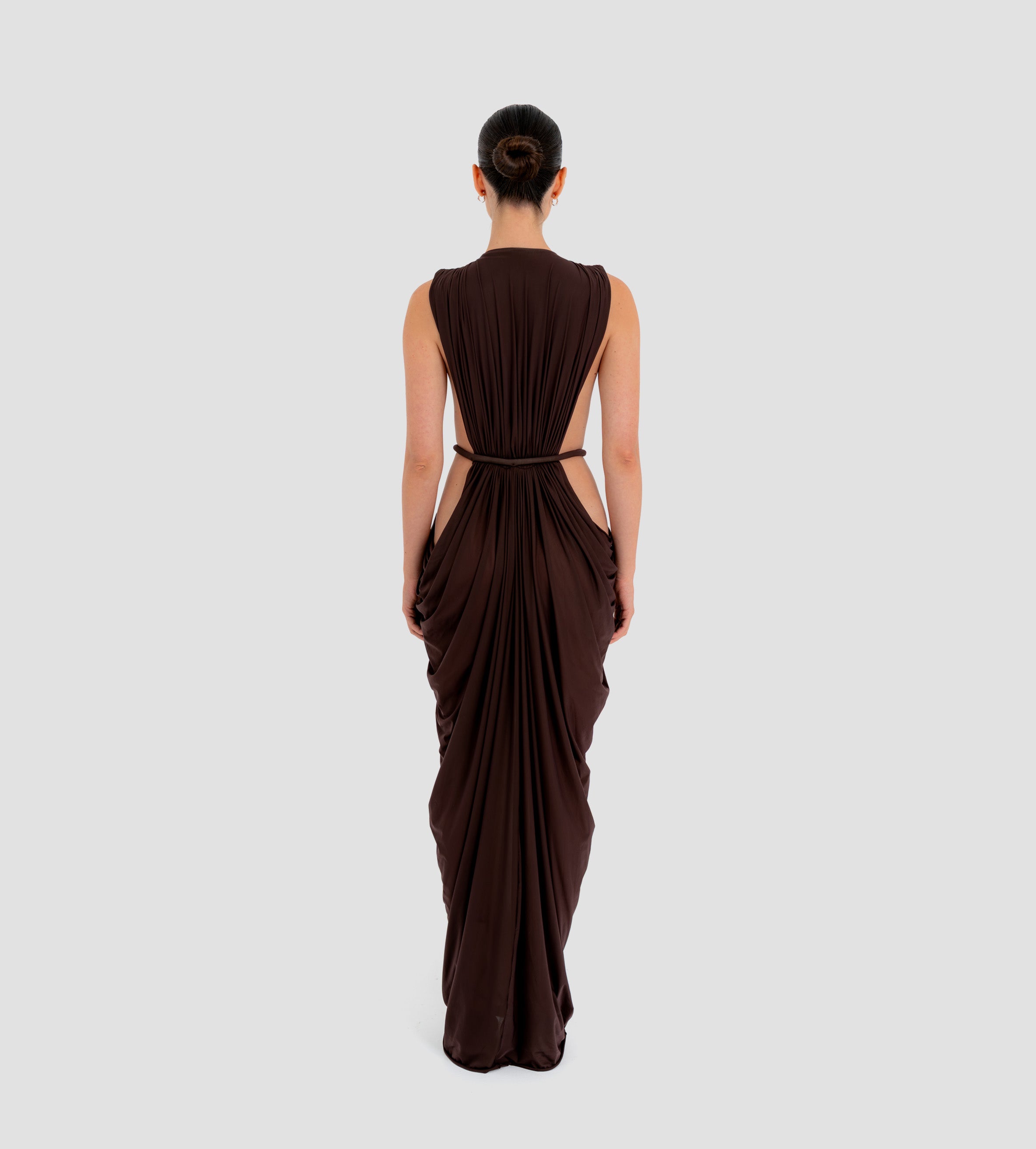Nuestro vestido largo Baluarte presenta un escote alto redondeado que fluye hacia una silueta de laterales abiertos, con una estructura de bodysuit interno para mayor comfort. Un fruncido envuelve el cuerpo tanto en frente como en espalda, ceñido a la cintura mediante un tirante lateral ajustable adornado por un detalle de flor 3D. Desde la cintura, el diseño cae hacia una falda larga con drapeado dramático en ambos costados. En la parte posterior, la tela se recoge a la altura de la cintura, acentuado y definiendo aún más esta silueta encantadora.