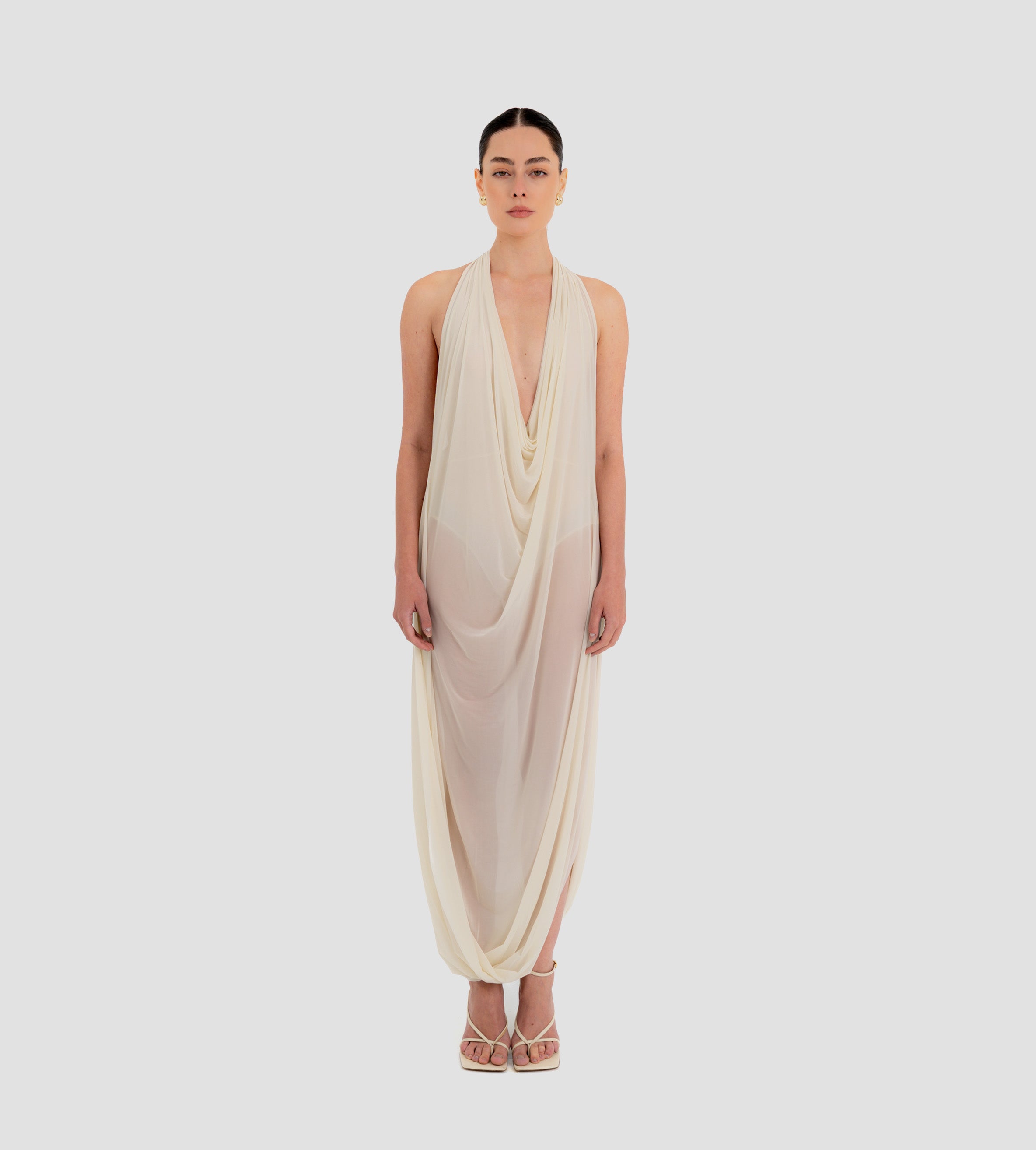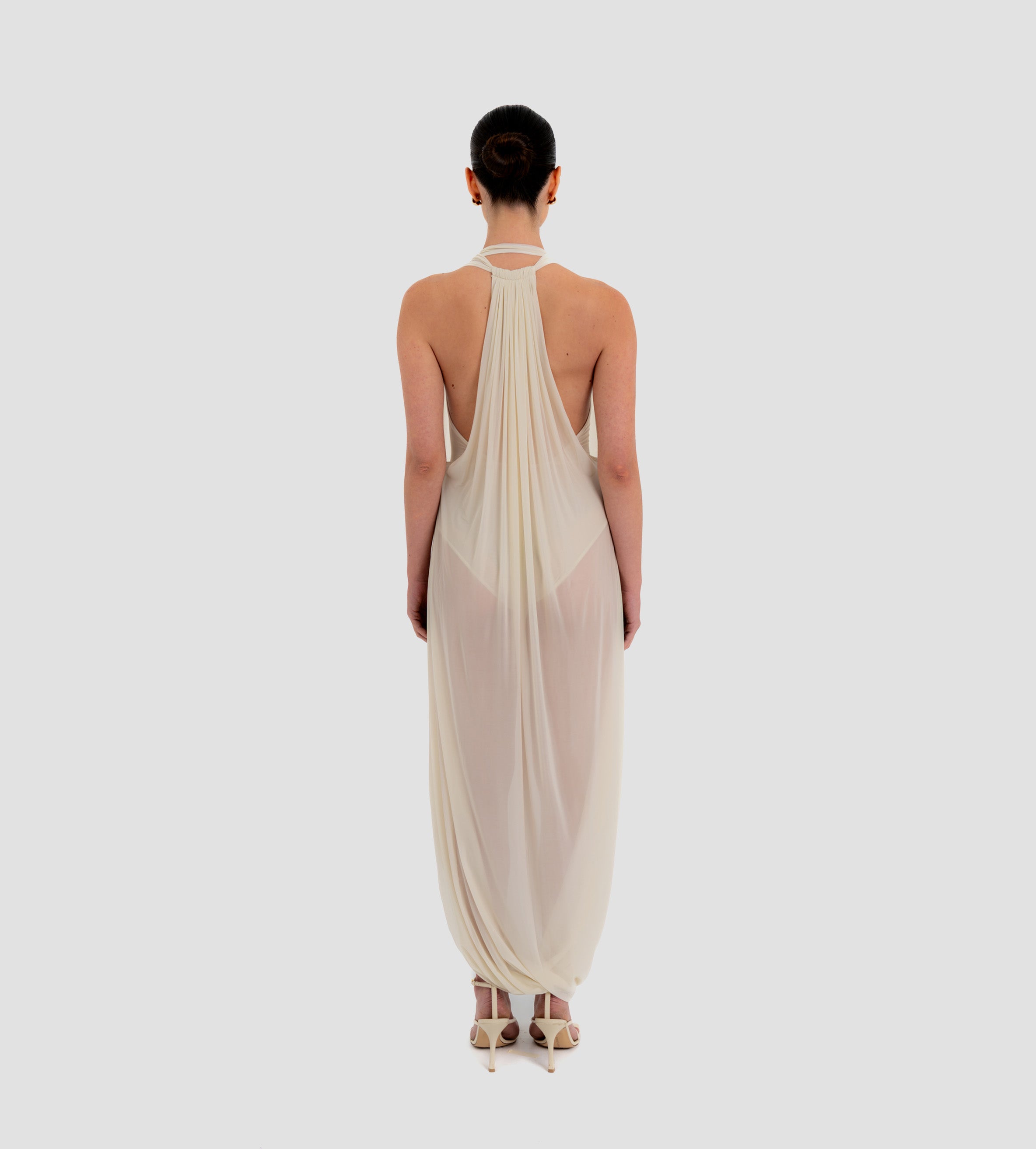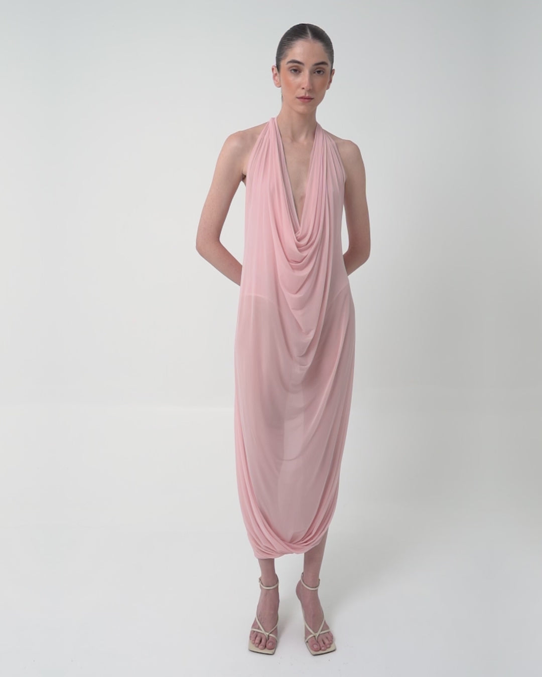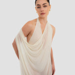 El vestido Baru introduce nuestra nueva tela semi traslucida, presentando un escote profundo drapeado, amplias sisas que dan paso a una silueta fluida y etérea. En la parte posterior, una construcción tipo túnel recoge la tela, permitiendo que caiga en cascada sobre la espalda con un efecto suave y sensual.