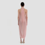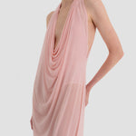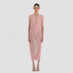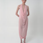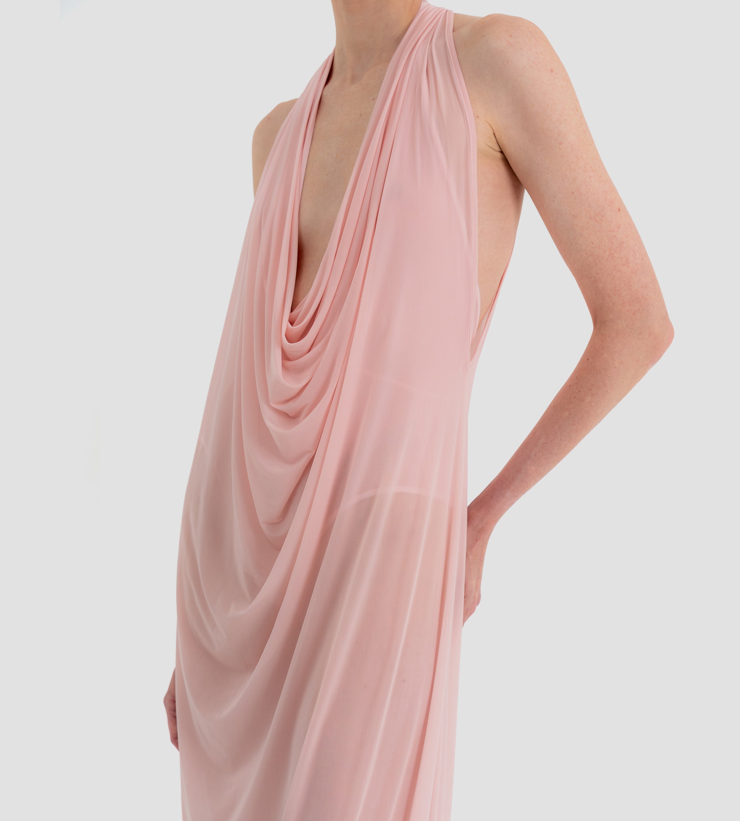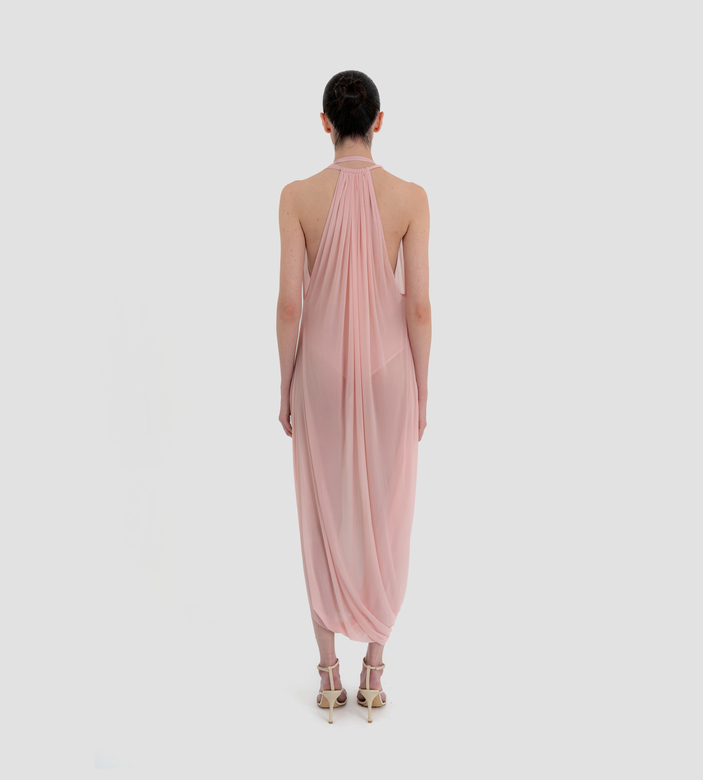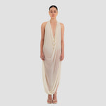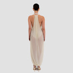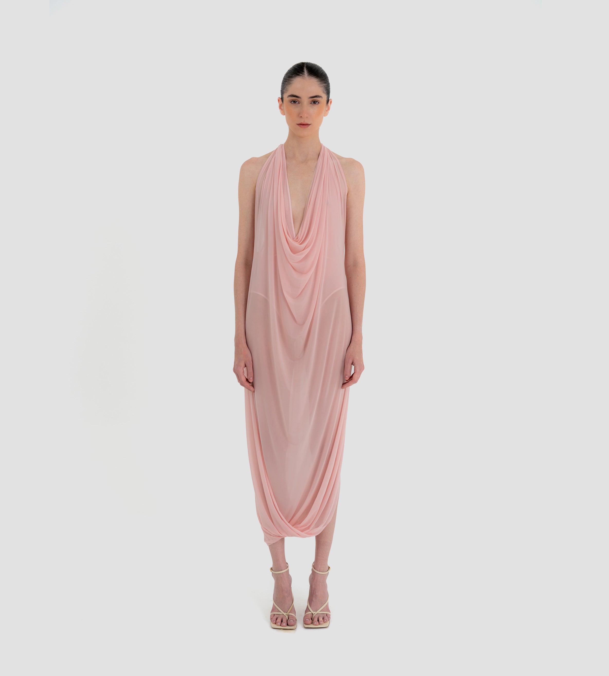 El vestido Baru introduce nuestra nueva tela semi traslucida, presentando un escote profundo drapeado, amplias sisas que dan paso a una silueta fluida y etérea. En la parte posterior, una construcción tipo túnel recoge la tela, permitiendo que caiga en cascada sobre la espalda con un efecto suave y sensual.