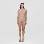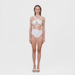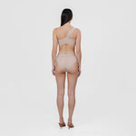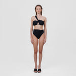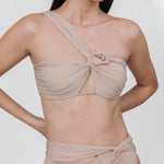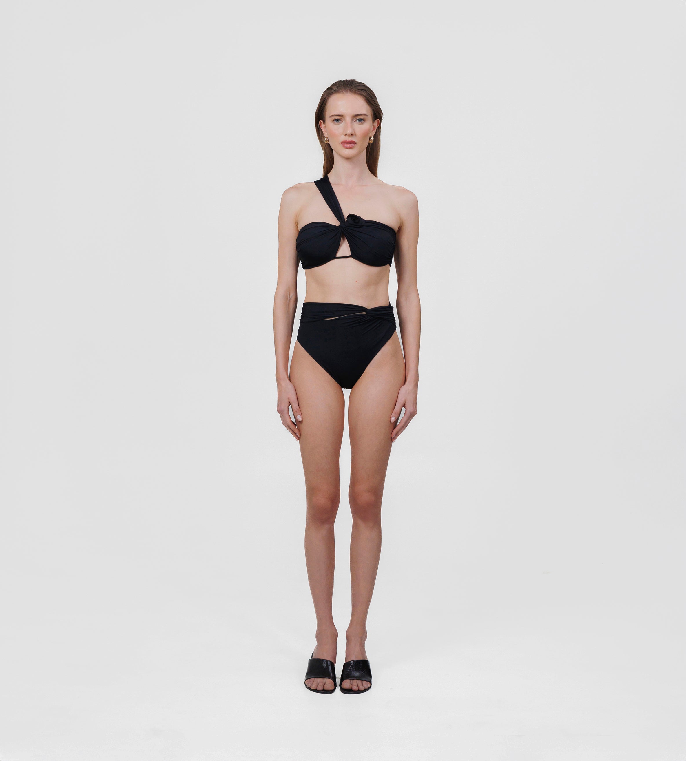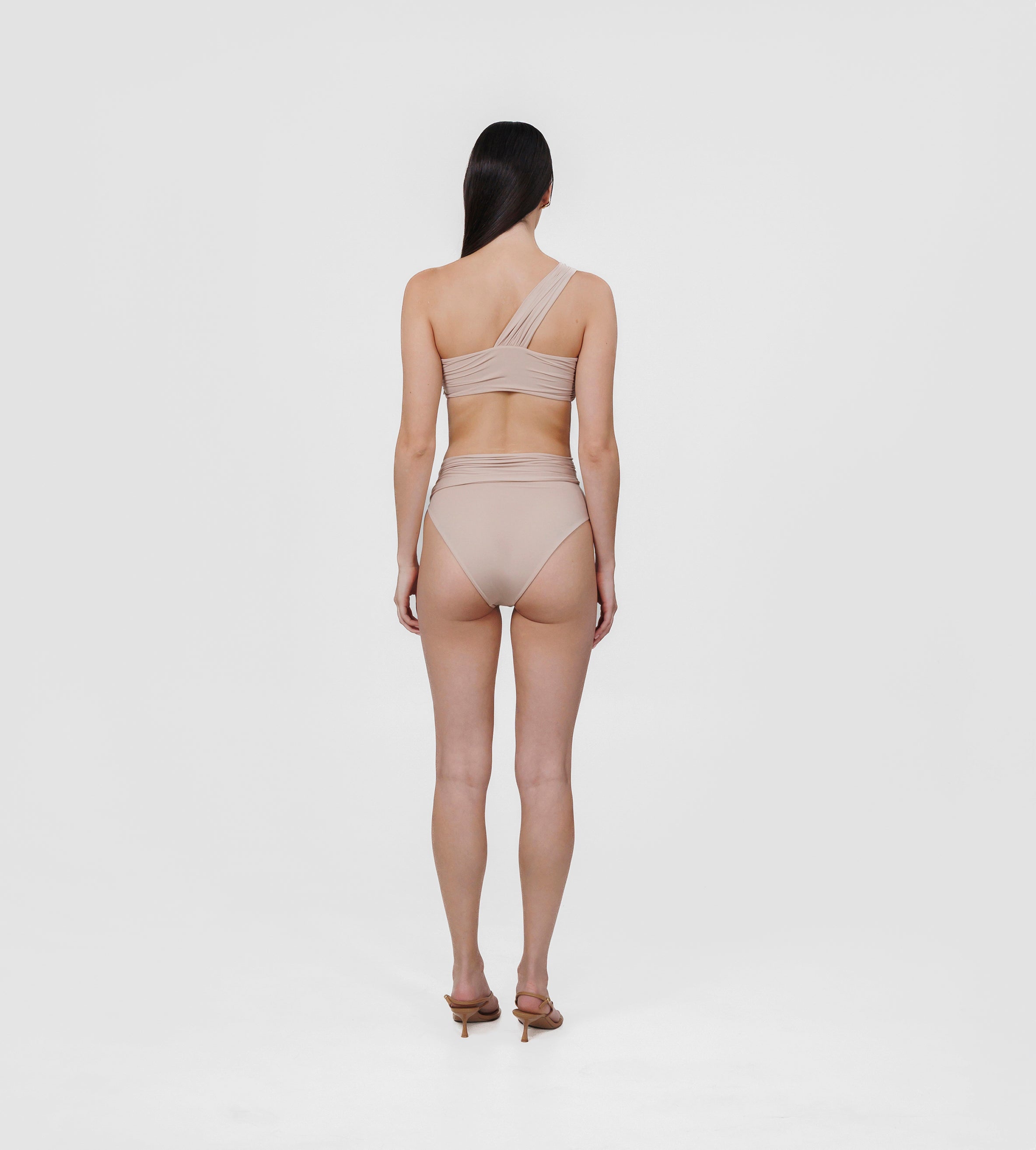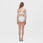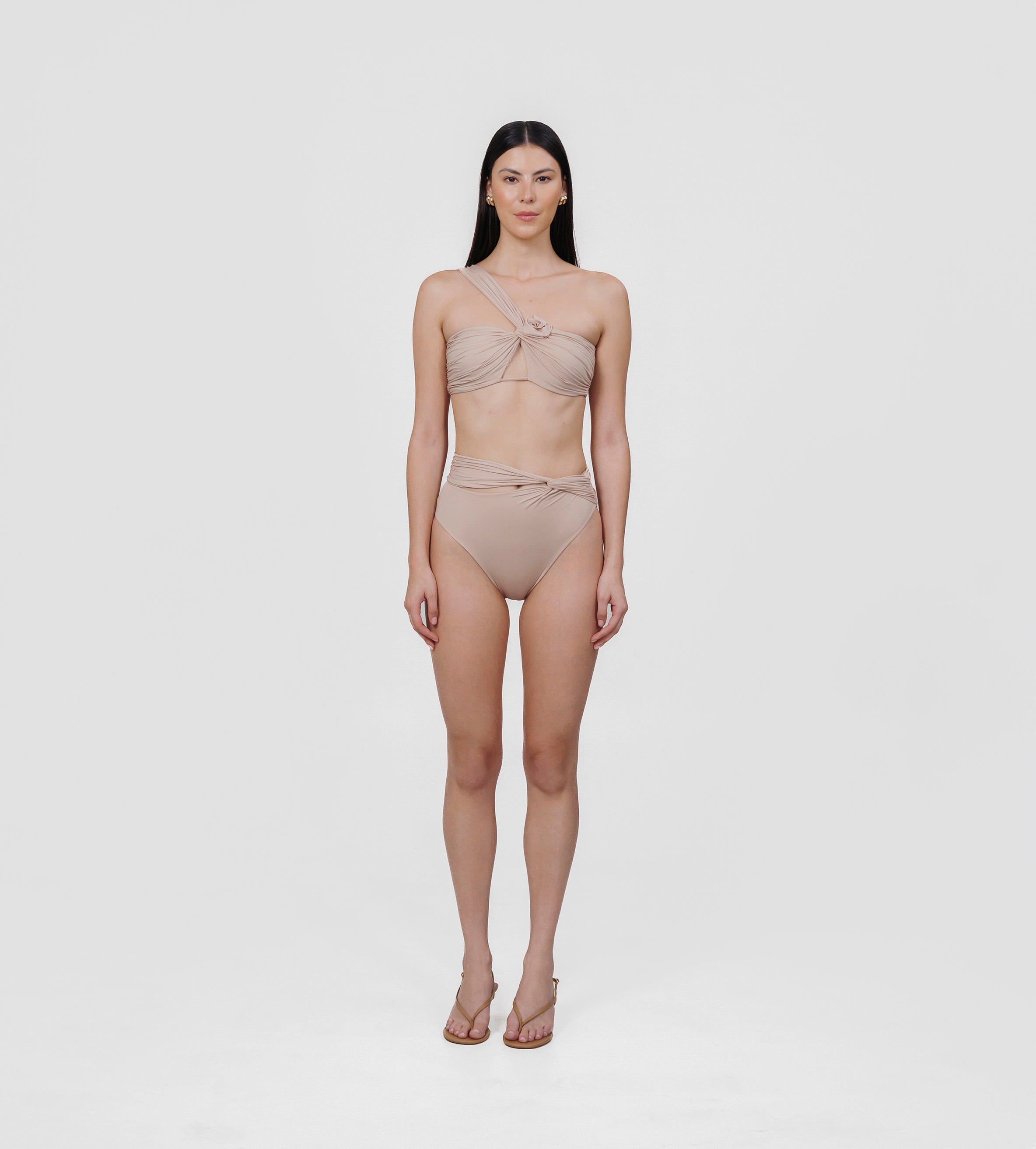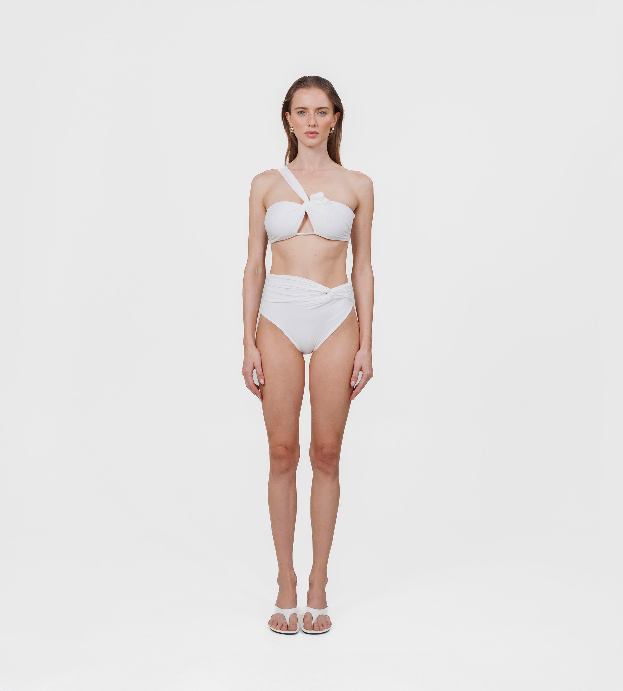 Nuestro traje de baño de dos piezas Beltrán presenta un top de un solo hombro con un tirante diagonal fruncido que da paso a un sutil escote corazón y enmarca una abertura central que se ve adornado por un detalle de flor en 3D. Se complementa con una parte inferior de talle alto y cobertura media, destacando una capa fruncida asimétrica con un giro sobre la pierna derecha que continua hacia una pieza levemente fruncida en la parte posterior.
