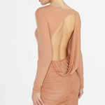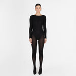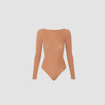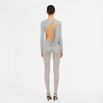 El enterizo Bettin presenta un escote barco que se complementa con mangas largas ajustadas, ofreciendo un toque sofisticado que resalta las líneas naturales del cuerpo y se ve contrastado por un escote profundo asimétrico en la parte posterior, adornado con un panel drapeado que cae de forma fluida en diagonal sobre la parte baja de la espalda.