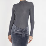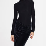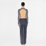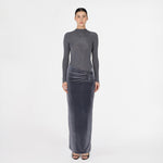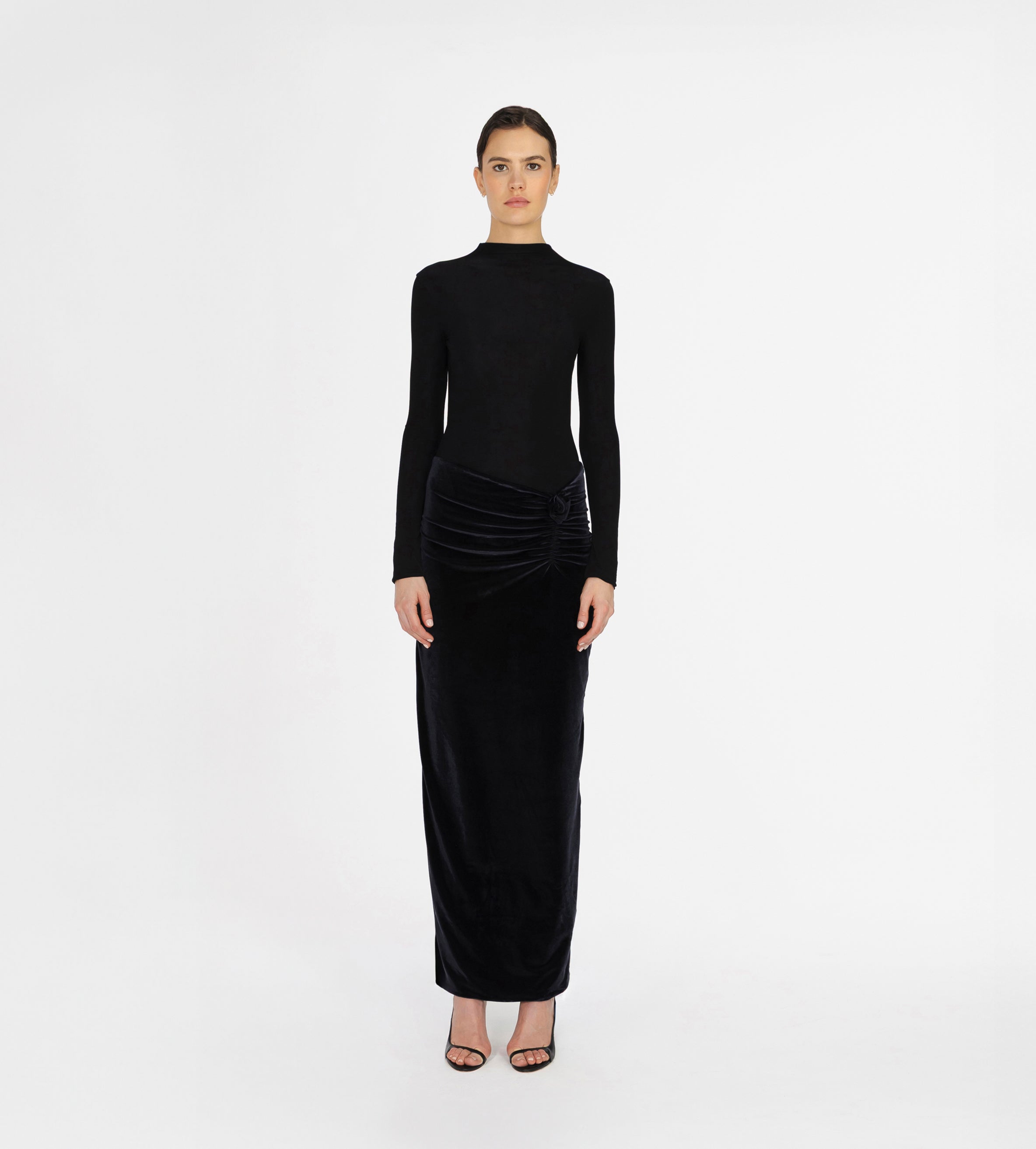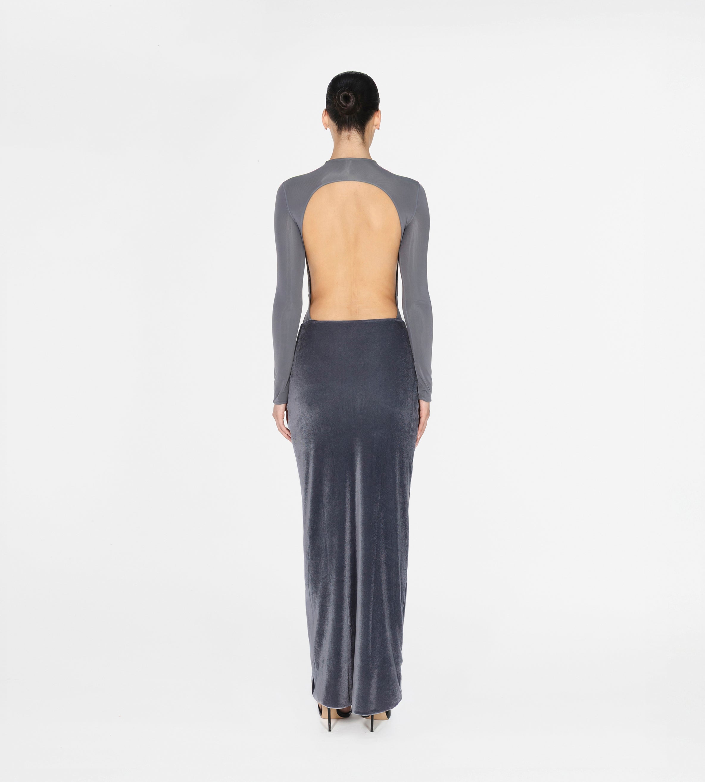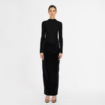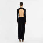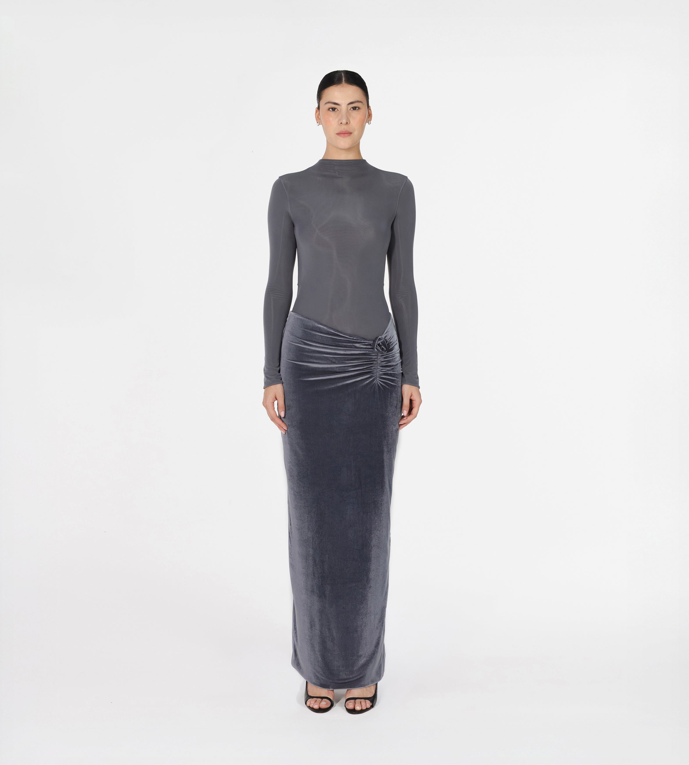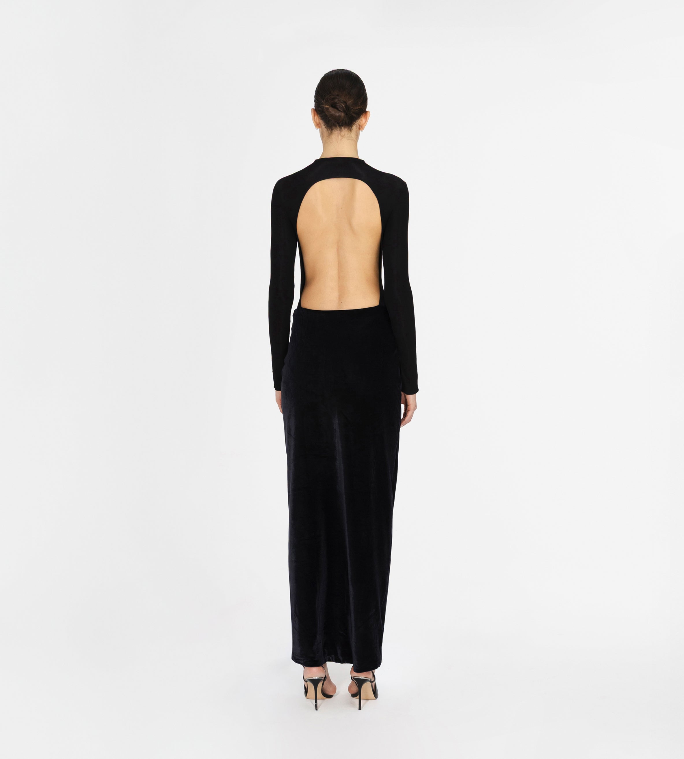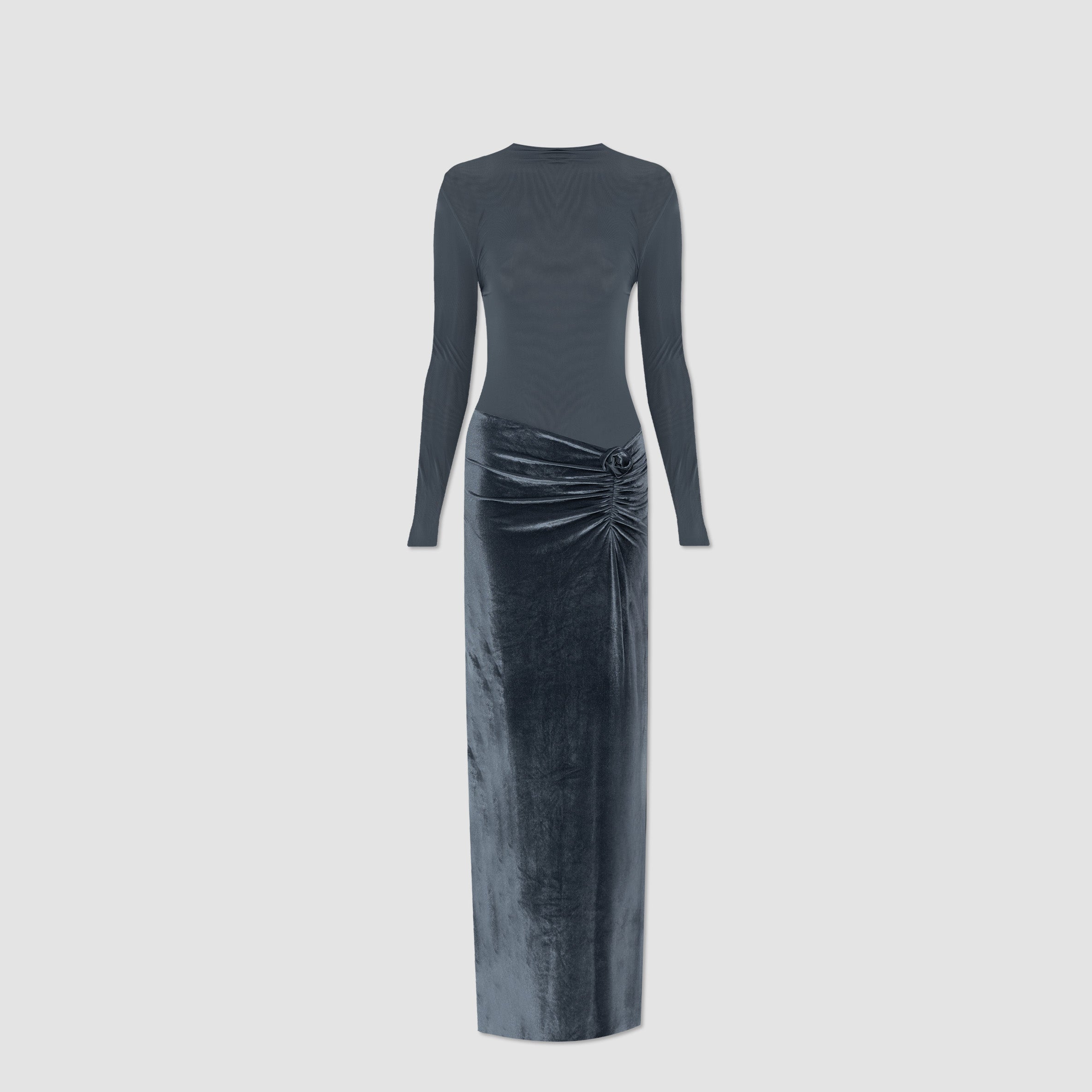 Nuestro vestido Borelli combina nuestra icónica tela translúcida con nuestro velvet característico, presentando un suave cuello redondeado que da paso a una silueta ajustada de mangas largas. Un profundo escote en la parte posterior genera un contraste audaz y da paso a una falda larga tipo columna con fruncido localizado en el delantero el cual se ve adornado con un detalle floral en 3D.