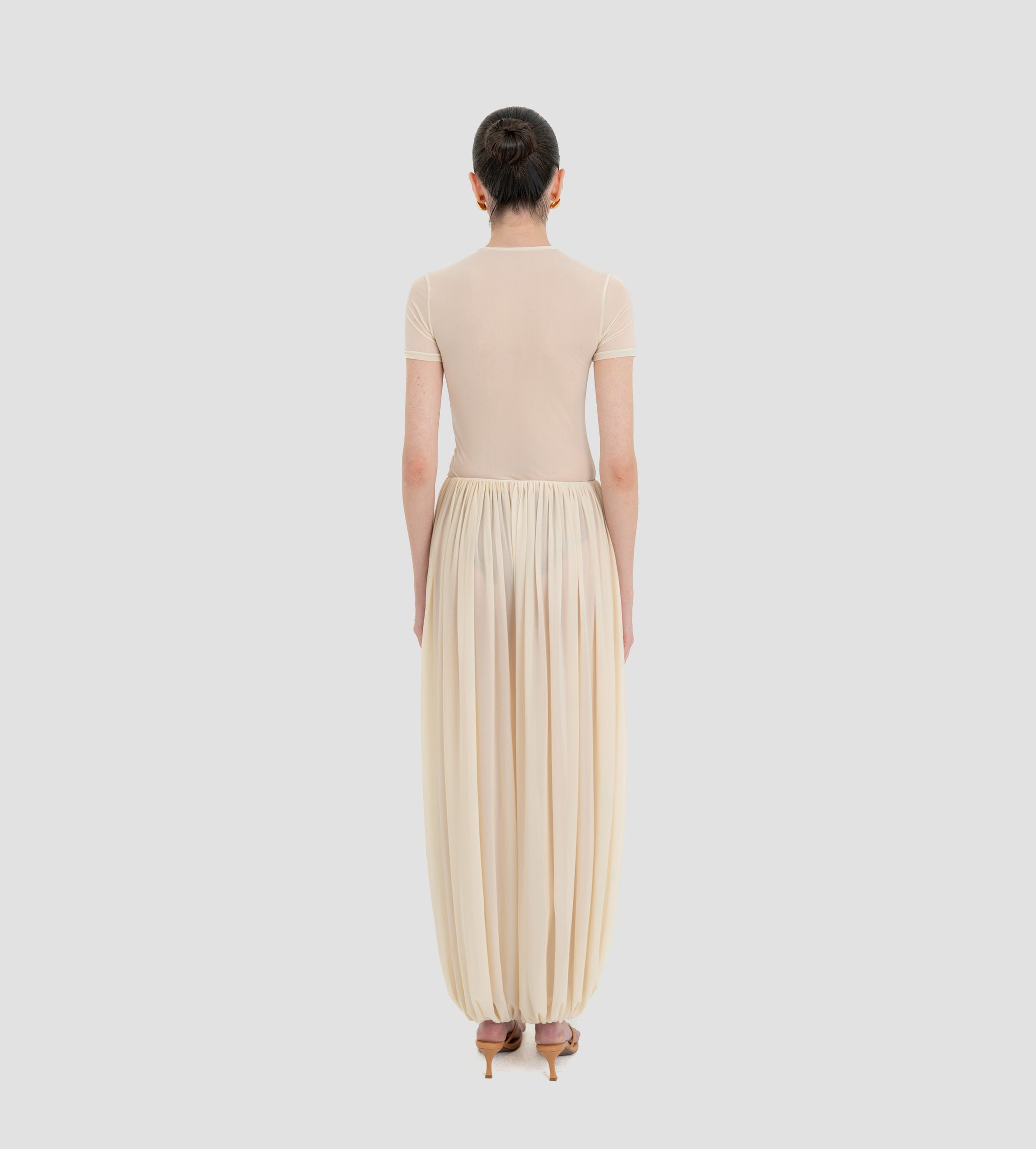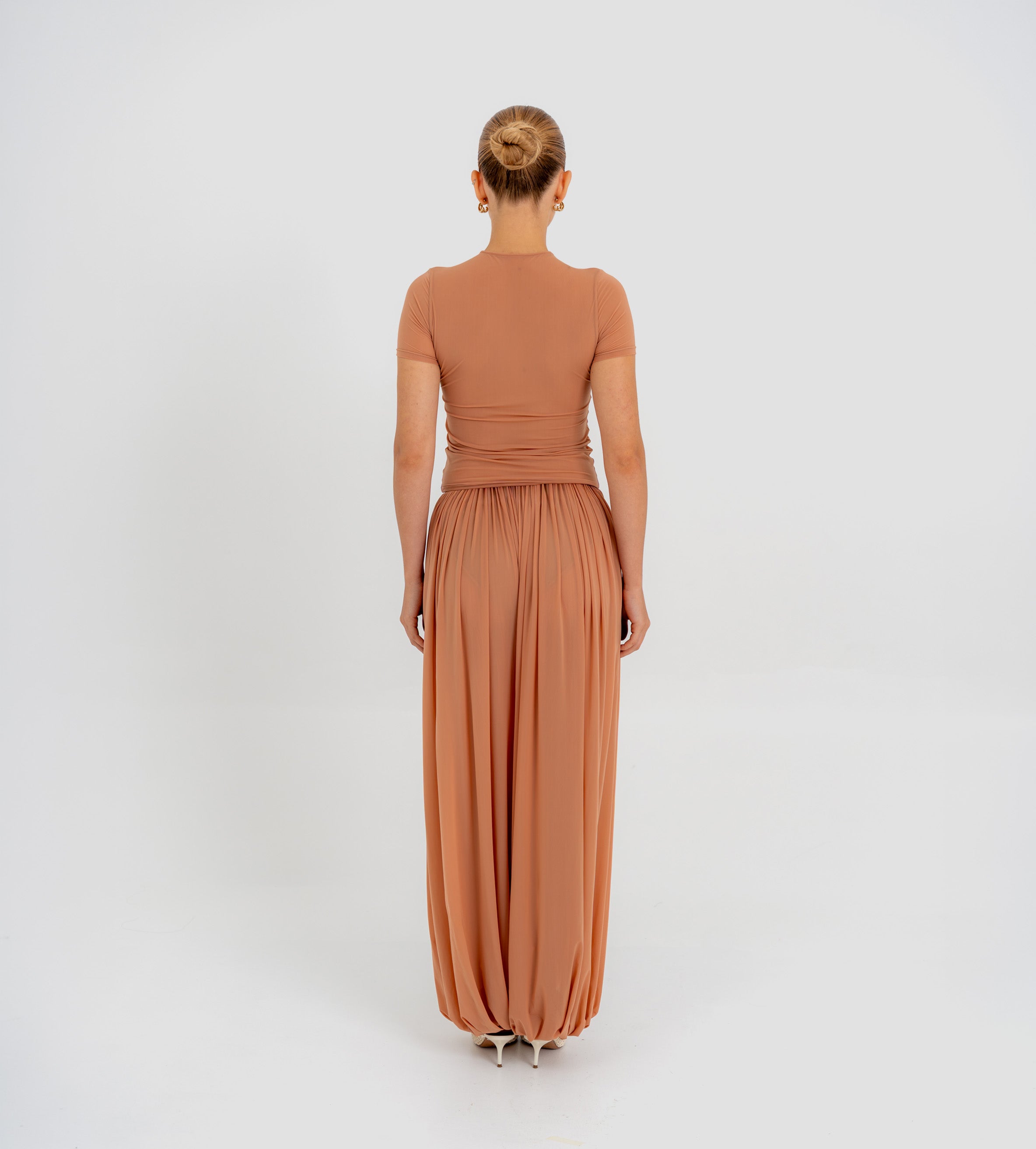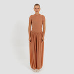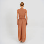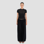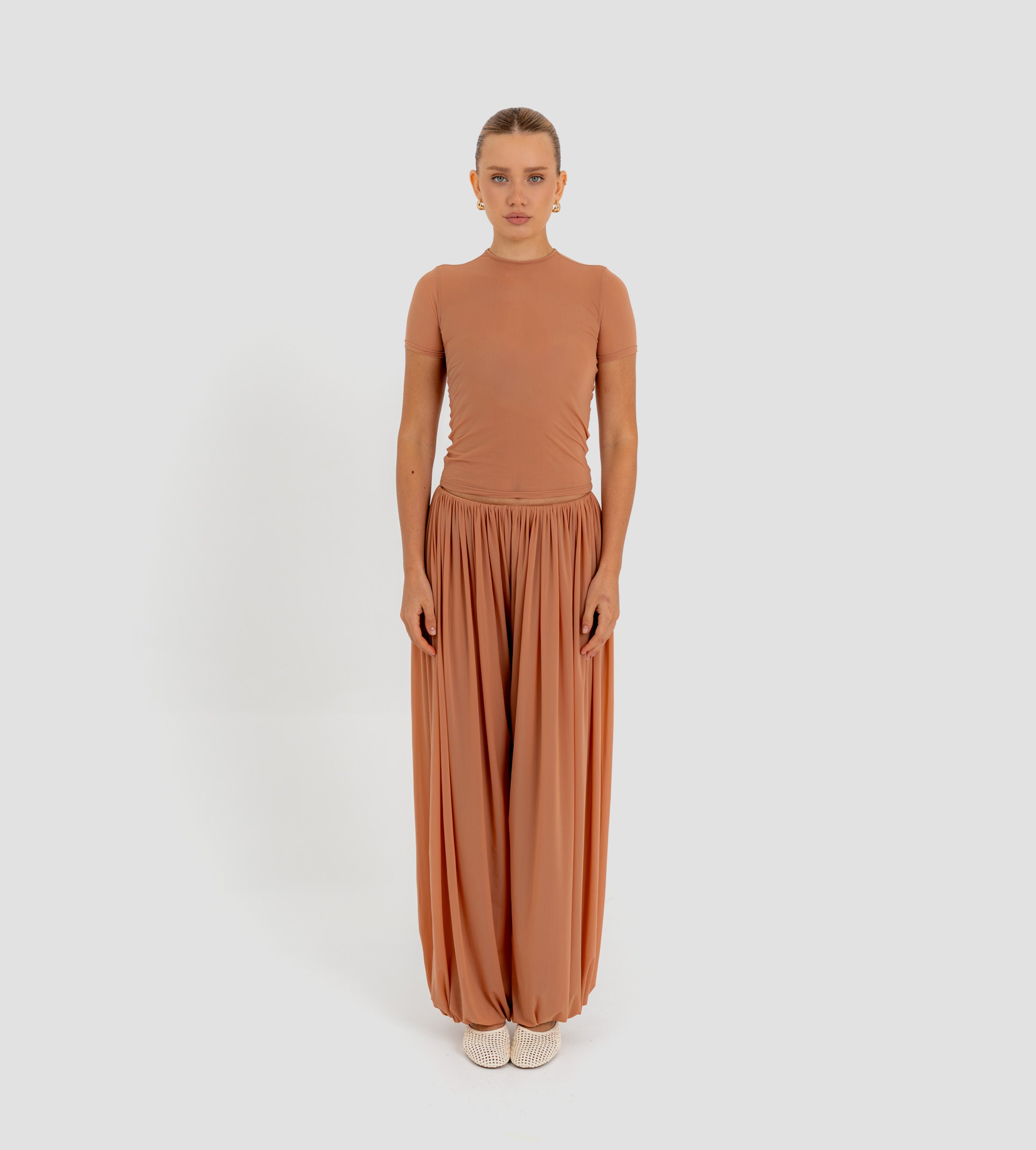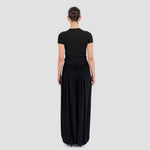 Los Bóveda pants presentan una delicada pretina angosta, talle bajo con una silueta drapeada inspirada en el estilo Aladdin, que cae de forma ligera y a su vez dramática.