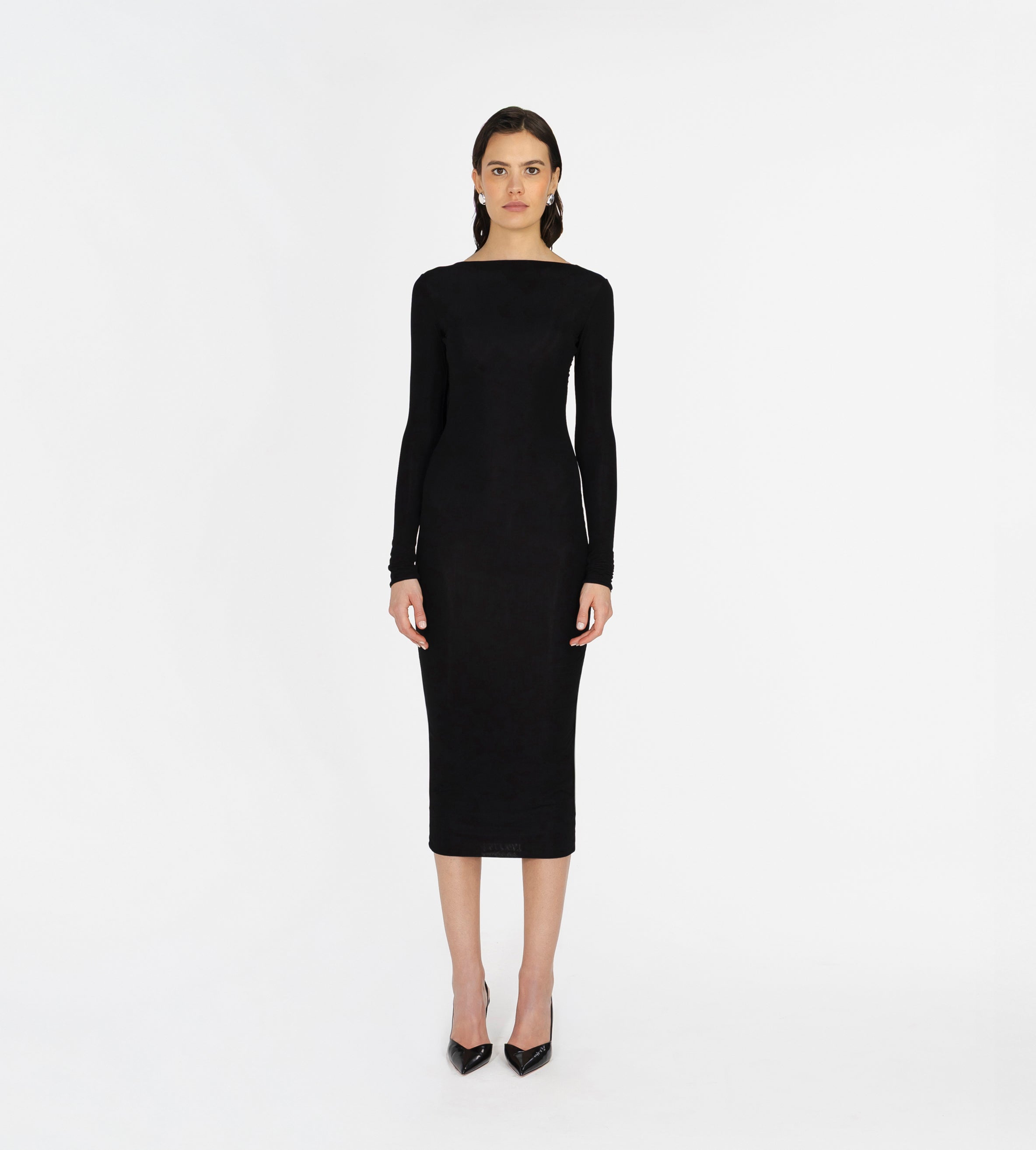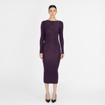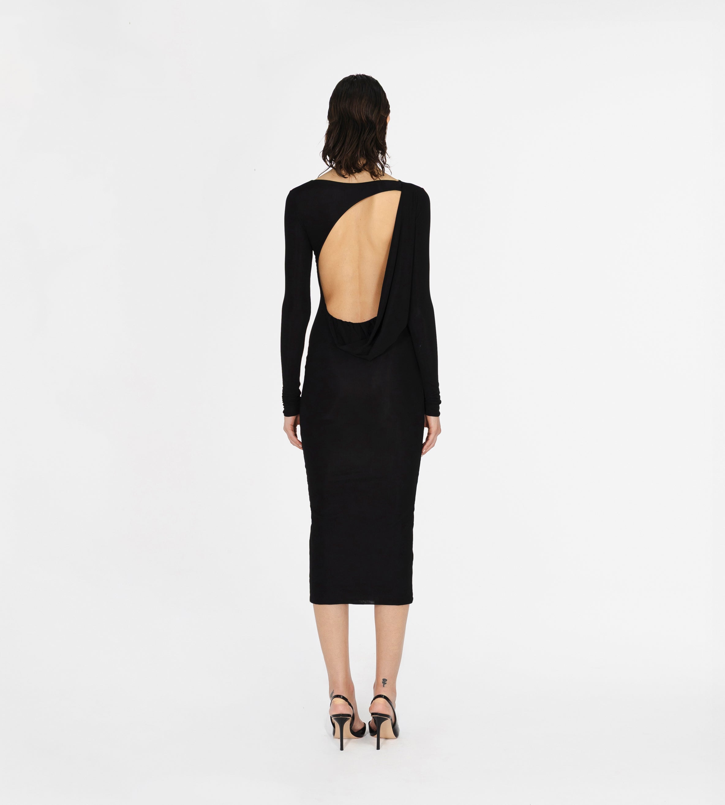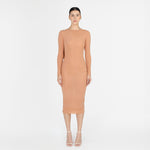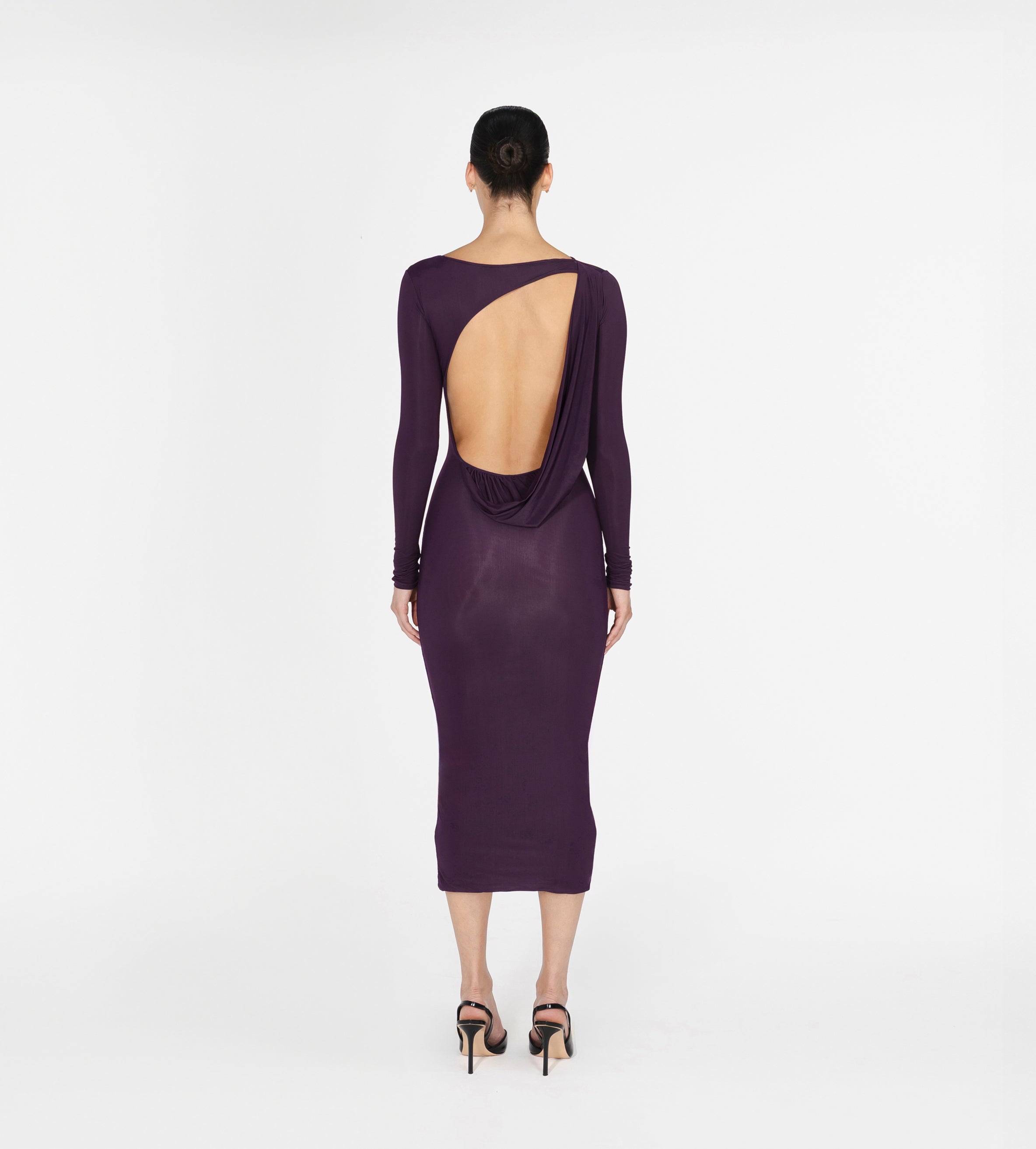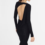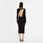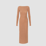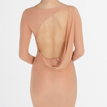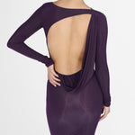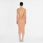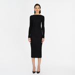 Nuestro vestido midi Candore presenta un escote barco que se complementa con mangas largas ajustadas, ofreciendo un toque sofisticado que resalta las líneas del cuerpo y se ve contrastado por un escote profundo asimétrico en la parte posterior, adornado con un panel drapeado que cae de forma fluida en diagonal sobre la parte baja de la espalda y da paso a una falda larga estilo columna.