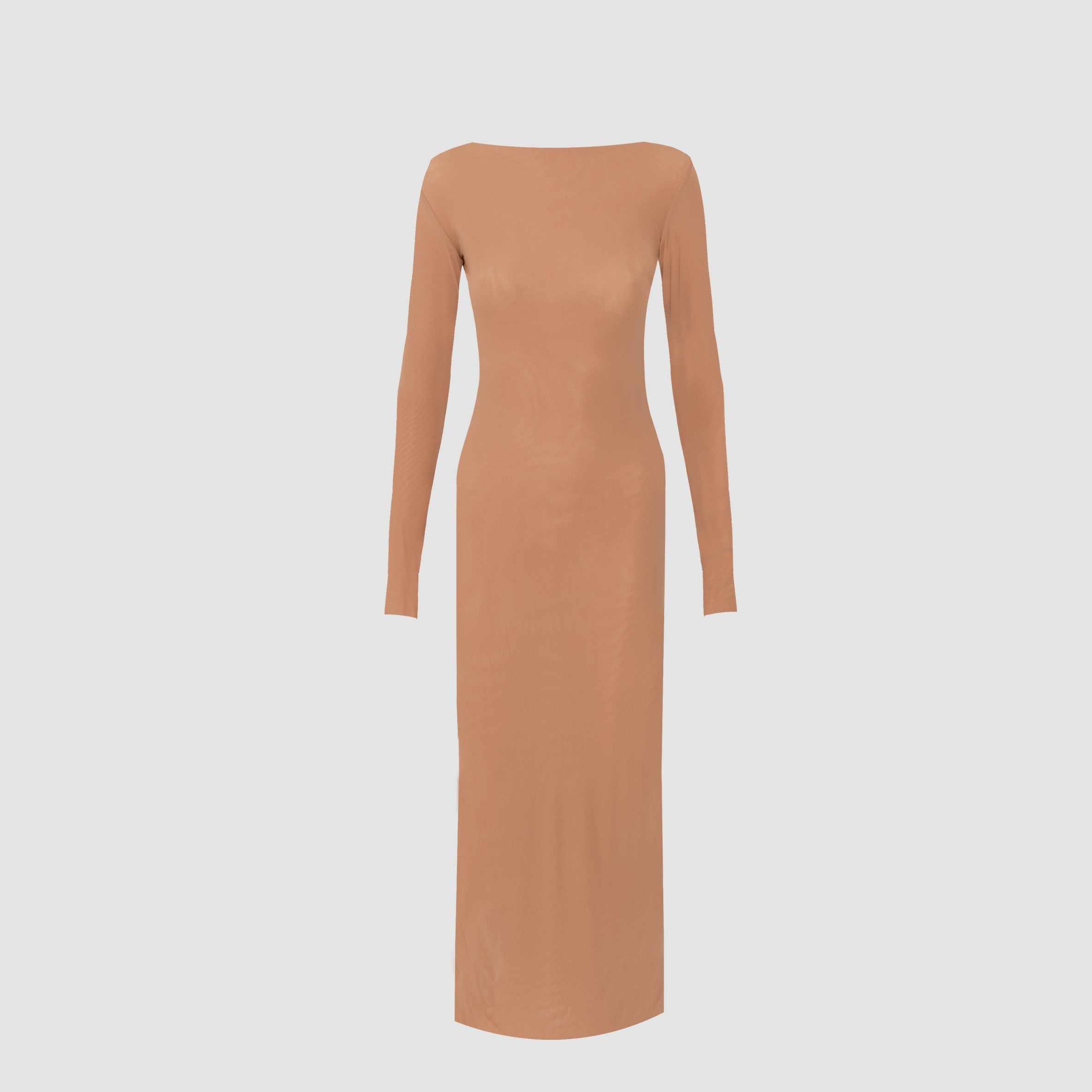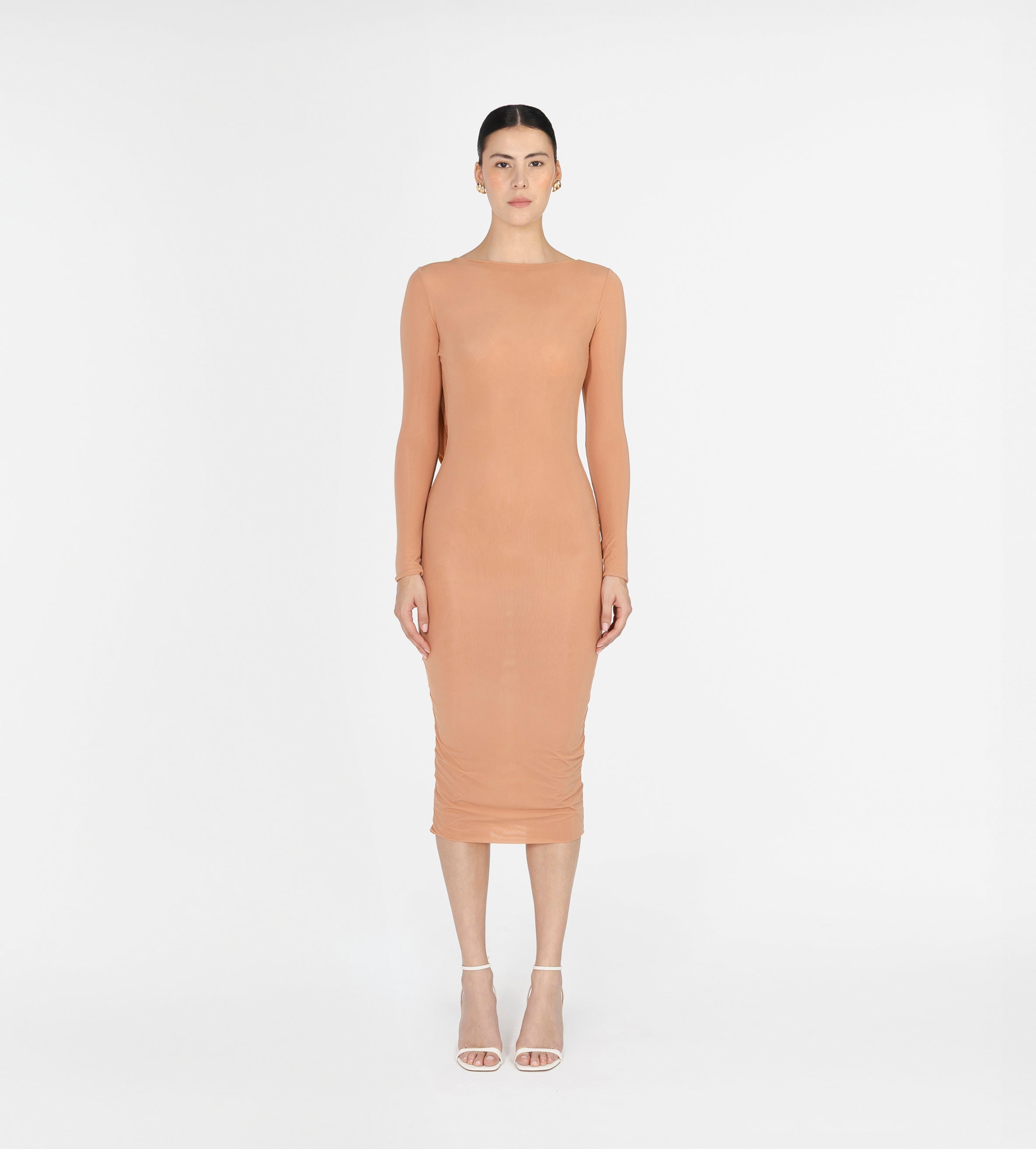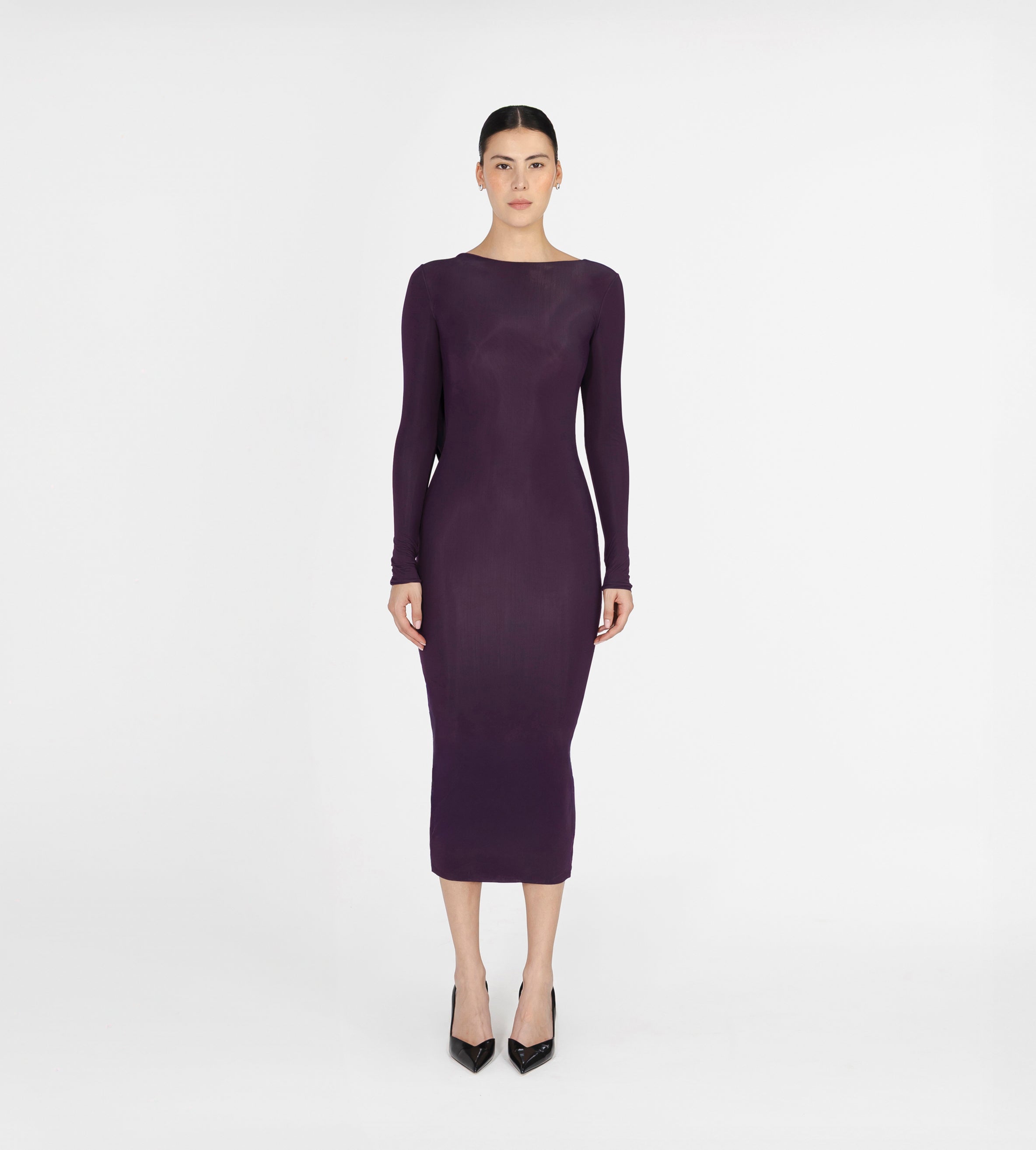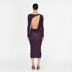 Nuestro vestido midi Candore presenta un escote barco que se complementa con mangas largas ajustadas, ofreciendo un toque sofisticado que resalta las líneas del cuerpo y se ve contrastado por un escote profundo asimétrico en la parte posterior, adornado con un panel drapeado que cae de forma fluida en diagonal sobre la parte baja de la espalda y da paso a una falda larga estilo columna.