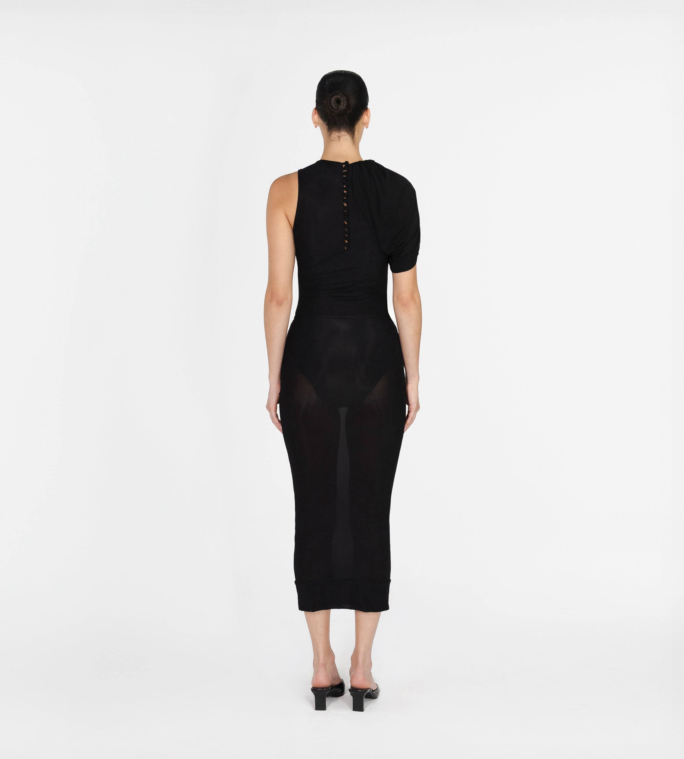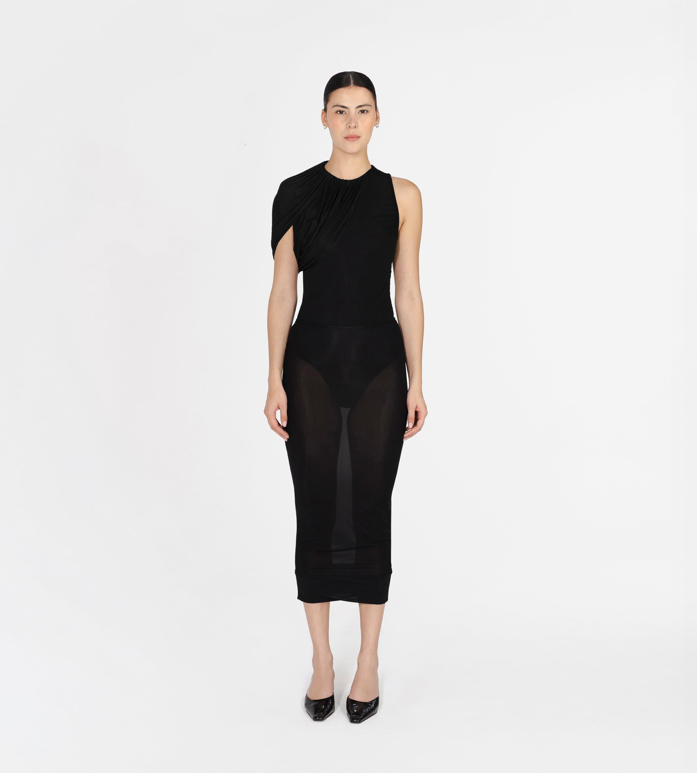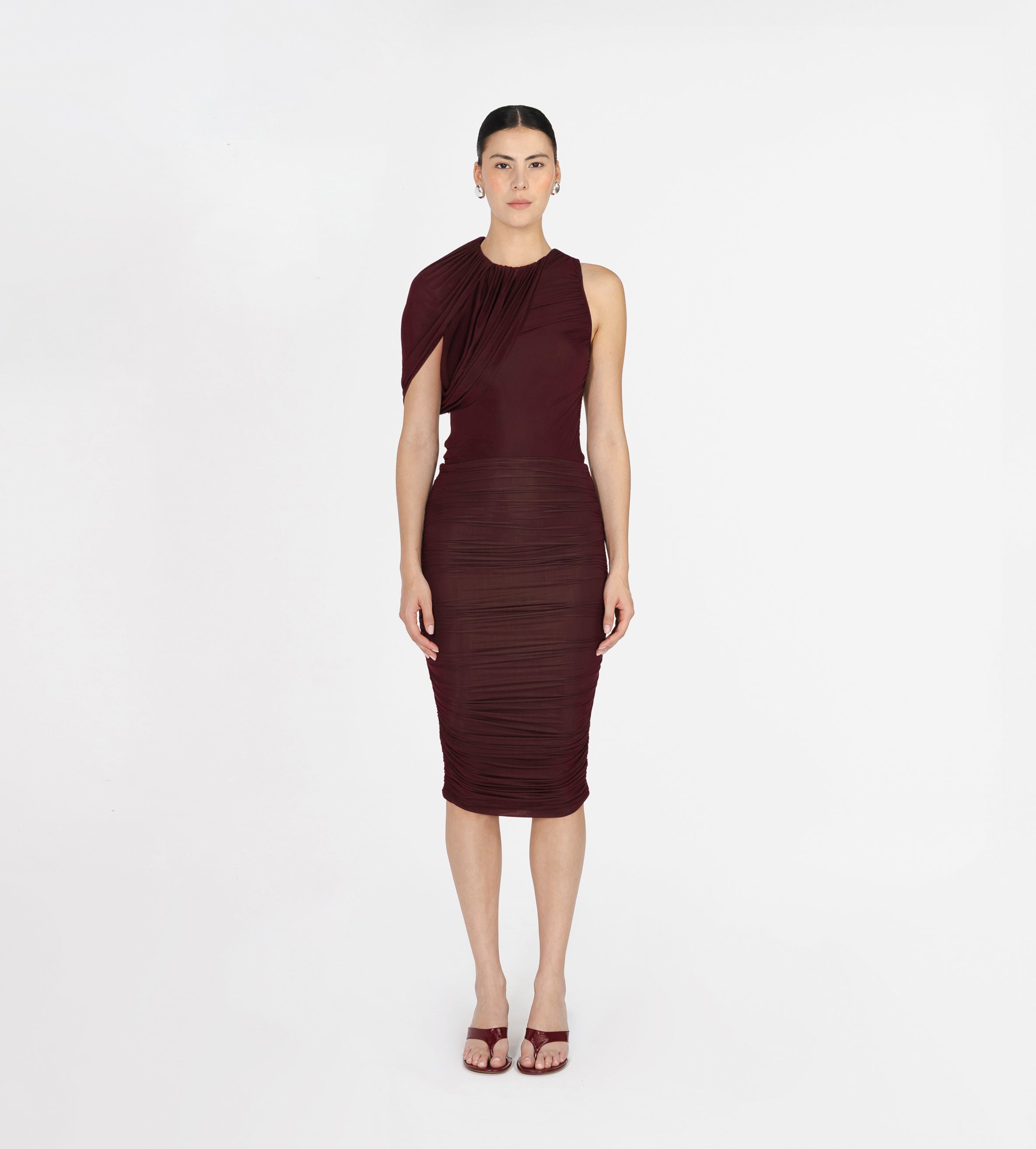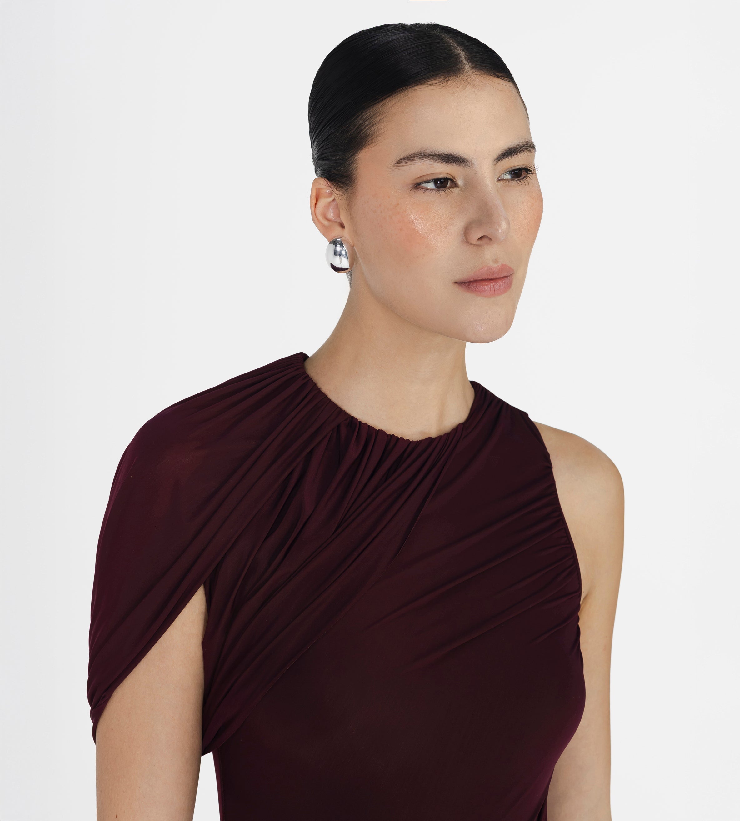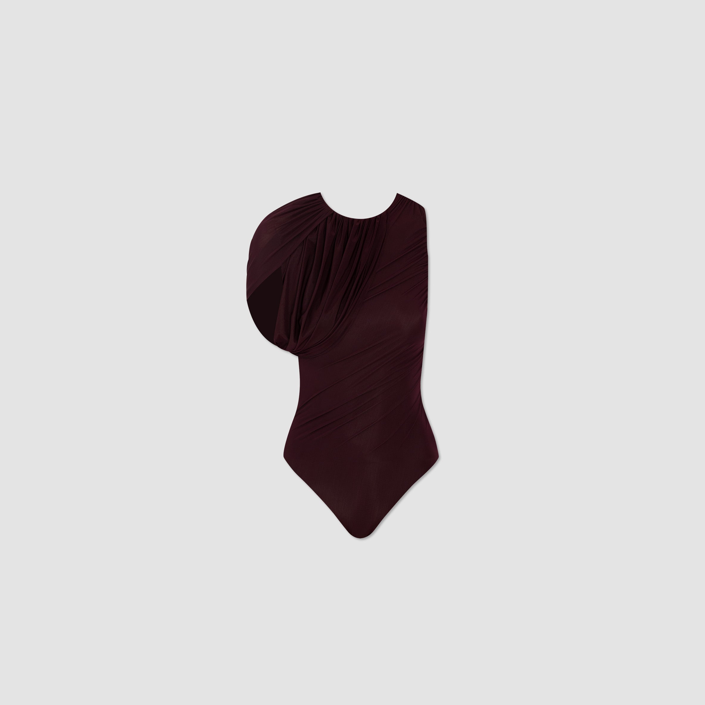 El enterizo Carlos presenta un escote redondo y una llamativa manga drapeada con diferentes opciones de styling, la cual se extiende sobre un body con fruncidos diagonales; un detalle que envuelve la silueta realzando la figura, mientras botones forrados en la parte posterior añaden un toque delicado y elegante.