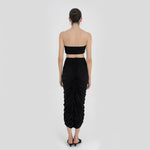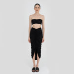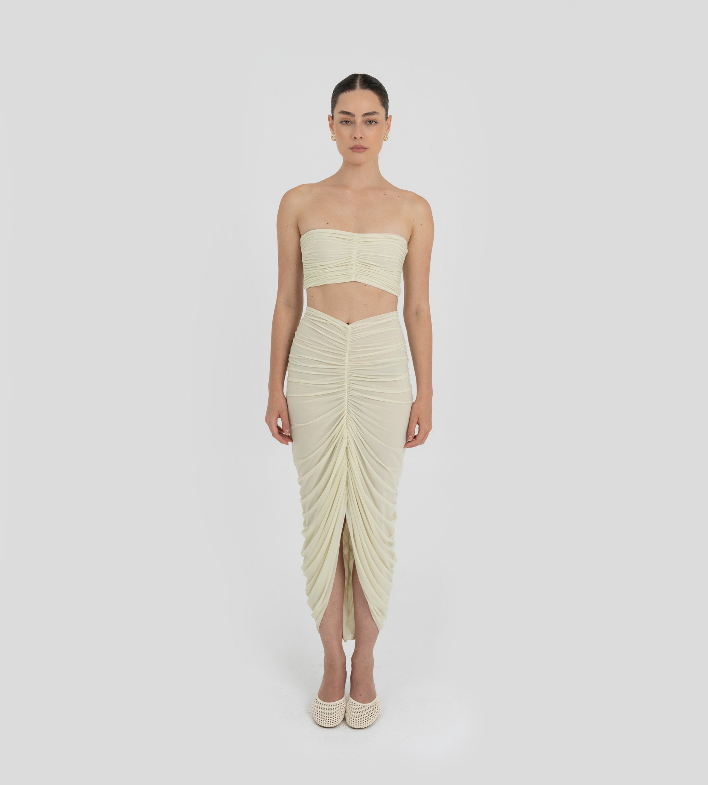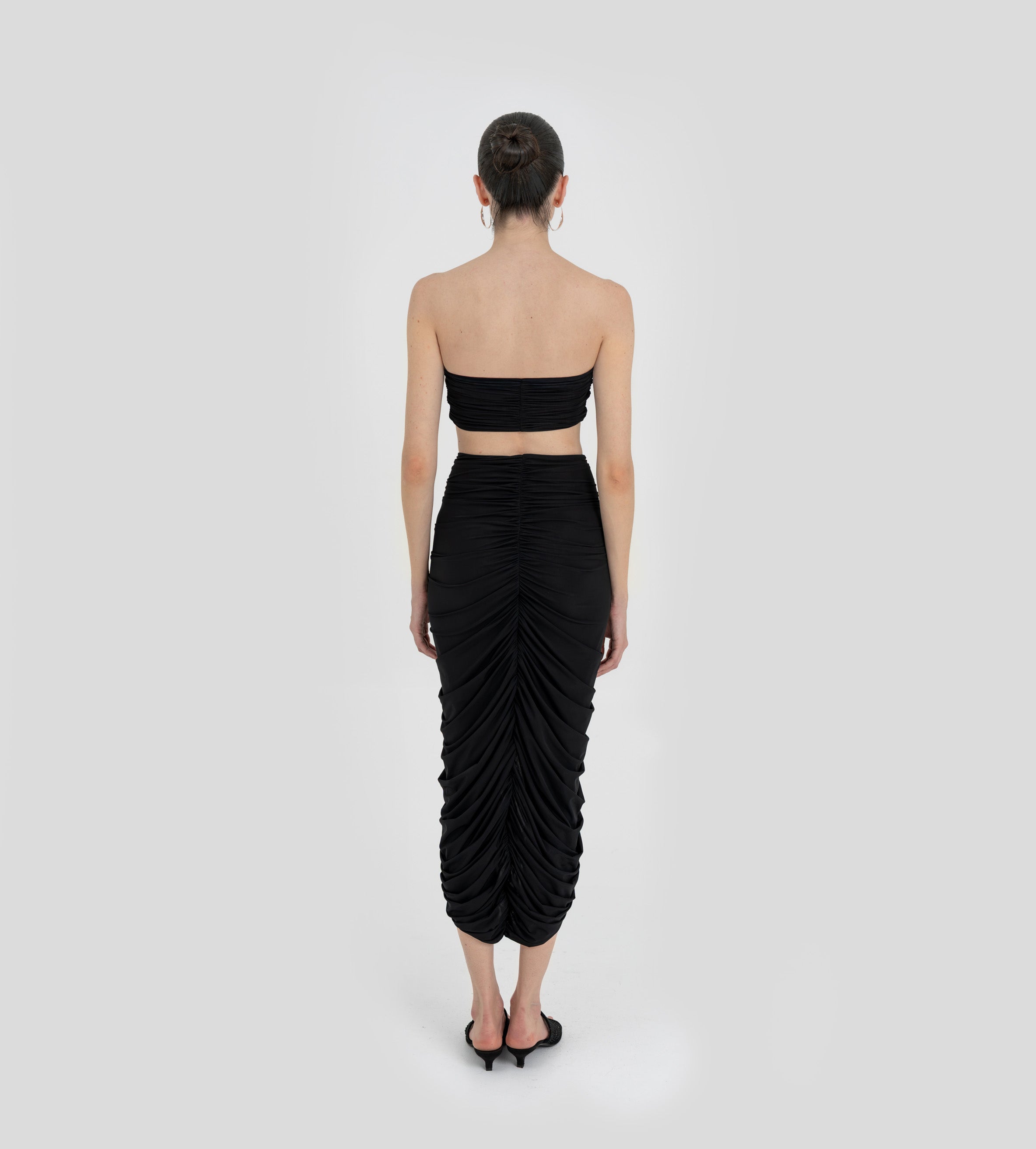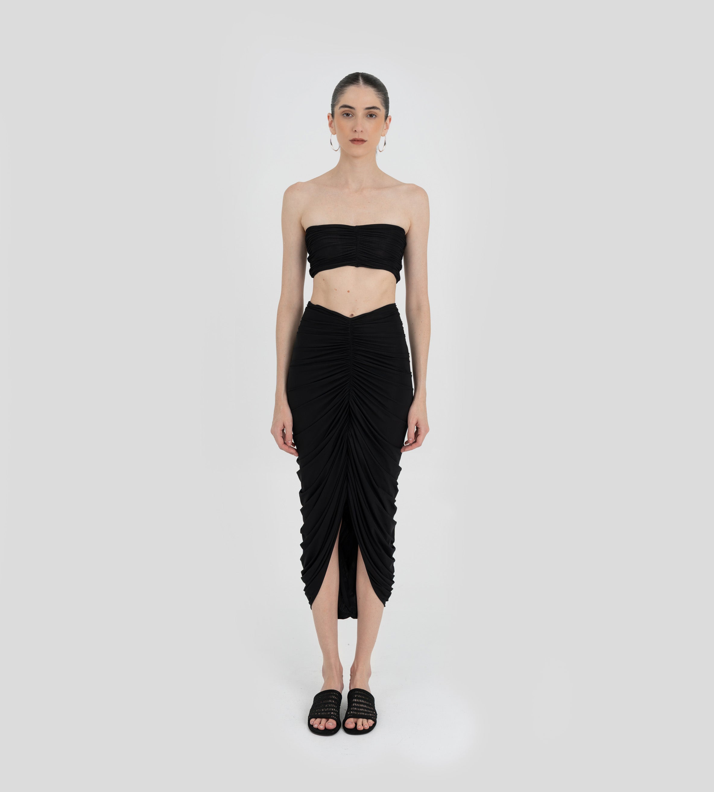 Nuestro Caro set combina un top con escote corazón sutil y fruncido central en delantero y espalda con una falda larga de talle alto, completamente fruncida, lleva un dobladillo asimétrico en el delantero y un drapeado que cae en cascada sobre delantero y espalda, creando una silueta fluida y dramática.
