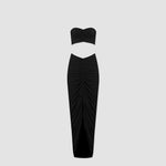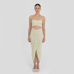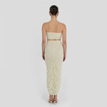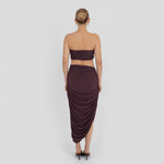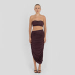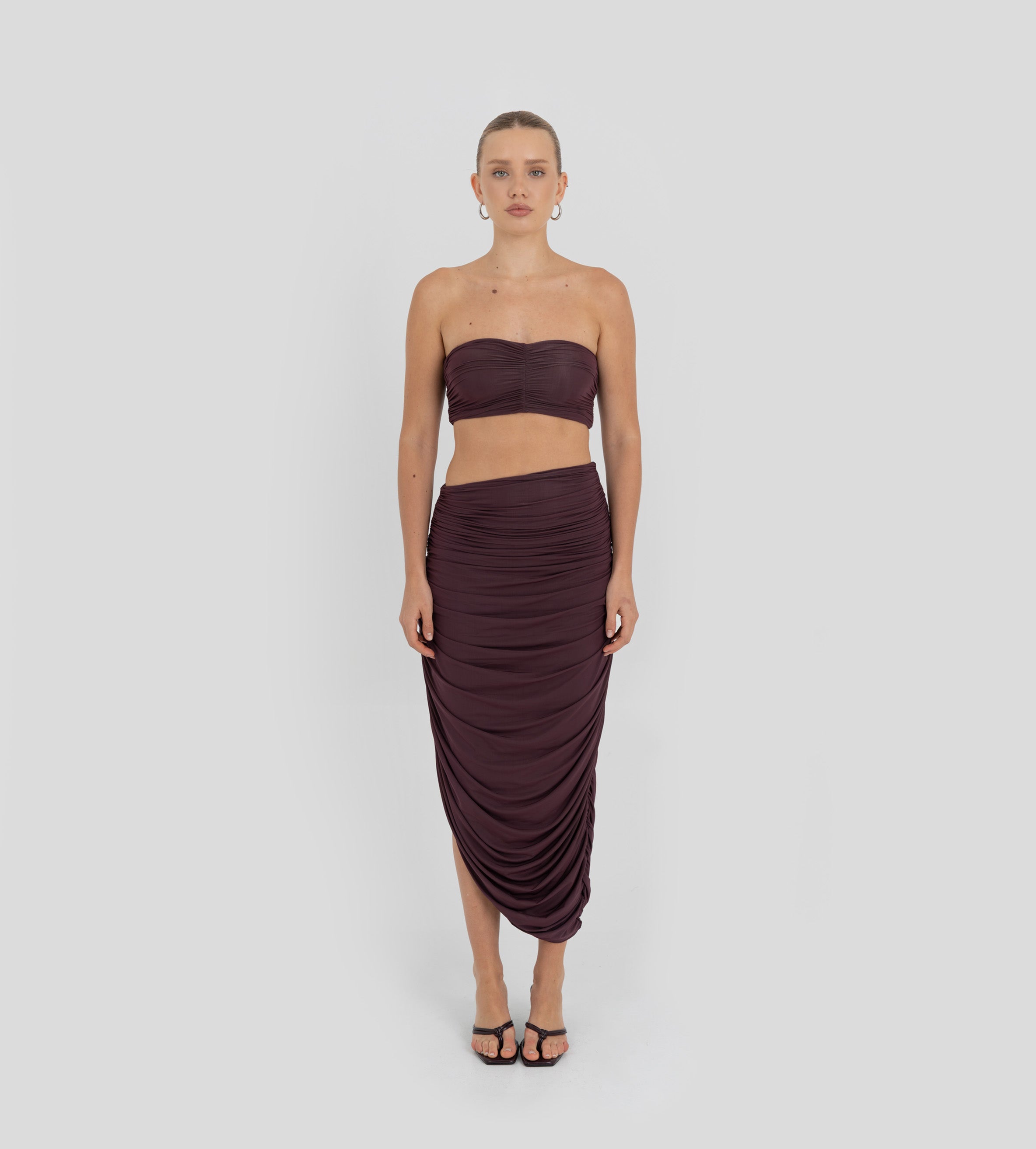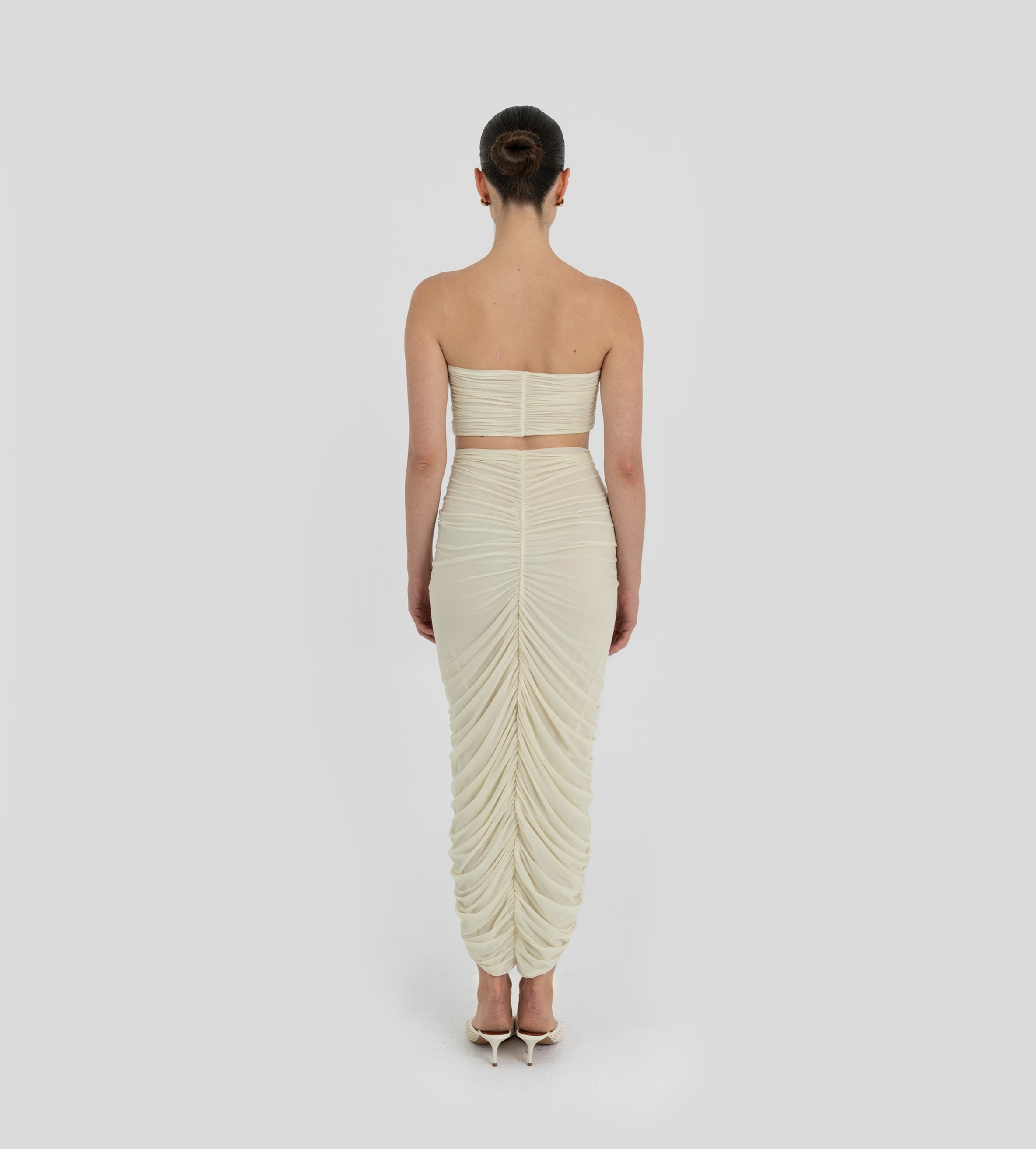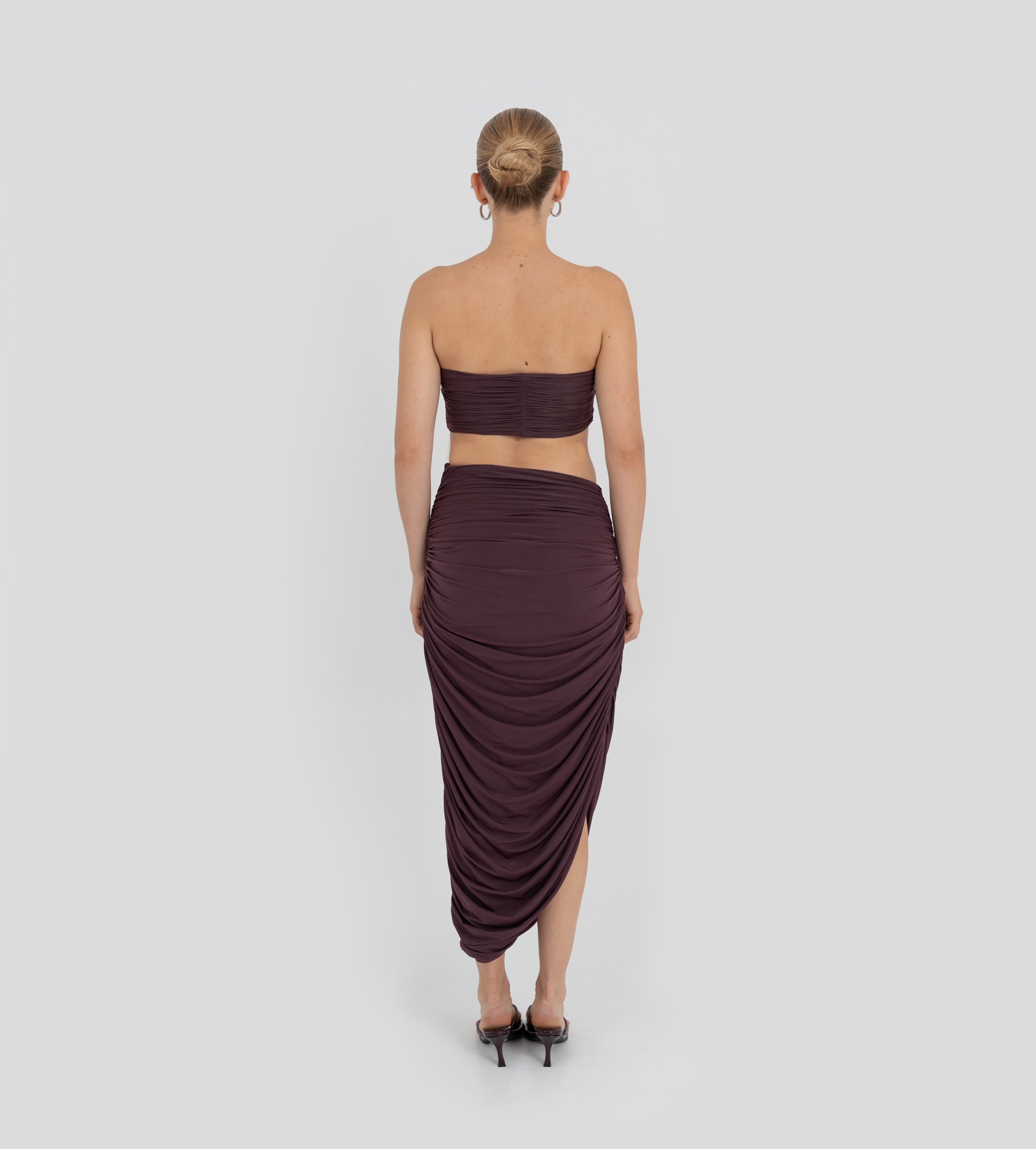 Nuestro Caro set combina un top con escote corazón sutil y fruncido central en delantero y espalda con una falda larga de talle alto, completamente fruncida, lleva un dobladillo asimétrico en el delantero y un drapeado que cae en cascada sobre delantero y espalda, creando una silueta fluida y dramática.