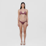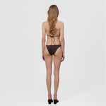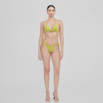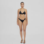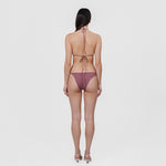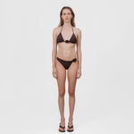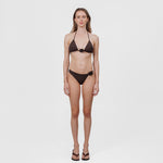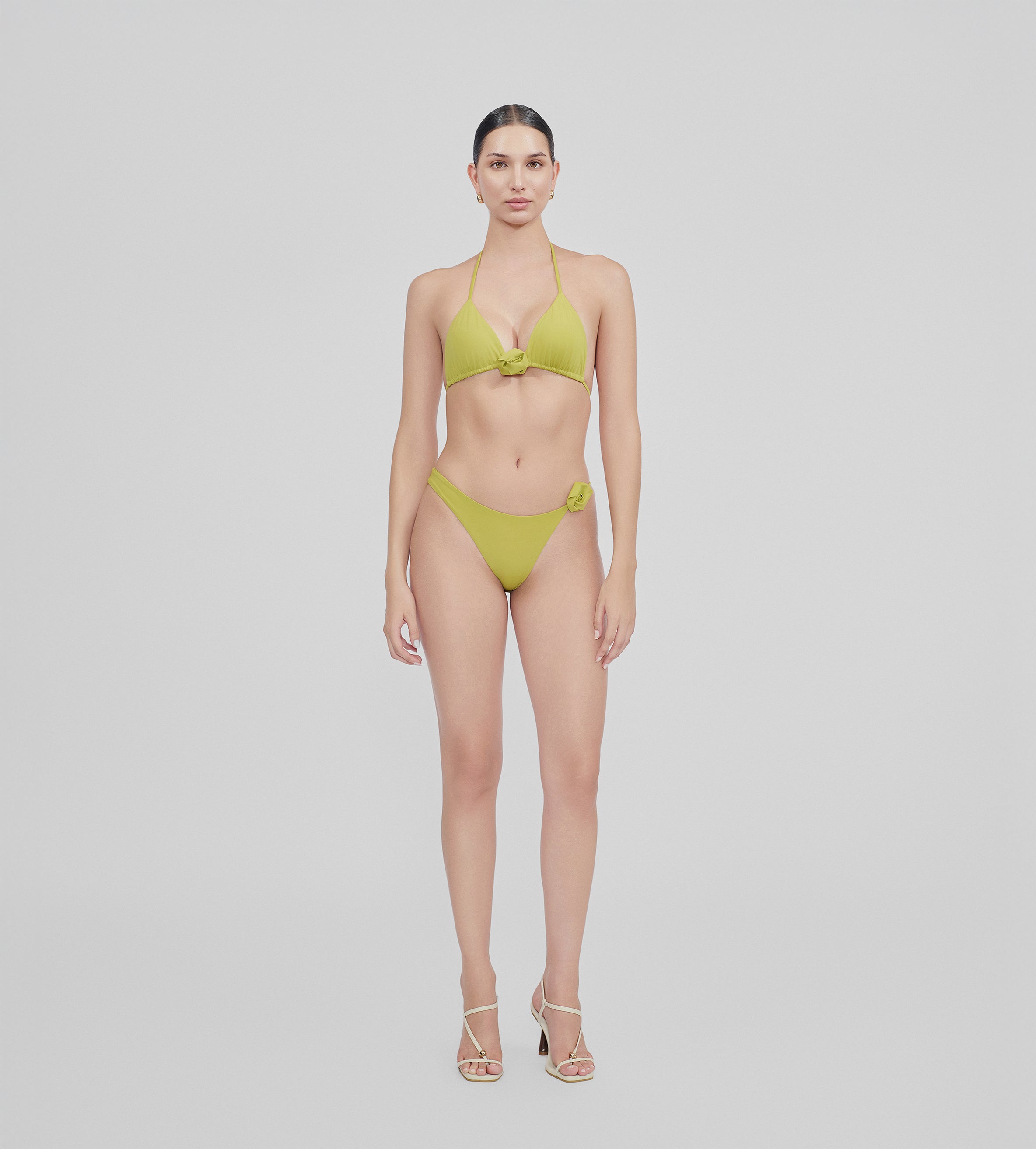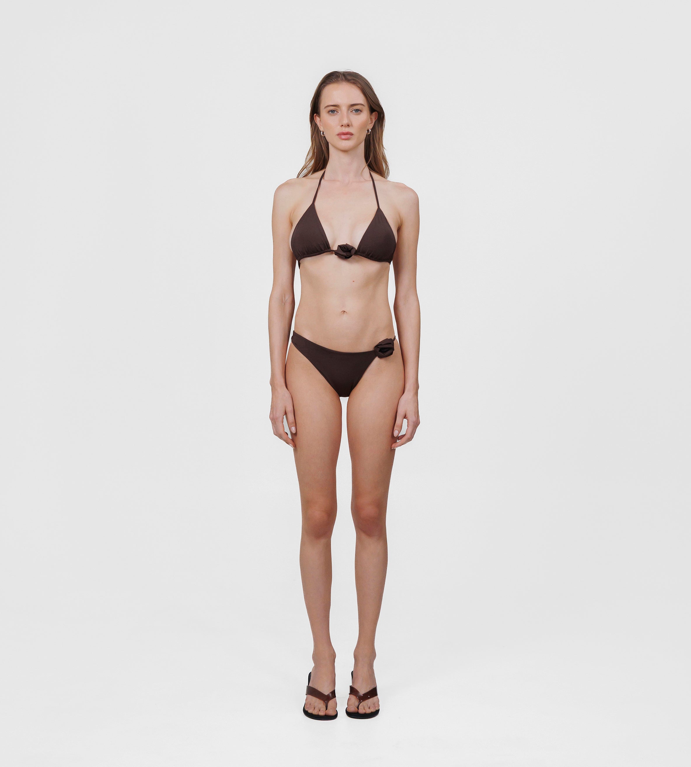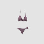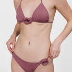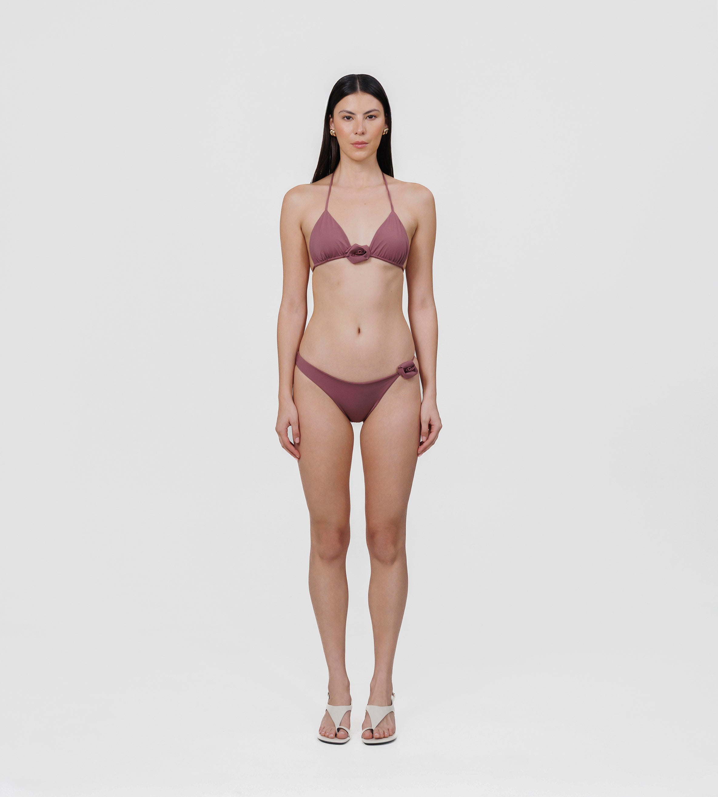 Nuestro traje de baño de dos piezas, Chipi, presenta un top triangular con delicados tirantes que se atan en la espalda. El diseño se acentúa con nuestro adorno floral en el centro delantero. Se complementa con una parte inferior de talle bajo y corte asimétrico cuyo sensual diseño se ve complementado por una flor en 3D en la parte lateral.