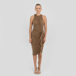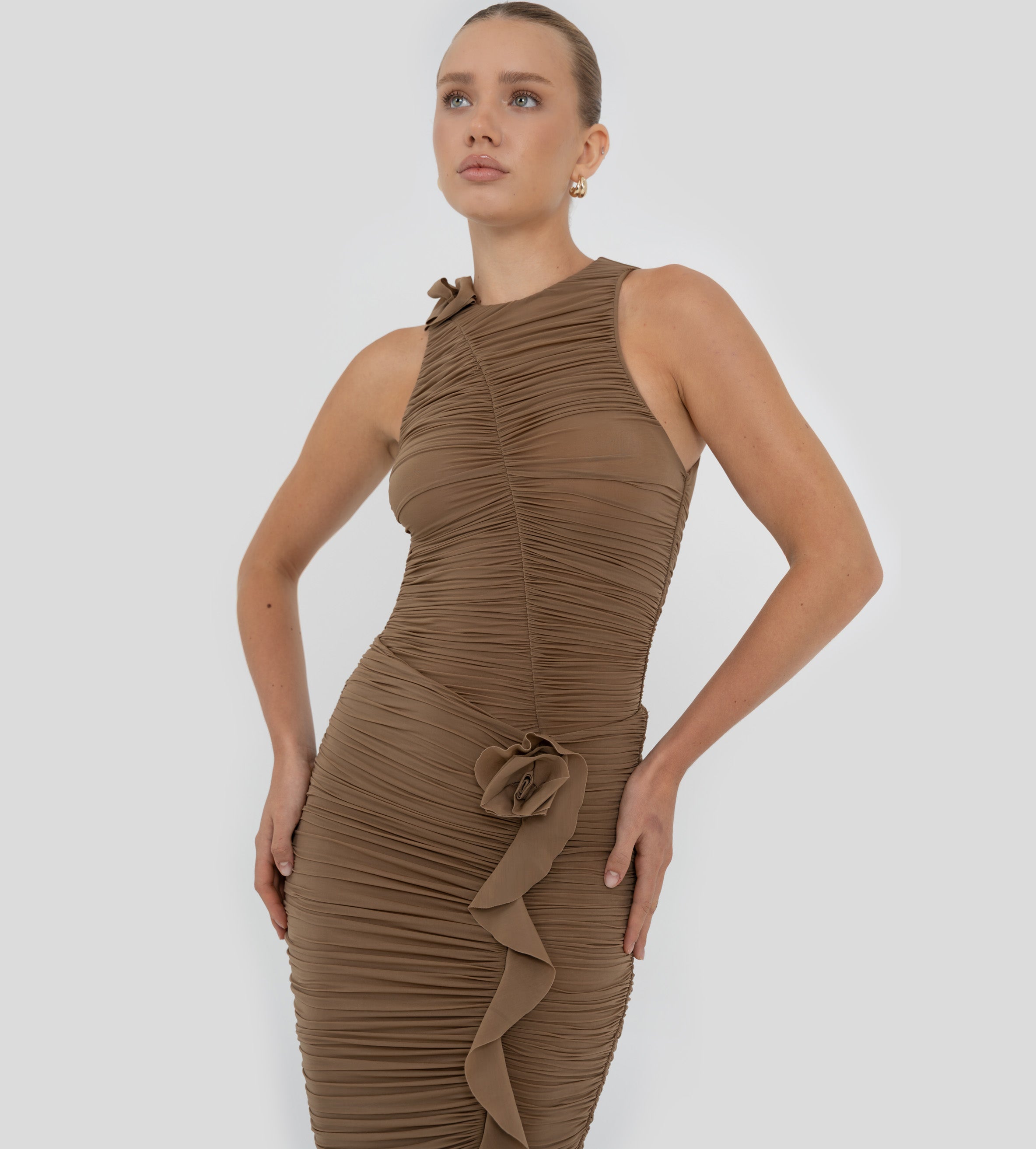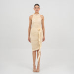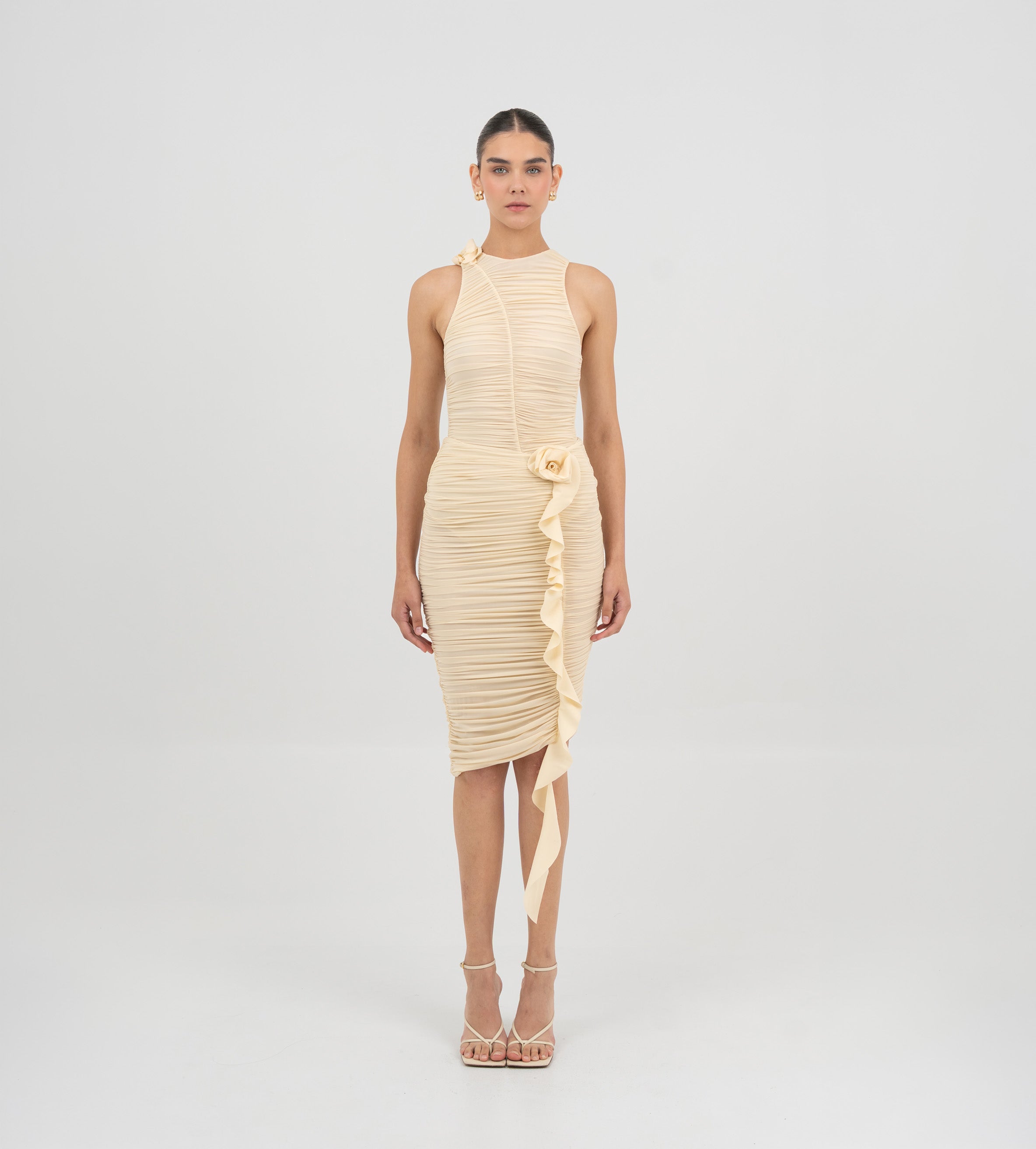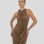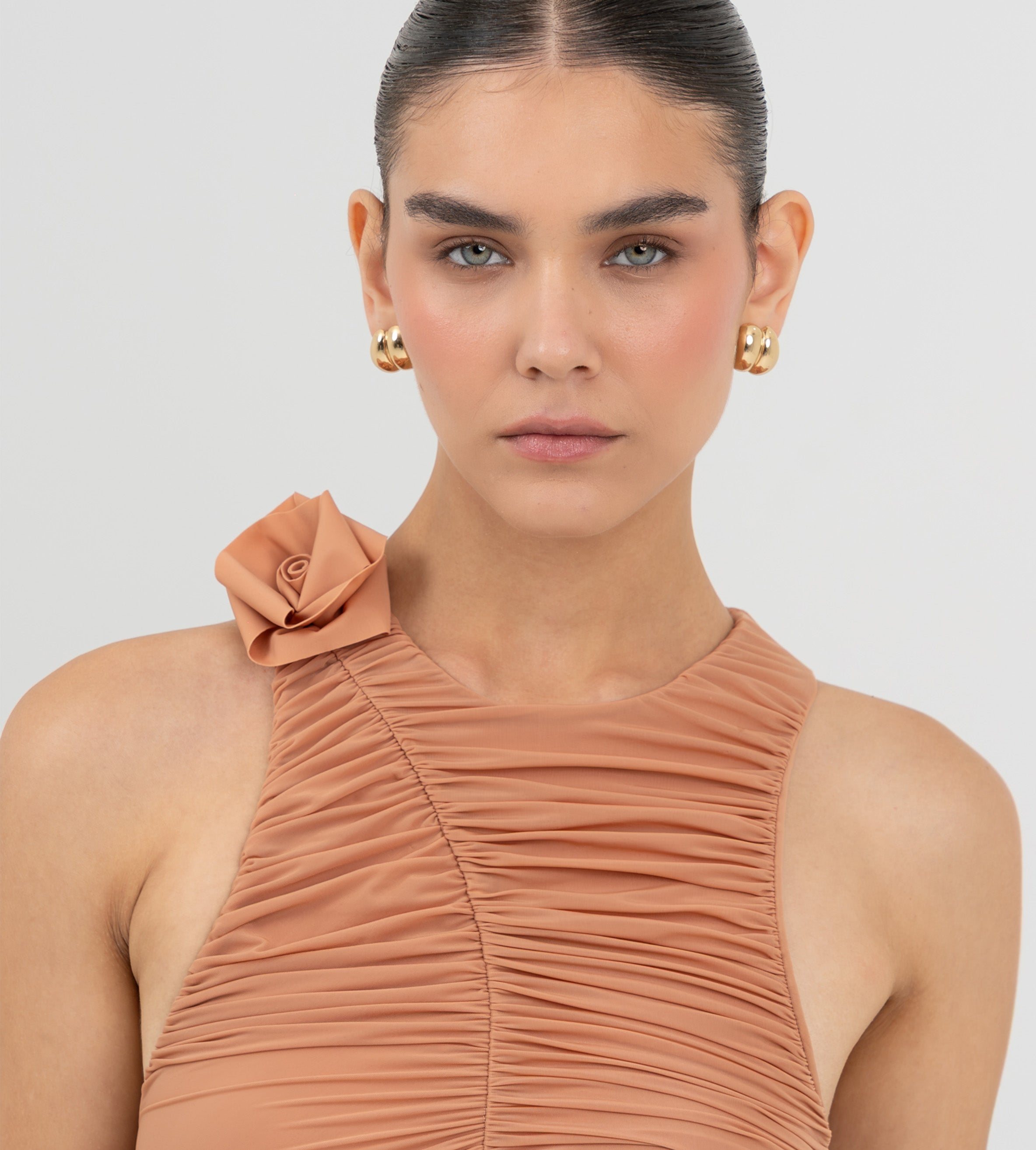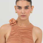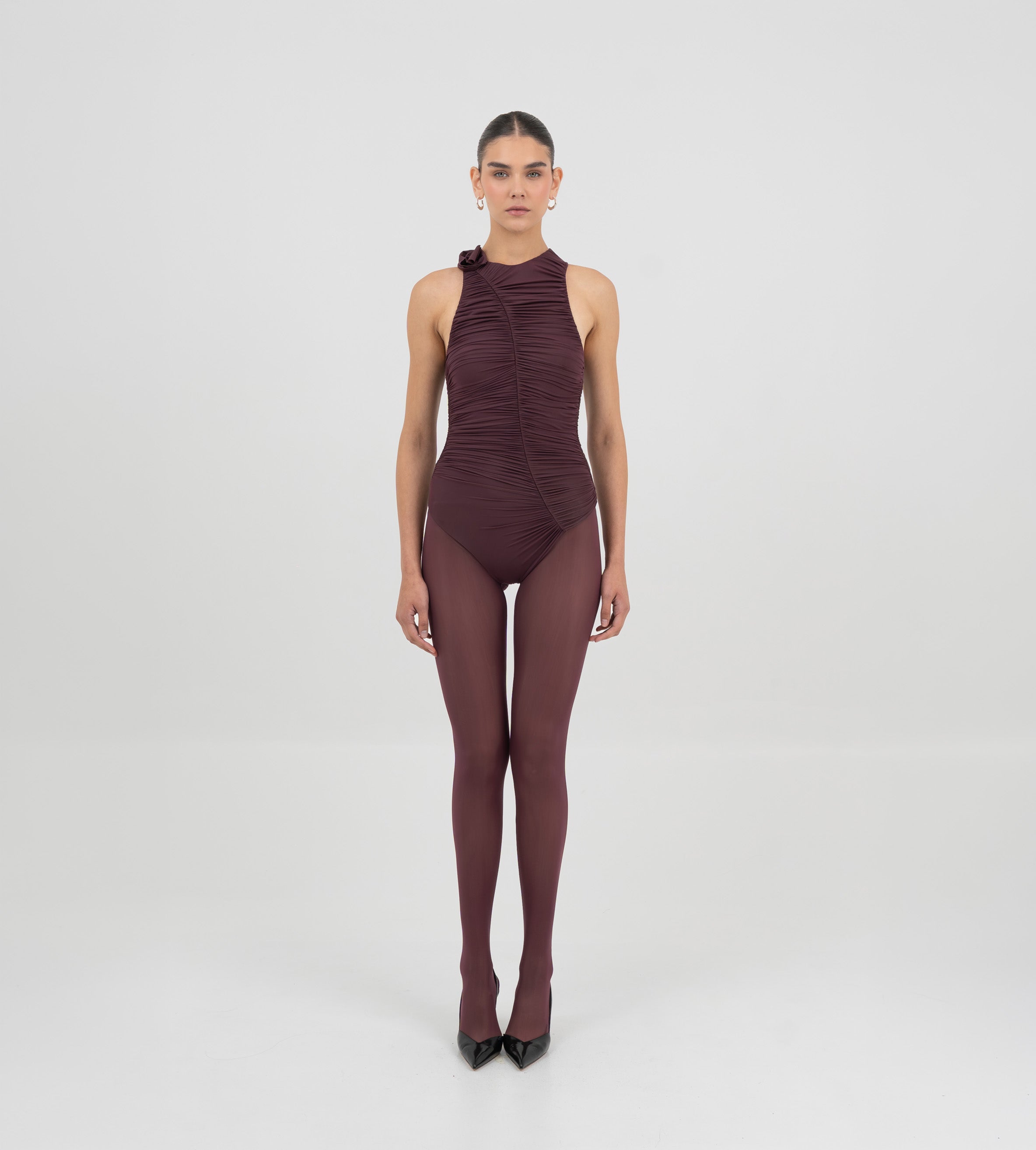 El bodysuit Coco cautiva con un escote redondo que fluye hacia una silueta con fruncidos pronunciados. Un corte en forma de S enmarca el frente y da paso a un detalle de flor 3D sobre el cuello, mientras que la parte posterior presenta un suave fruncido que realza la forma y equilibra el diseño.