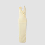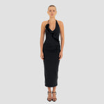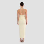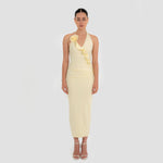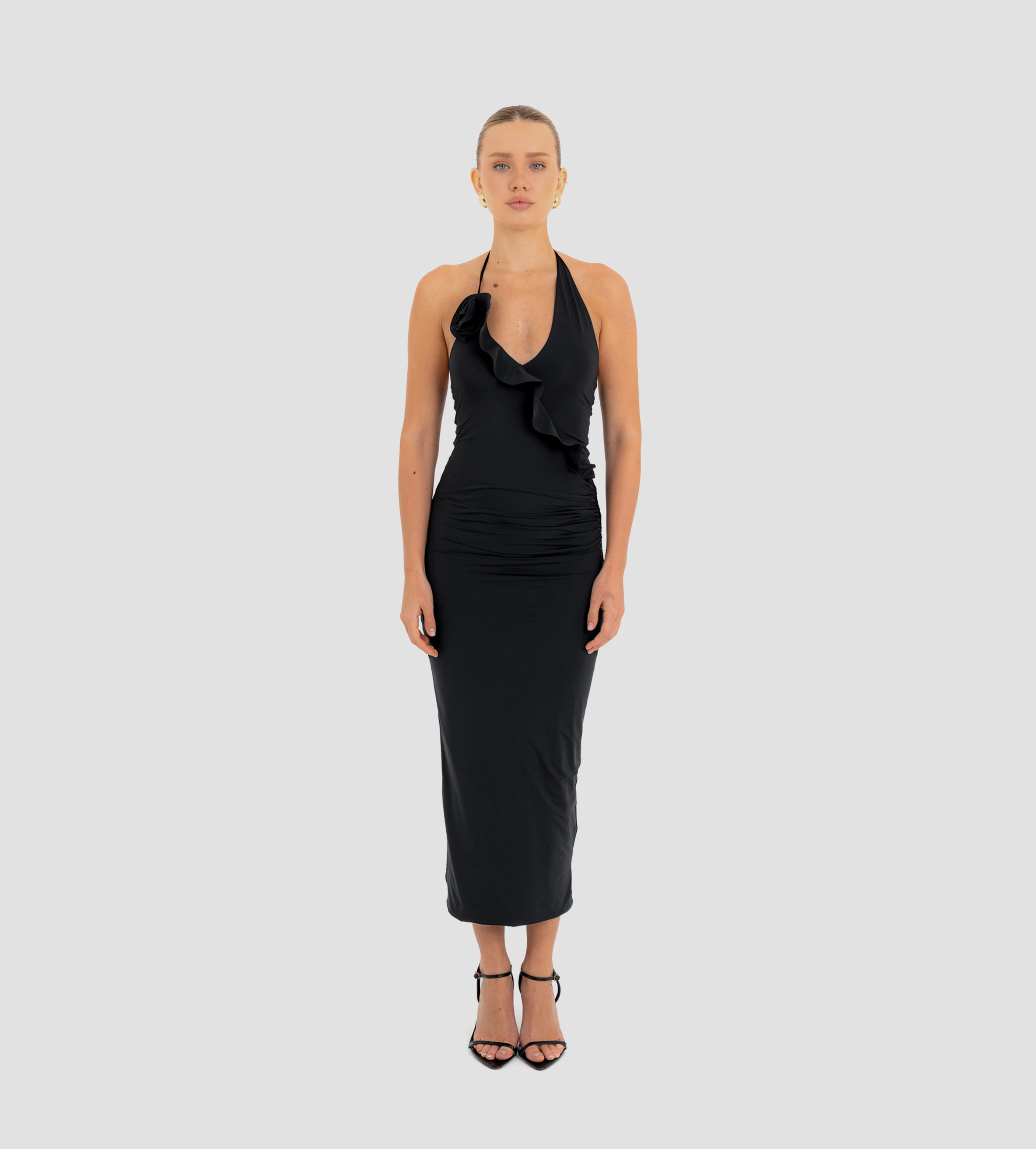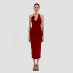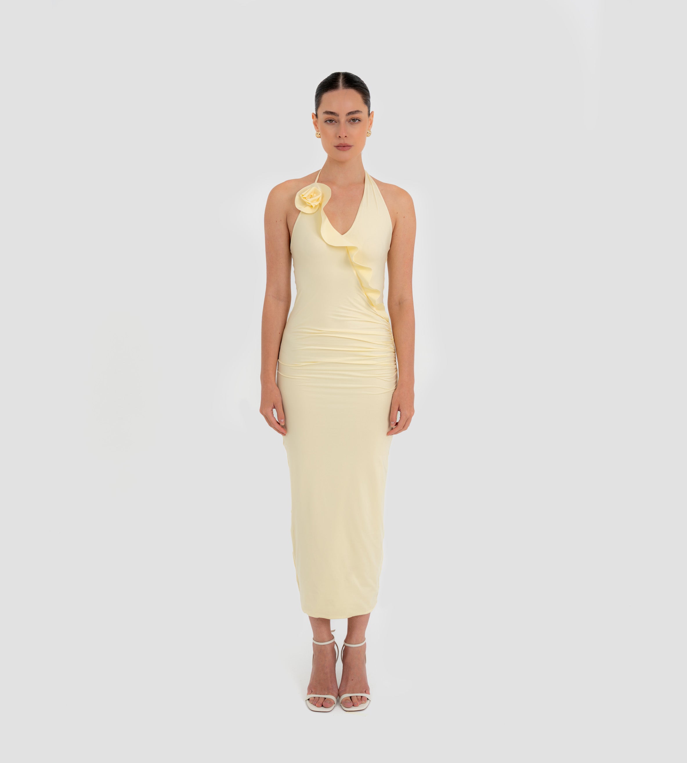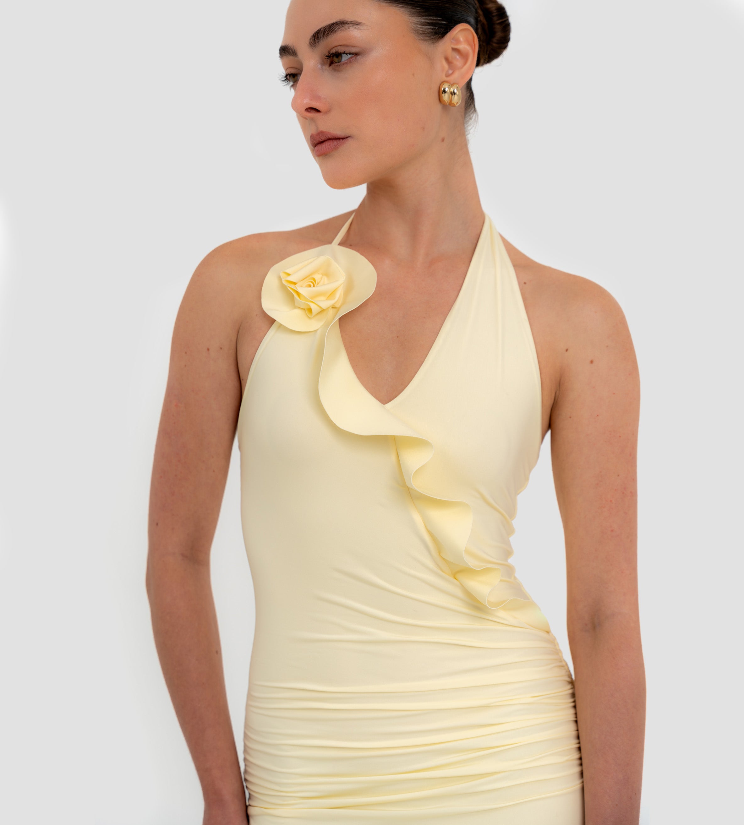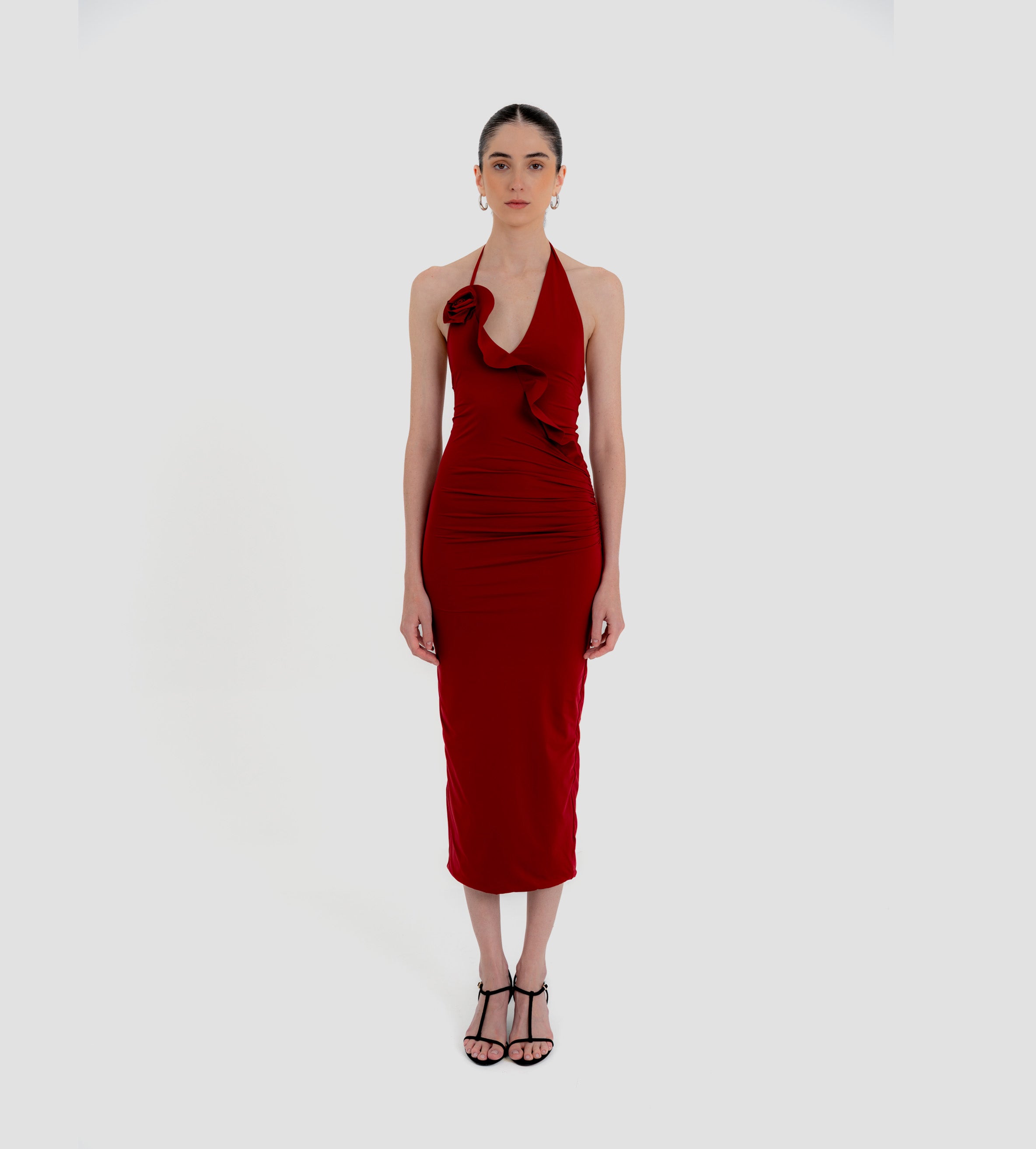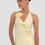 Nuestro vestido midi Coralina presenta un escote halter asimétrico con una forma profunda en U. Un lado se prolonga hasta el cuello, mientras que el otro se acentúa con un detalle floral en 3D que da paso a un fino tirante al cuello.