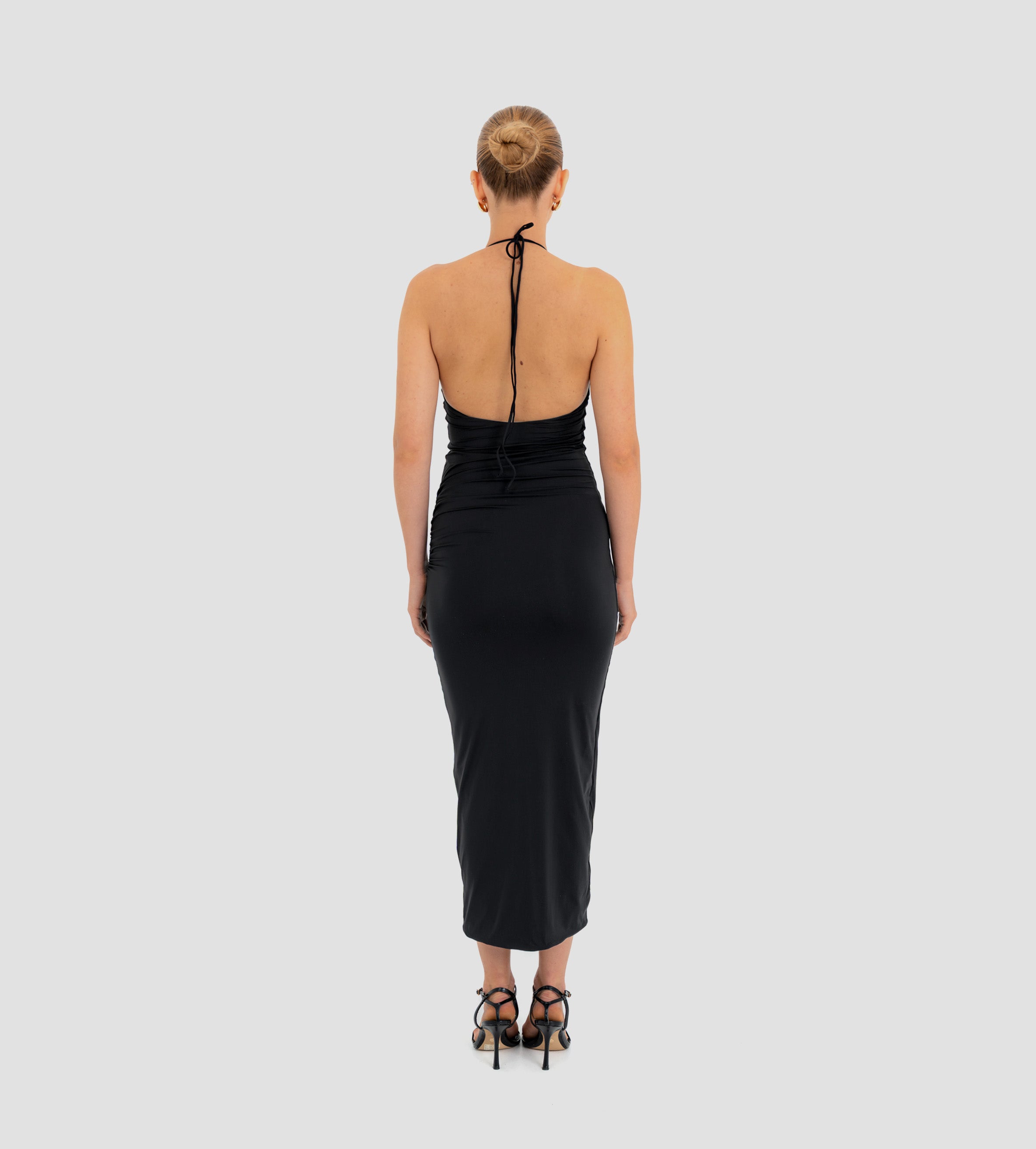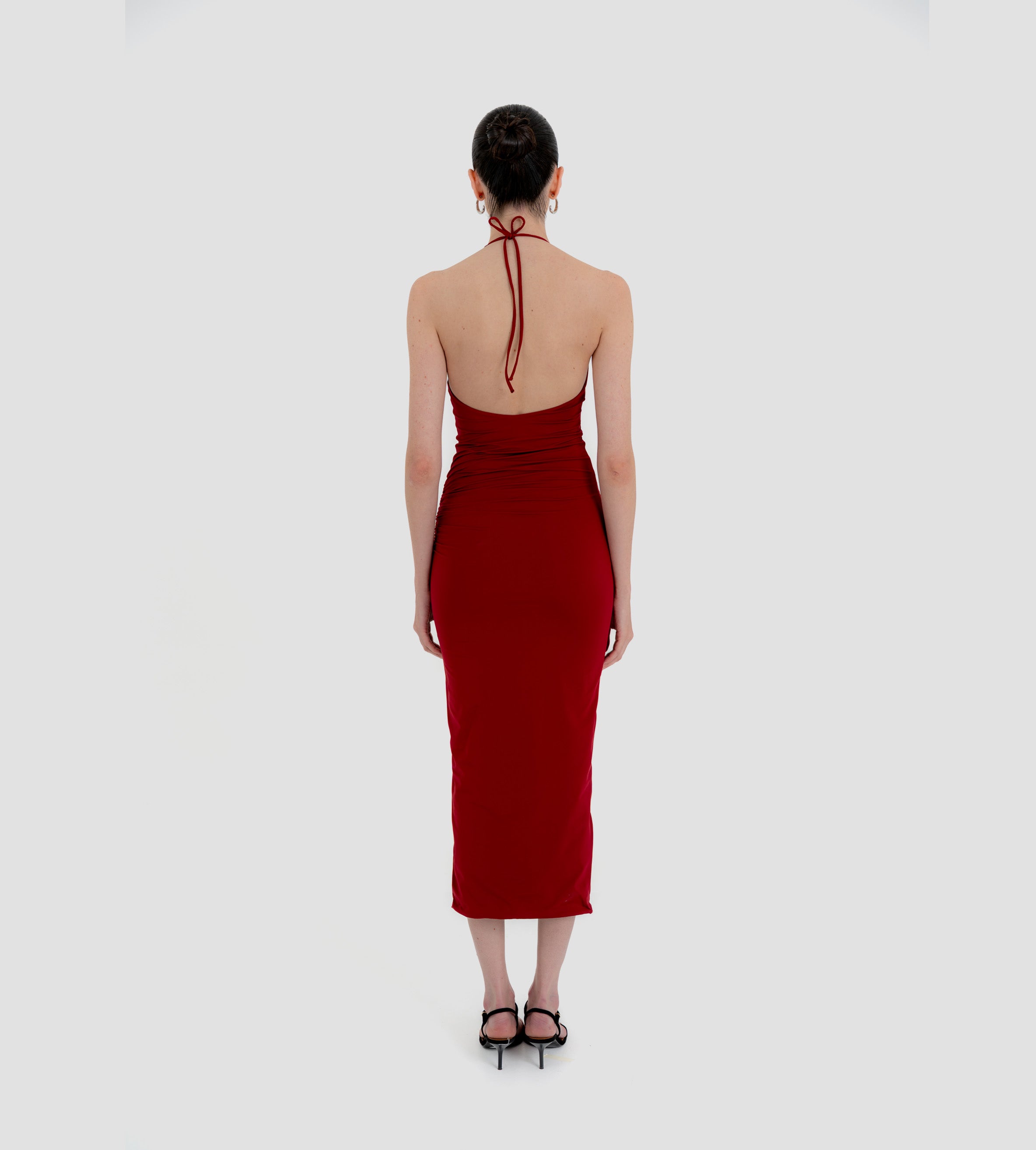 En la parte posterior, finos tirantes se atan al cuello y una silueta con ajuste perfecto completa el diseño.
