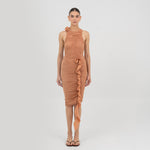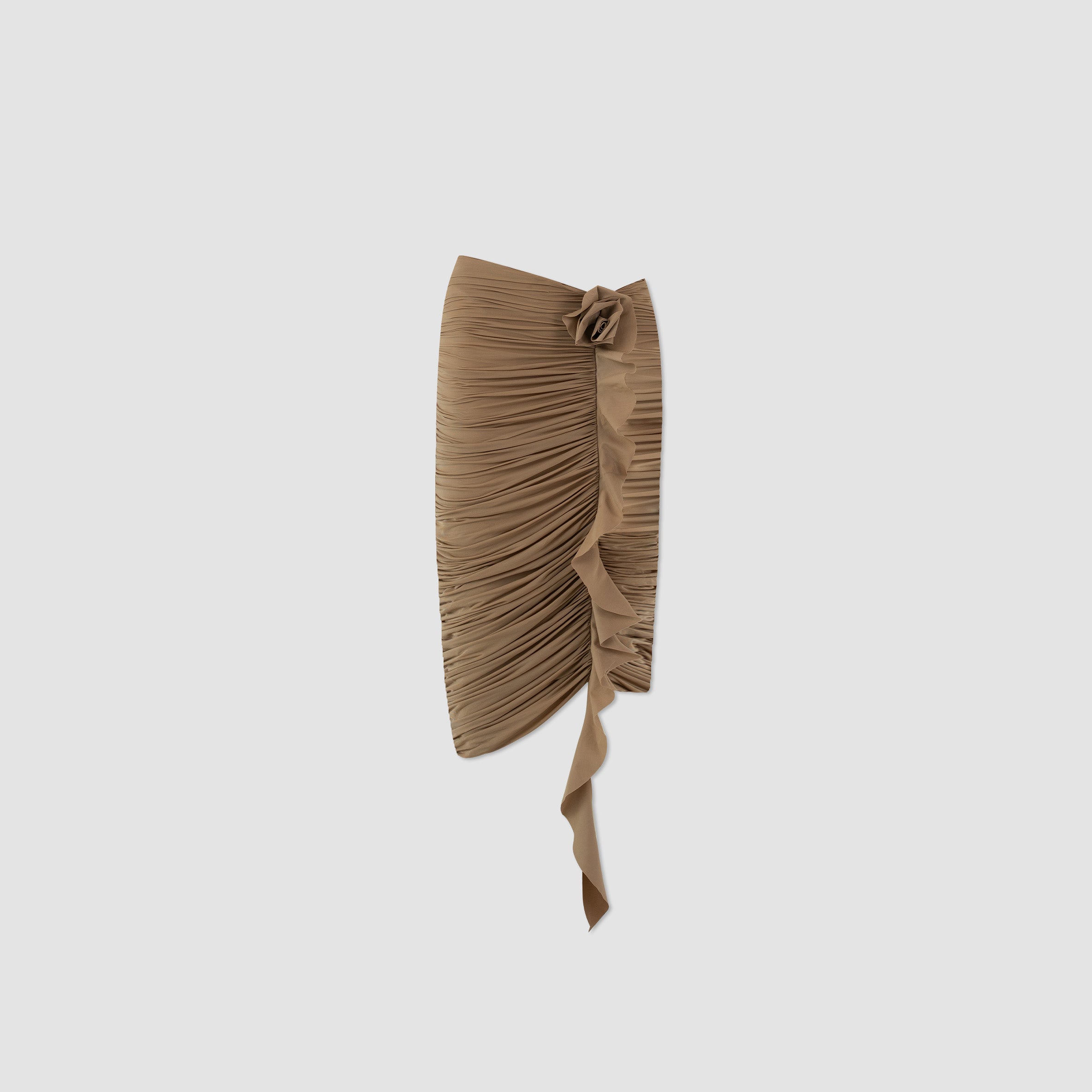 La falda Coroncoro presenta una silueta midi asimétrica de talle bajo, con