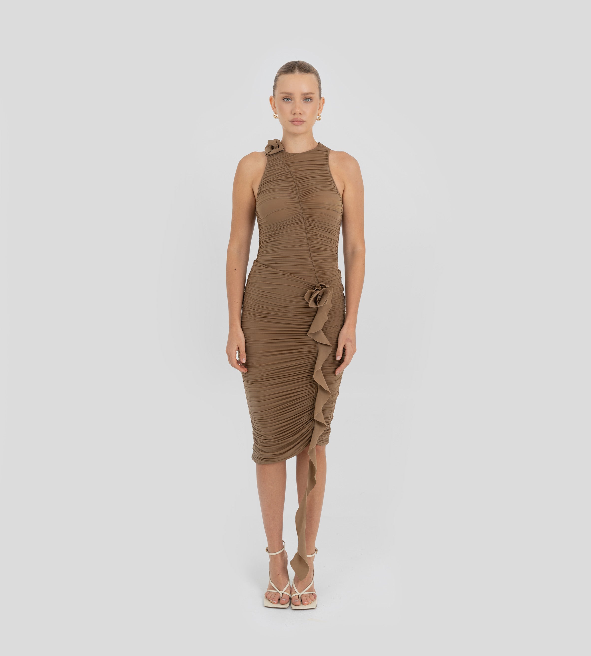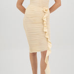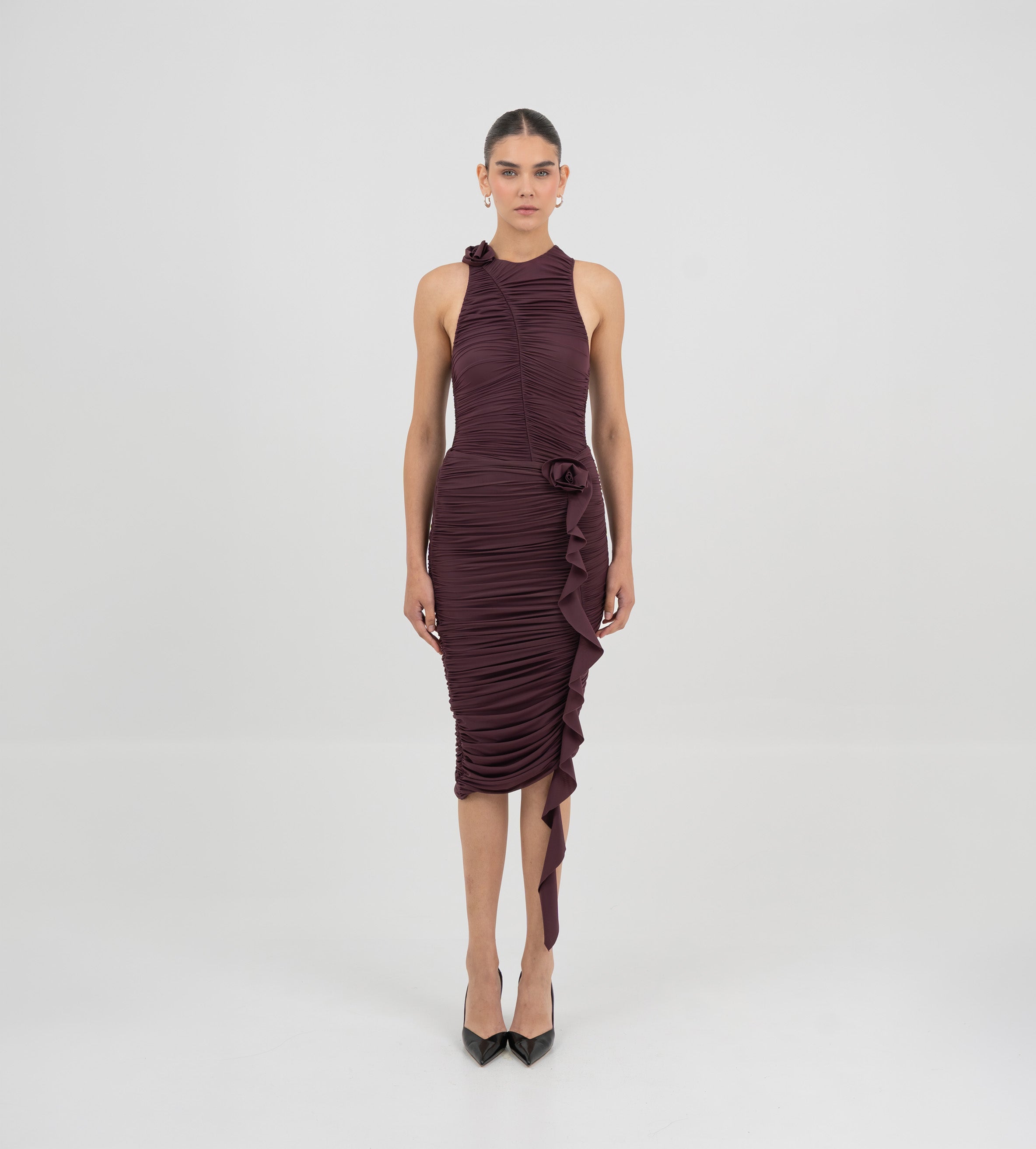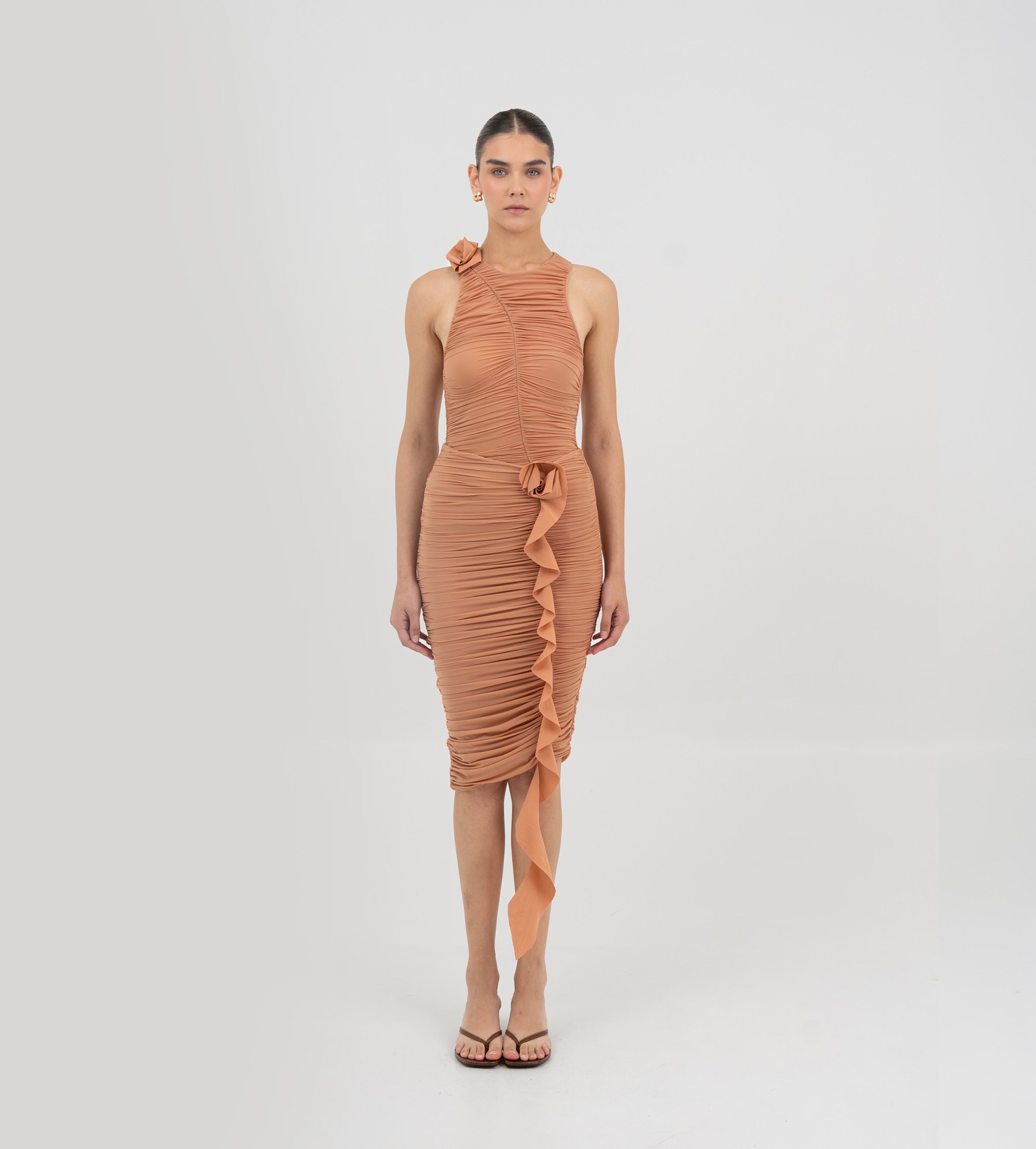 doble fruncido en el delantero enmarcado por un diseño floral en 3D que se