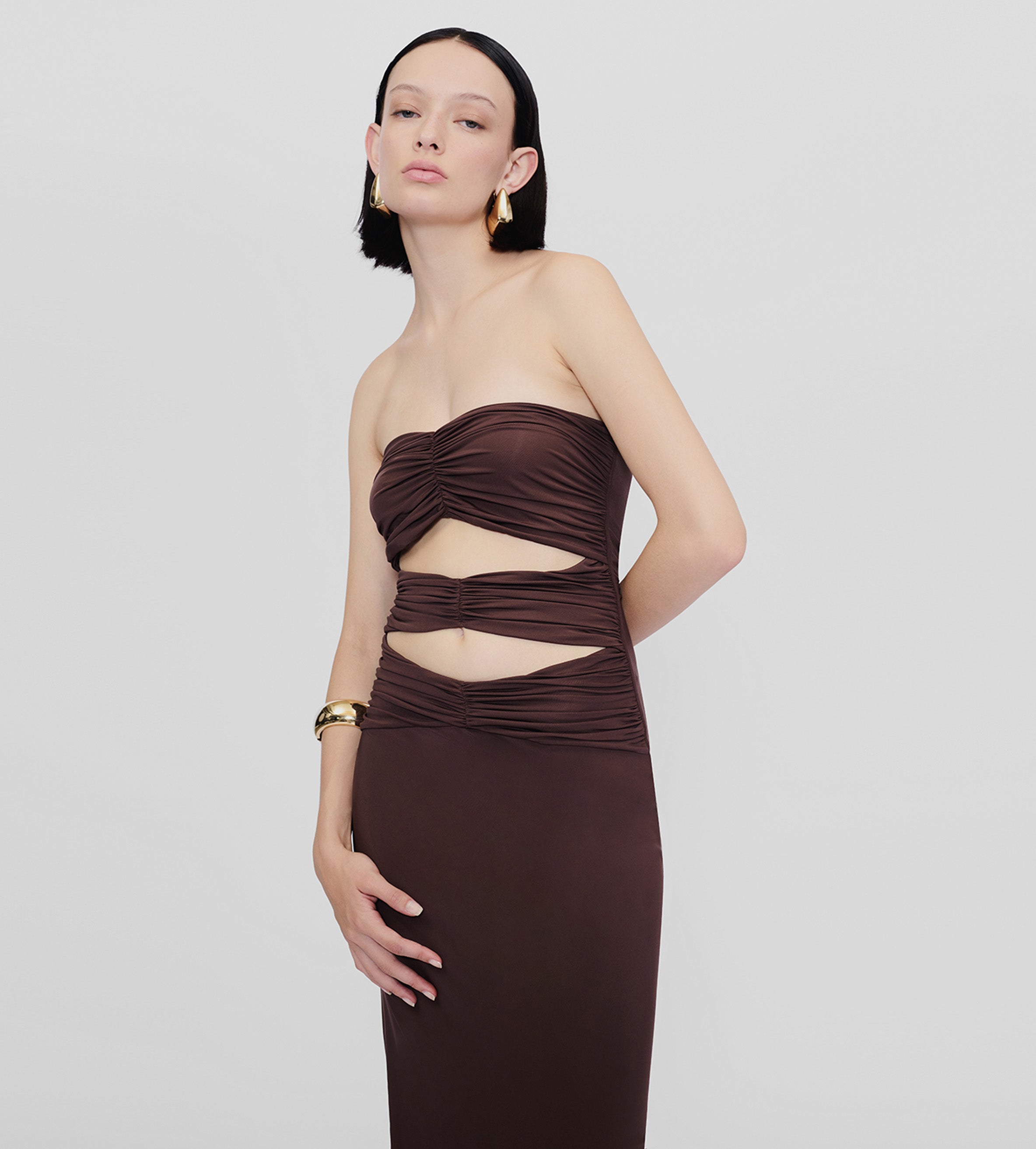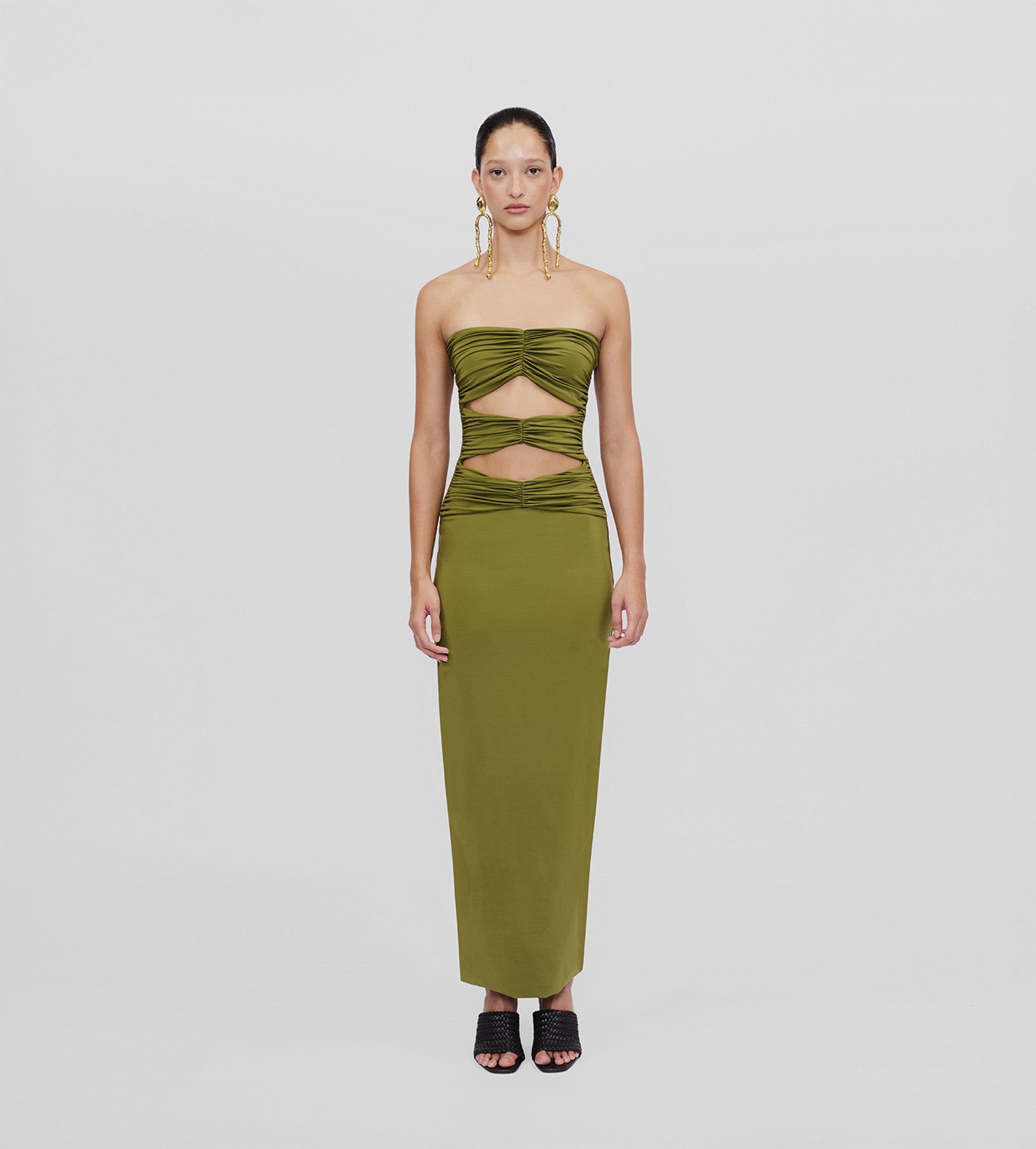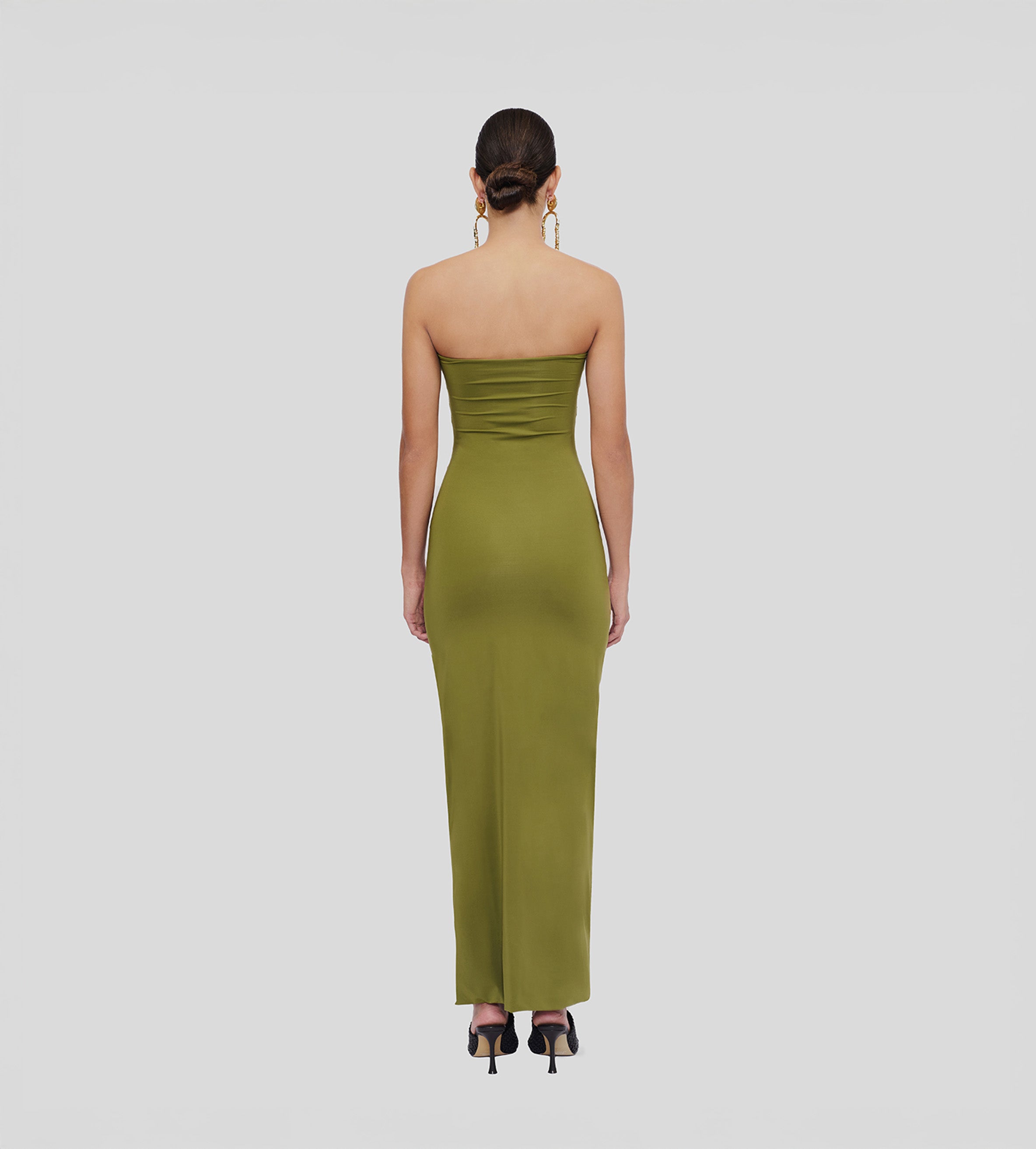 Pieza exclusiva de la cápsula de Holiday. Vestido largo ajustado de corte recto, escote sin tirantes con aberturas en el abdomen y detalles fruncidos.