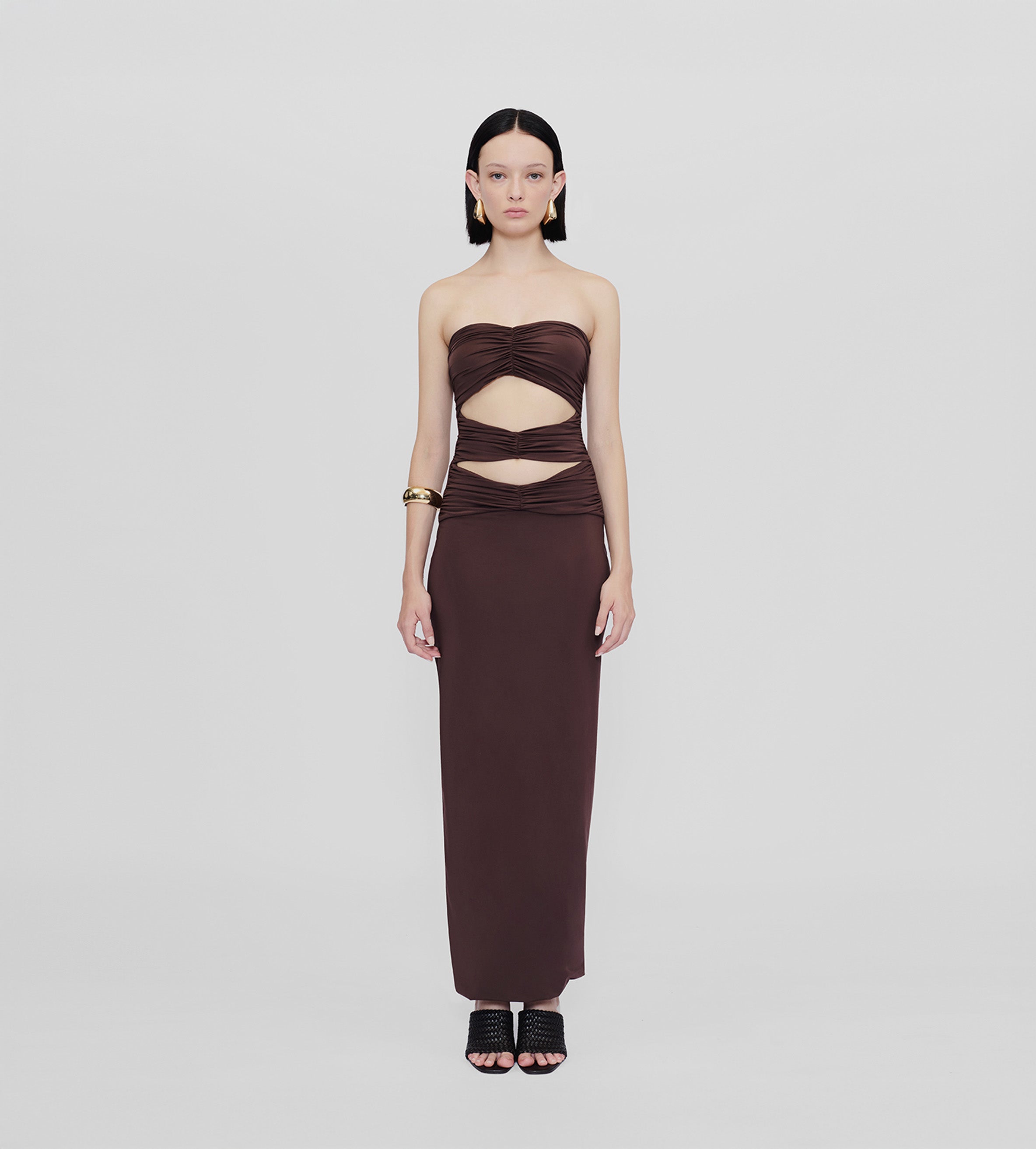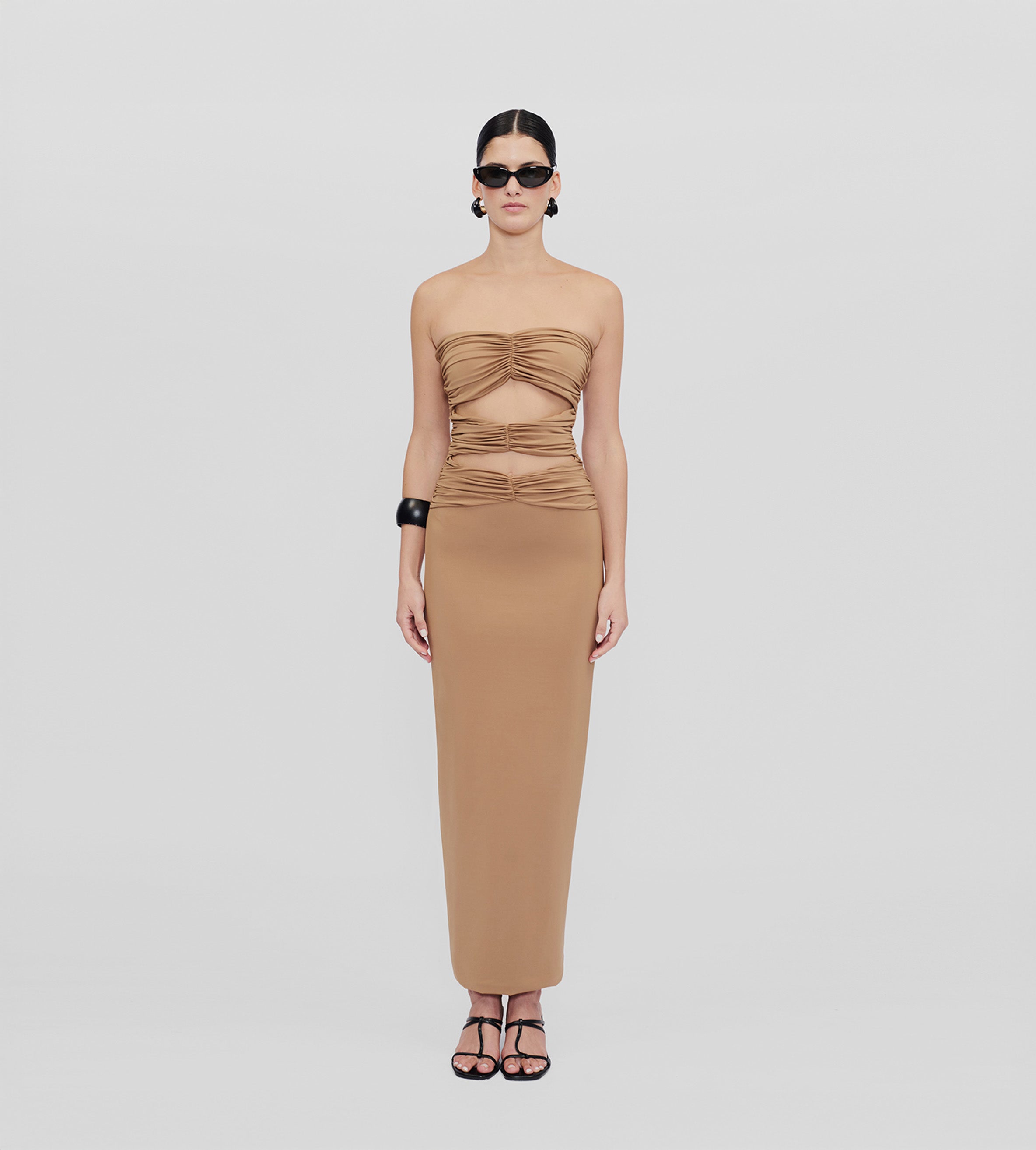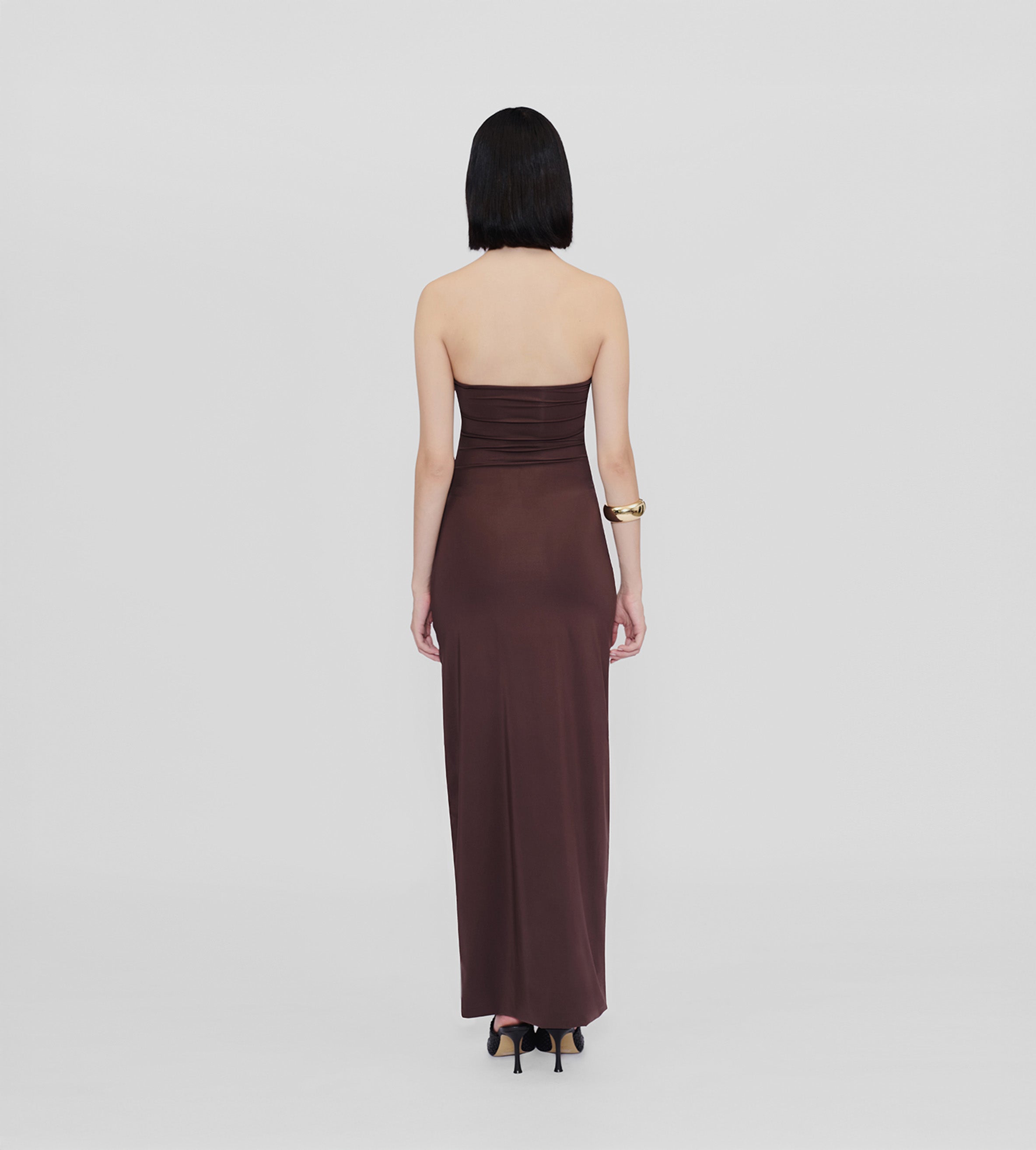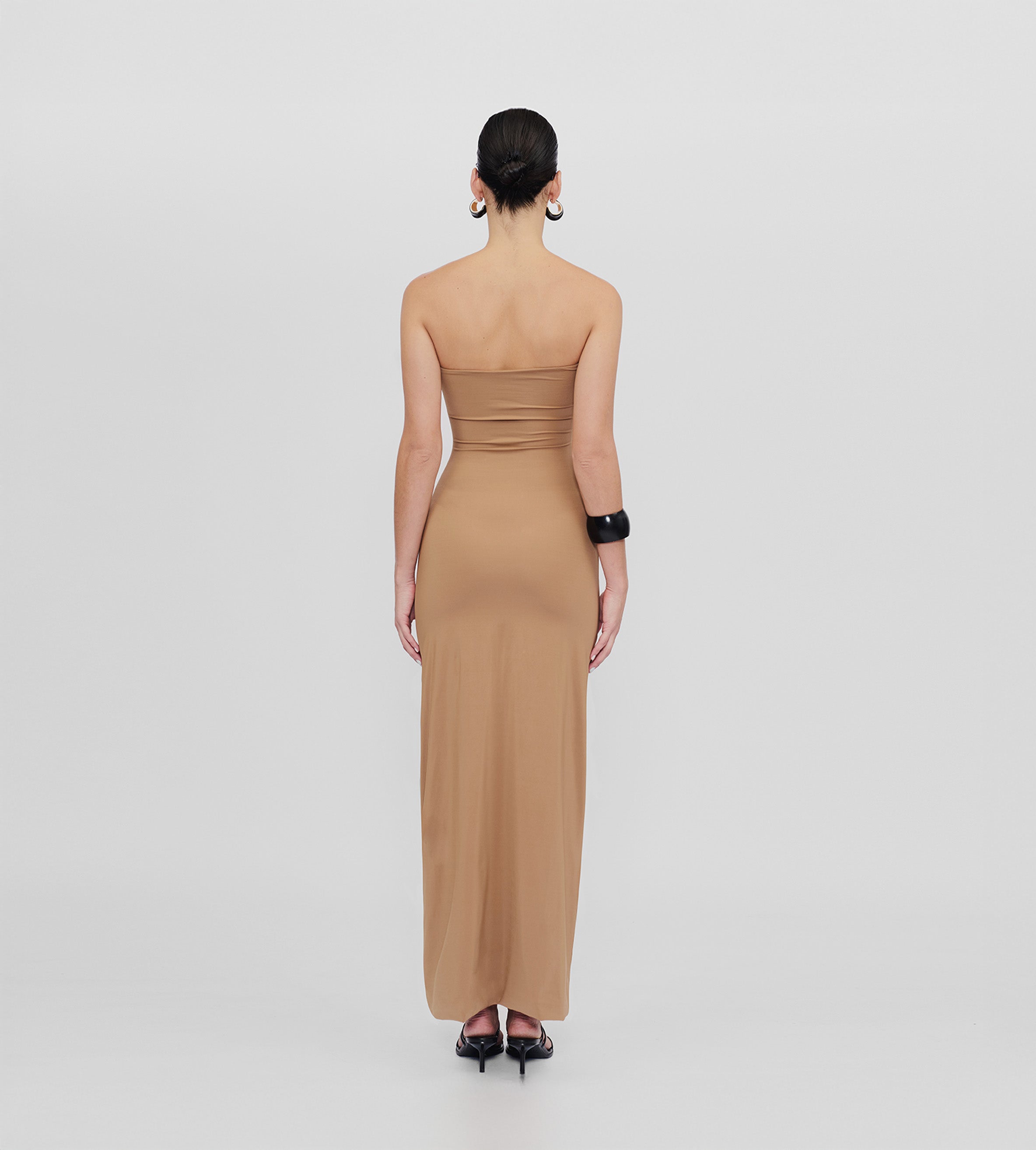 Pieza exclusiva de la cápsula de Holiday. Vestido largo ajustado de corte recto, escote sin tirantes con aberturas en el abdomen y detalles fruncidos.