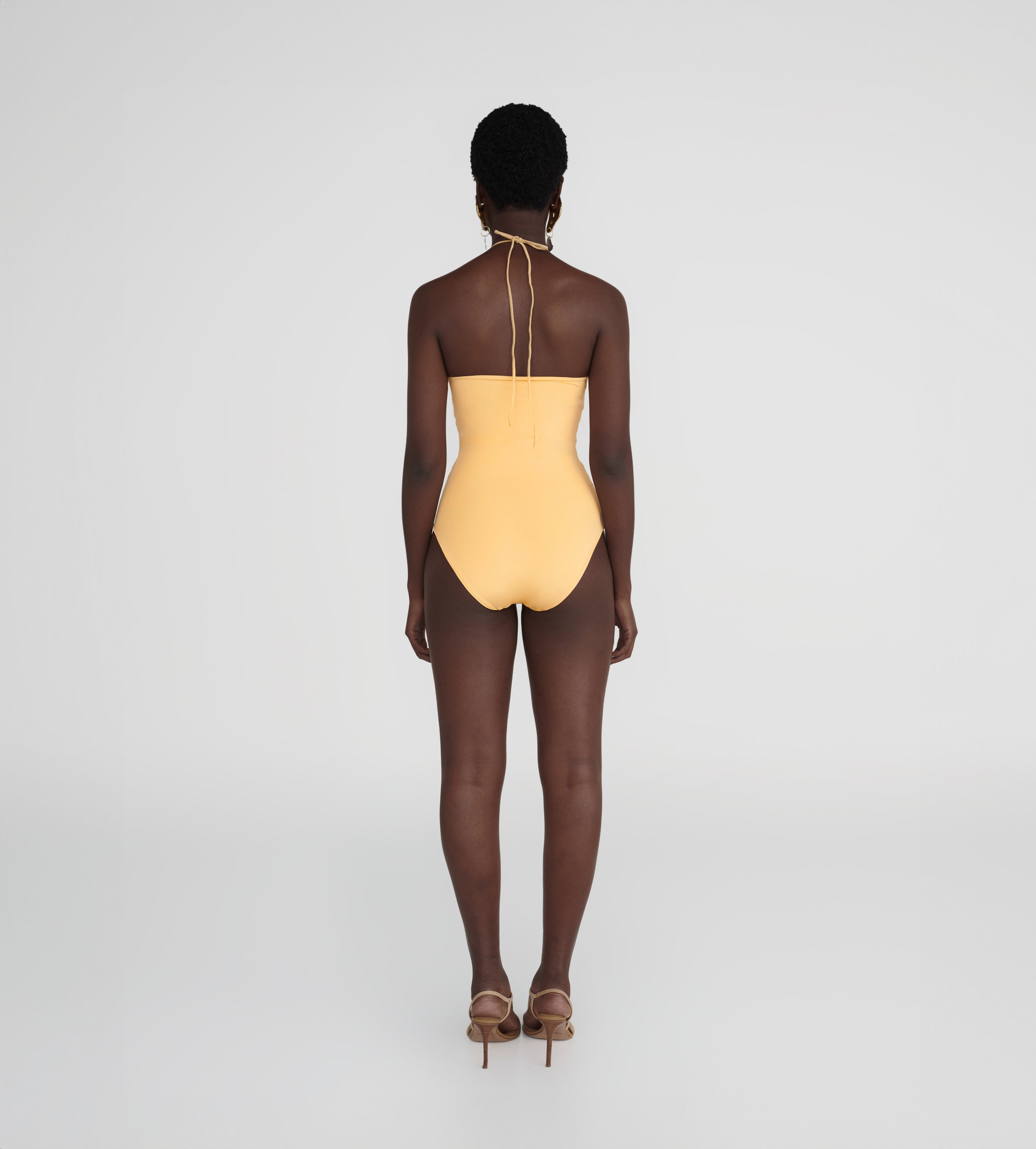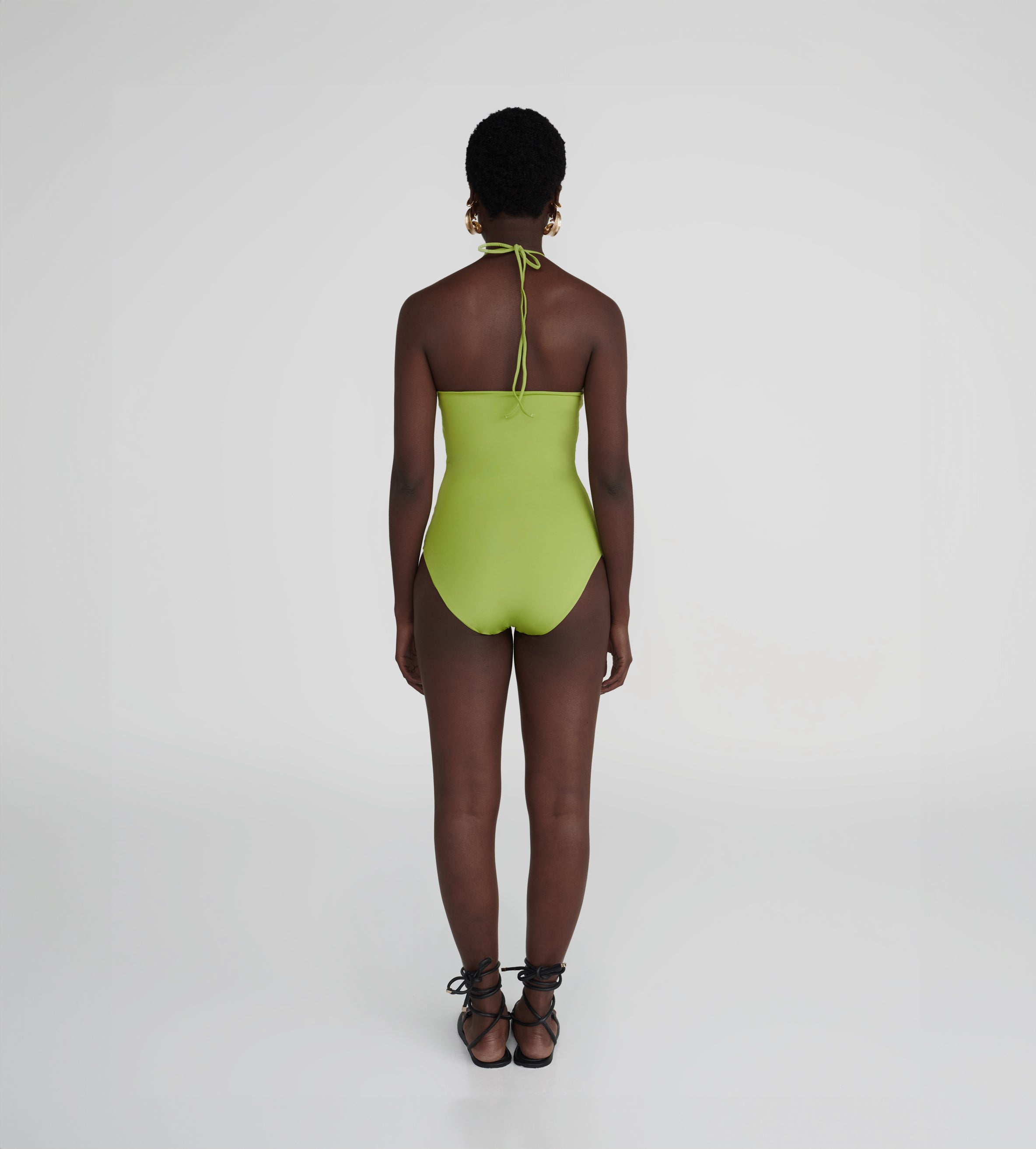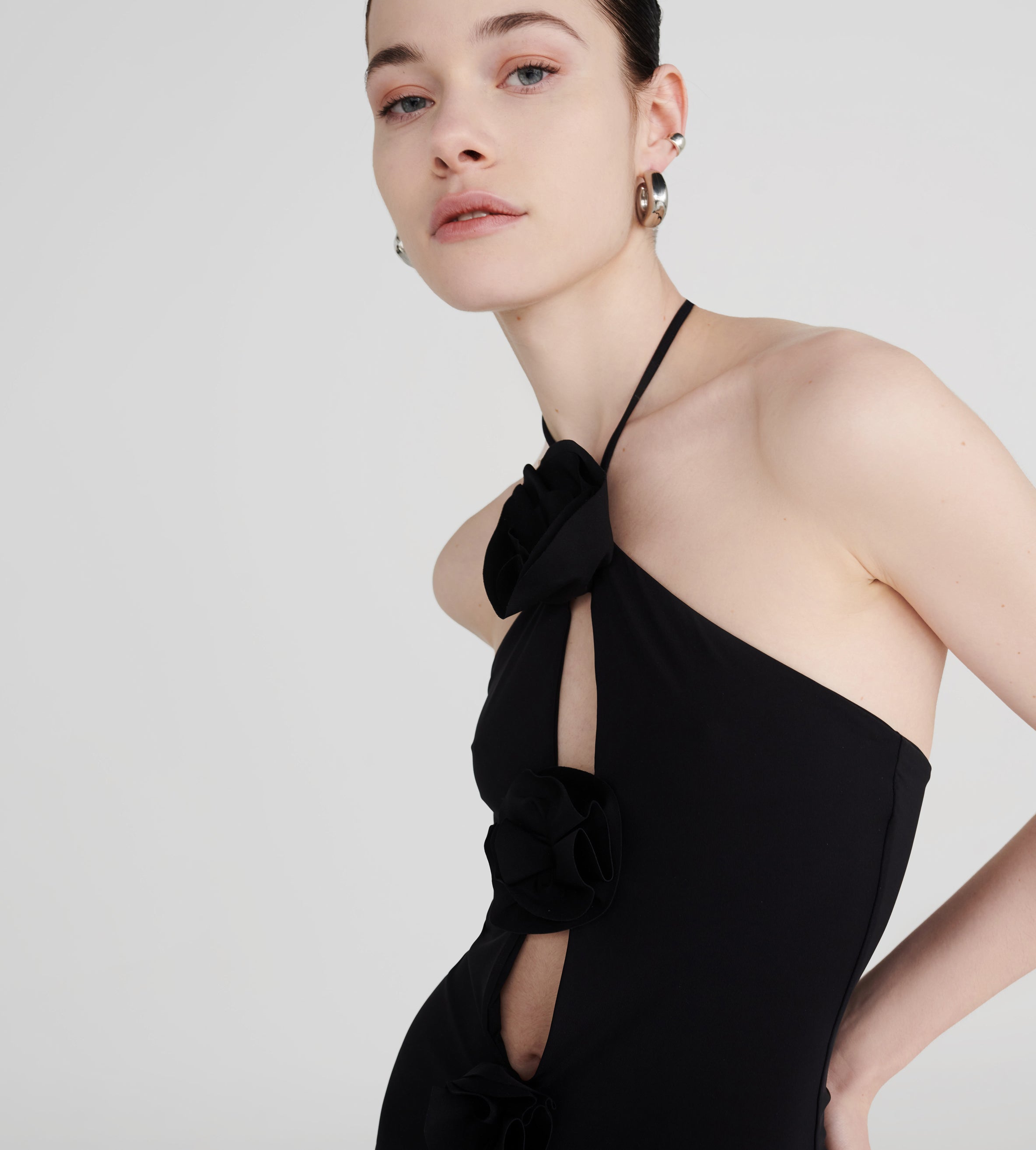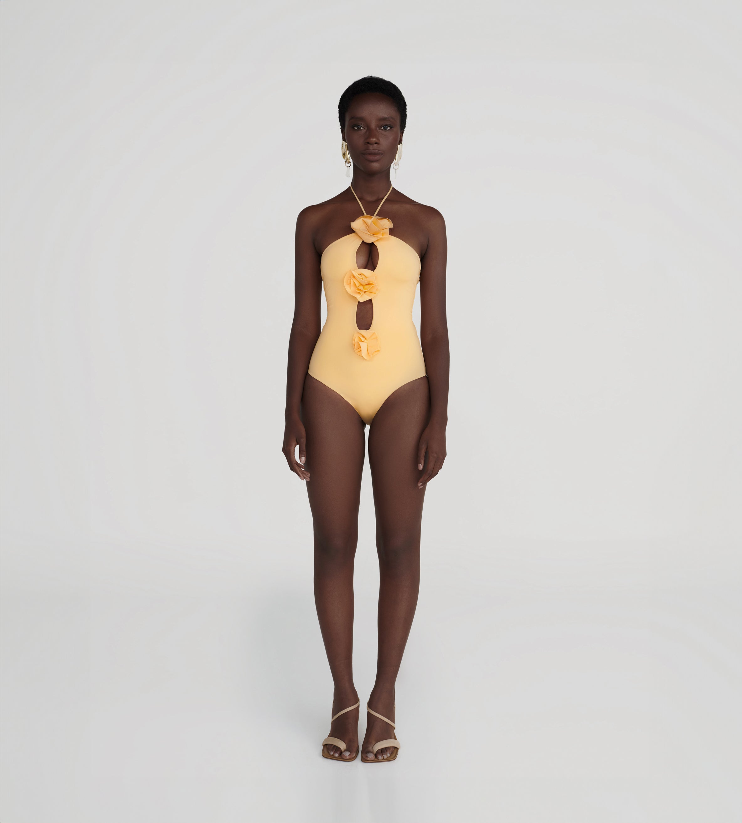 Traje de baño de una pieza con escote tipo halter, lleva aberturas en el delantero acompañadas de detalles florales hechos a mano en diferentes tamaños, la combinación perfecta en un diseño que representa nuestra esencia.