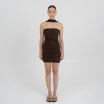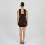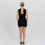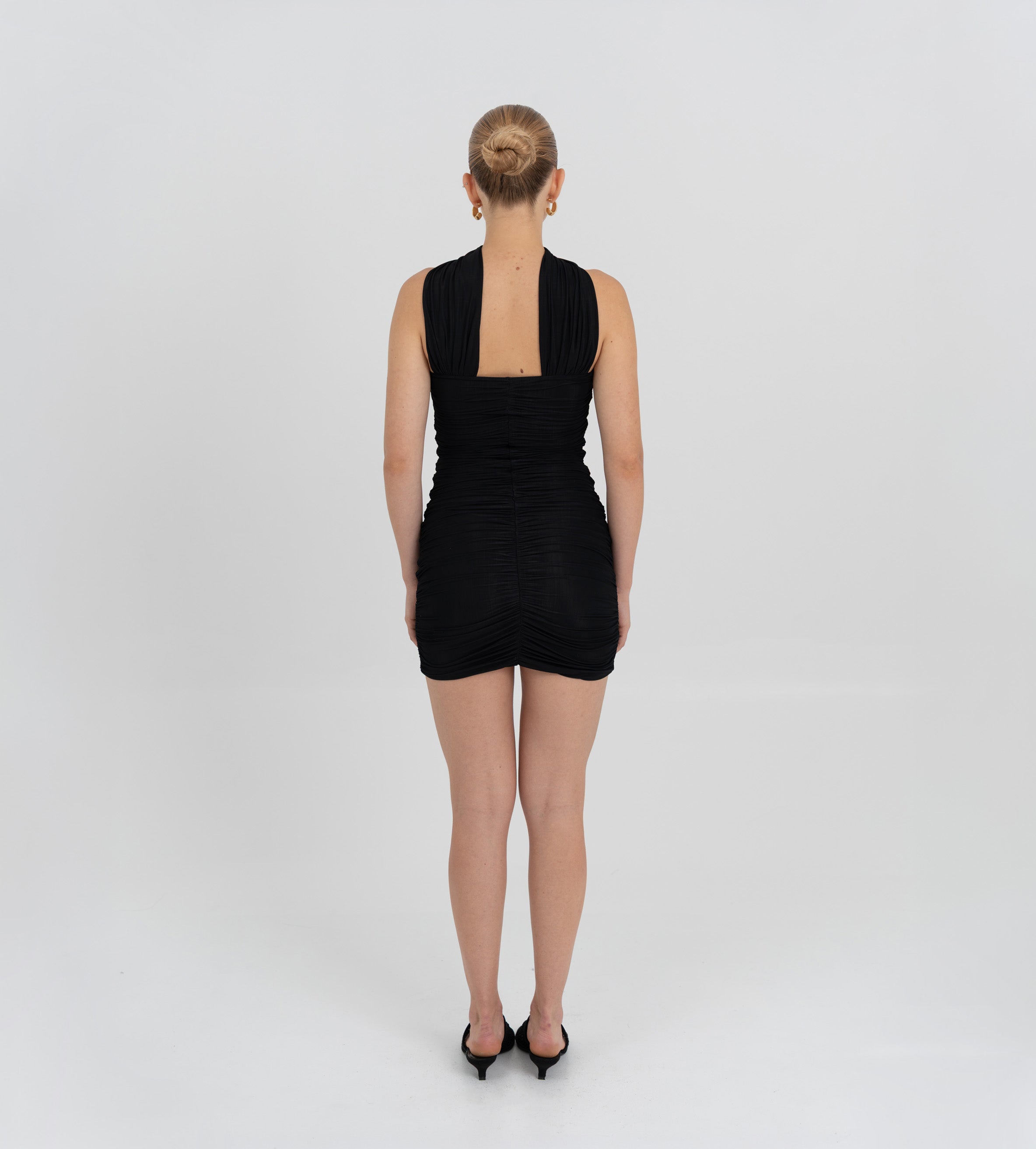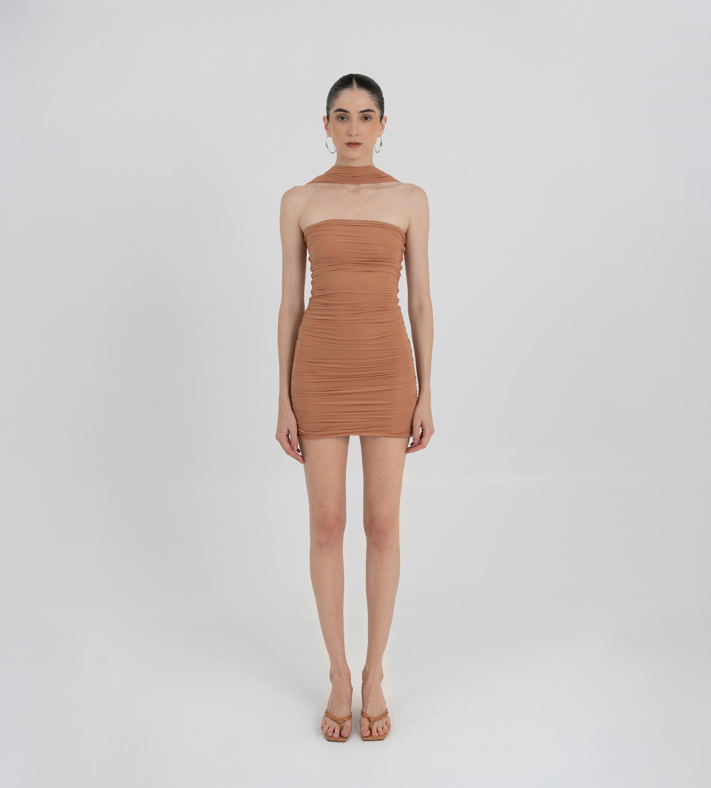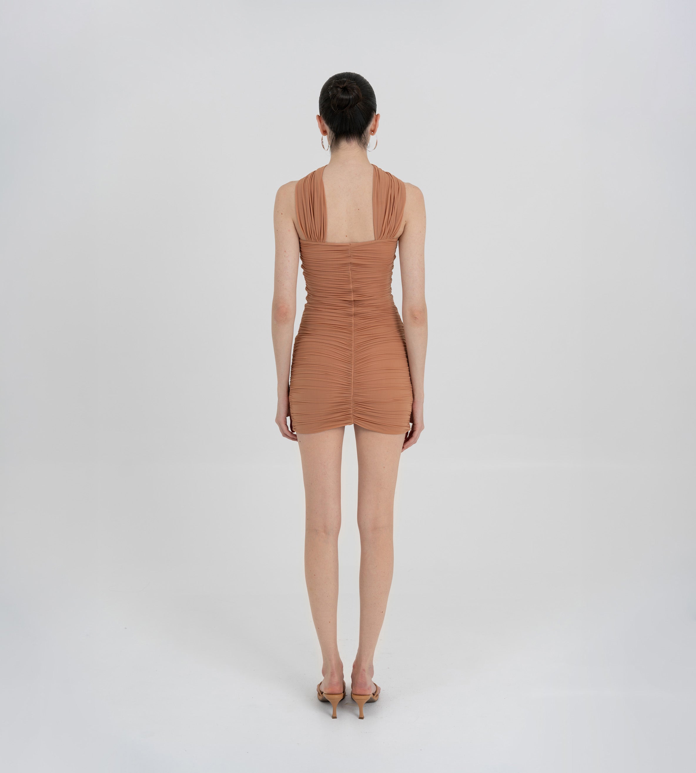 Nuestro vestido mini Gaita presenta una silueta ajustada con fruncidos en el delantero y espalda y lazo/tiras drapeadas que complementan este elegante diseño .