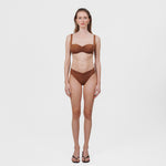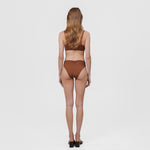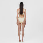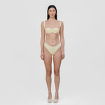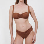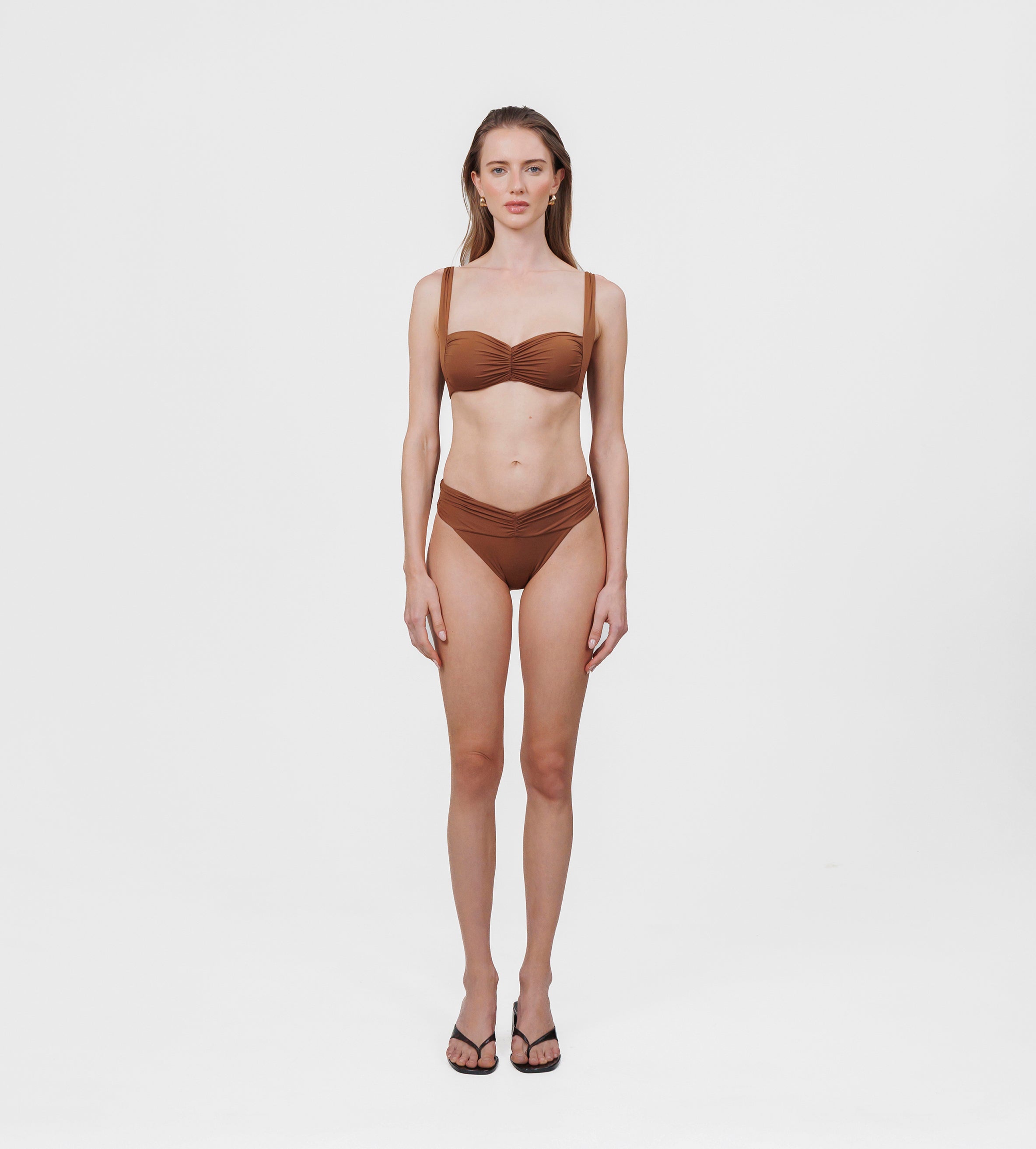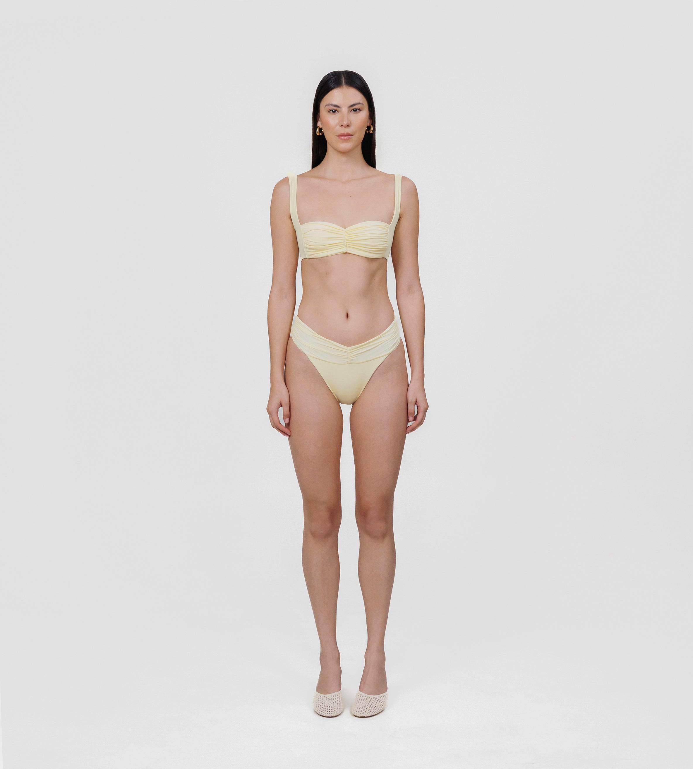 Nuestro traje de baño de dos piezas Guandú presenta un top con fruncido central y un escote en forma de corazón, el cual se ve realzado por tirantes anchos para un ajuste cómodo y atractivo. Se complementa con una parte inferior de talle alto y cobertura media que exhibe un elegante detalle fruncido en el delantero.