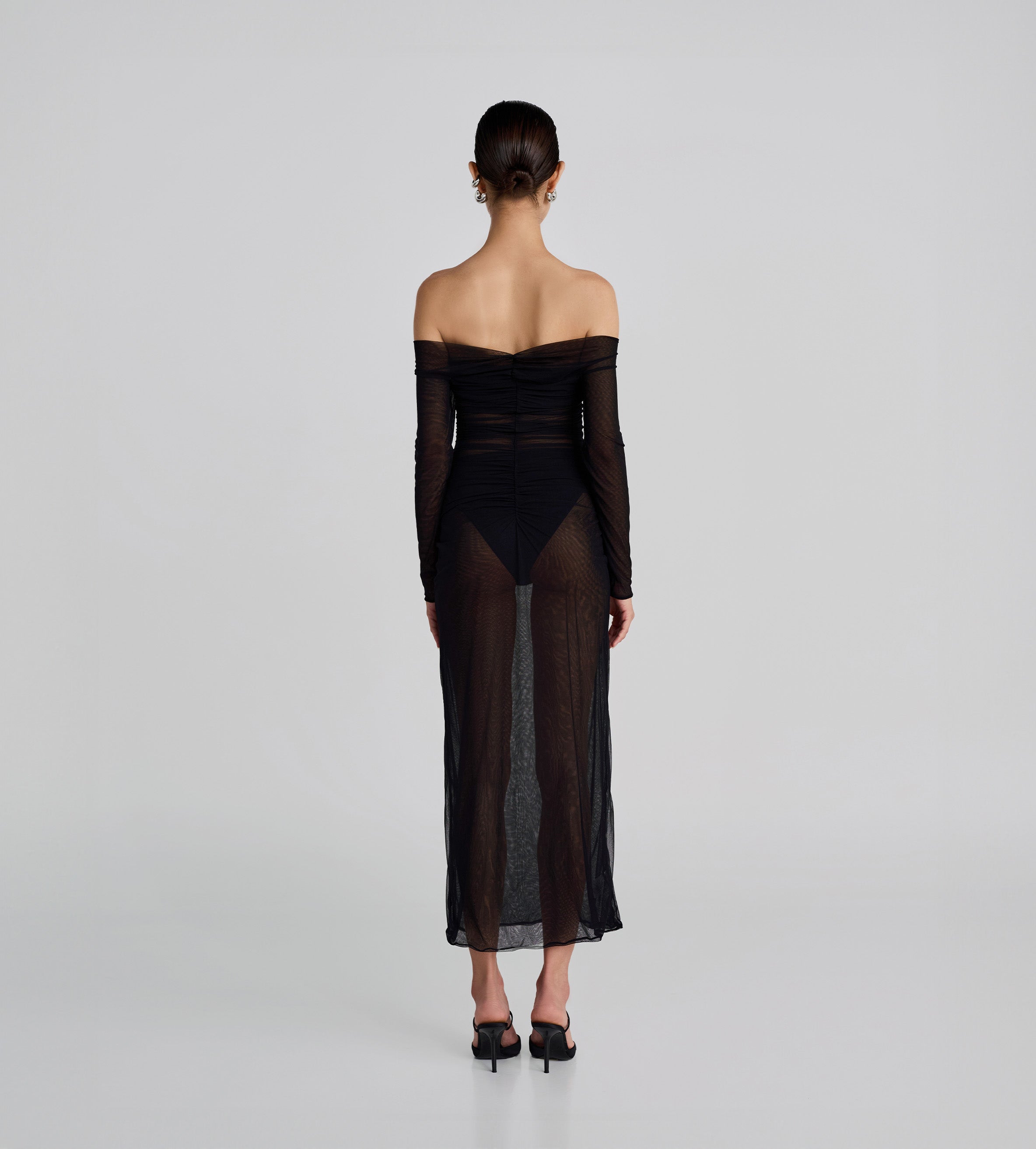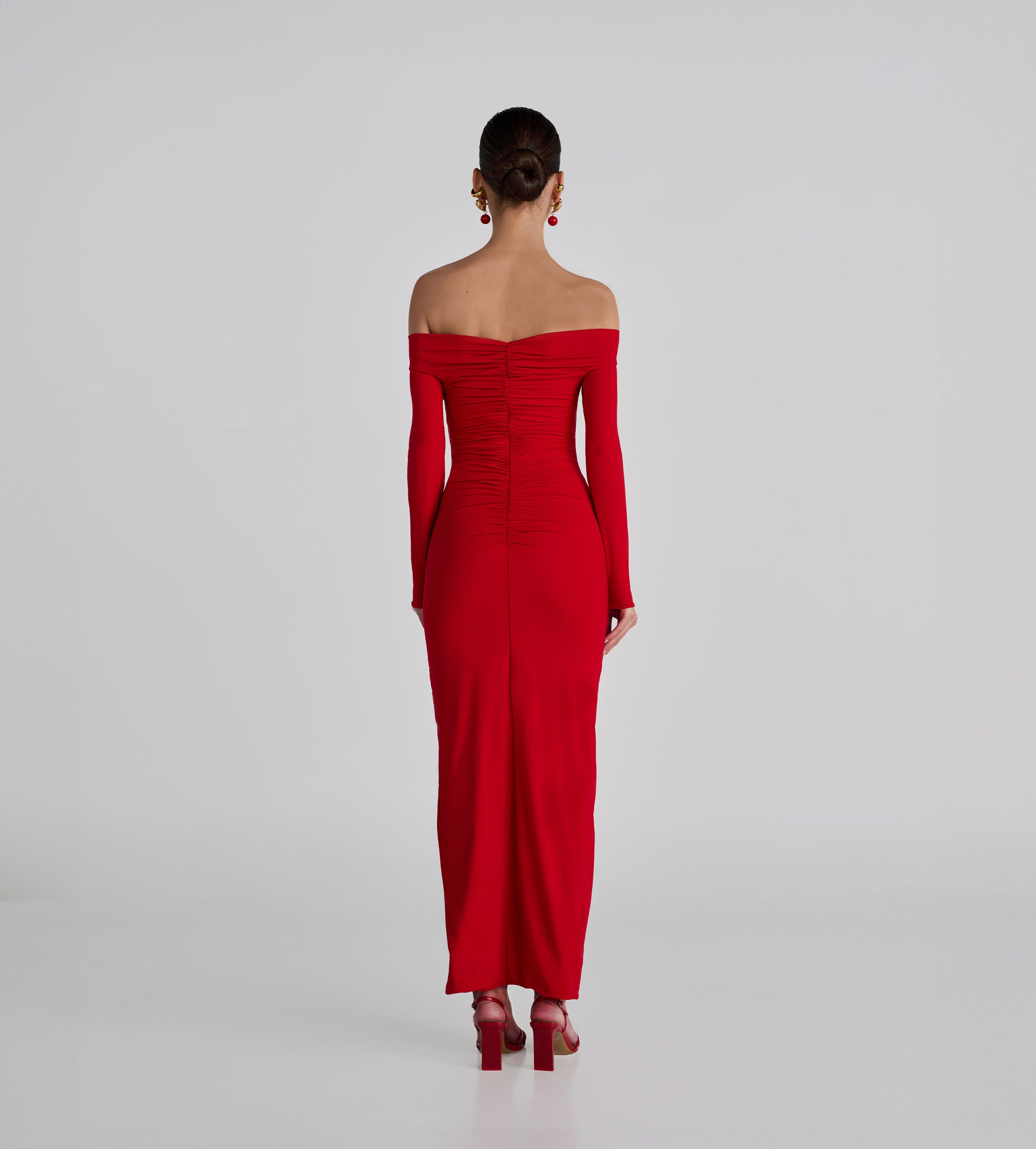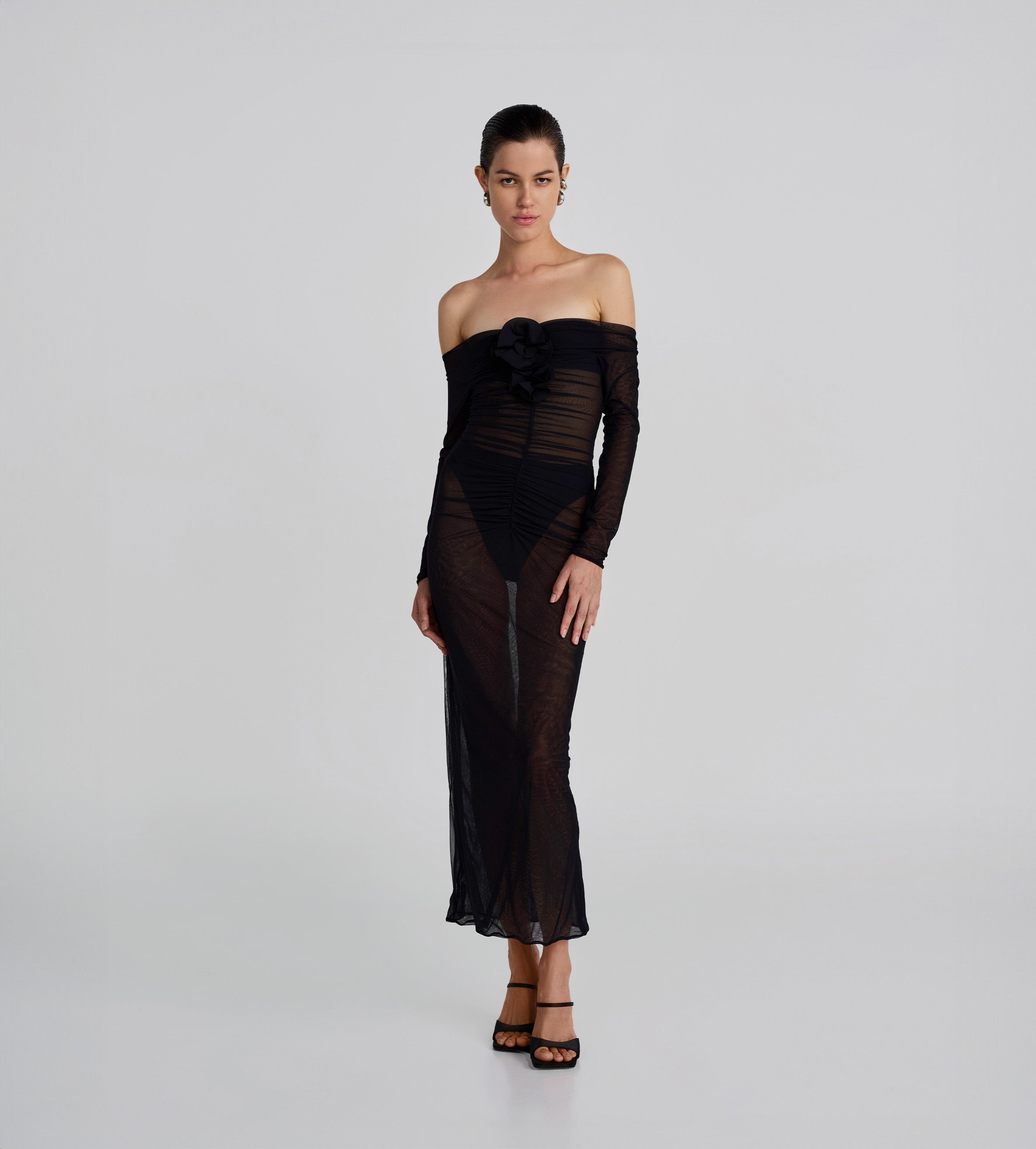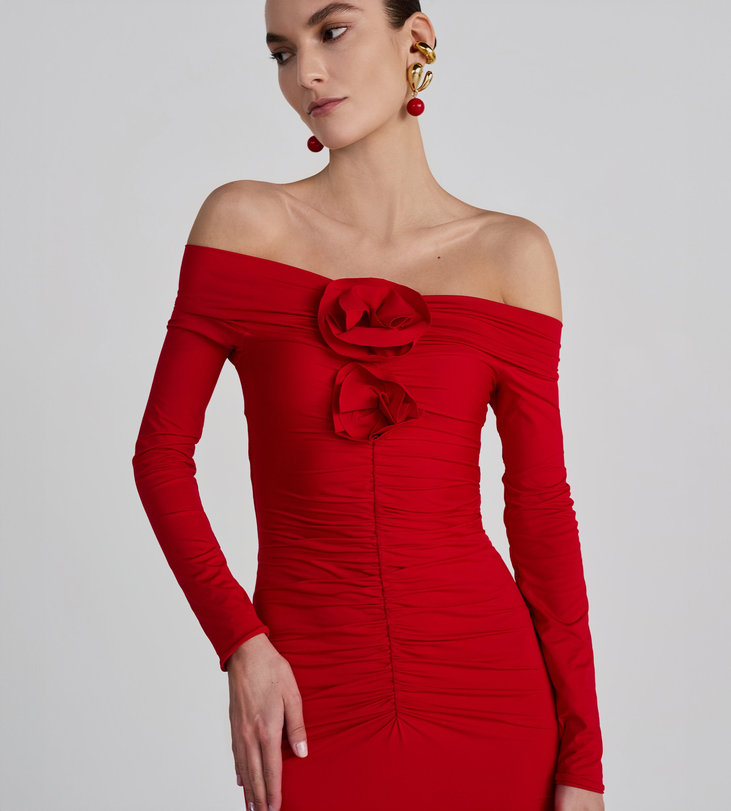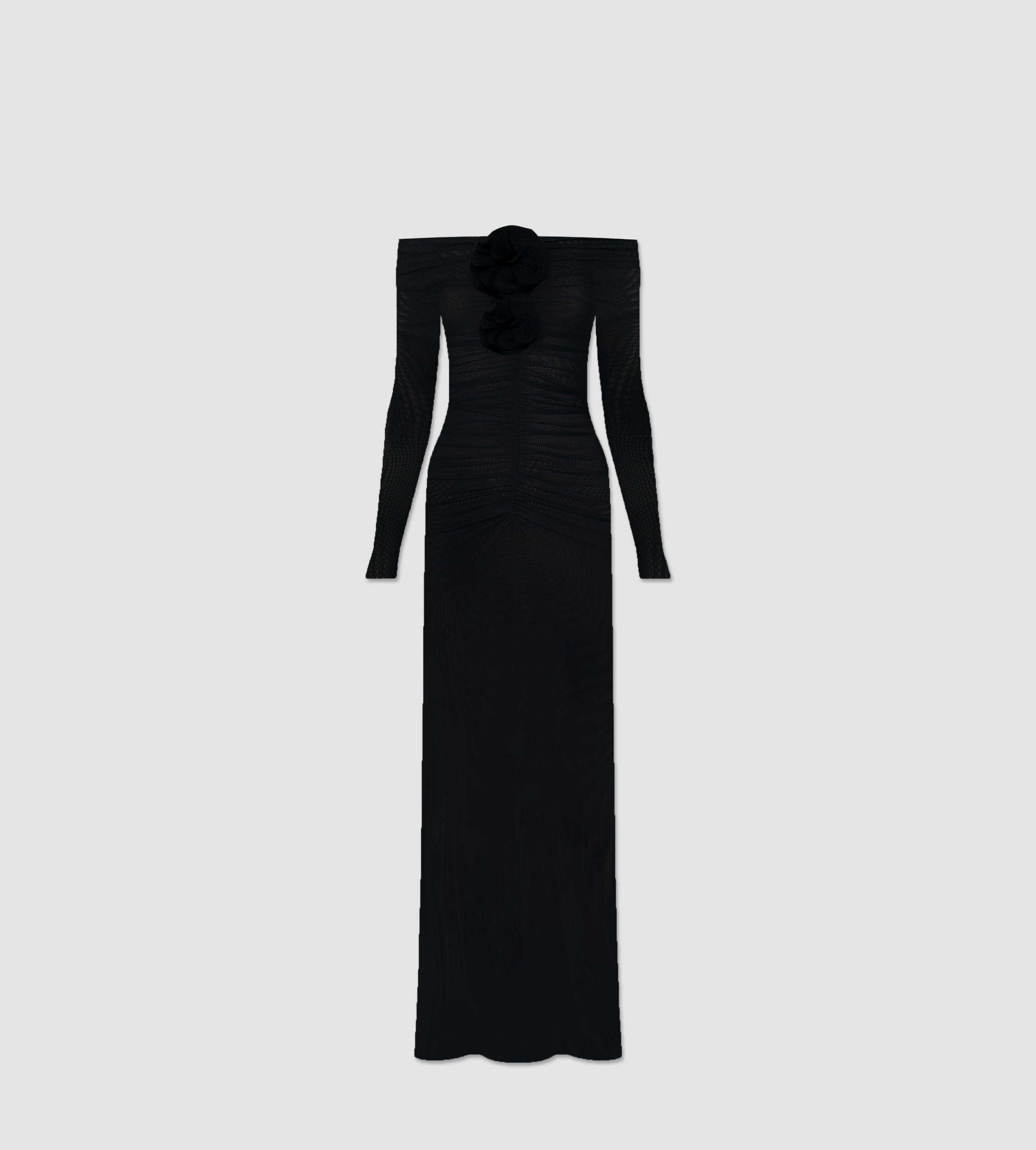 Vestido largo coqueto y con hombros descubiertos, mangas largas, detalles fruncidos en el delantero y en la espalda que realzan las curvas del cuerpo, adornado con dos detalles florales hechos a mano. El vestido que has estado deseando para este verano.