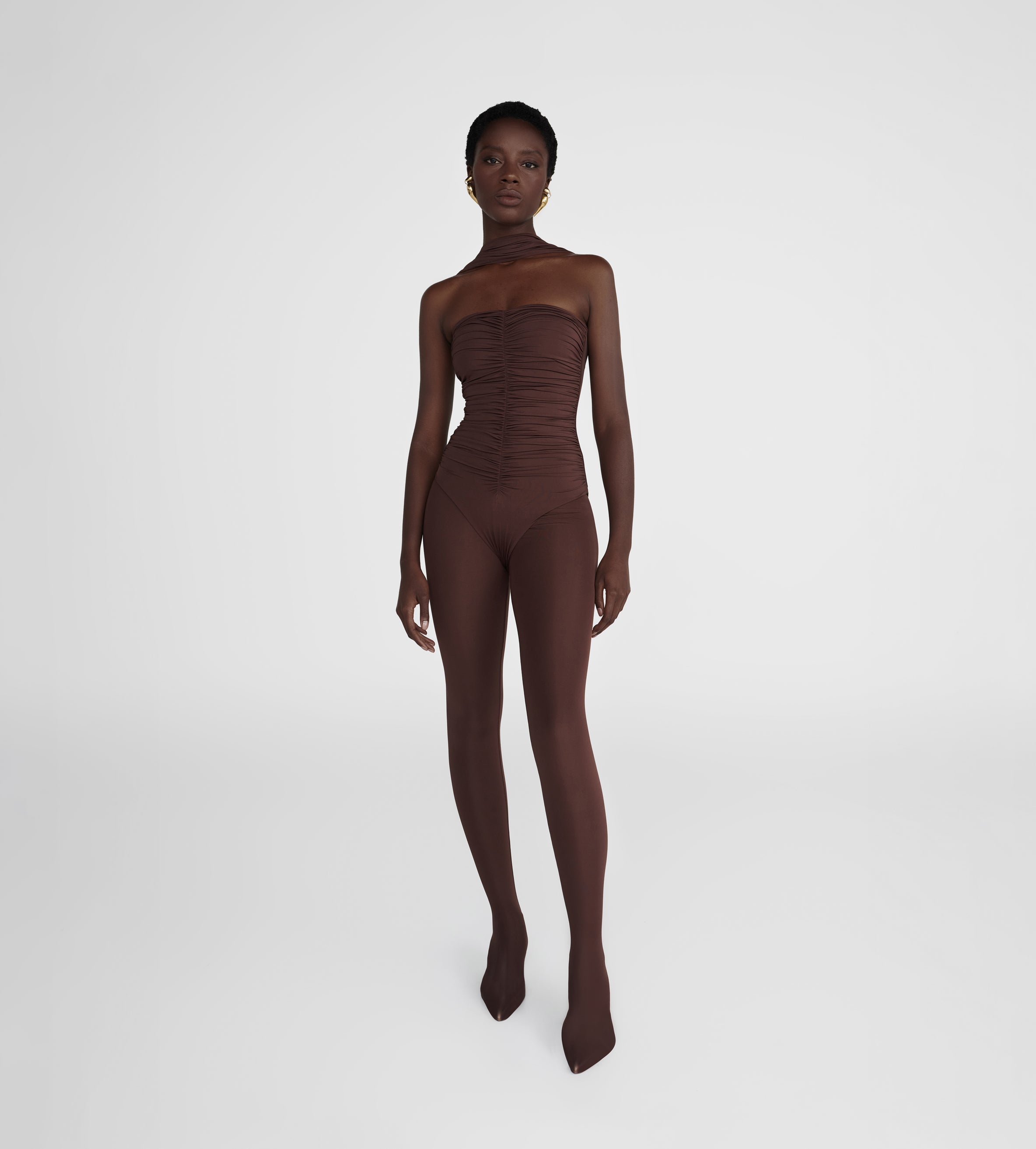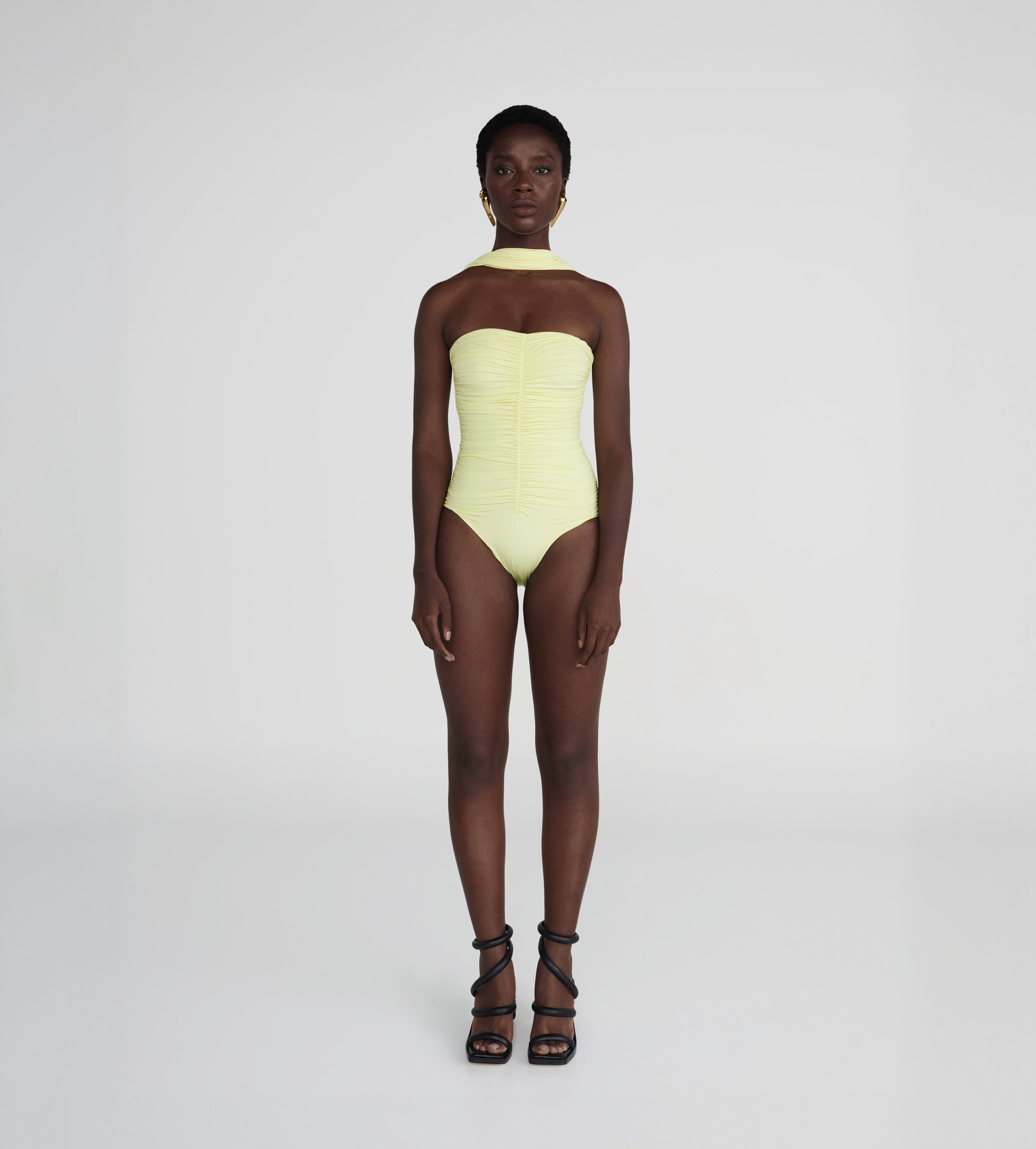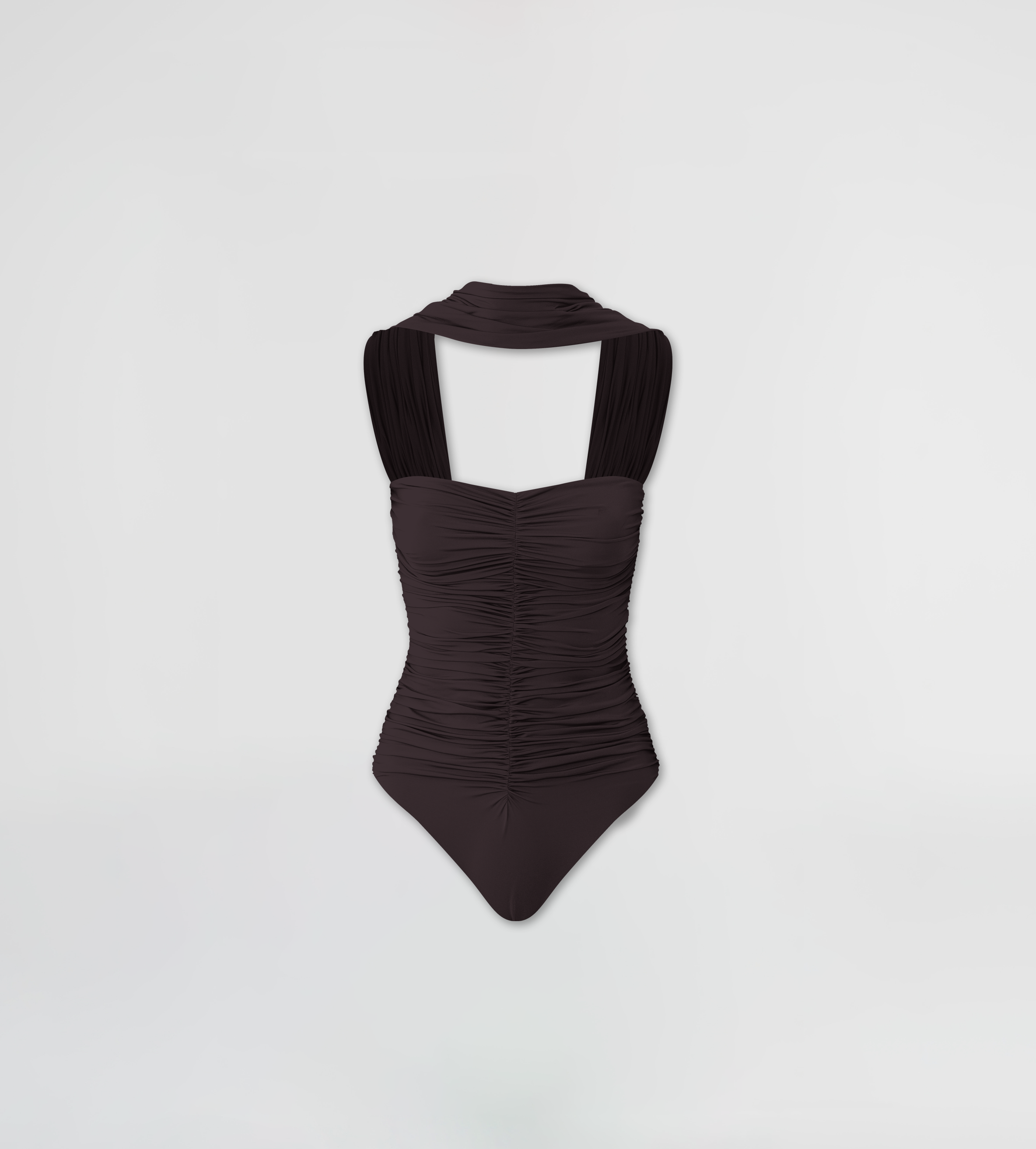 Traje de baño de una pieza con escote en forma de corazón, detalles de fruncidos sobre el cuerpo que resaltan las curvas de cada mujer y se complementa con un lazo fruncido que representa el anhelo de los días bajo el sol.