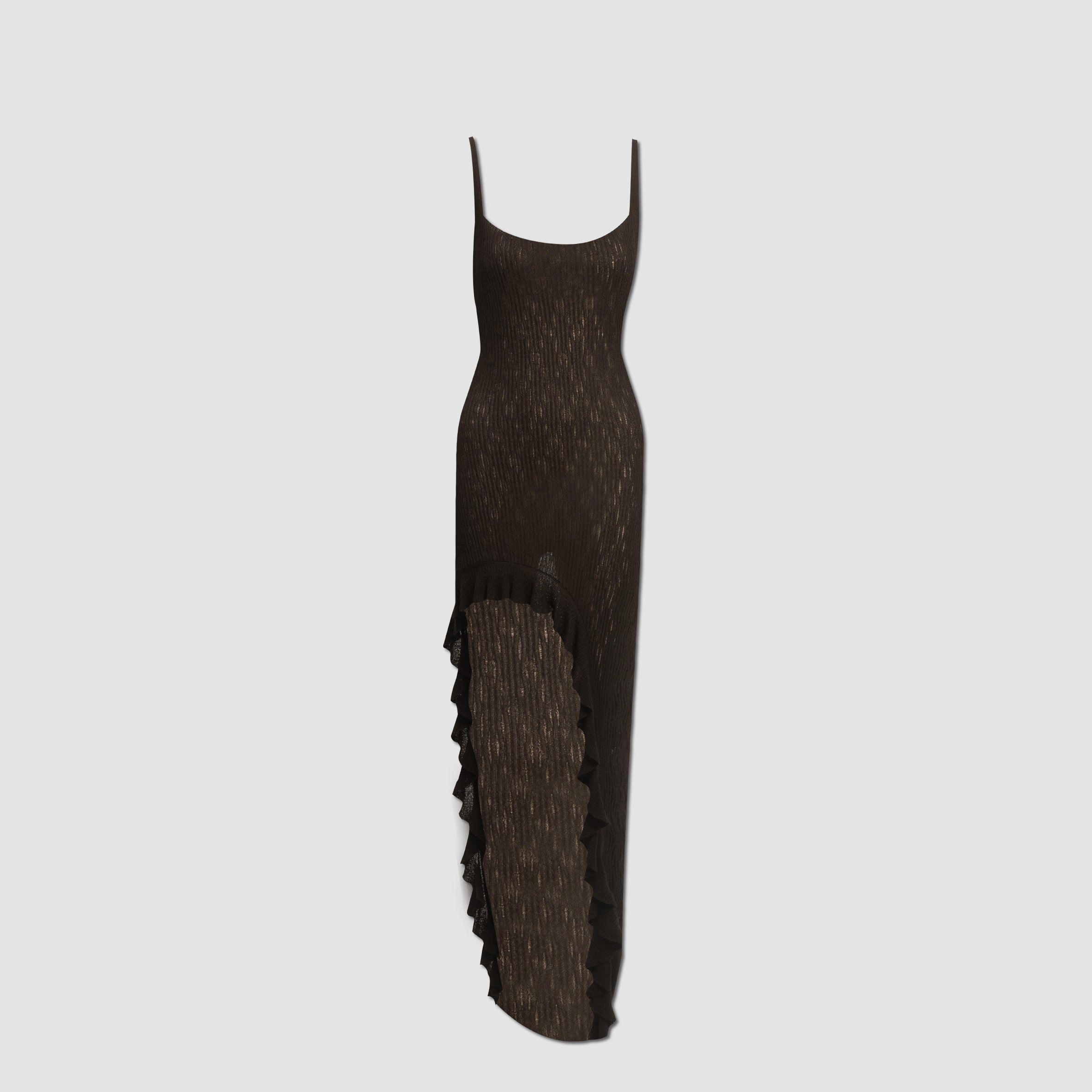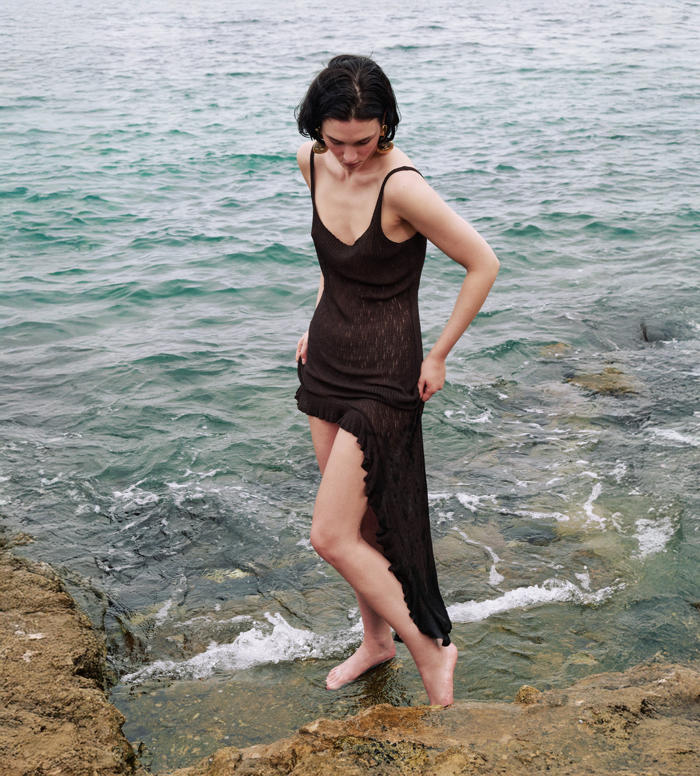 Nuestro vestido Isla Bonita presenta un elegante escote redondo con delicados tirantes y una silueta ajustada que fluye suavemente hacia una falda asimétrica que cae en cascada. Confeccionado en un tejido de punto italiano estructurado, crea una caída dramática y presenta un diseño elegante con movimiento.