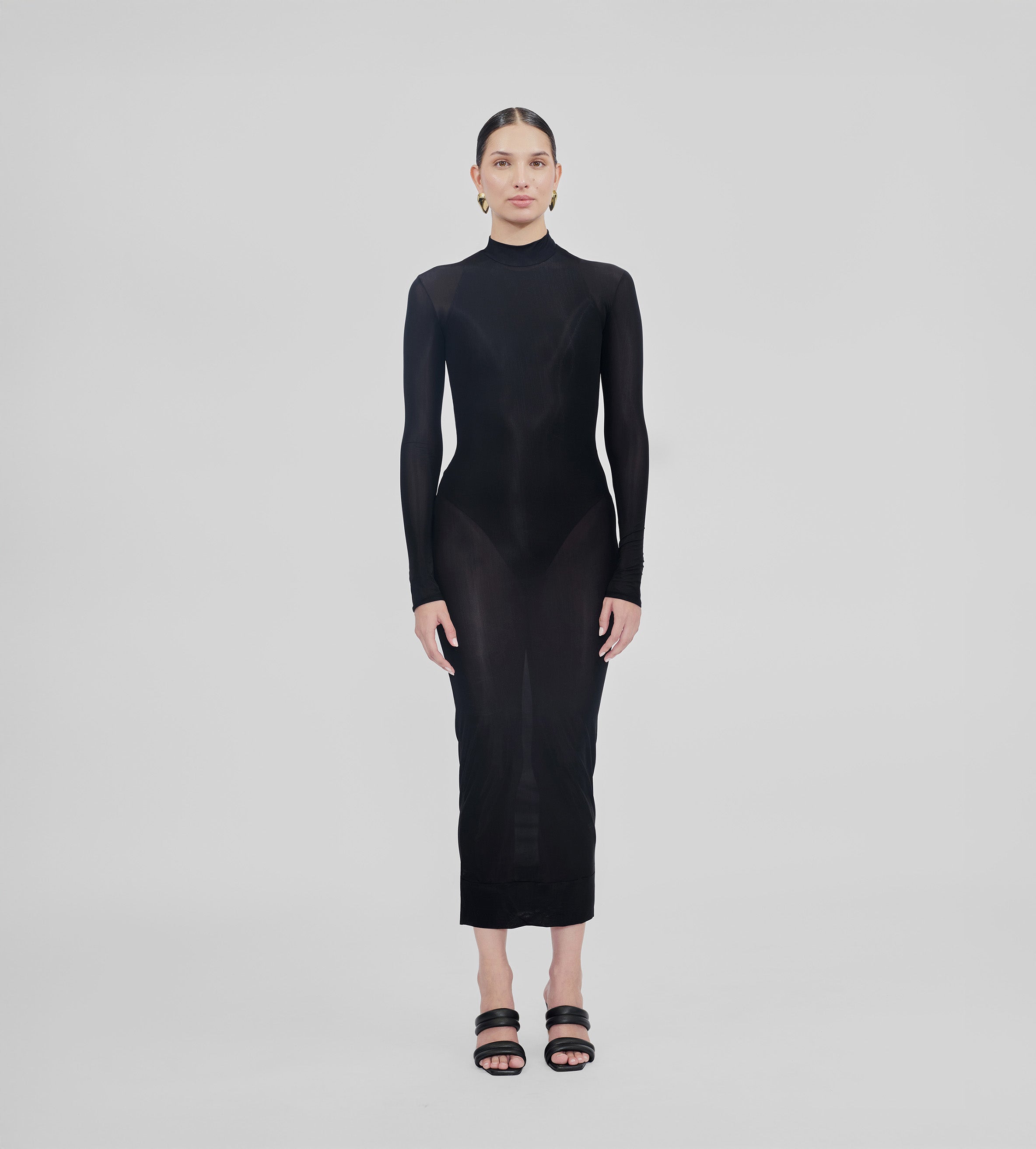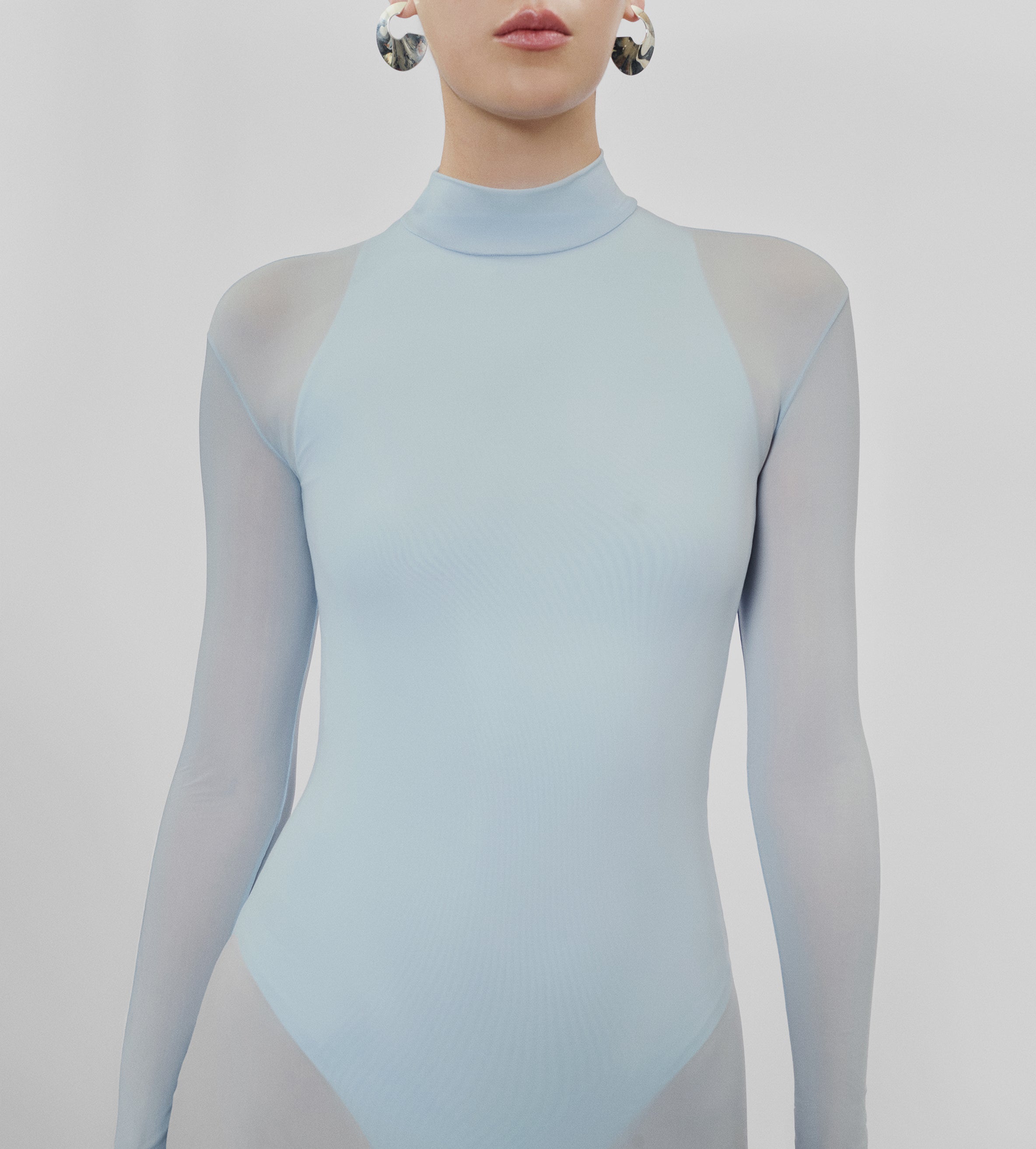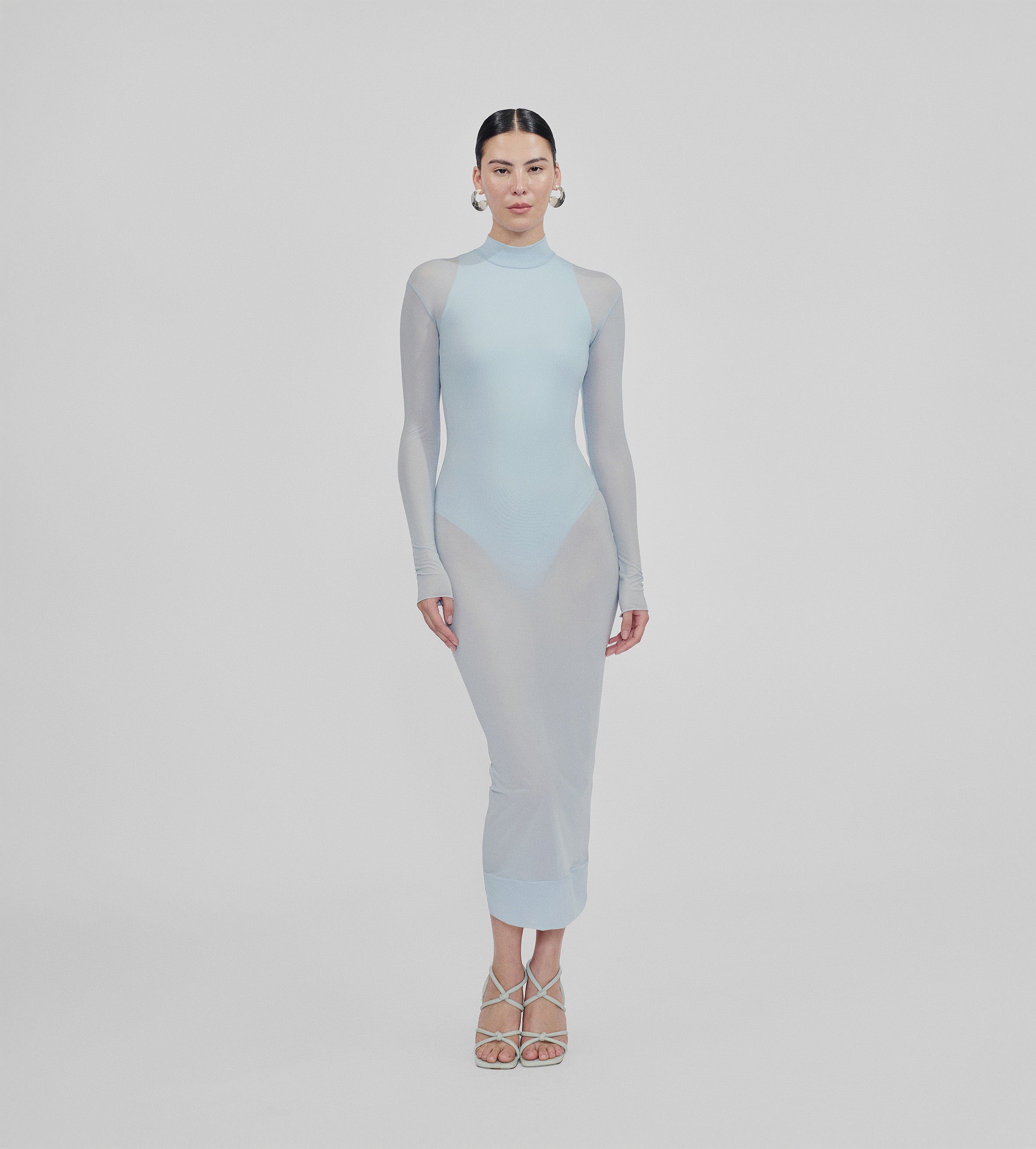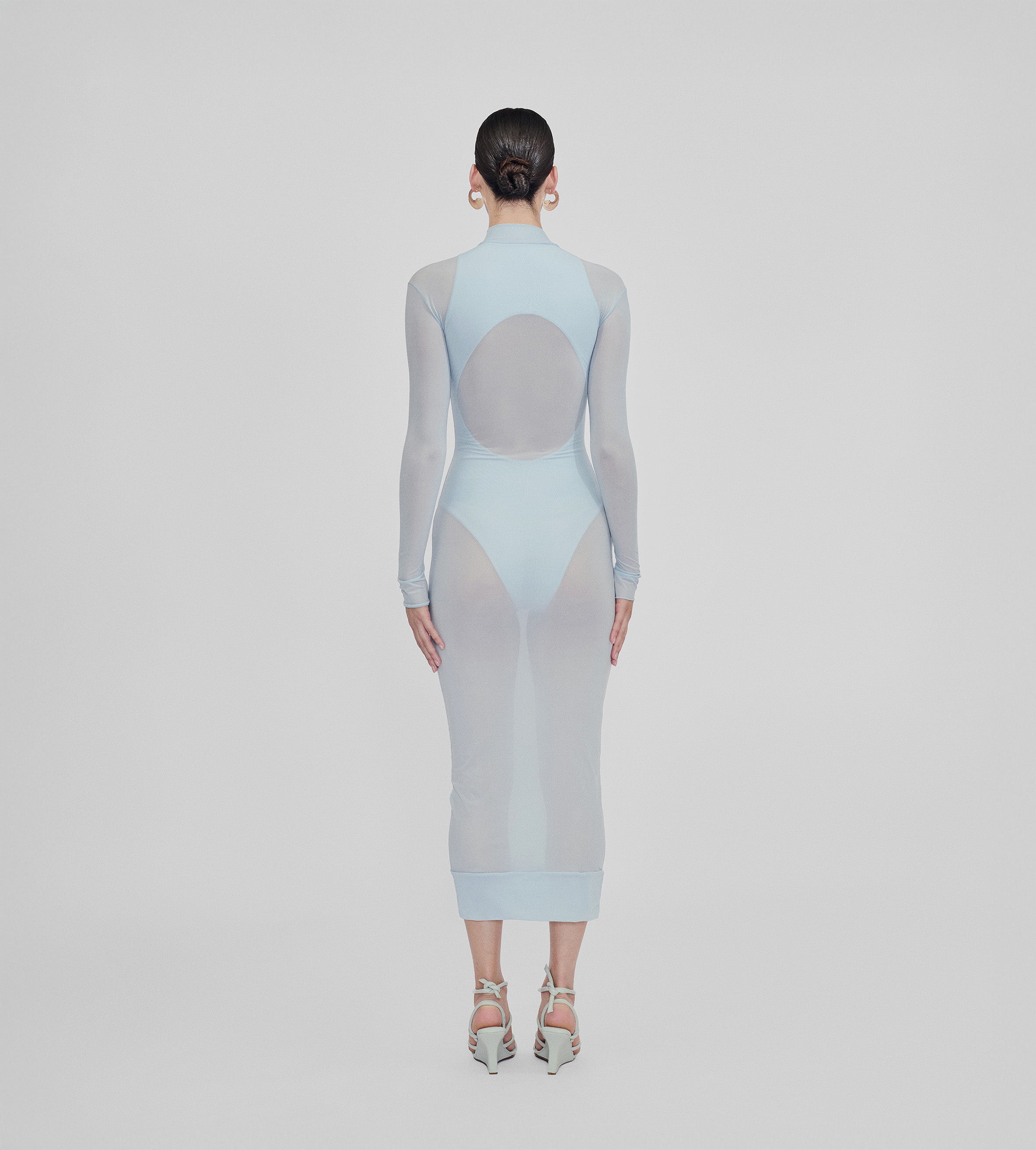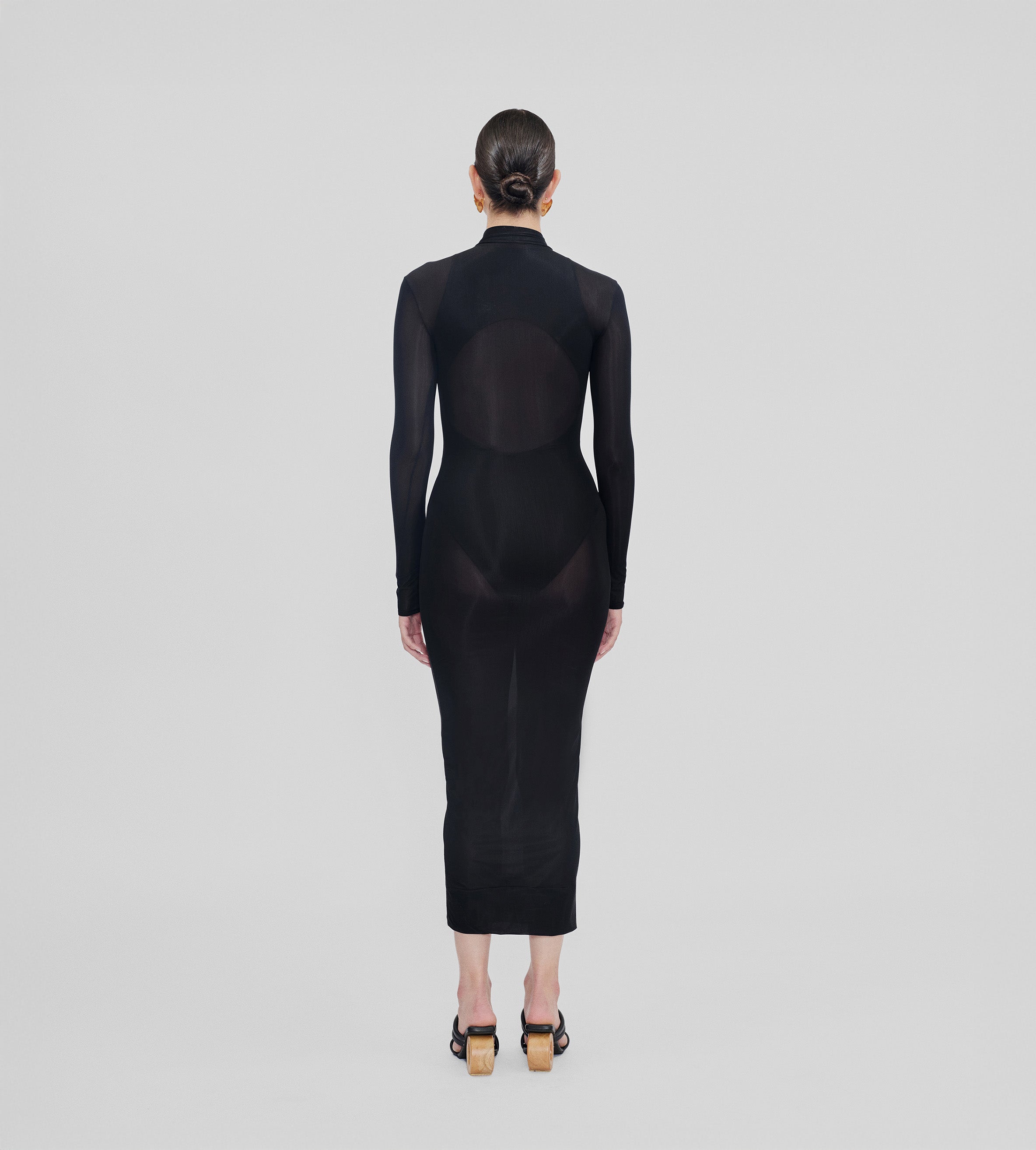 Nuestro vestido Jacaranda combina un sensual body con un vestido semitransparente que presenta una espalda descubierta, un elegante cuello alto, mangas largas y un ajuste tipo segunda piel. Combina nuestros dos tejidos insignia, es una fusión perfecta de diseño moderno y atractivo atemporal.