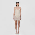 El mini vestido Jacinto presenta un escote redondeado con delicados tirantes finos, ofreciendo un toque elegante y femenino. Confeccionado en nuestra lycra semitransparente, con un body interno que crea una silueta perfecta y un ajuste que realza la figura.