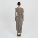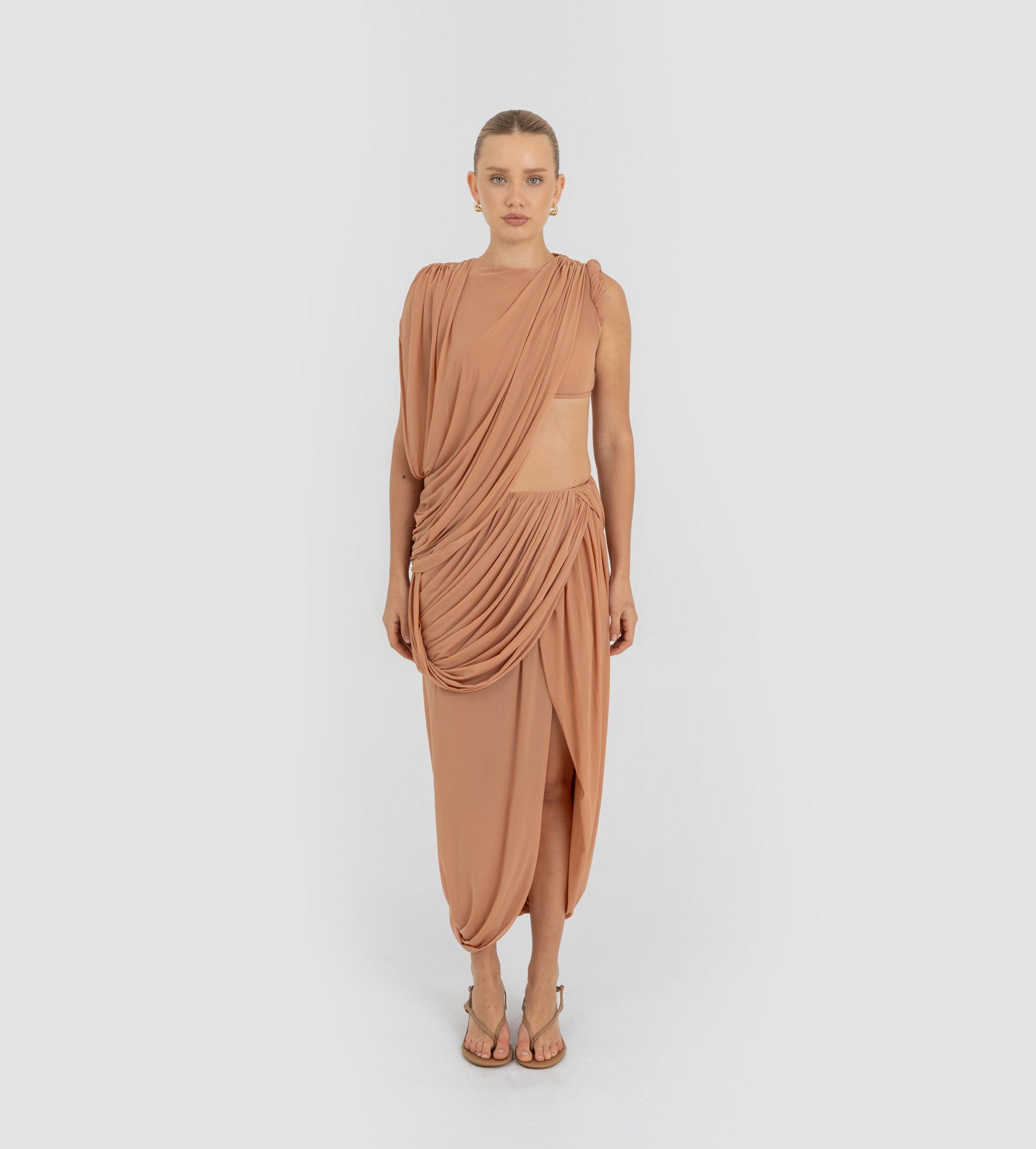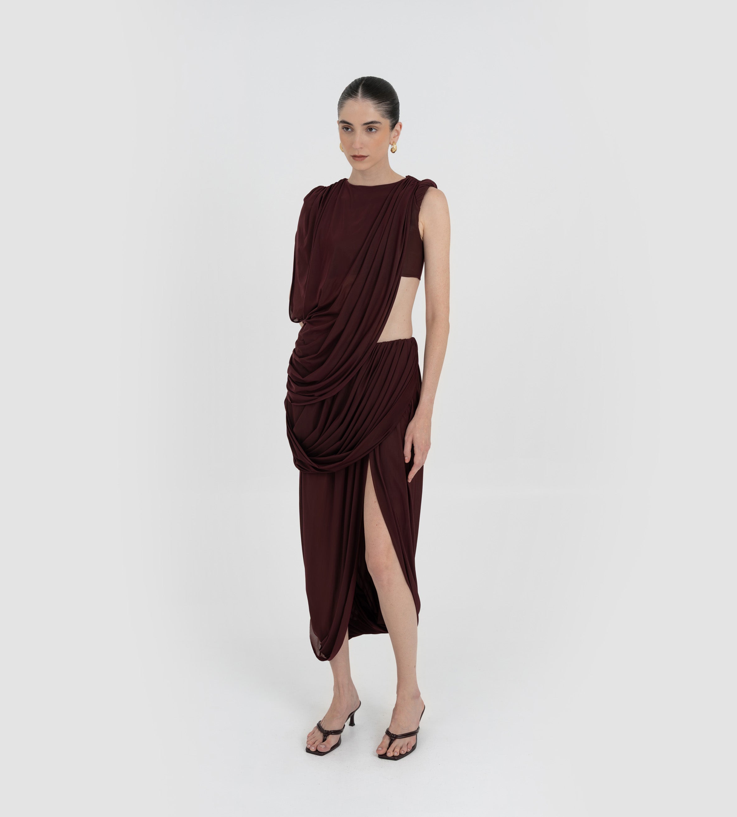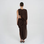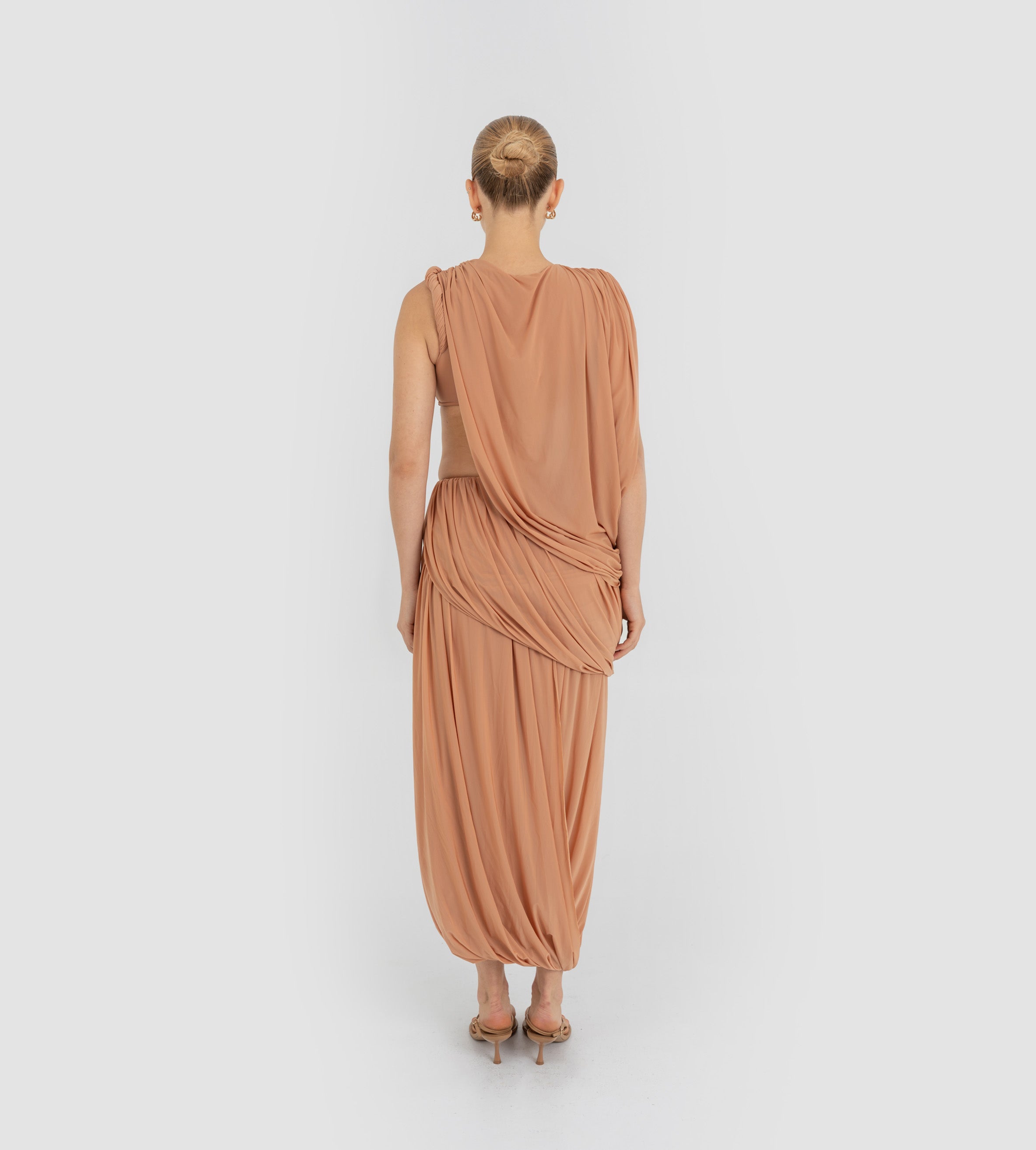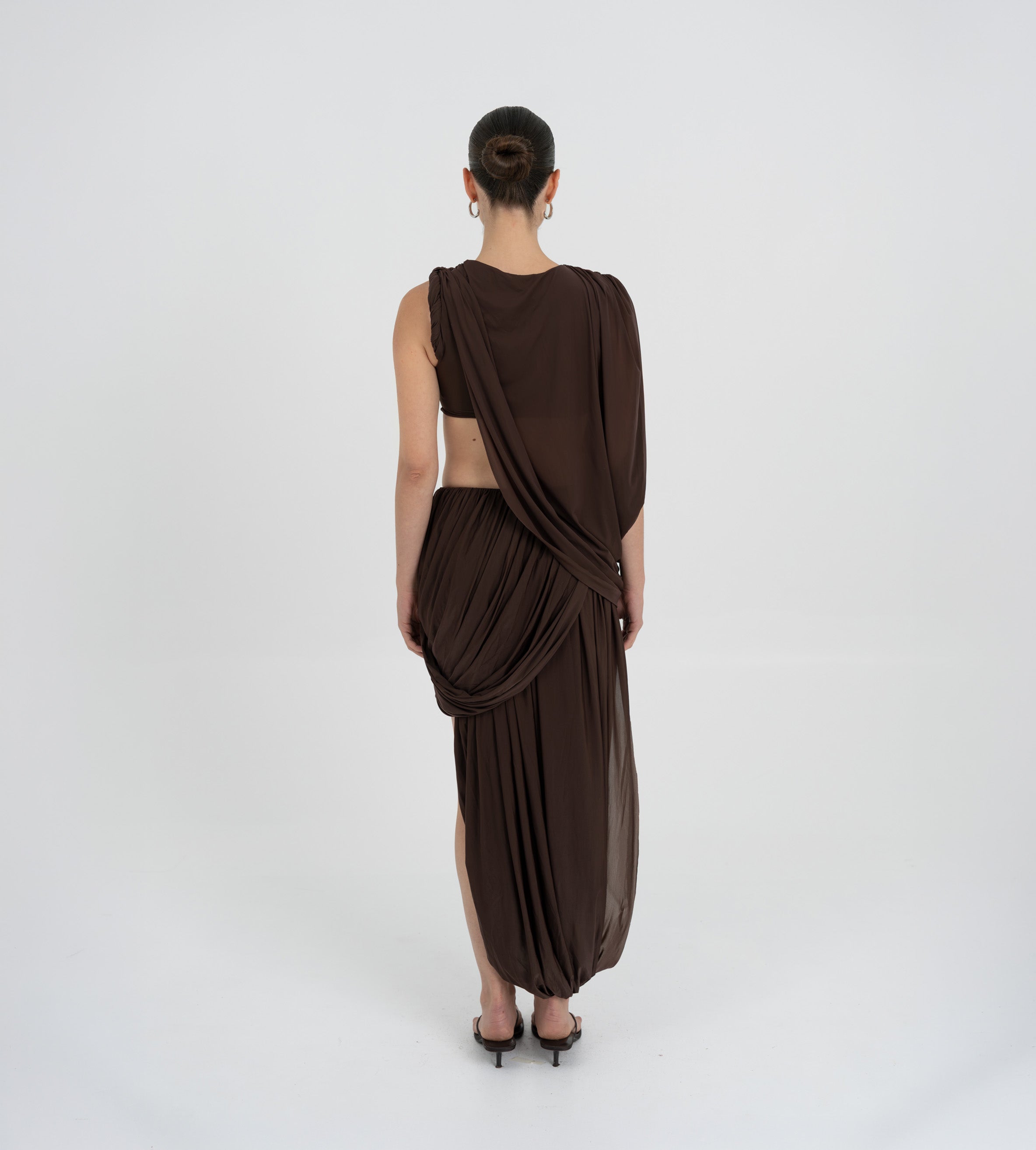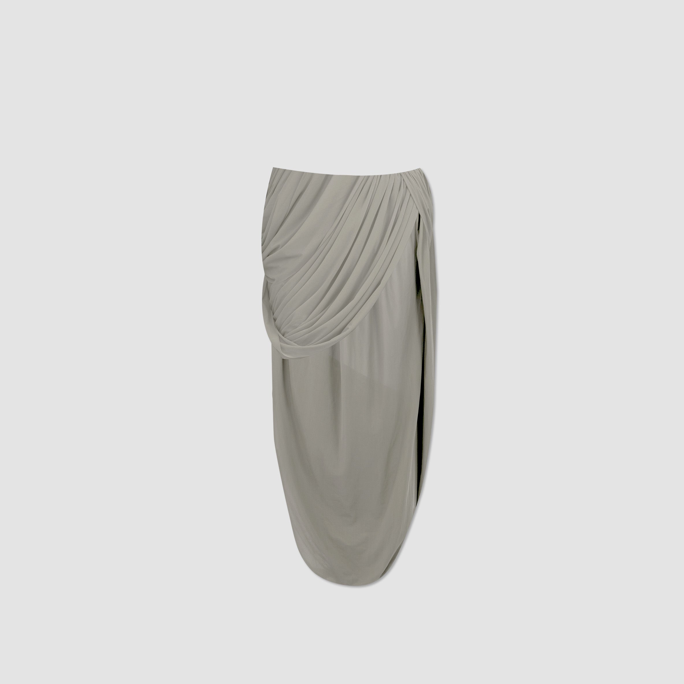 Nuestra falda León presenta un largo midi, con talle bajo compuesta de dos capas asimétricas con drapeado entorchado sobre el dobladillo, creando profundidad, movimiento y una silueta impactante.