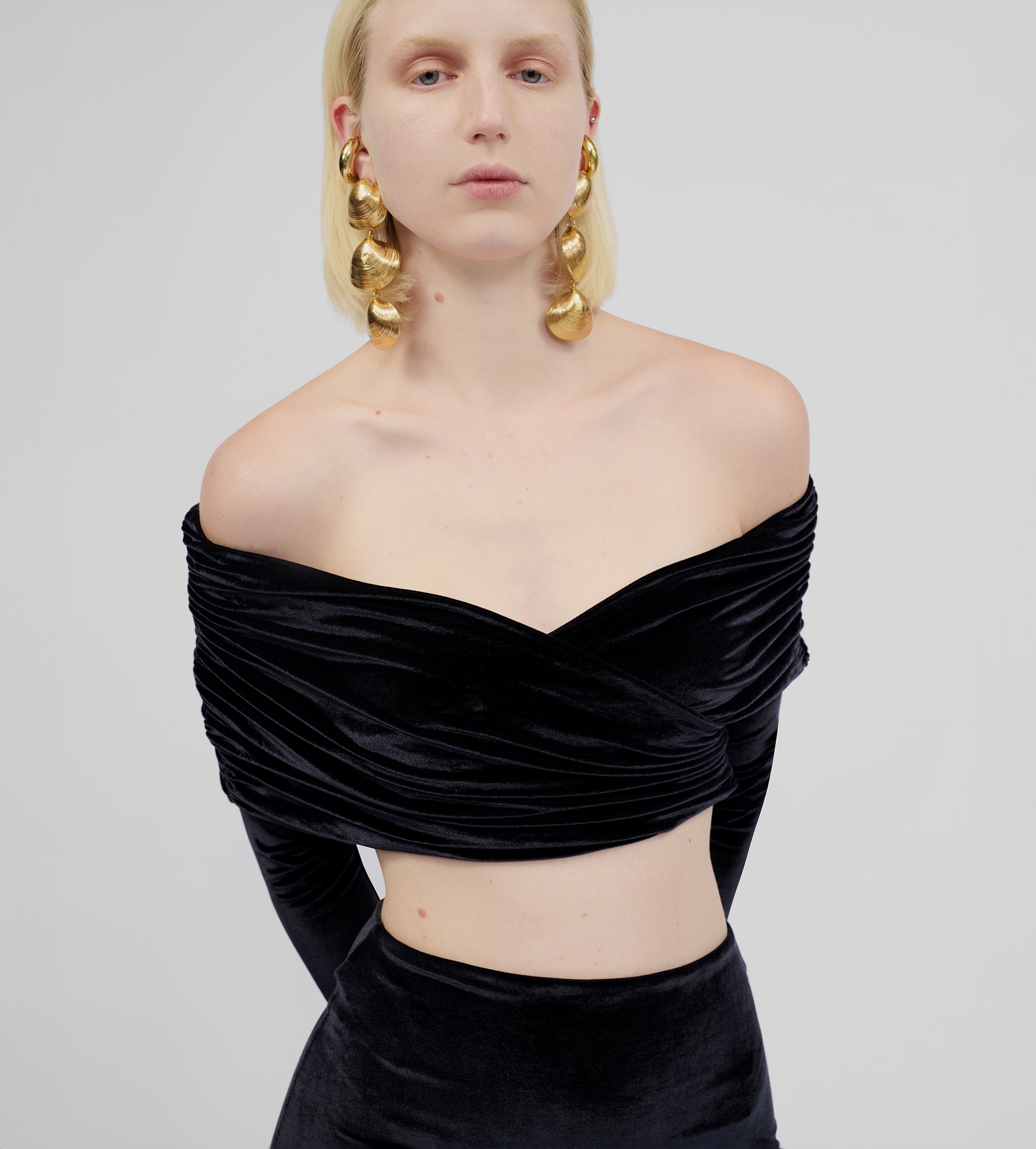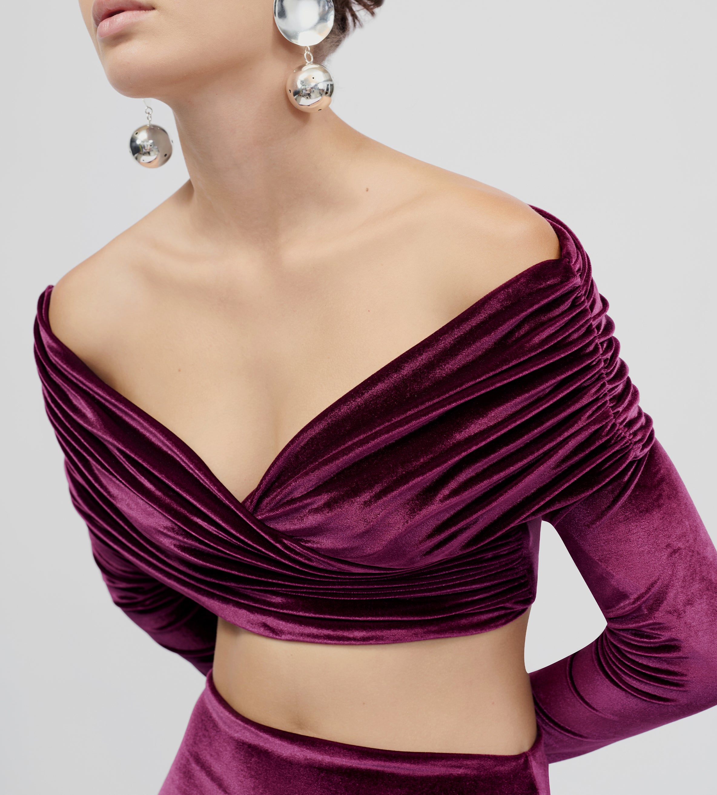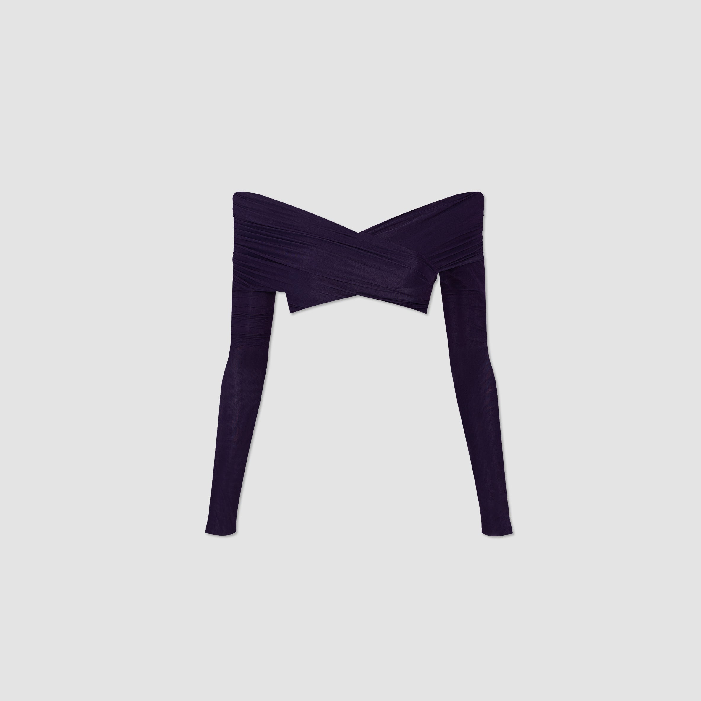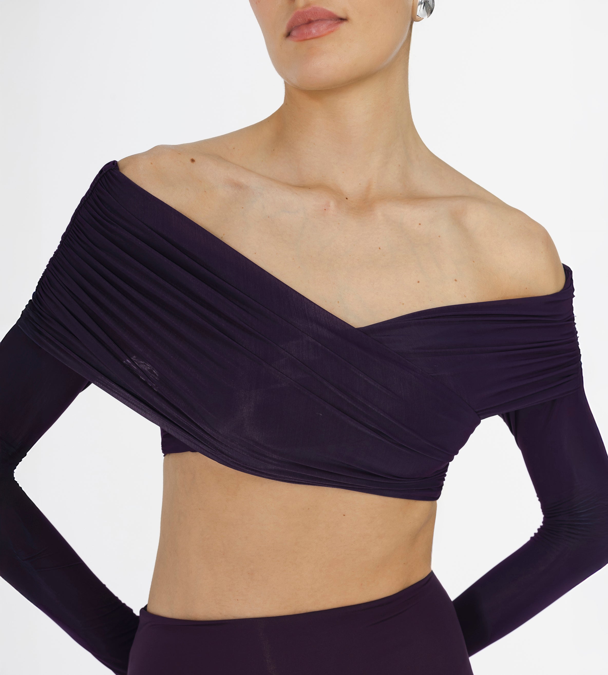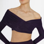 Top de hombros descubiertos con detalles fruncidos envolventes, escote tipo