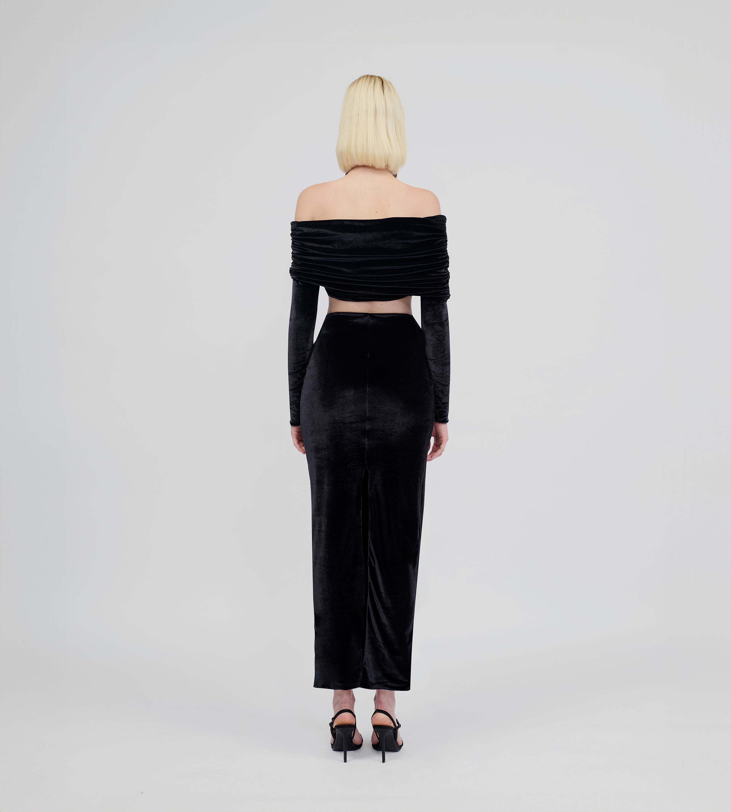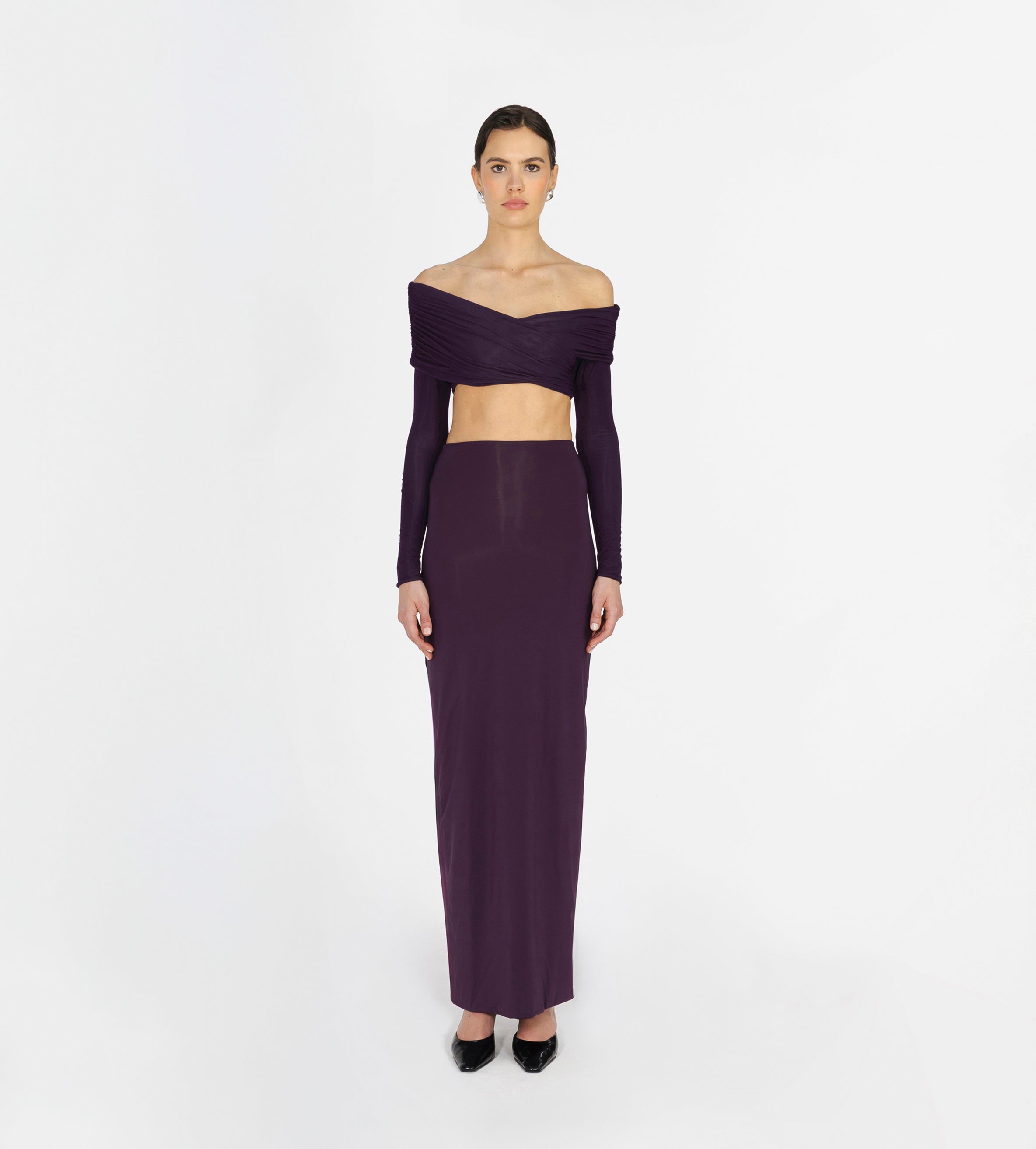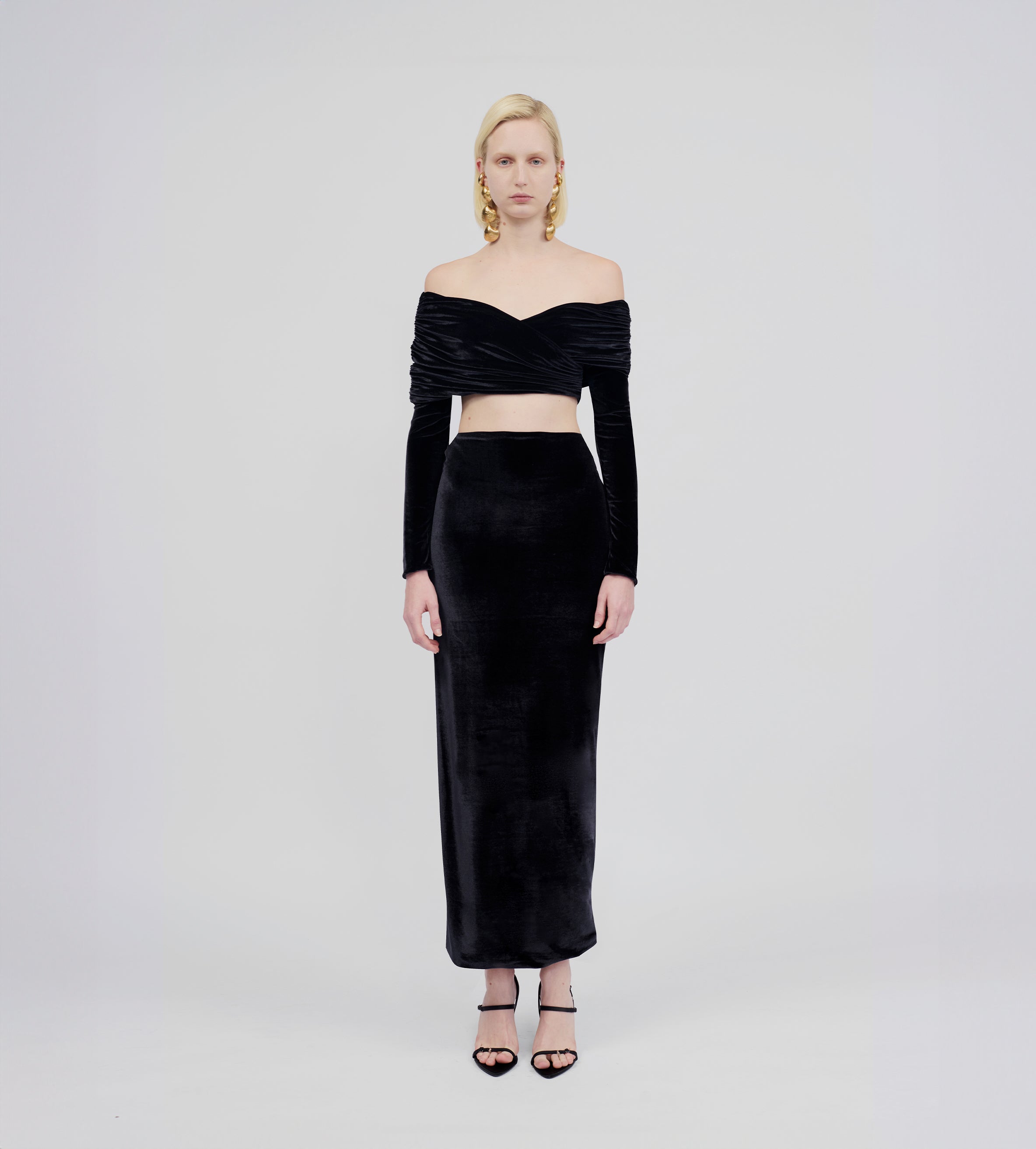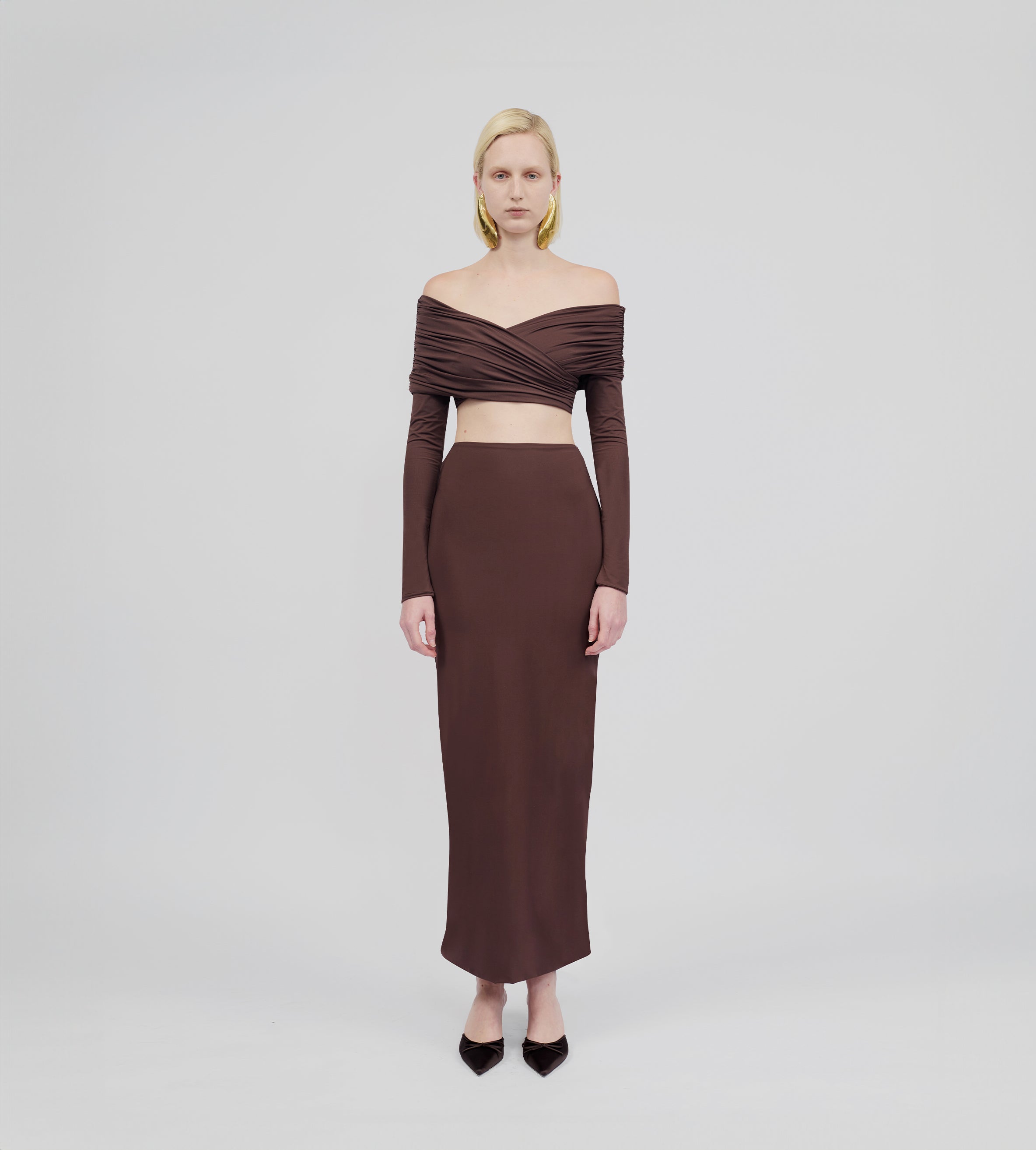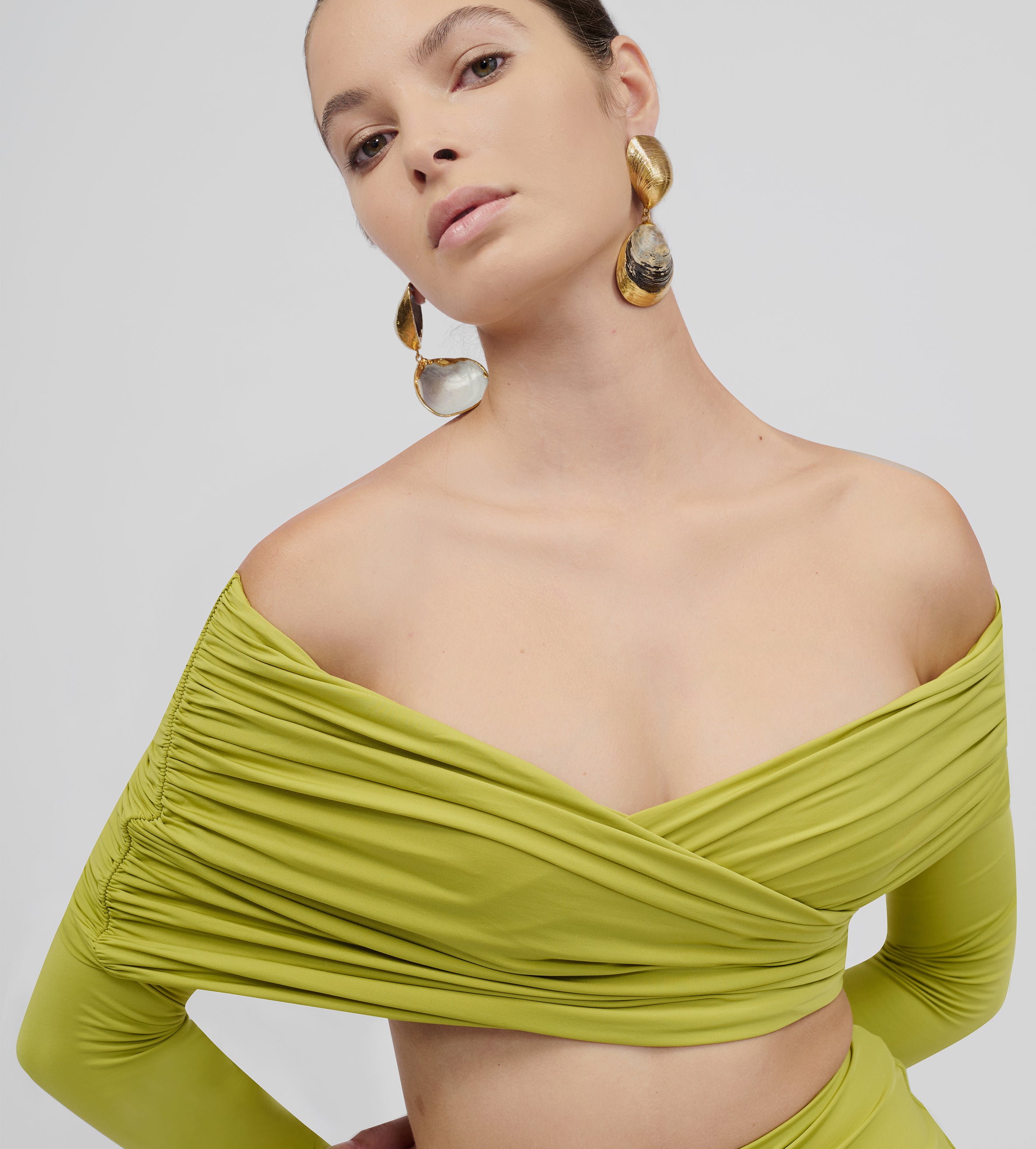Top de hombros descubiertos con detalles fruncidos envolventes, escote tipo