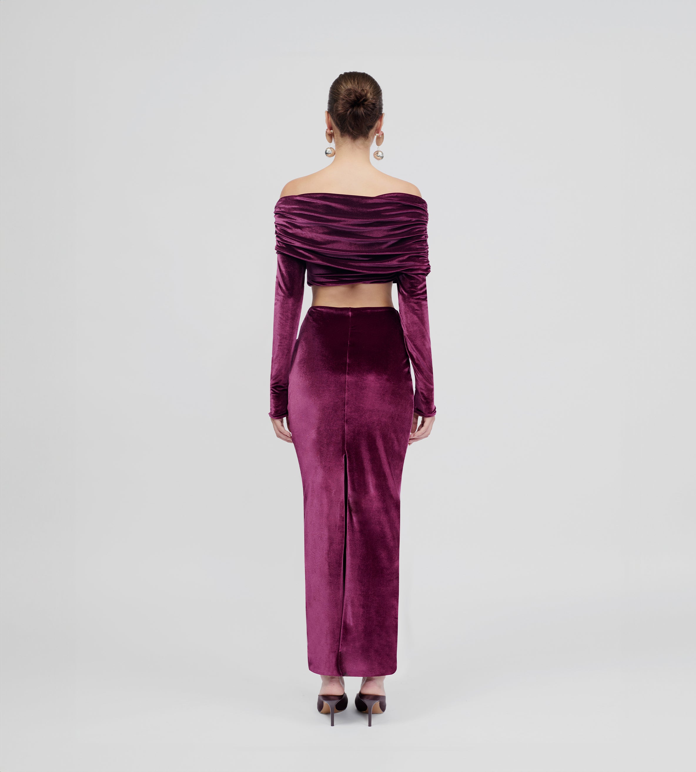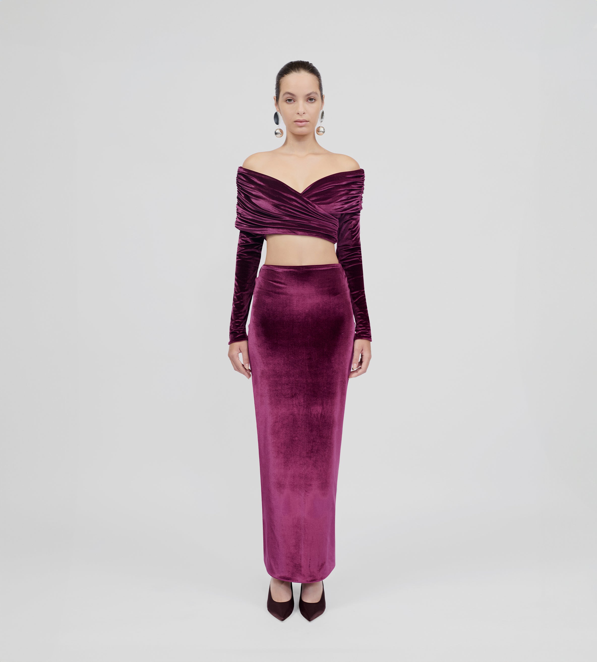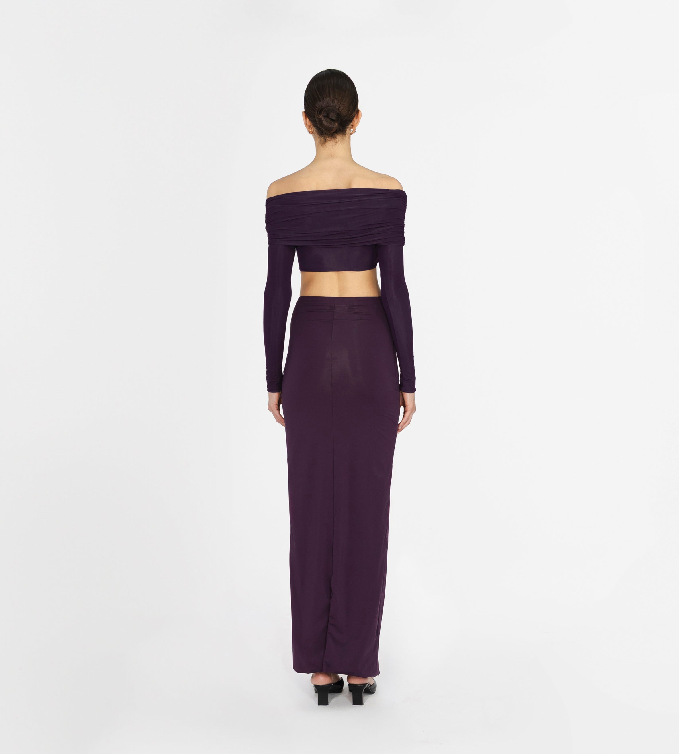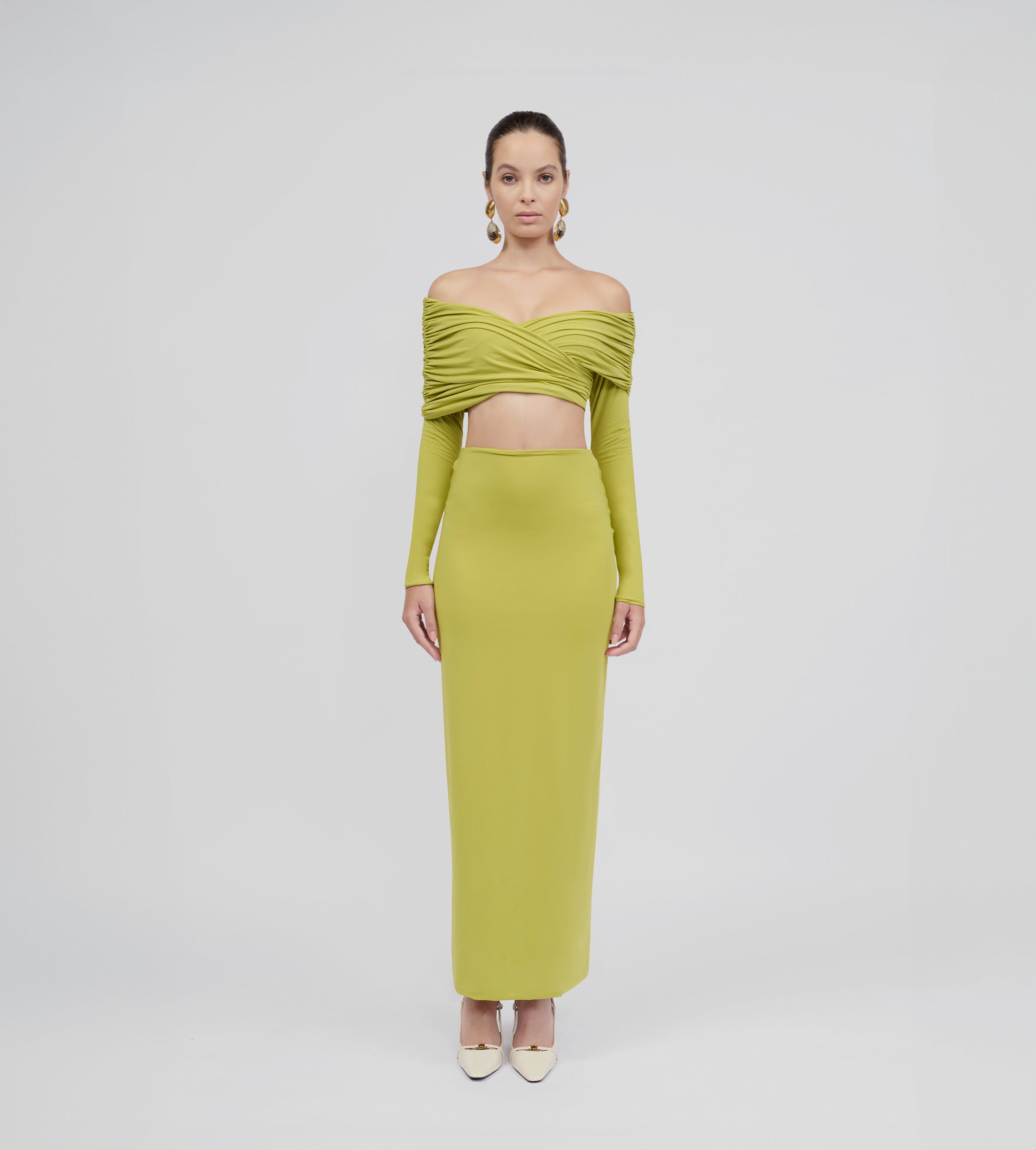 Top de hombros descubiertos con detalles fruncidos envolventes, escote tipo