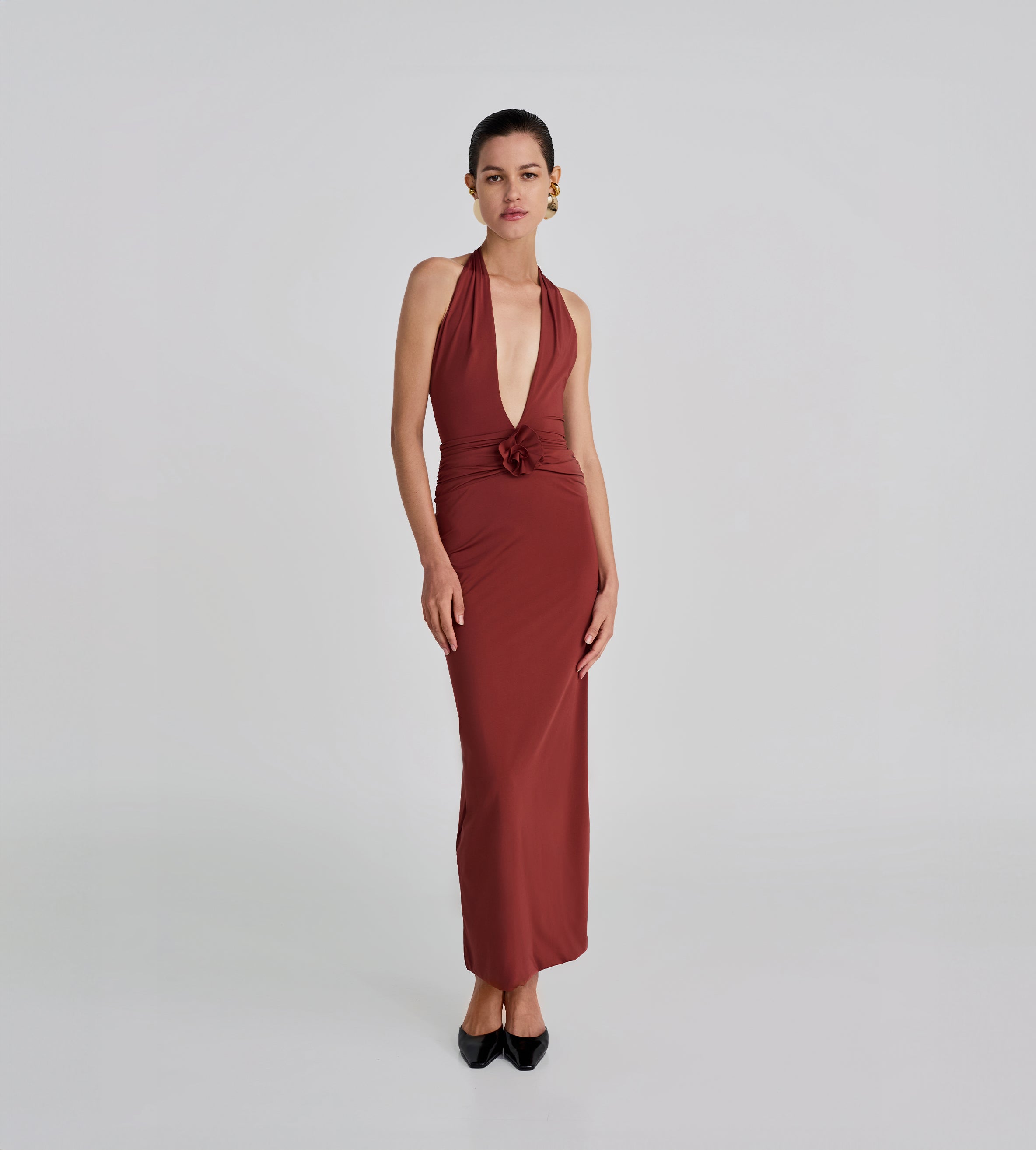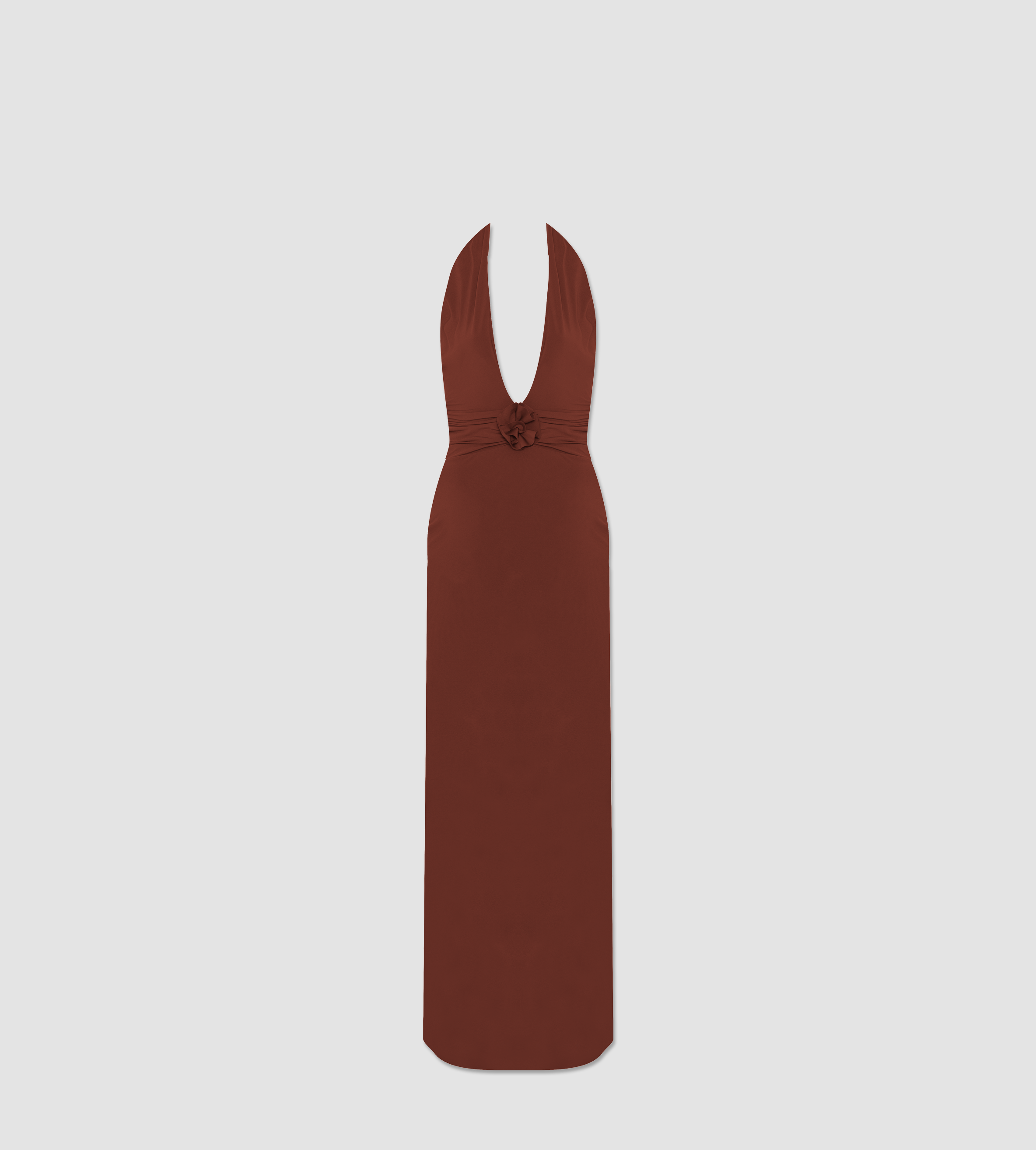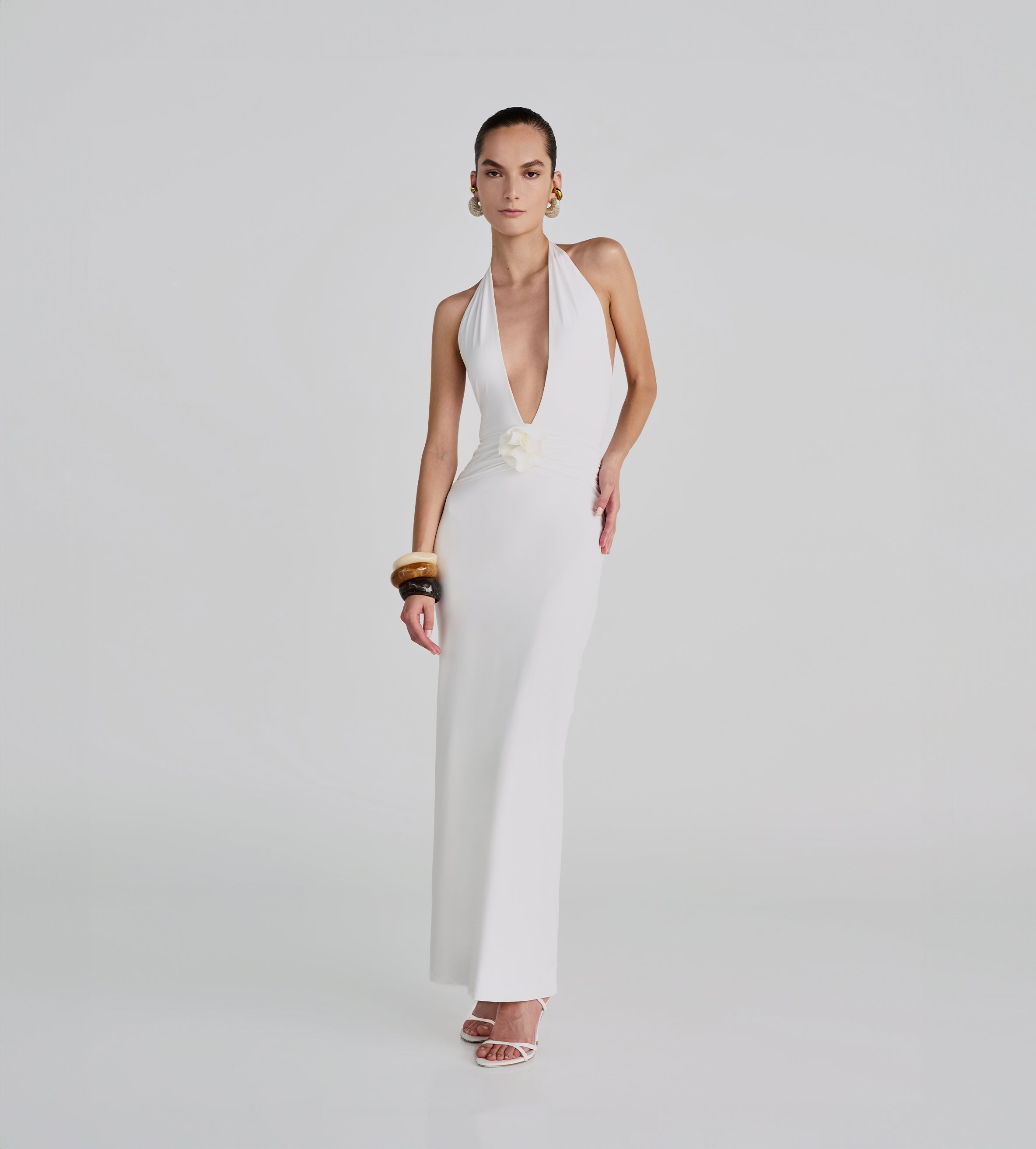 Vestido largo y elegante con escote halter, delicados detalles fruncidos en la cintura, en delantero y espalda, adornado con nuestra flor insignia de marca y un profundo y coqueto escote en la parte posterior. El vestido perfecto para llevar durante todo el verano.