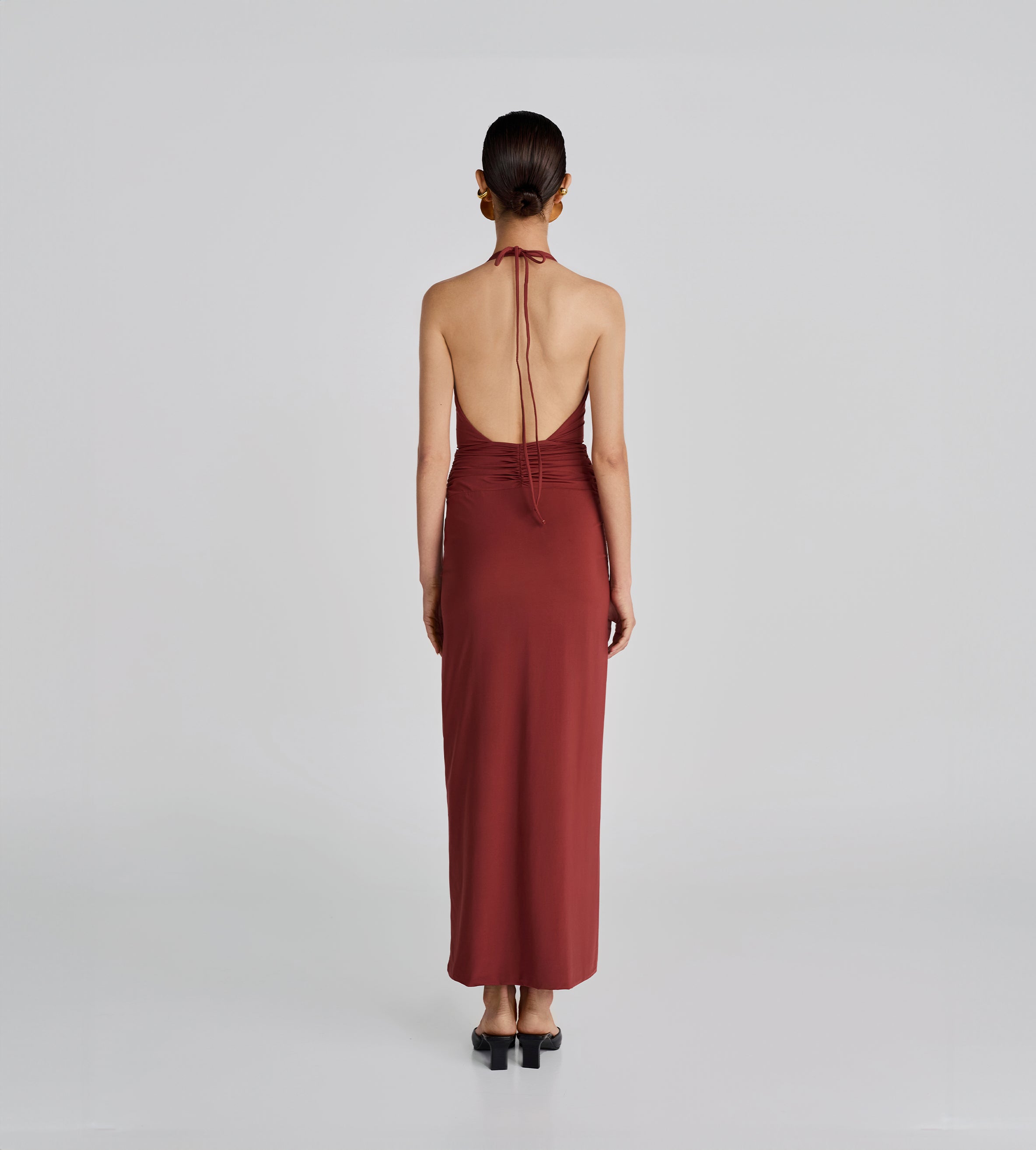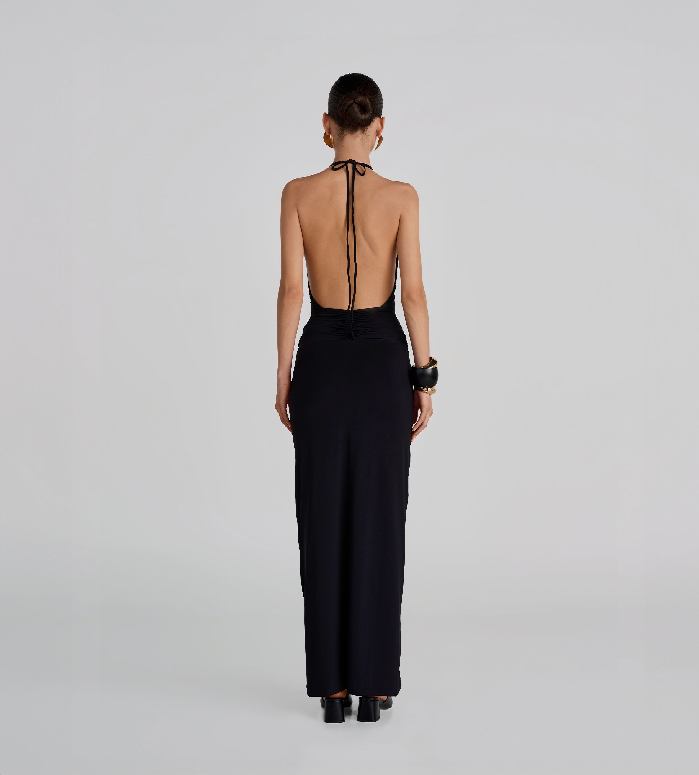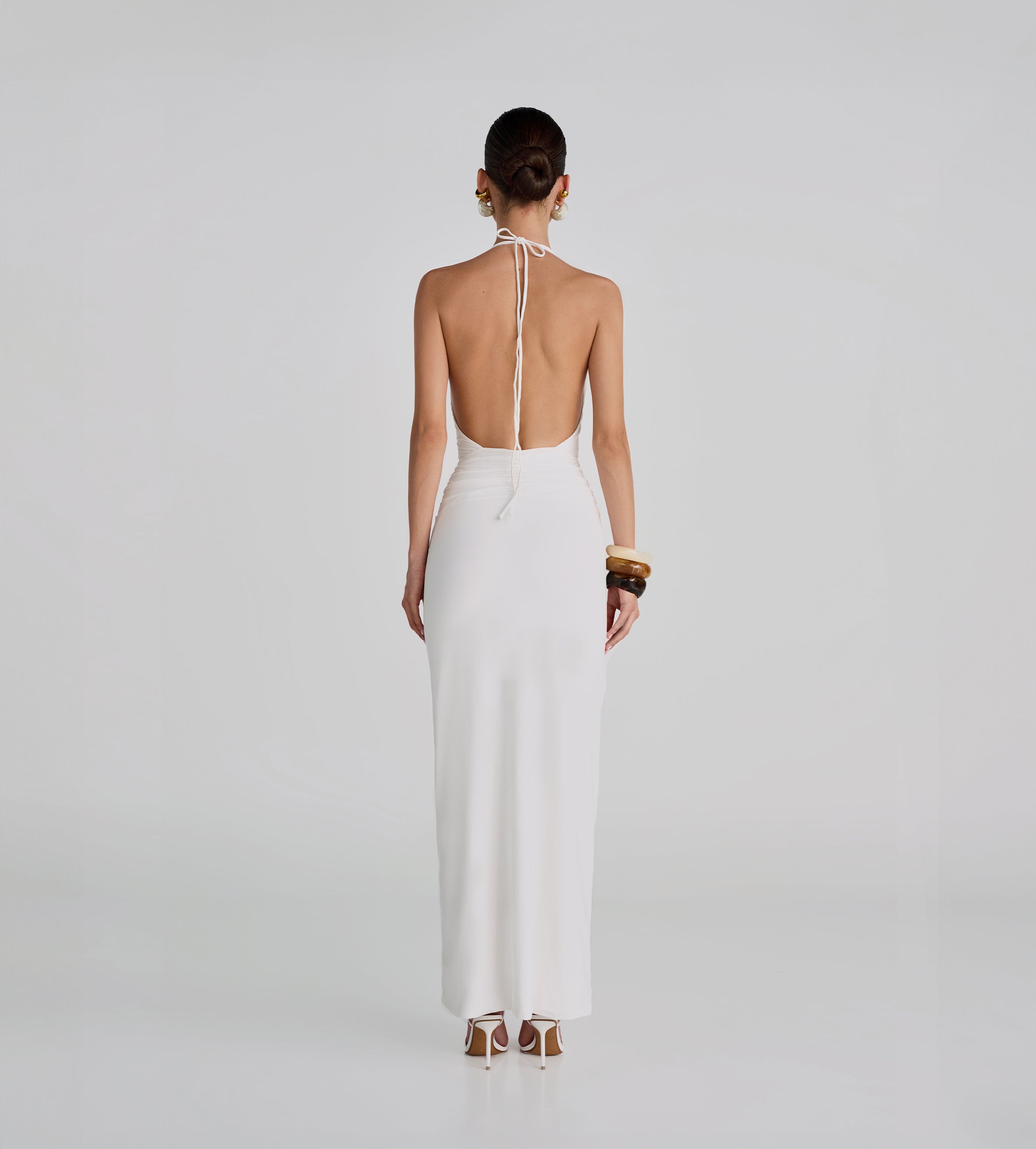 Vestido largo y elegante con escote halter, delicados detalles fruncidos en la cintura, en delantero y espalda, adornado con nuestra flor insignia de marca y un profundo y coqueto escote en la parte posterior. El vestido perfecto para llevar durante todo el verano.