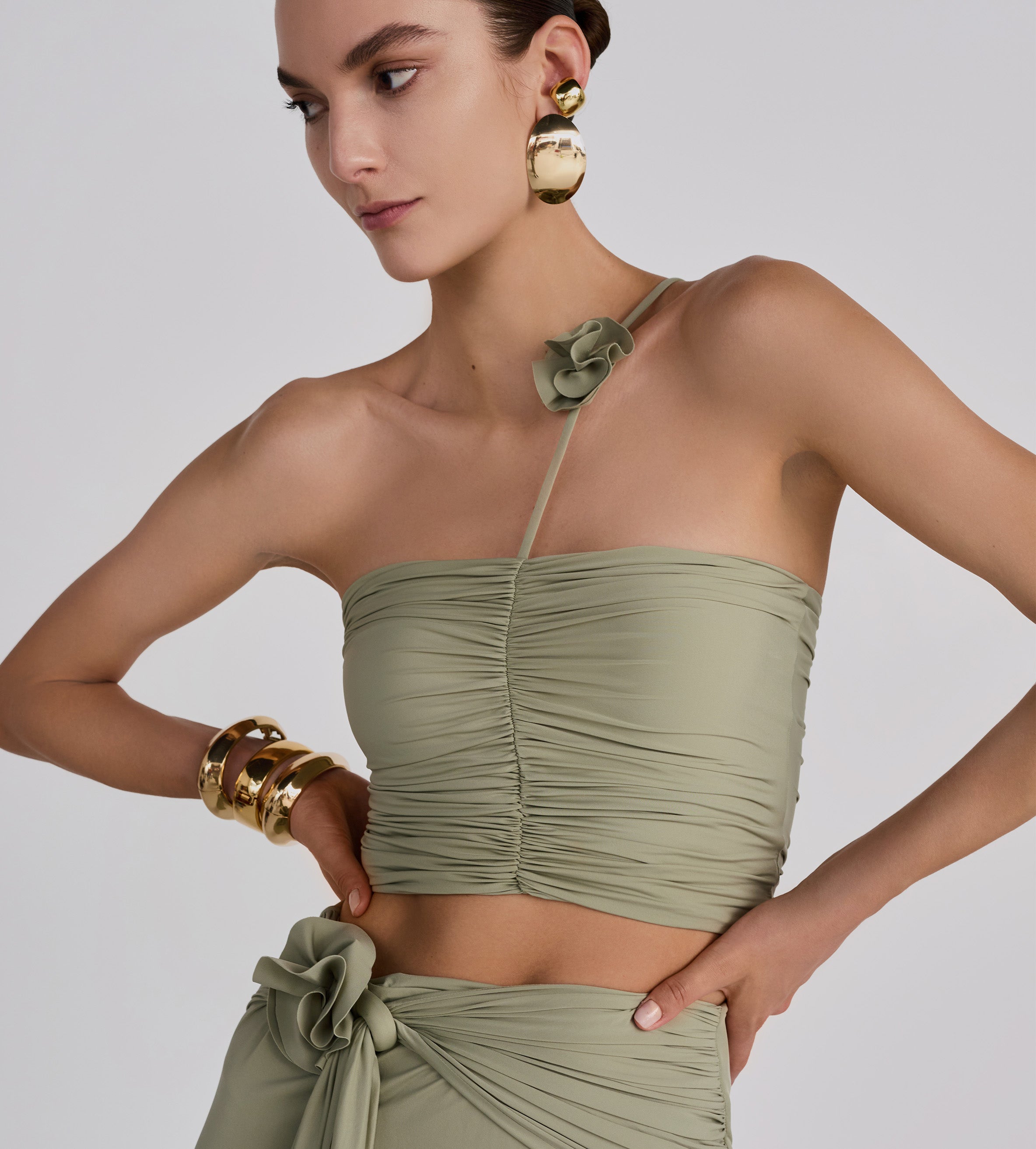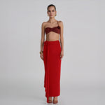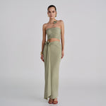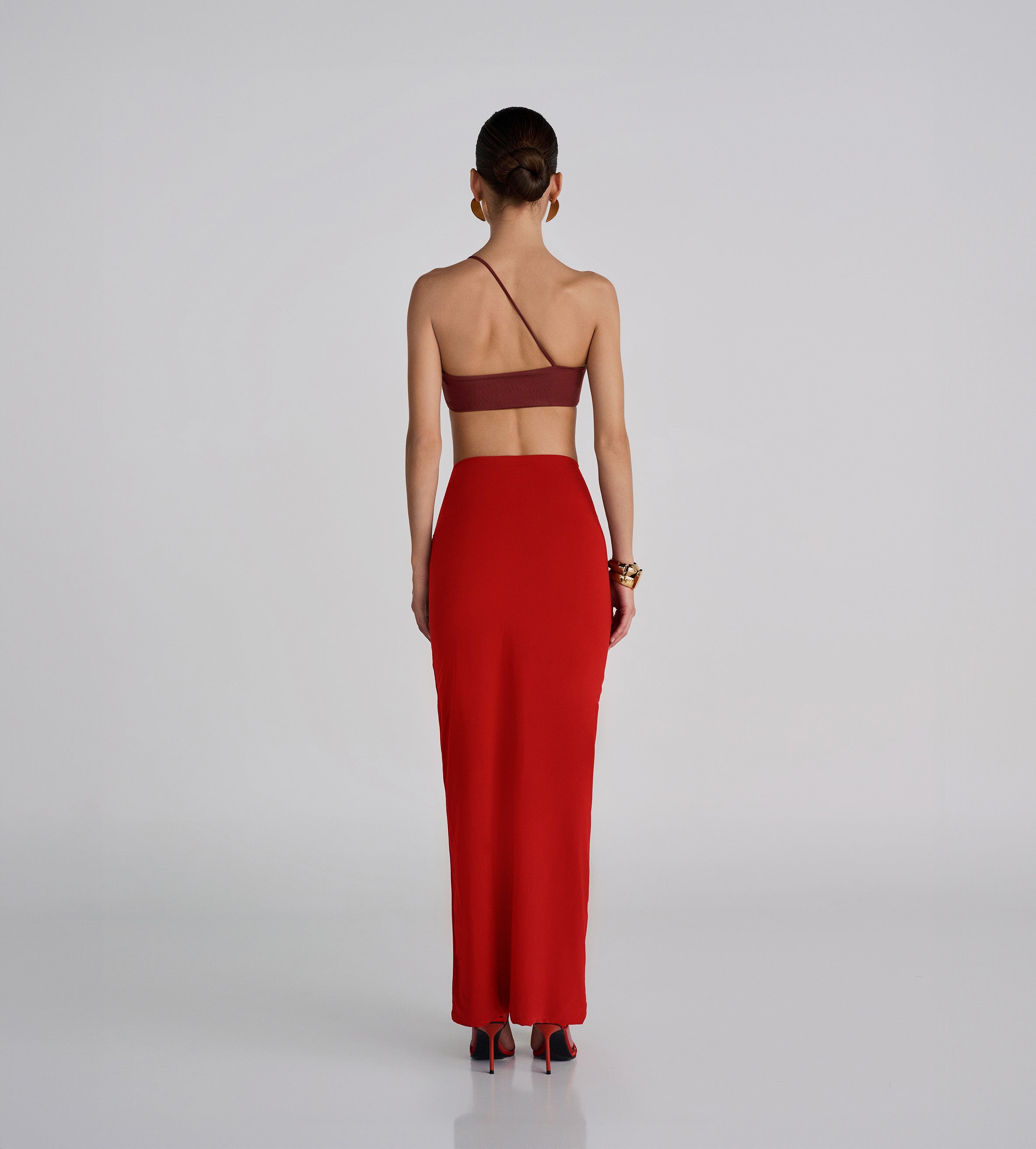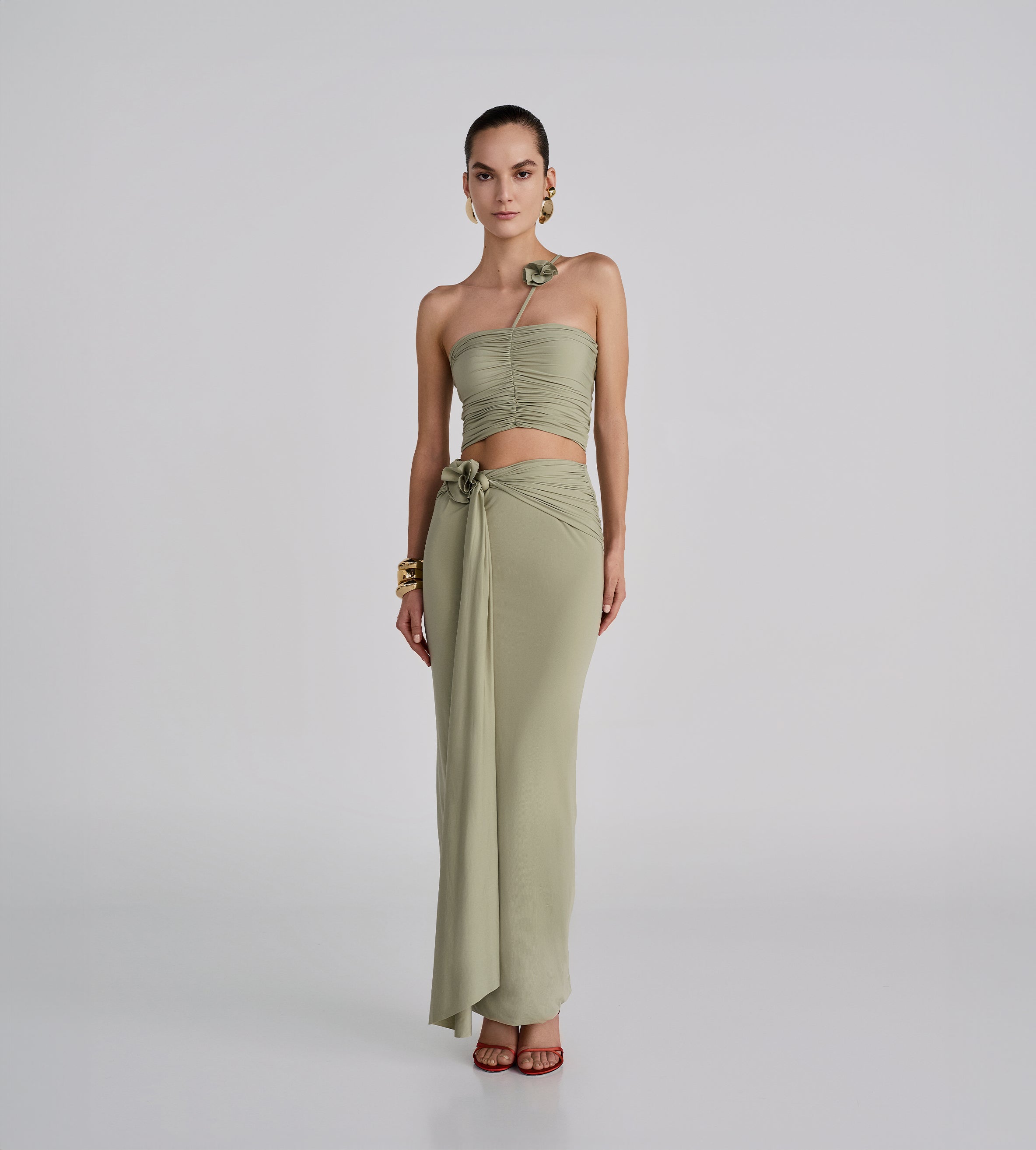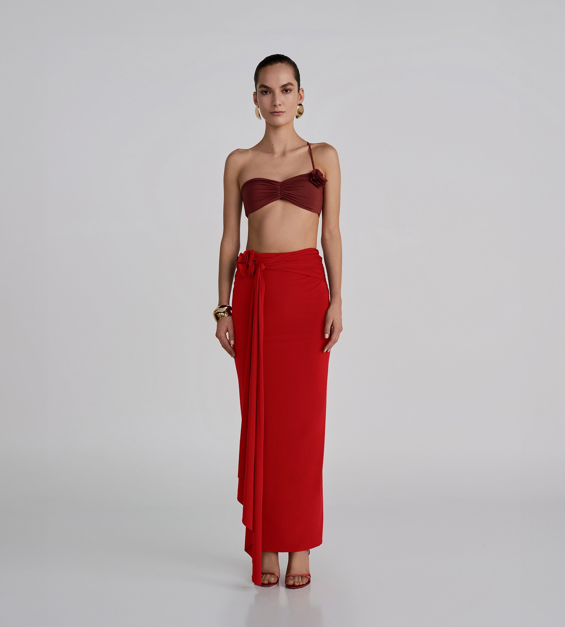 Falda maxi ajustada con detalle de lazo ajustable en el delantero, el cual se fusiona con nuestra icónica flor en 3D, un diseño atemporal y sofisticado.