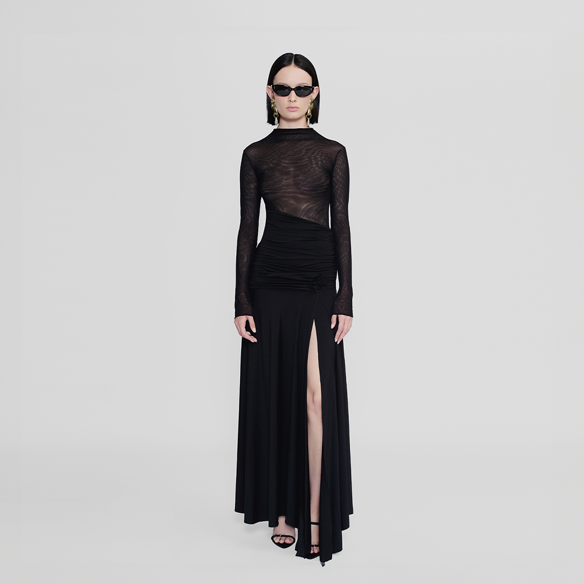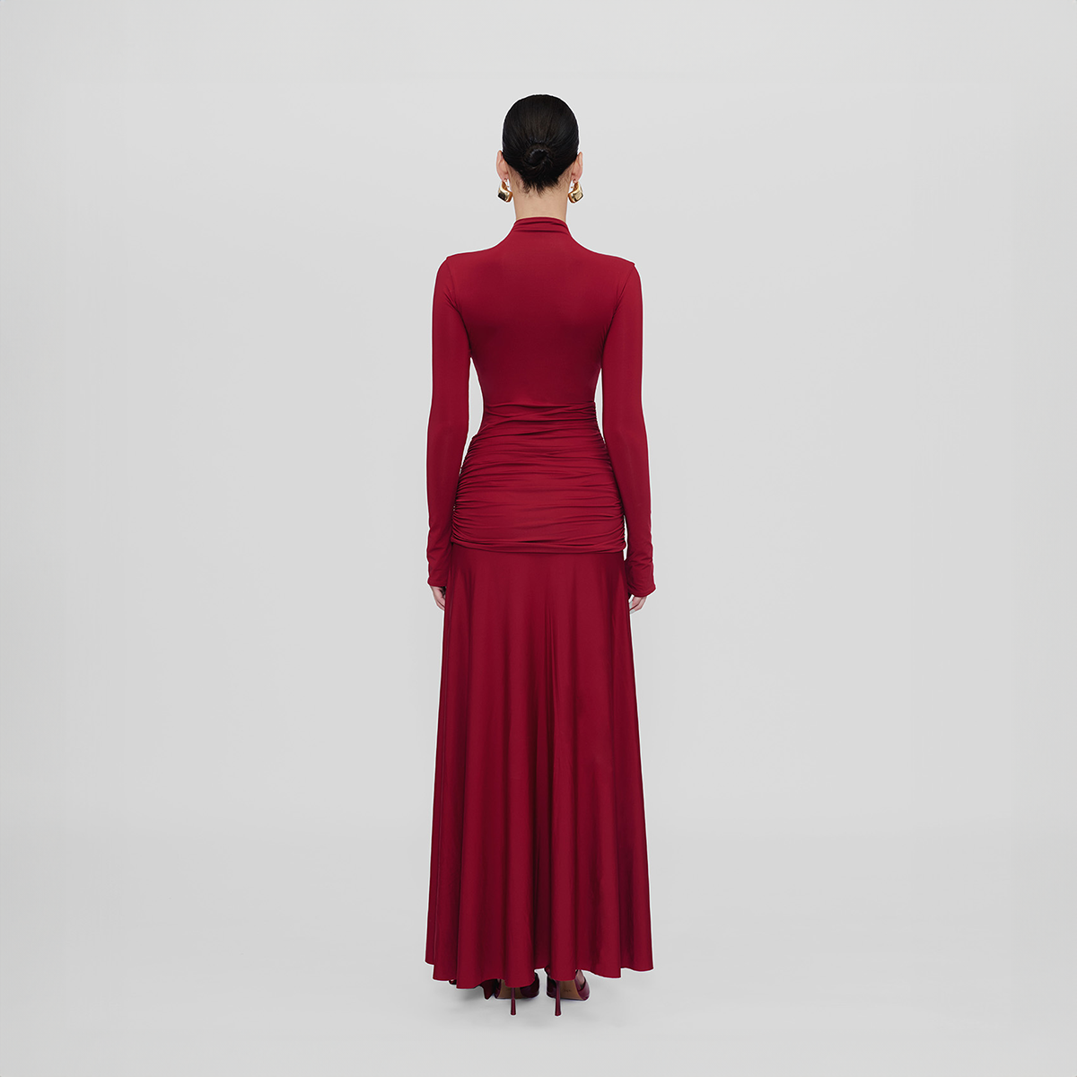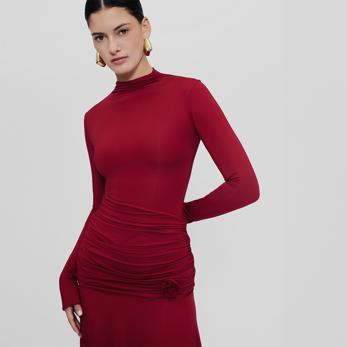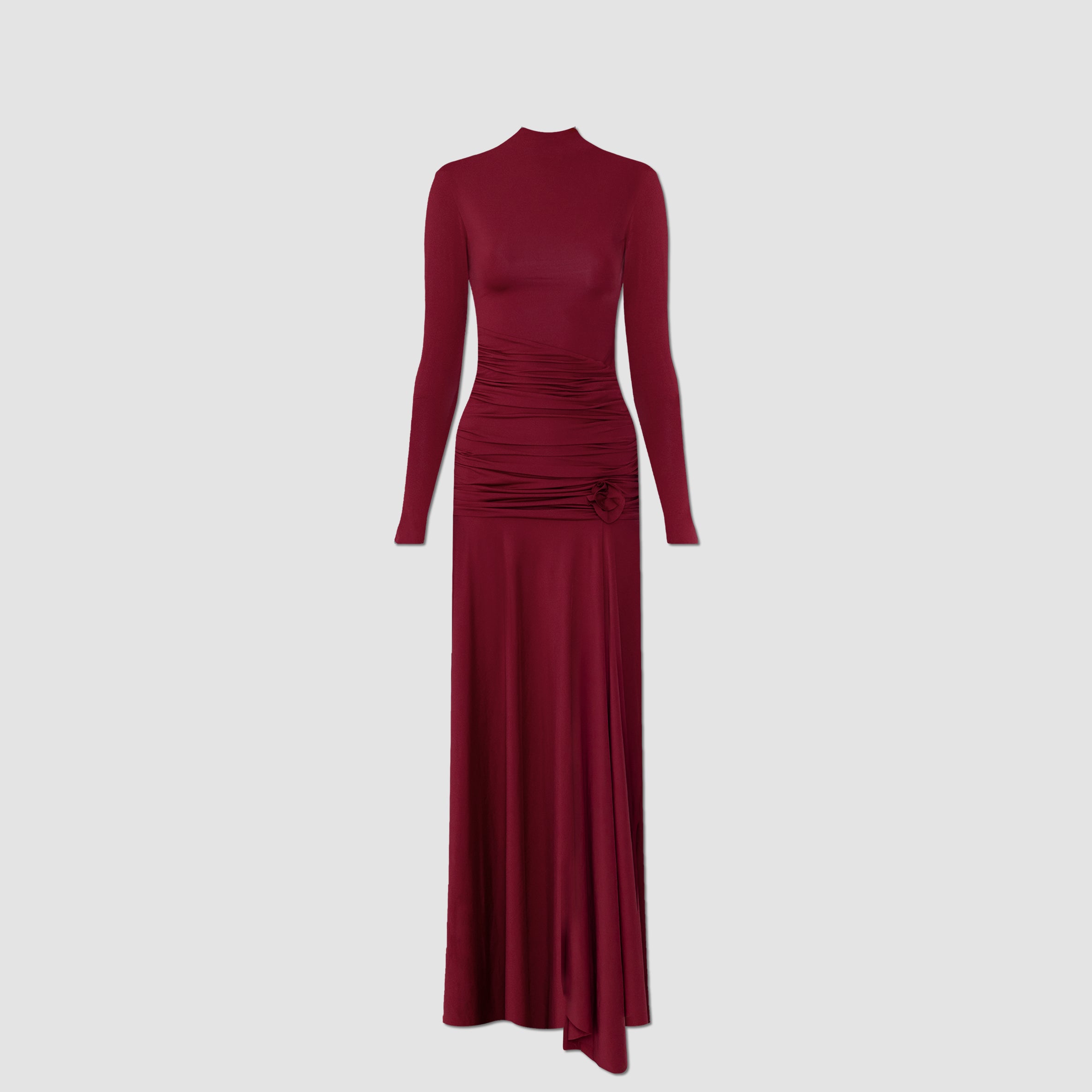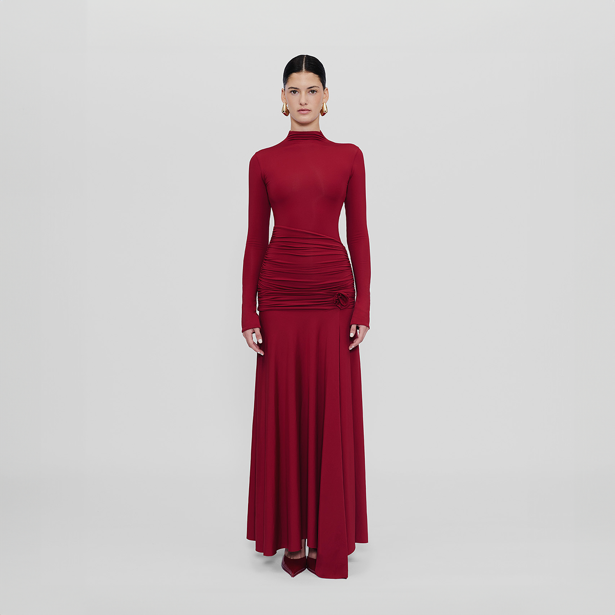 Vestido largo de cuello alto con sensación de segunda piel en la parte superior, suaves mangas largas y detalle fruncido desde la cintura hasta la cadera, seguido por una falda amplia con una abertura frontal y un detalle de flor en 3D. Para una estética atemporal, opta por nuestra version en carmesí, o para un look cautivador elige nuestra version en negro, que combina un tejido semitransparente en la parte superior y una falda en nuestra tela icónica.