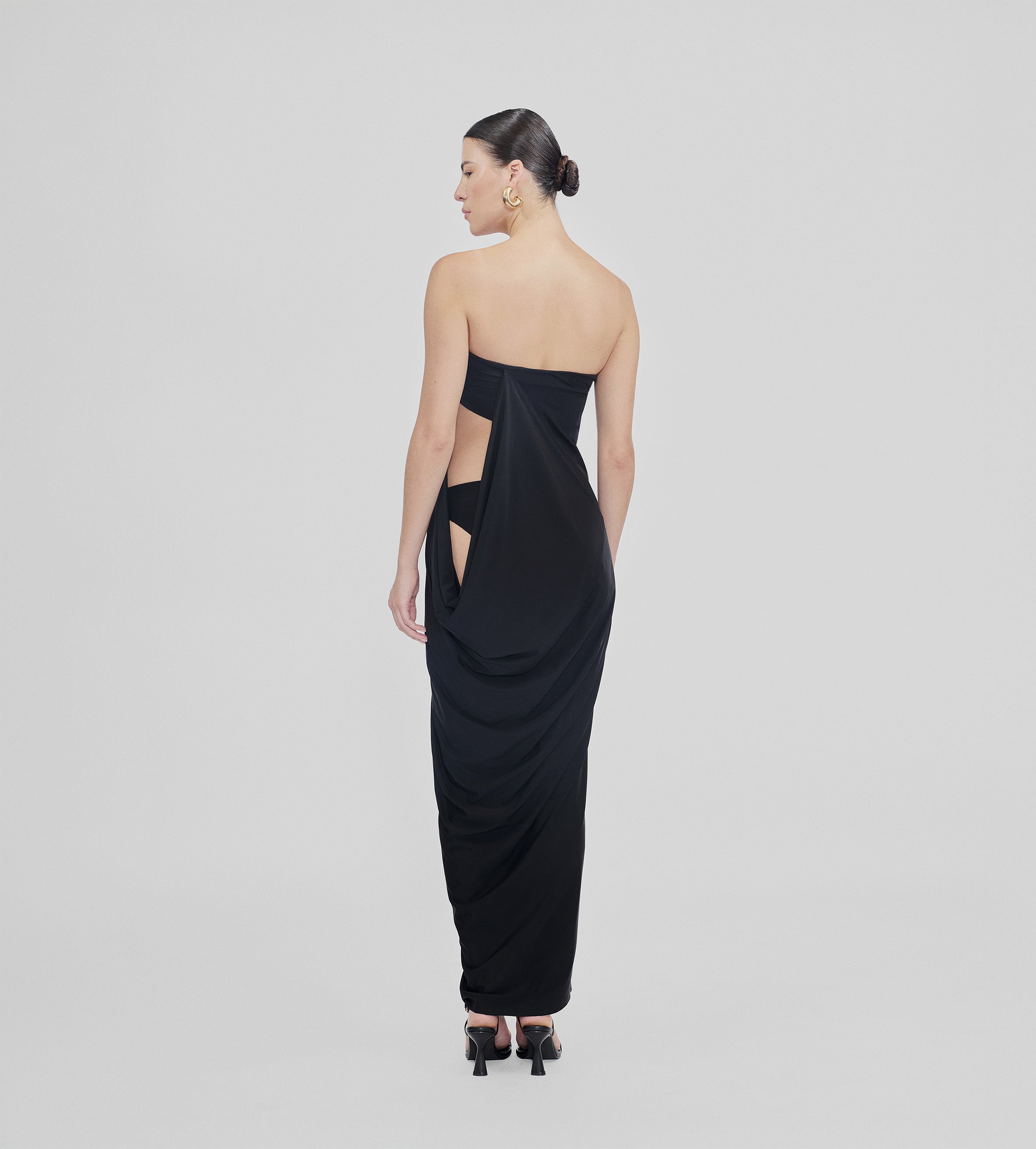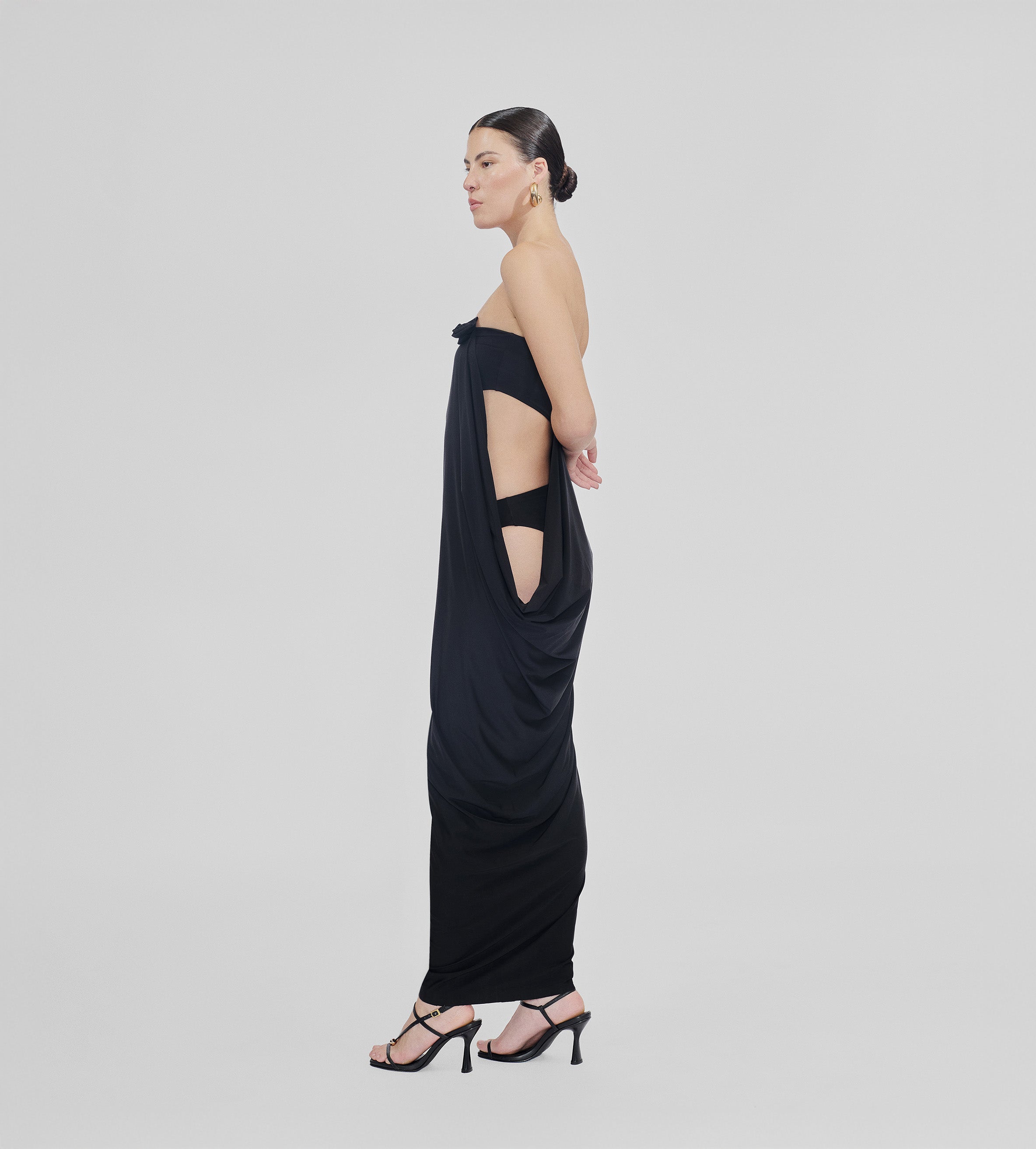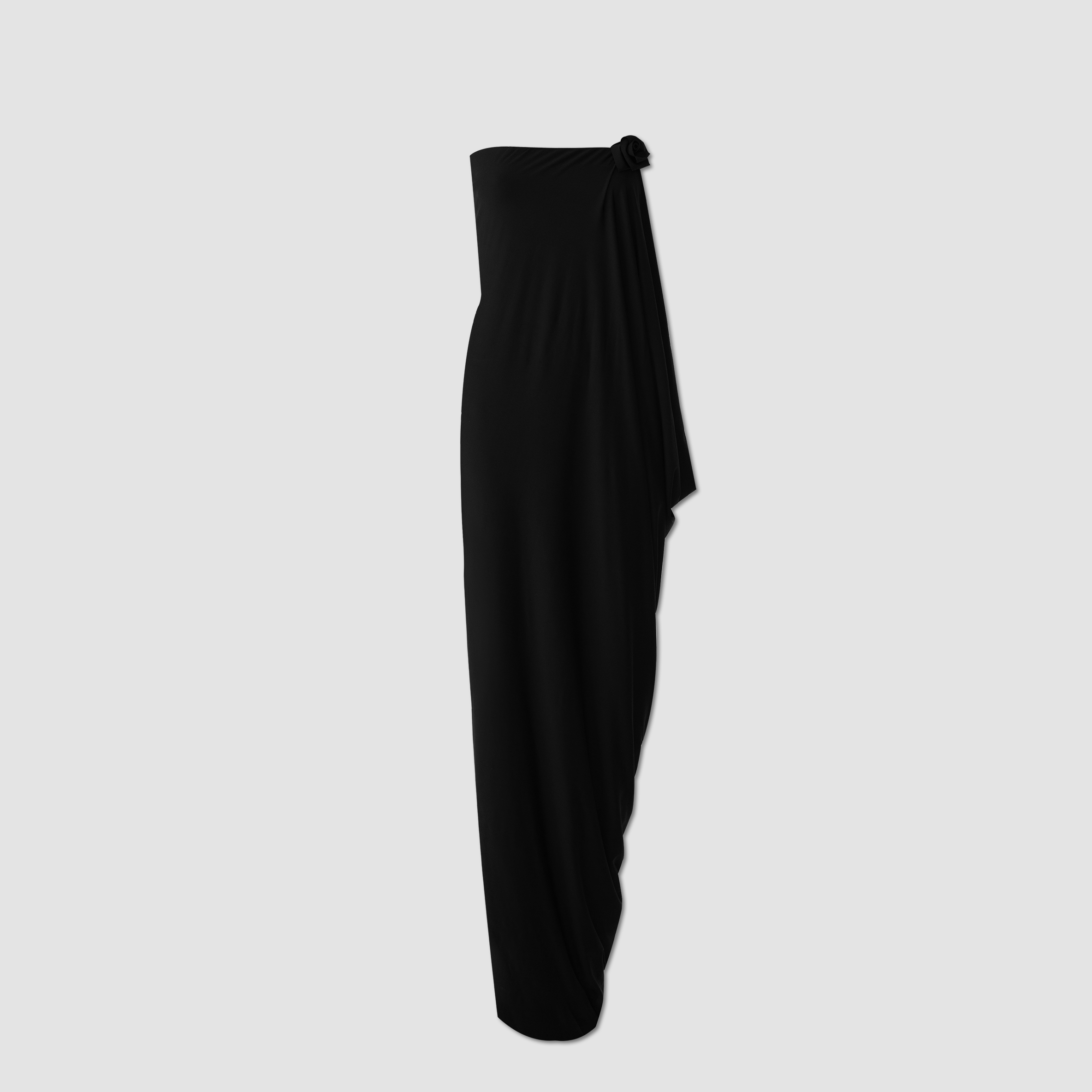 Nuestro vestido Manigua, presenta un sensual escote strapless y un dramático drapeado lateral abierto en el costado. Su body interno minimalista crea un juego de formas sutilmente visibles a través del costado. El look se completa con un sofisticado detalle floral en 3D hecho a mano.