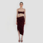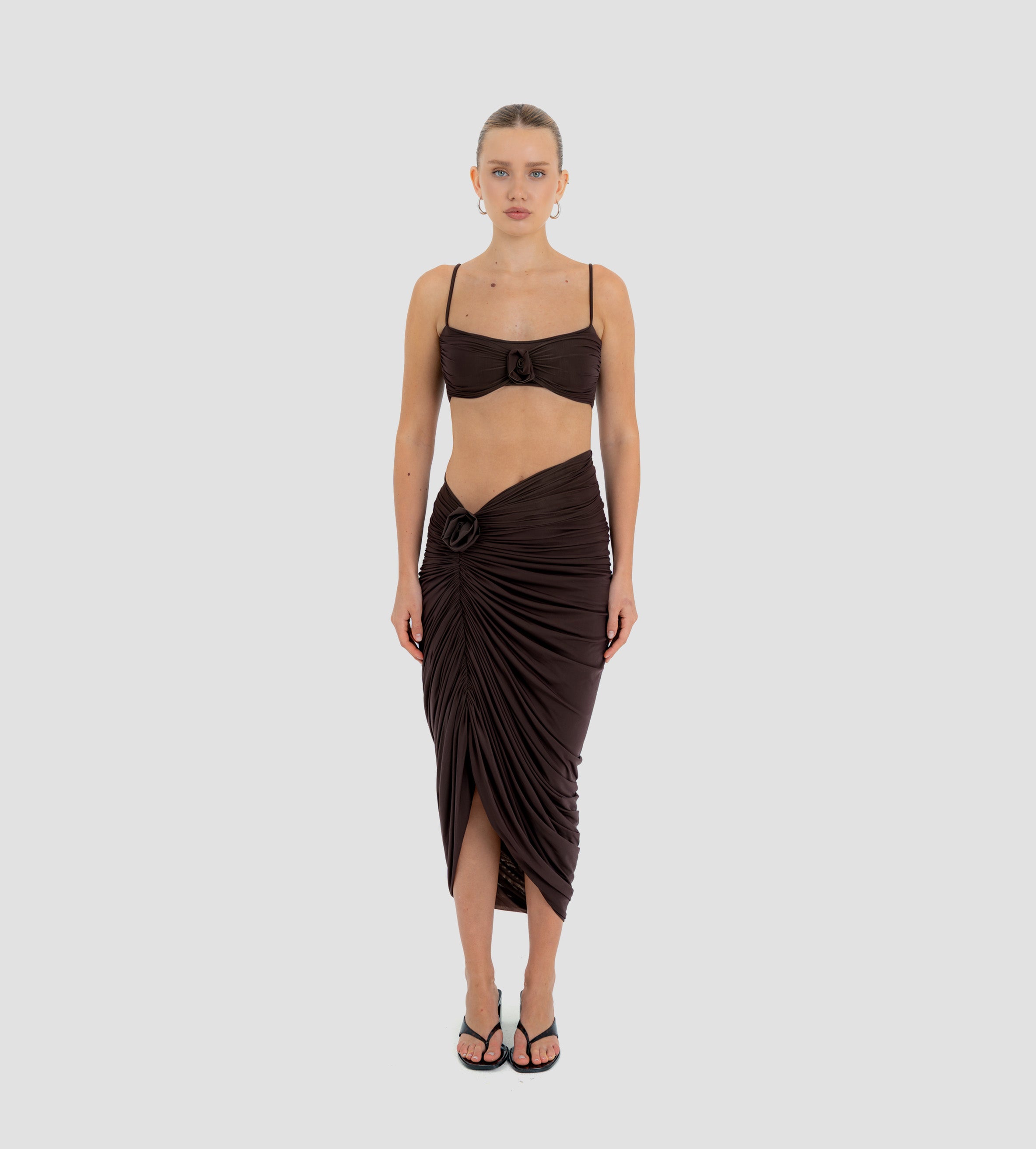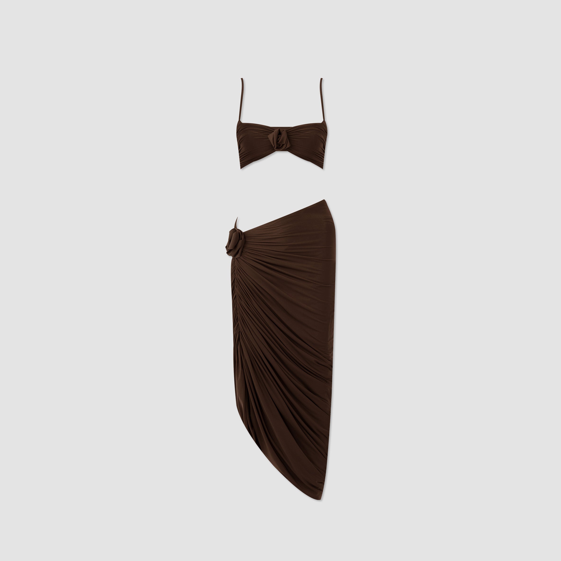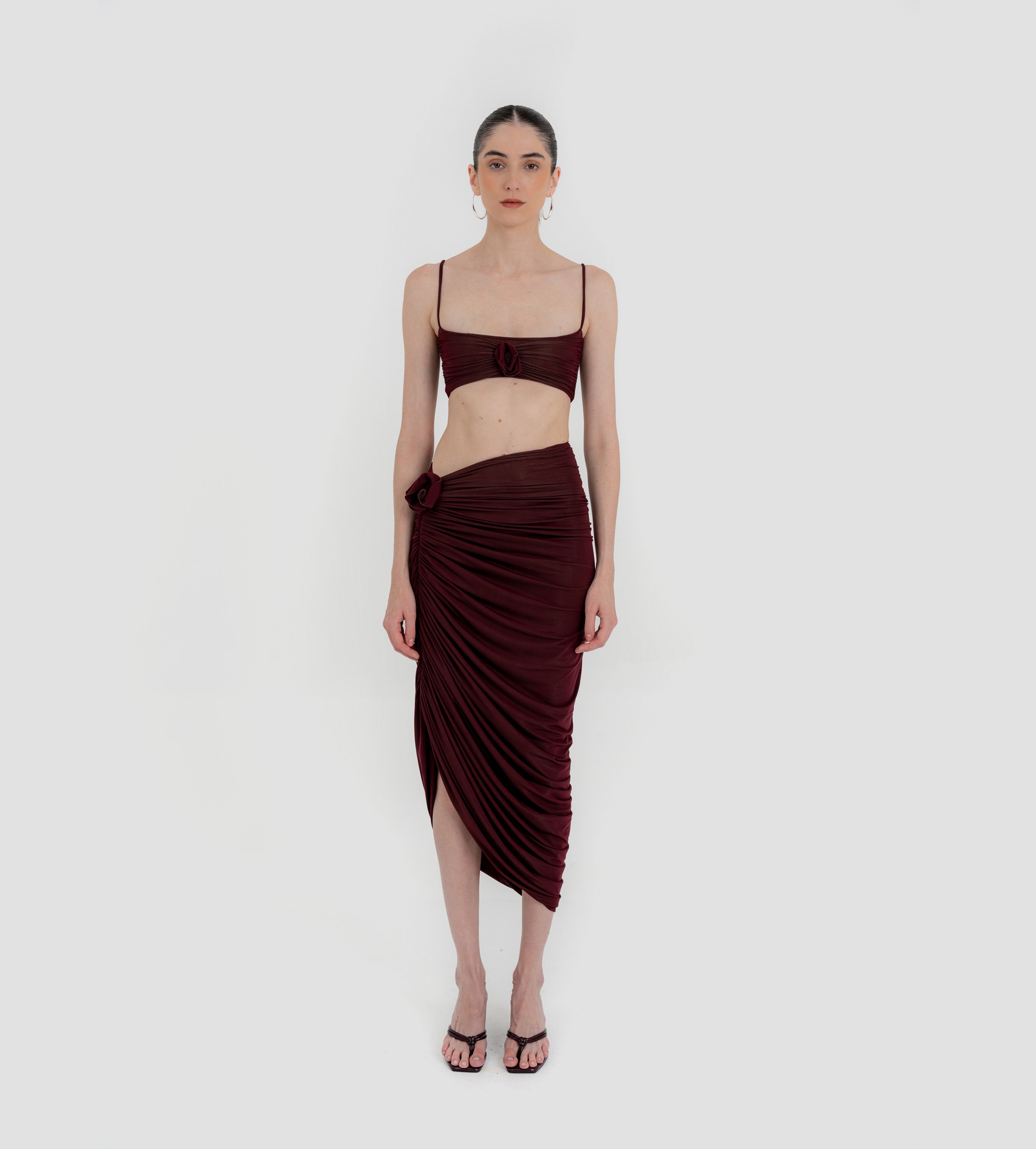 Nuestro set Medusa destaca un top de escote recto, enmarcado por delicados tirantes. El top está construido por una doble capa, la primera crea la base lisa y da el ajuste perfecto, mientras que la segunda incorpora un fruncido audaz y un detalle central de flor 3D. Se combina con una falda midi asimétrica que se recoge y cae drapeada desde el costado y se ve adornada por un detalle de flor 3D.